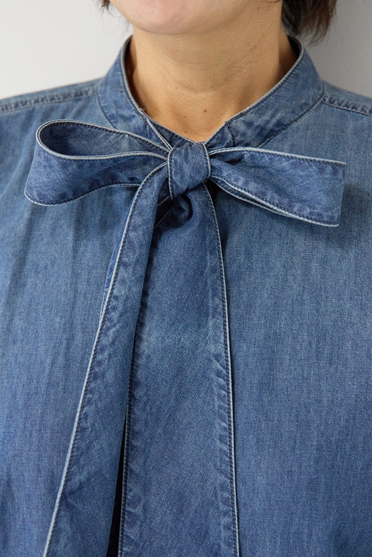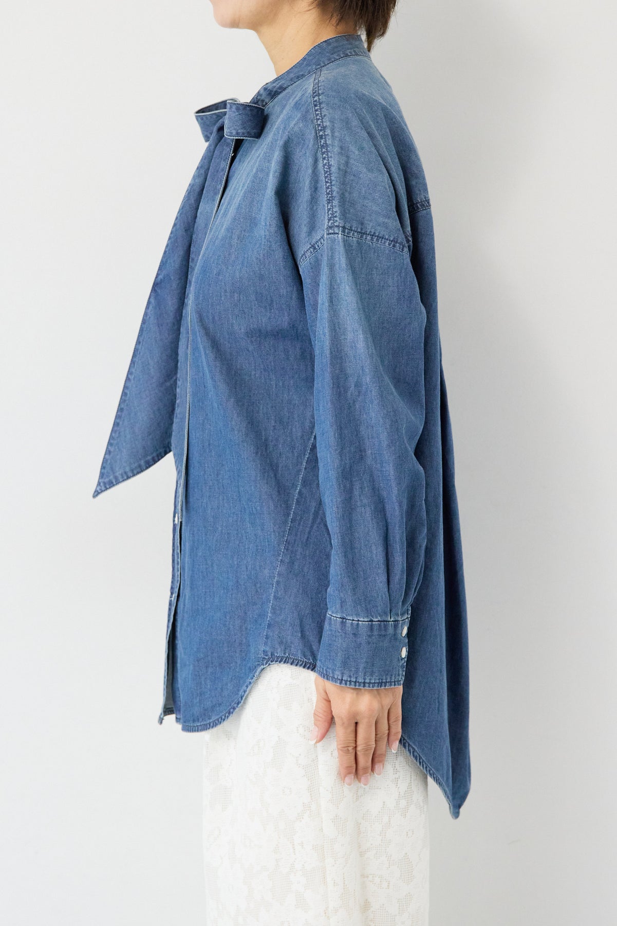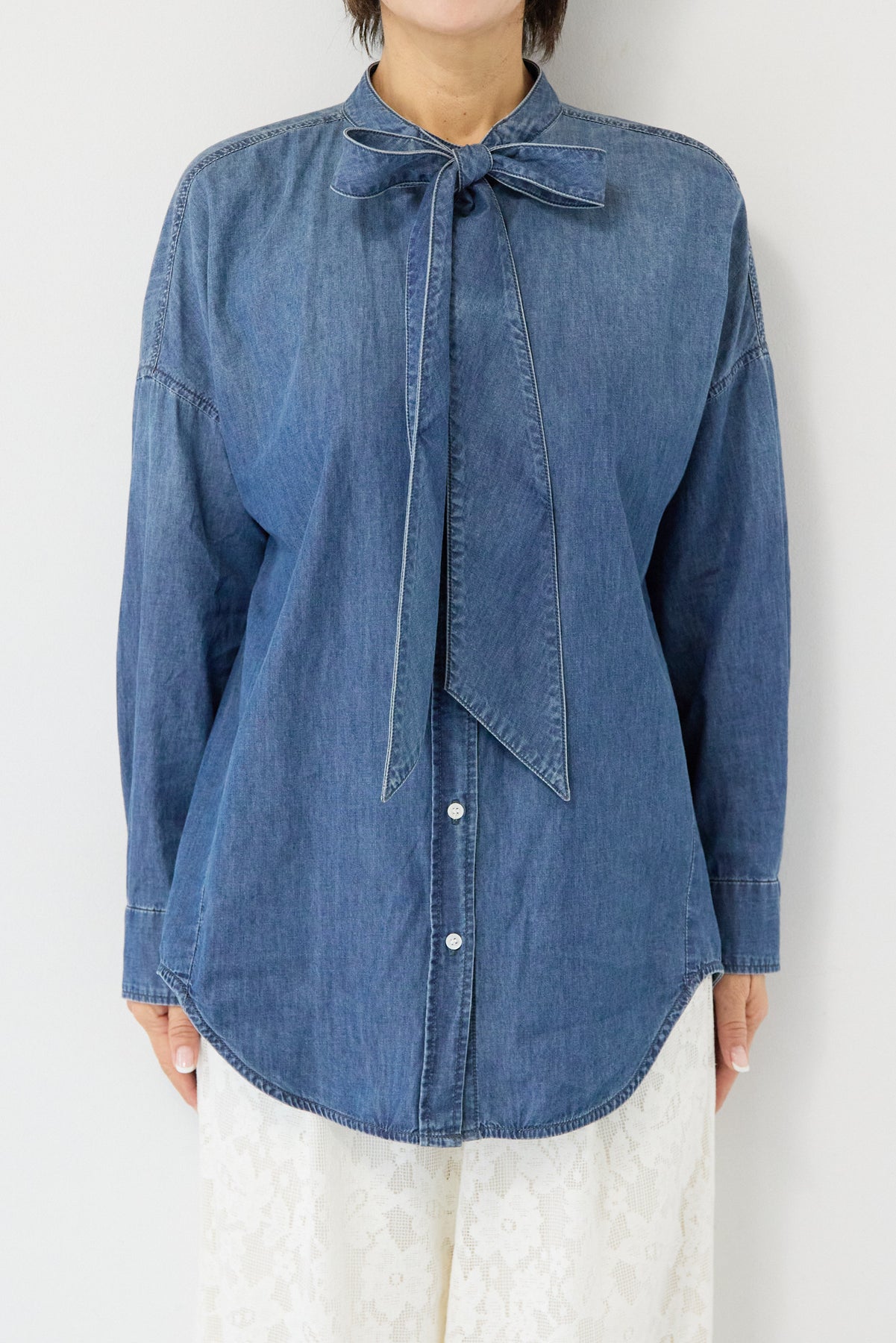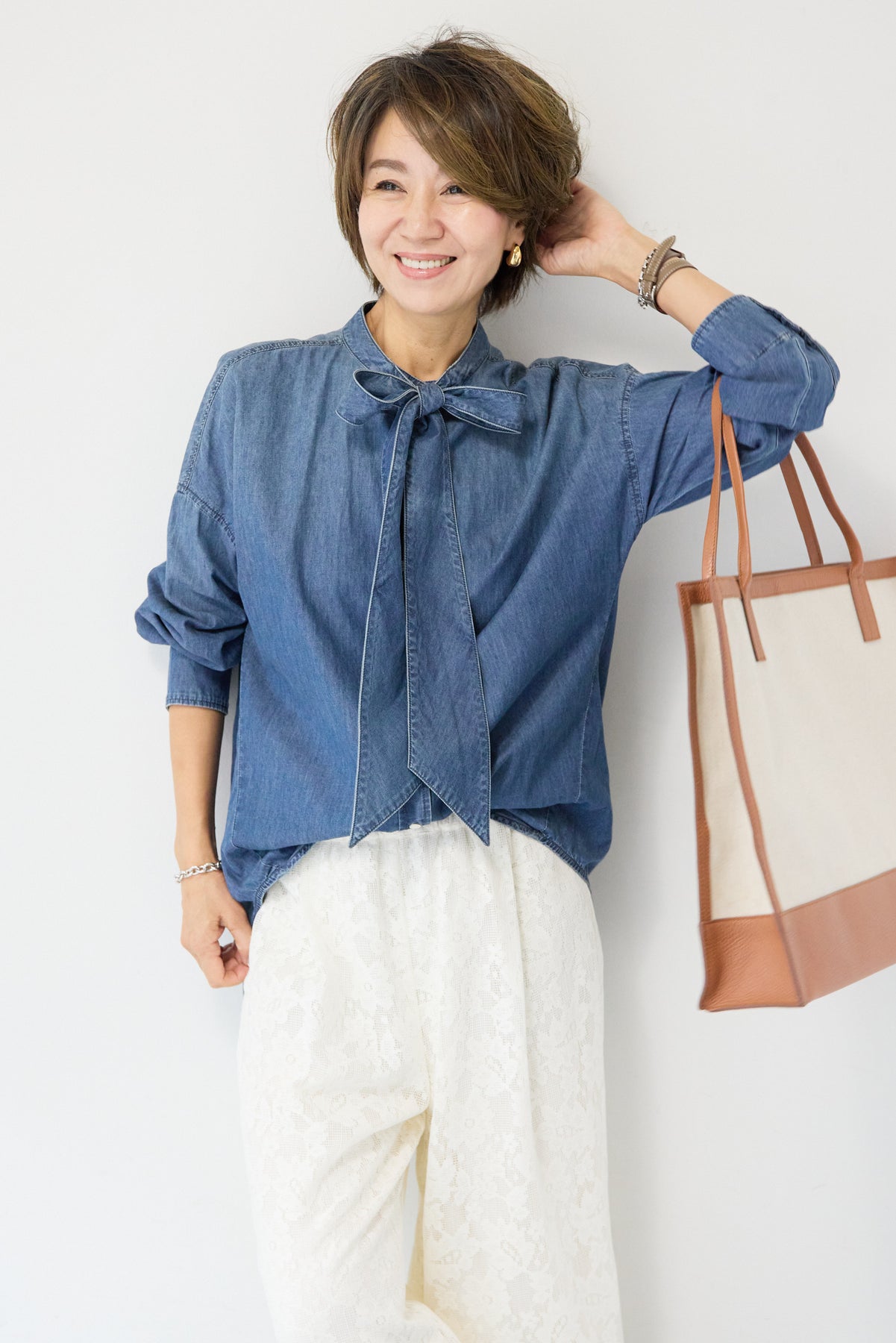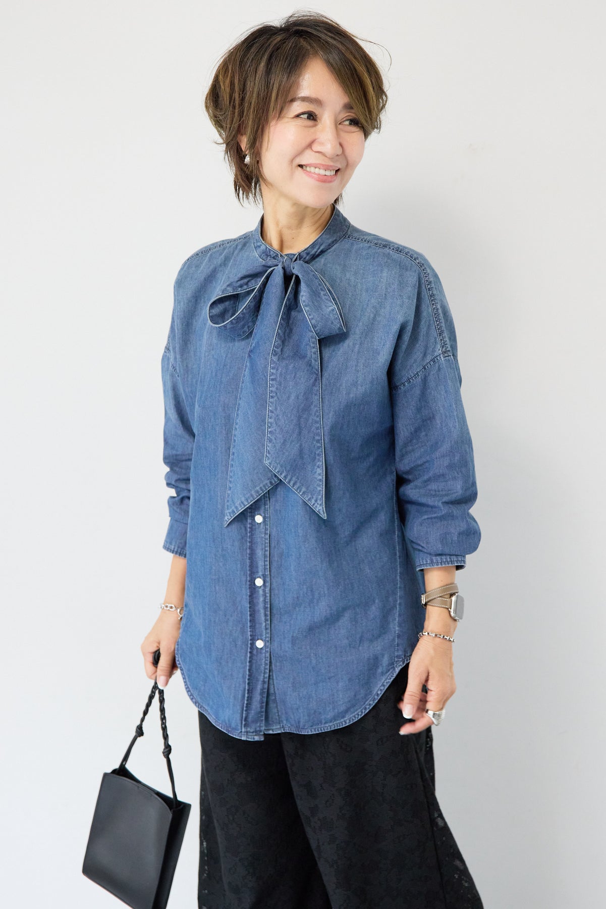 ボウタイデニムシャツ/フラワーエンブロイダリーワイドパンツ