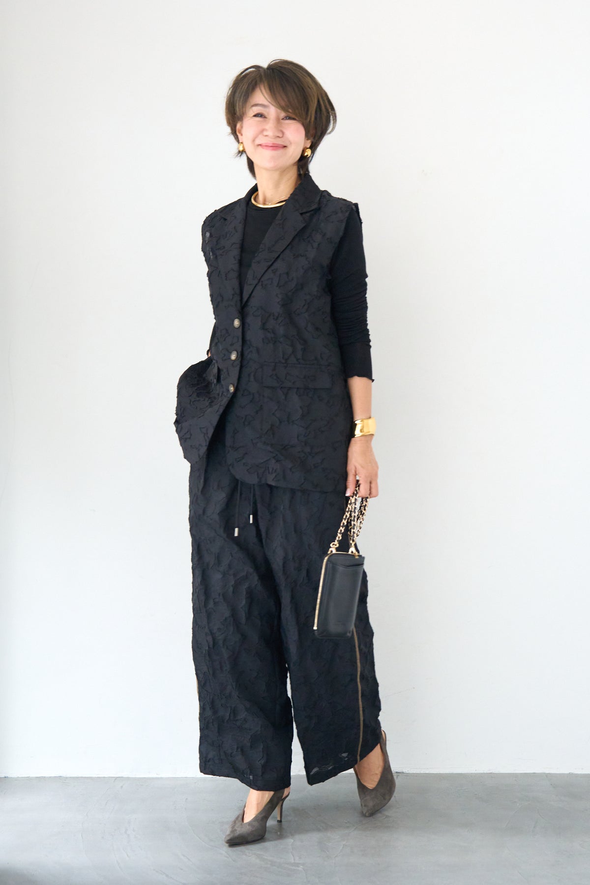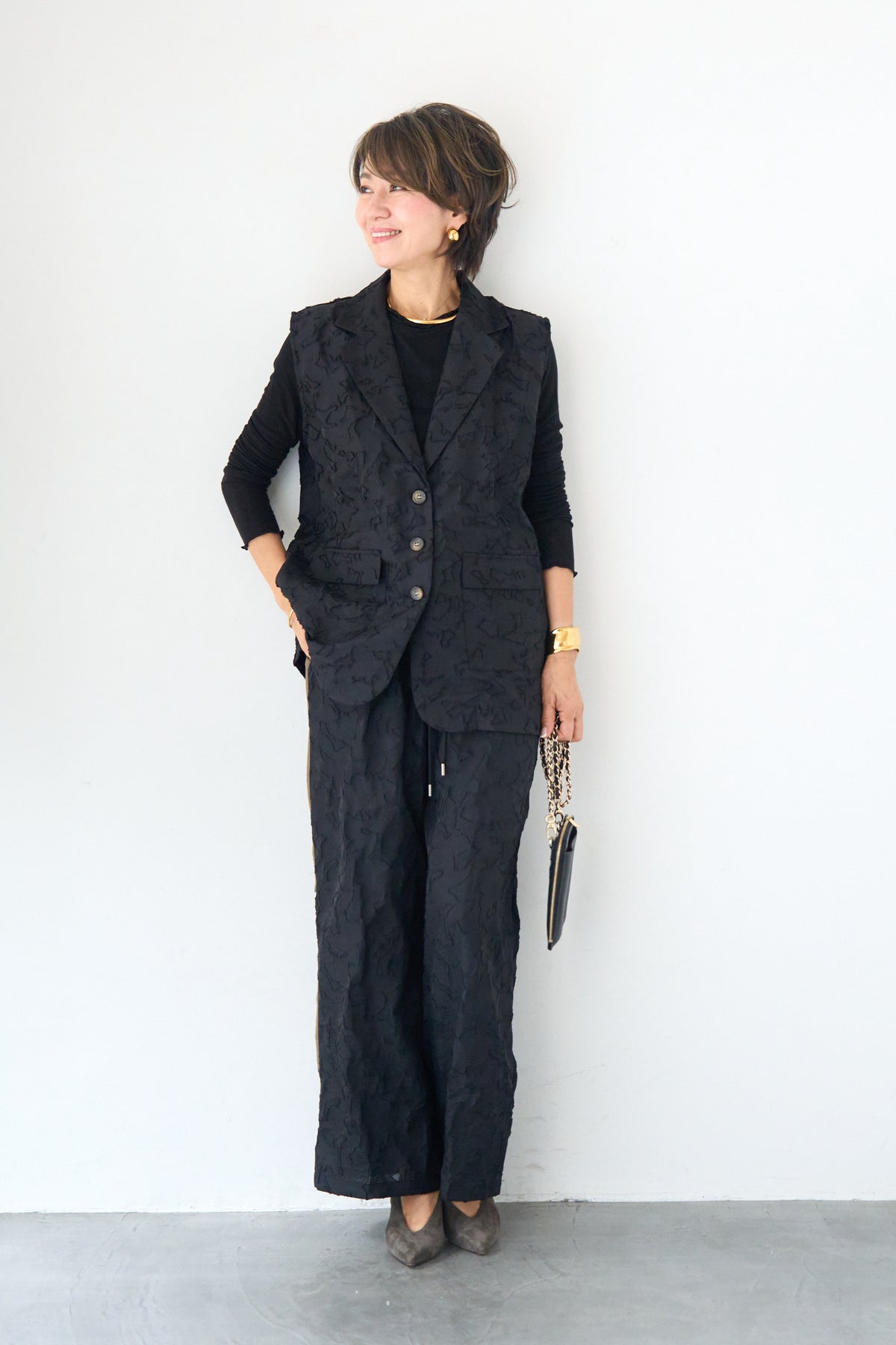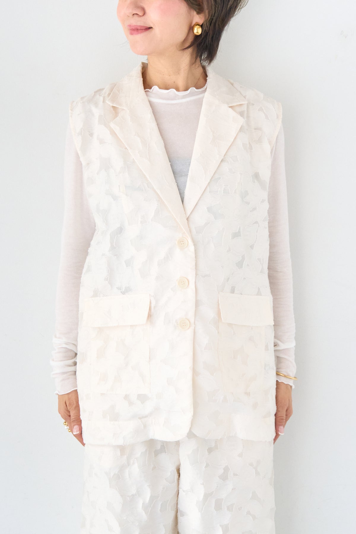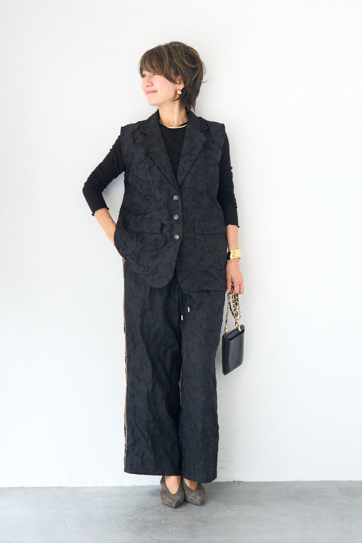[SET]【セットアップ対応】フェミニンジャガード テーラードロングジレ+【セットアップ対応】フェミニンジャガード イージーワイドパンツ(2set)