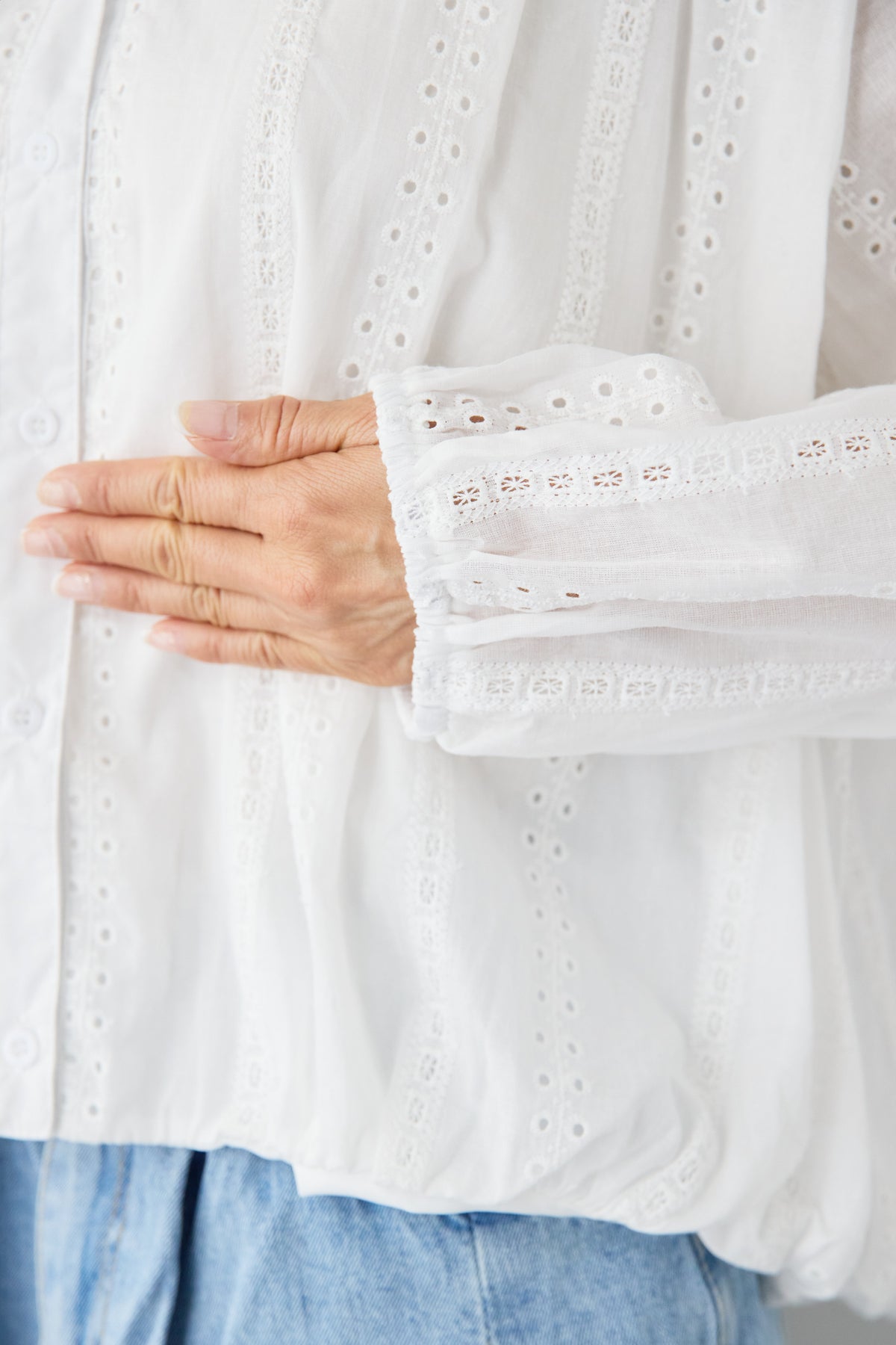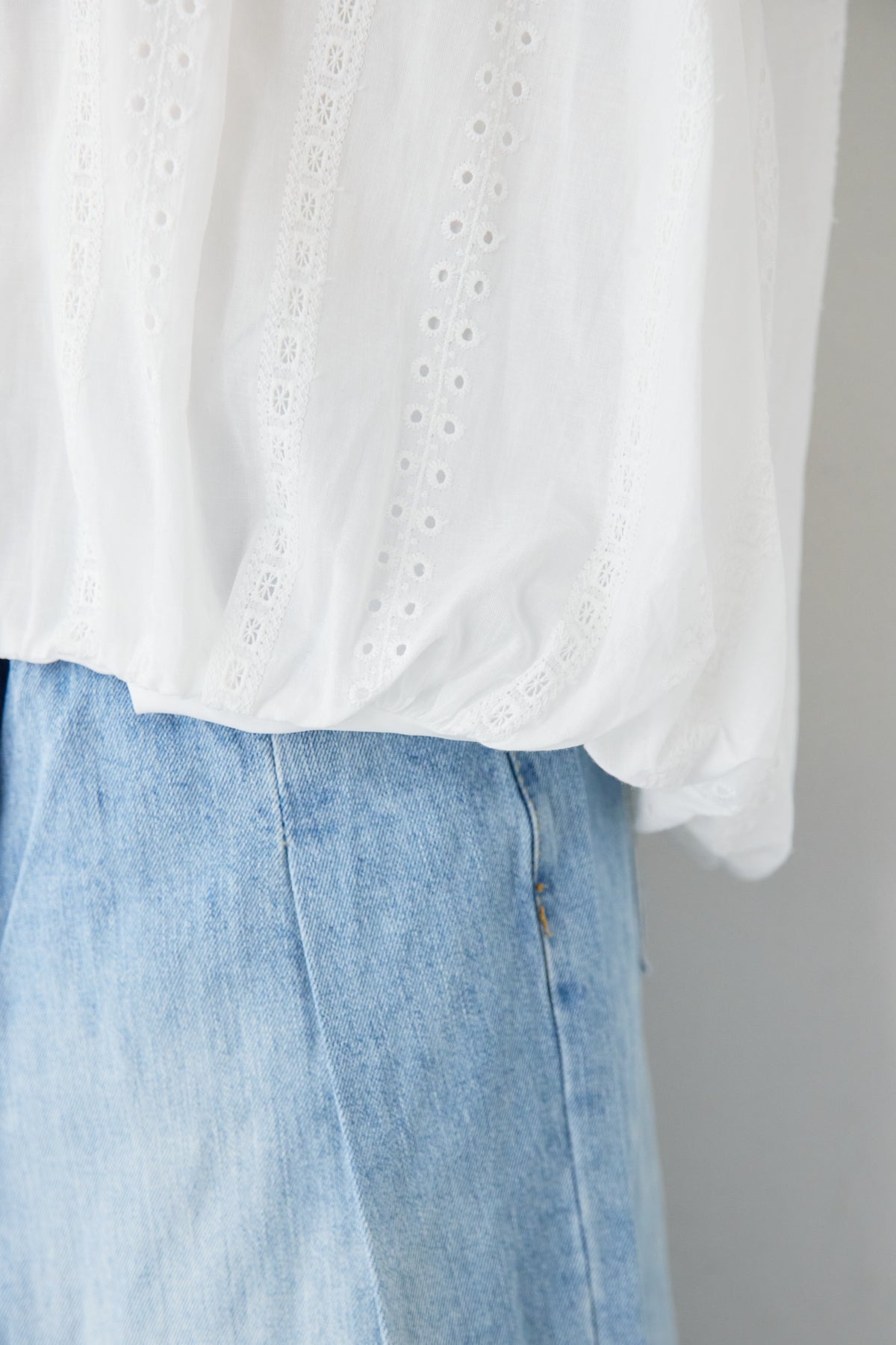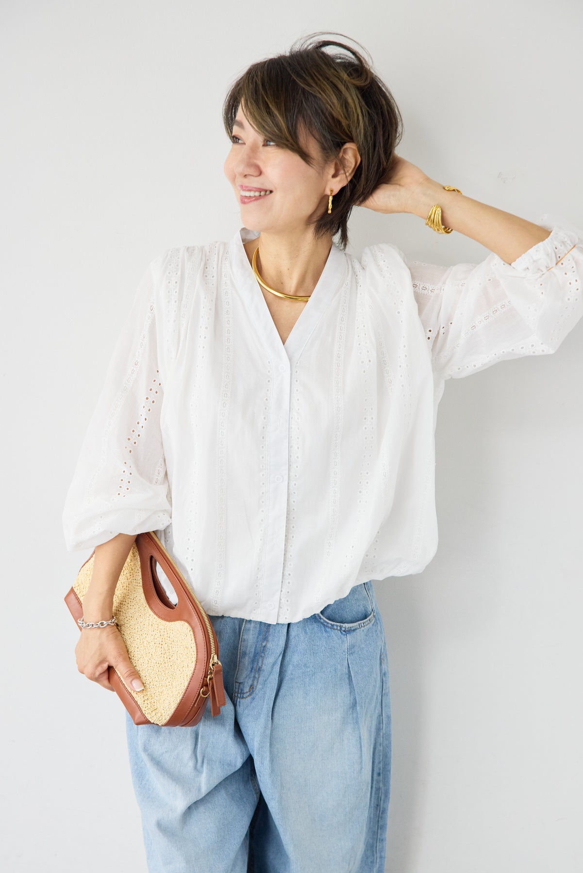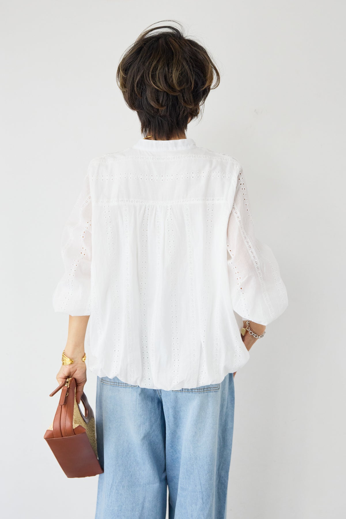 繊細なカットレースが上品な印象を演出する、大人のためのデザインブラウス。軽やかな素材感と程よい透け感が、女性らしいやわらかな雰囲気を引き立てます。顔まわりをすっきり見せてくれるVネックデザインは、抜け感があり上品な印象に。縦に入ったカットレースがさりげないアクセントになり、シンプルながらも表情のある一枚に仕上がっています。袖部分にもレースが施され、ふんわりとしたボリュームスリーブが女性らしいシルエットを演出。袖口はゴム仕様で、たくし上げて着ることでこなれたスタイリングも楽しめます。裾は程よく丸みのあるシルエットで、アウトスタイルでもバランスよく決まります。デニムと合わせたカジュアルスタイルから、きれいめパンツやスカートとの上品コーデまで幅広く活躍。一枚で華やかな印象を与えてくれる、シーズンを通して着回しやすいブラウスです。