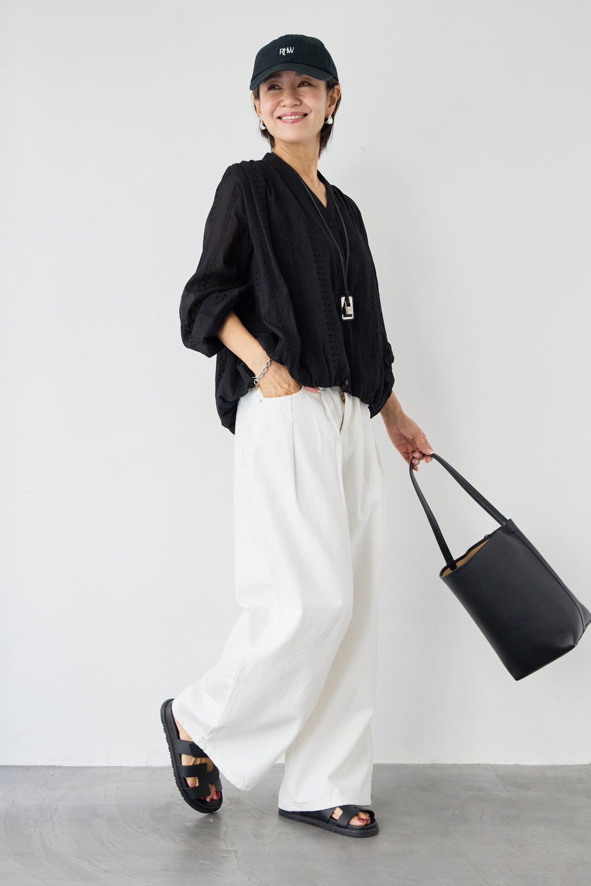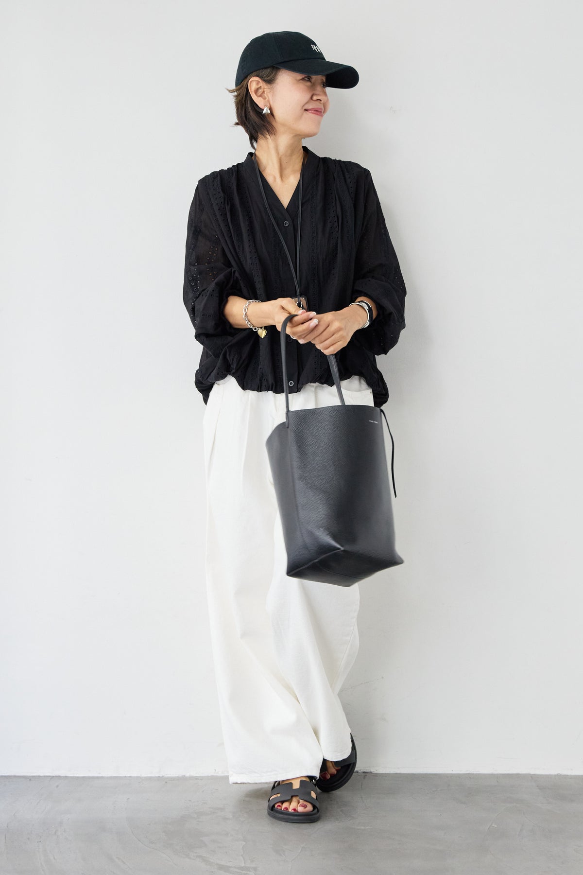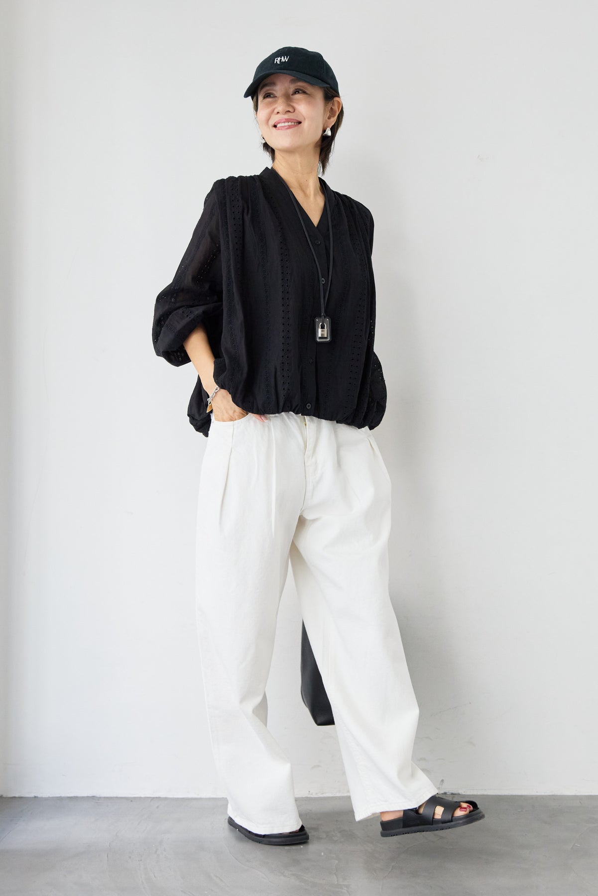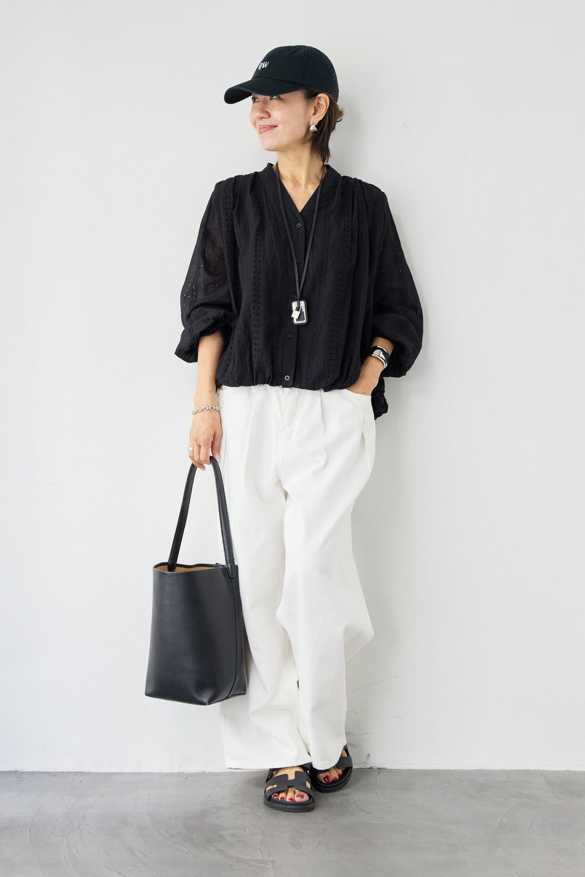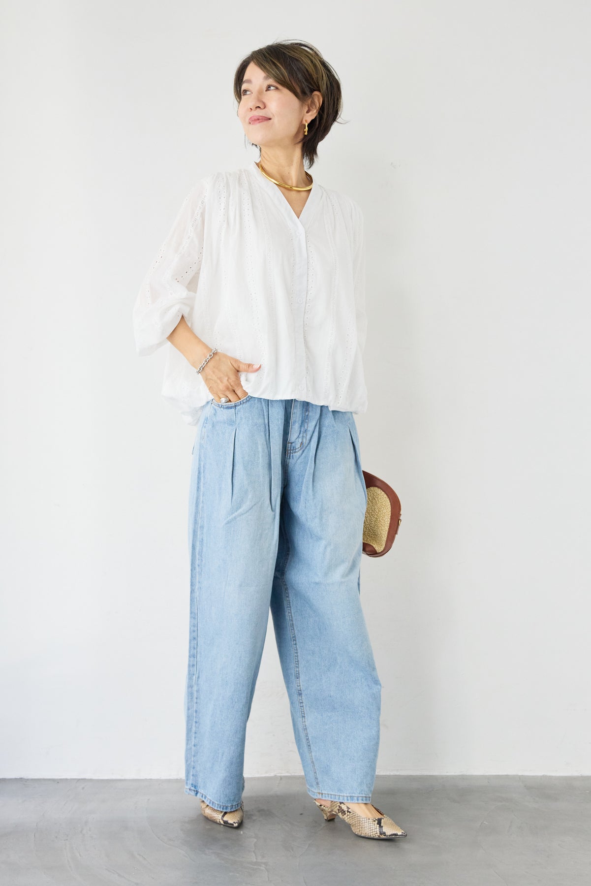 繊細なカットレースが上品な印象を演出する、大人のためのデザインブラウス。軽やかな素材感と程よい透け感が、女性らしいやわらかな雰囲気を引き立てます。顔まわりをすっきり見せてくれるVネックデザインは、抜け感があり上品な印象に。縦に入ったカットレースがさりげないアクセントになり、シンプルながらも表情のある一枚に仕上がっています。袖部分にもレースが施され、ふんわりとしたボリュームスリーブが女性らしいシルエットを演出。袖口はゴム仕様で、たくし上げて着ることでこなれたスタイリングも楽しめます。裾は程よく丸みのあるシルエットで、アウトスタイルでもバランスよく決まります。デニムと合わせたカジュアルスタイルから、きれいめパンツやスカートとの上品コーデまで幅広く活躍。一枚で華やかな印象を与えてくれる、シーズンを通して着回しやすいブラウスです。