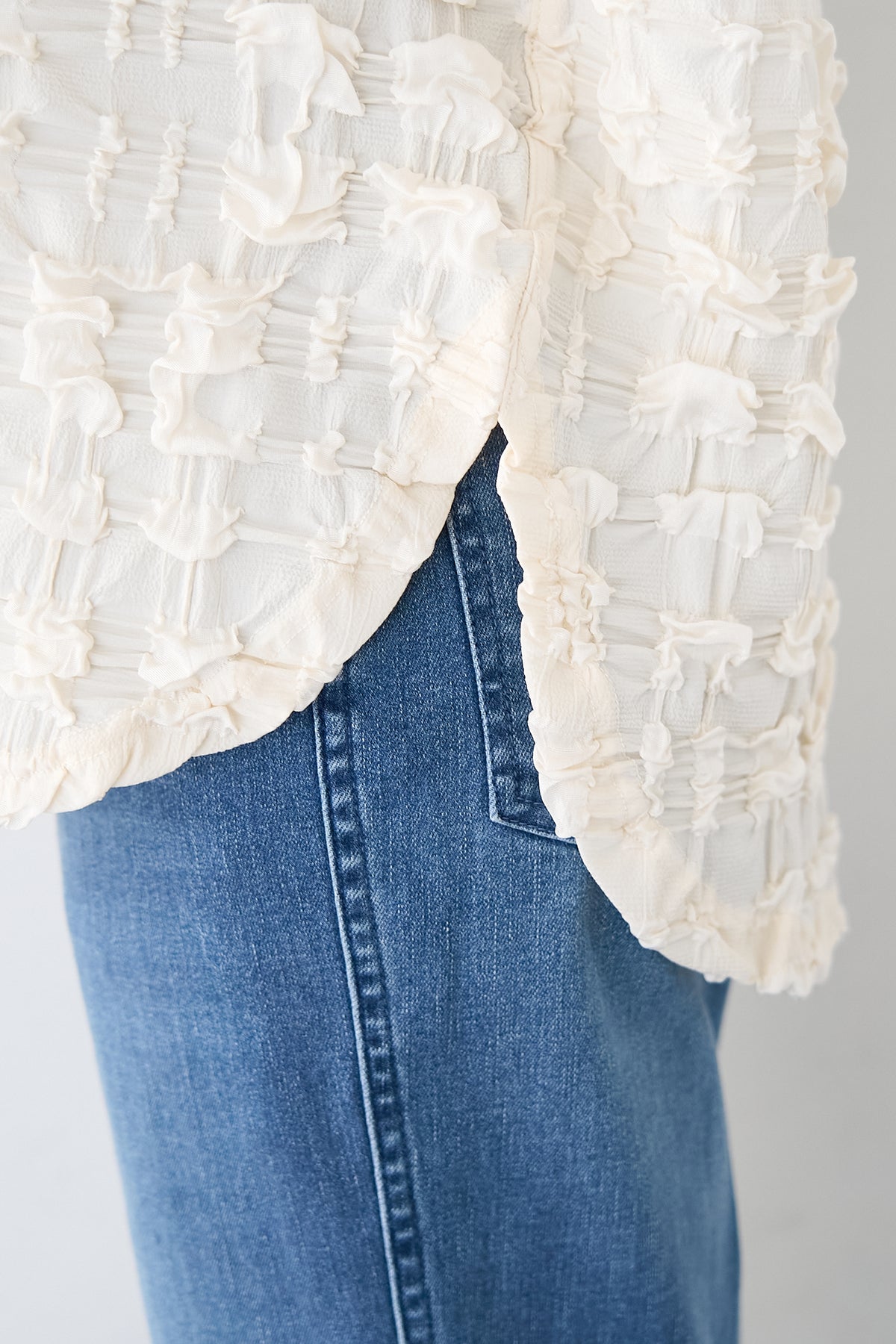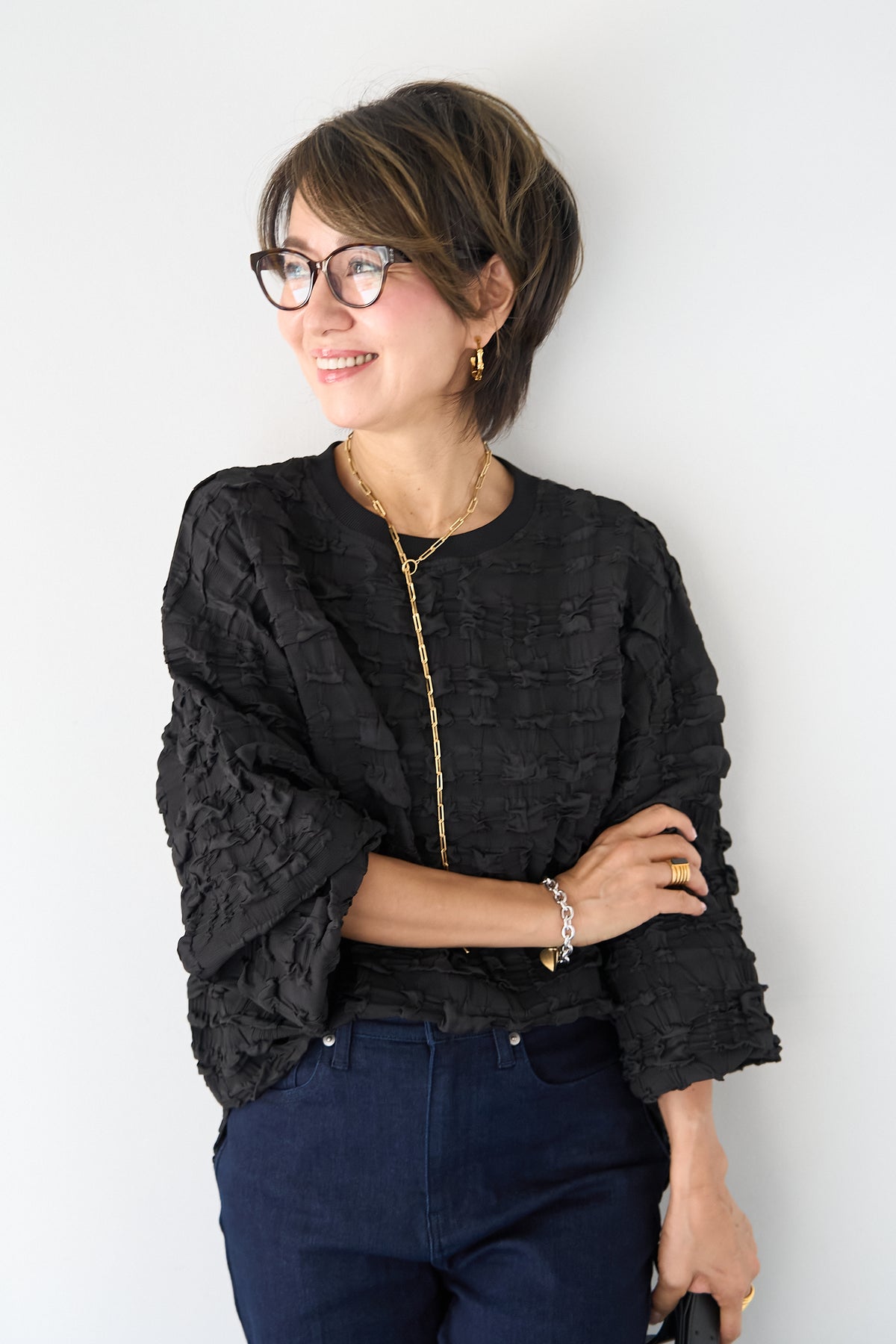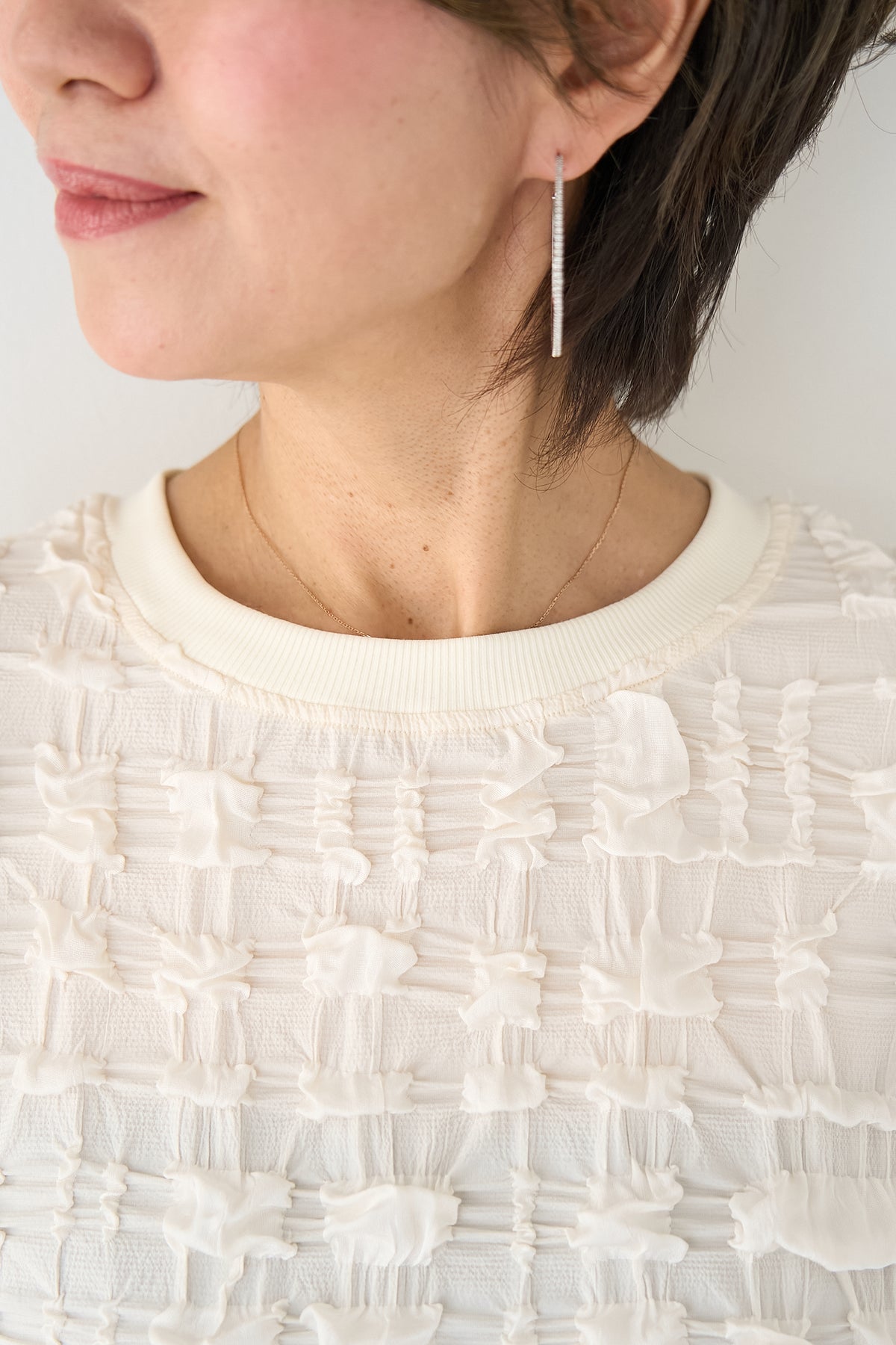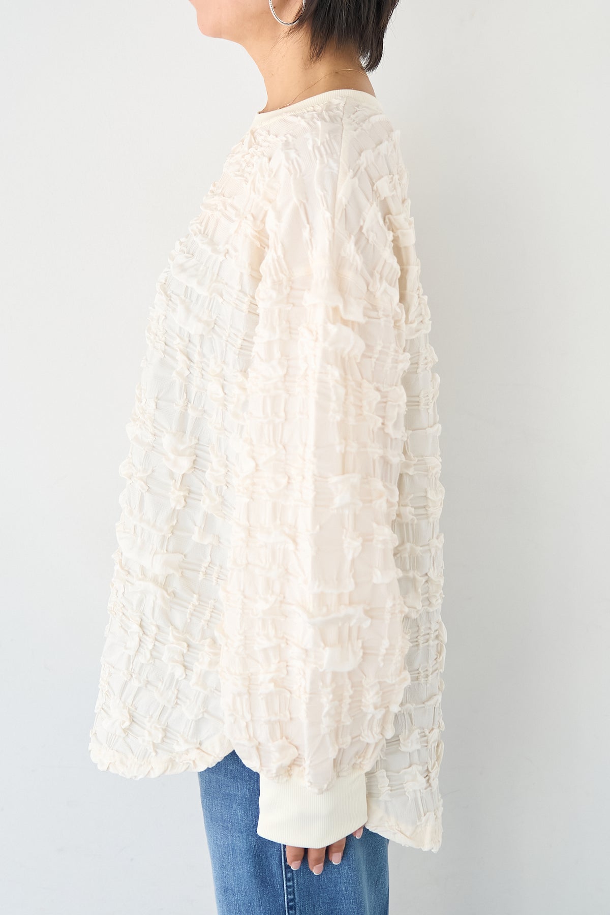 全体にあしらわれた立体的なシャーリング加工が、柔らかな光沢と陰影を演出します。 襟元と袖口には、ボディと同色のマットなリブ素材を配することで、全体の印象を程よく引き締め、カジュアルすぎないクリーンな仕上がりに。 サイドにはスリットが入っており、前後差のあるヘムラインが腰回りをさりげなくカバーしながら、ボトムスとのバランスを美しく整えます。