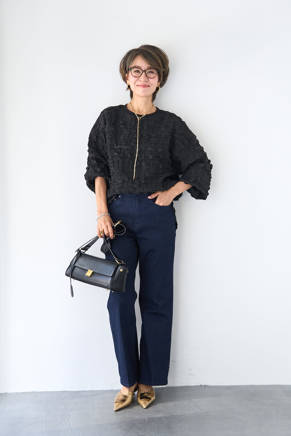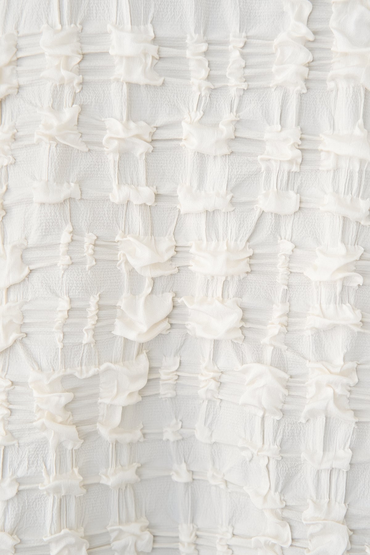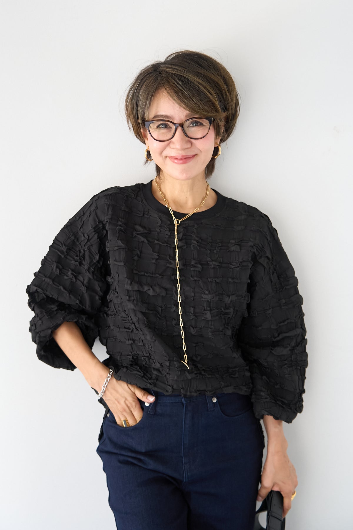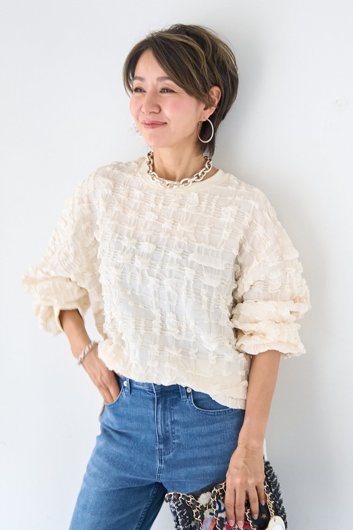 全体にあしらわれた立体的なシャーリング加工が、柔らかな光沢と陰影を演出します。 襟元と袖口には、ボディと同色のマットなリブ素材を配することで、全体の印象を程よく引き締め、カジュアルすぎないクリーンな仕上がりに。 サイドにはスリットが入っており、前後差のあるヘムラインが腰回りをさりげなくカバーしながら、ボトムスとのバランスを美しく整えます。