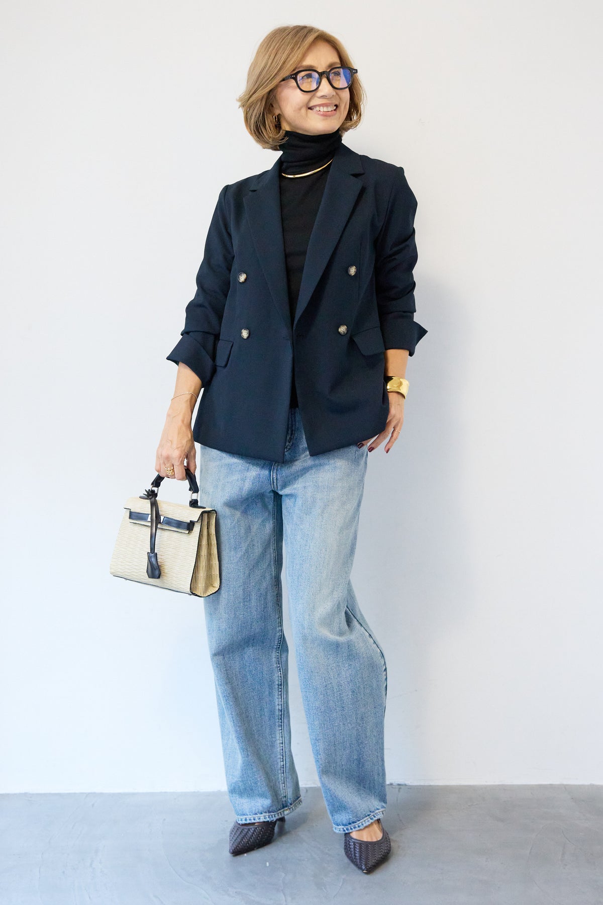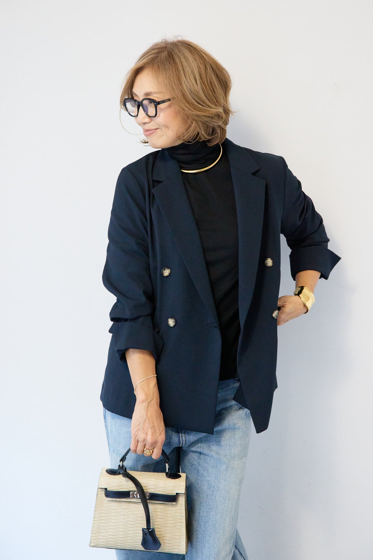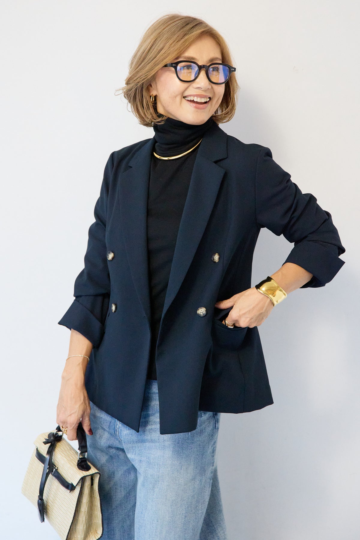 金ボタンはフラットな消しゴールドでモードな印象にまとめたダブルジャケット。 着丈は少し長めで、肩幅や袖などとのバランスが良いので、スタイルを良く見せてくれる直線的なシルエット。きれいめにもカジュアルにも着用いただけるため、ラフにボタンを開けて着用したり、肩にかけてこなれ感あるコーディネートまで汎用性が高い一枚です。