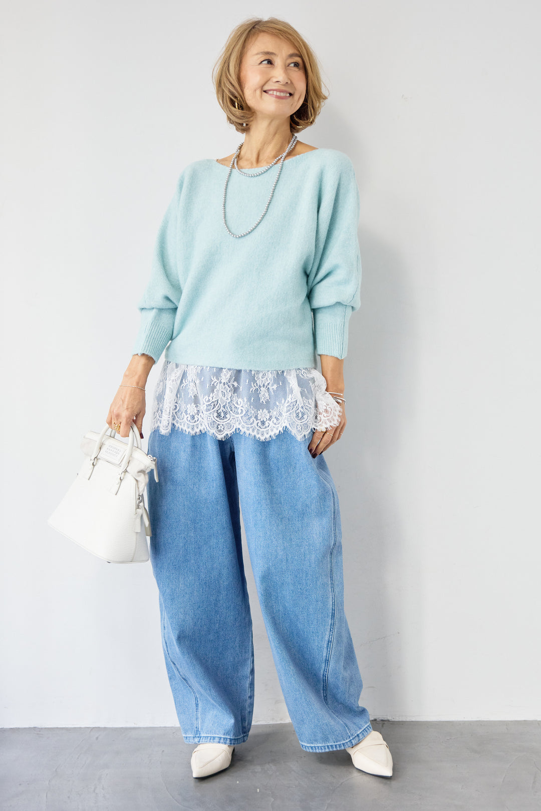 [SET]ふんわりシャギー ボートネックニットプルオーバー+裾レースキャミソール+ソフトツイル ニュアンスワイドデニム(3set)