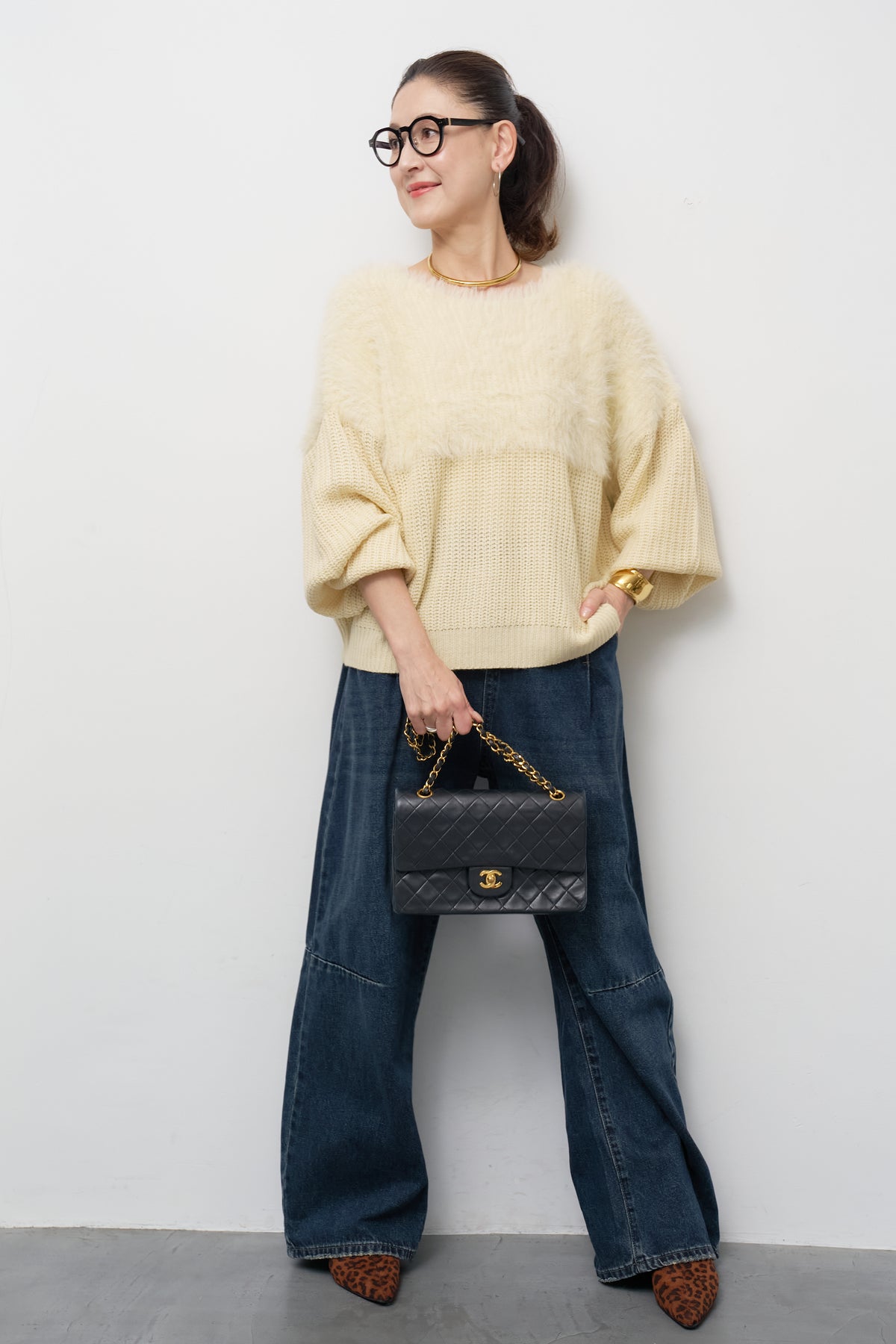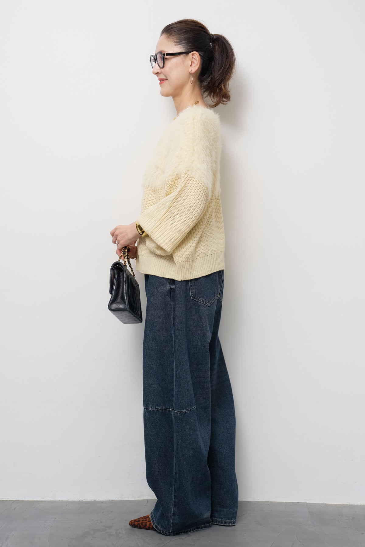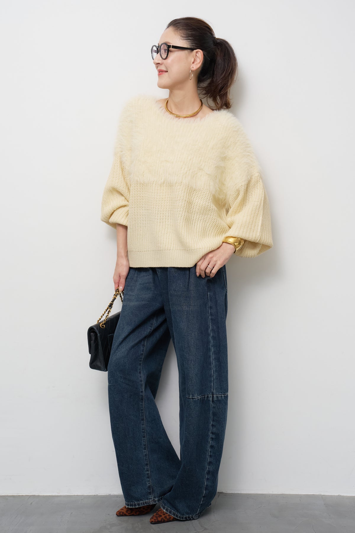 [SET]ボリュームスリーブ切替シャギーニット+カーブデニムパンツ(2set)