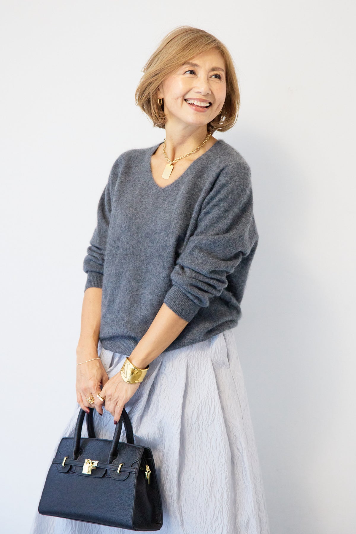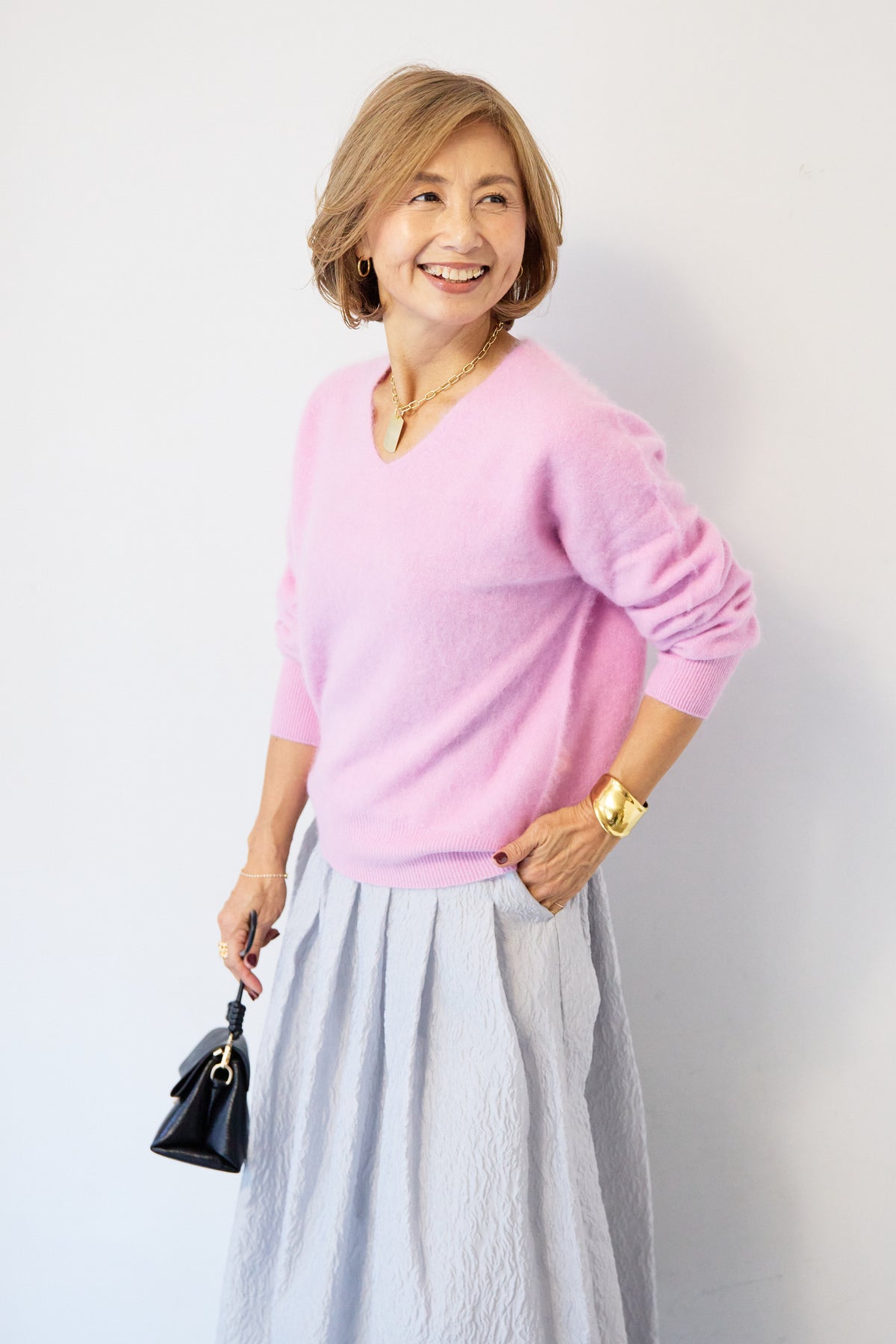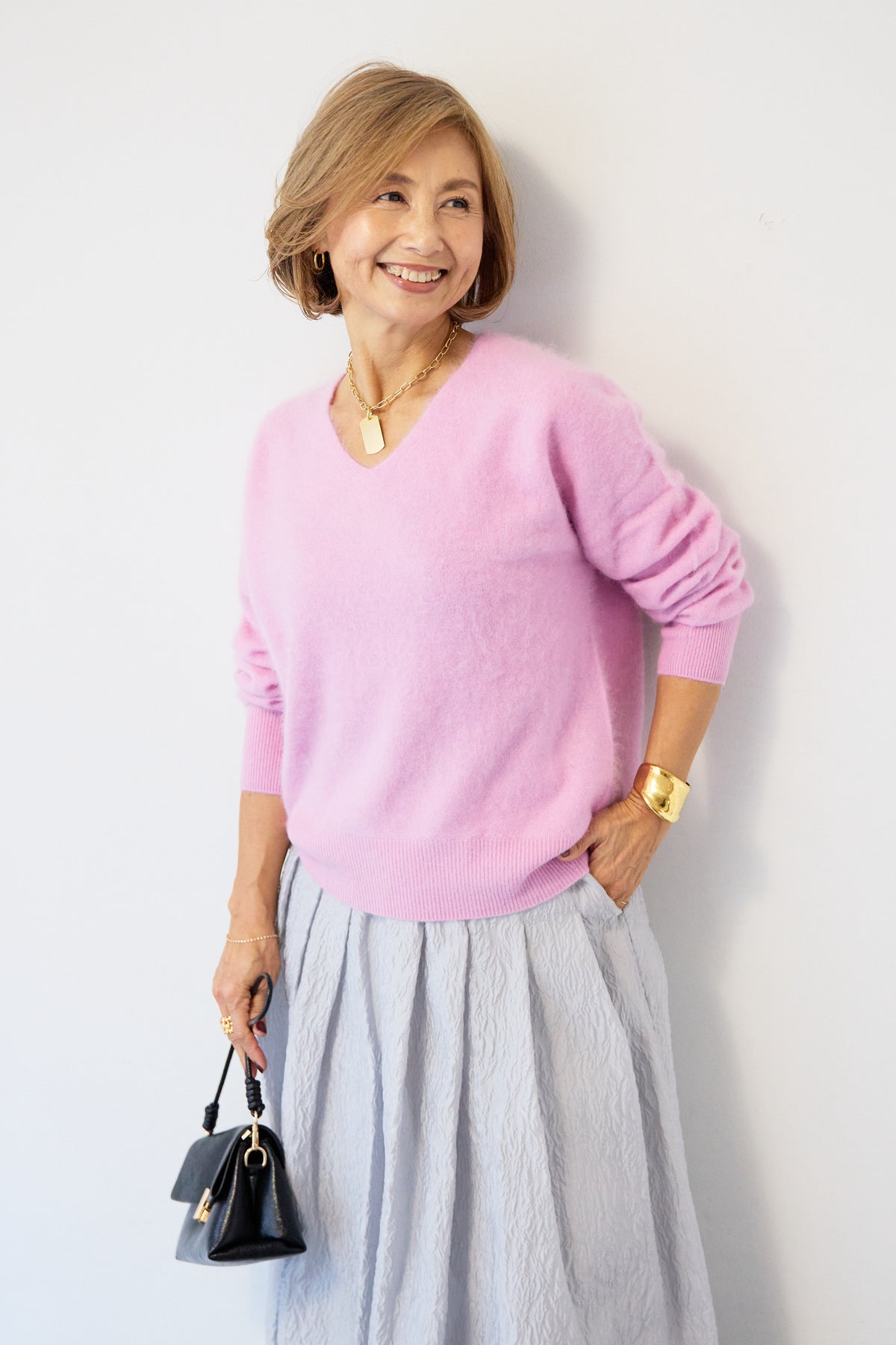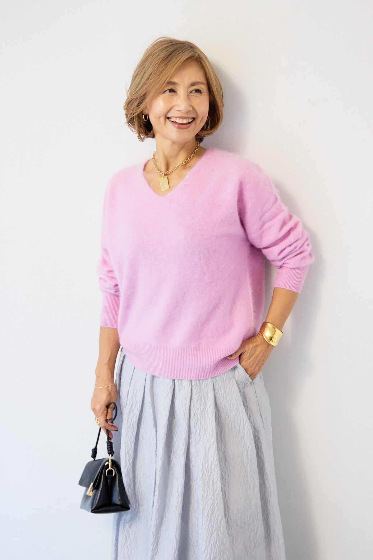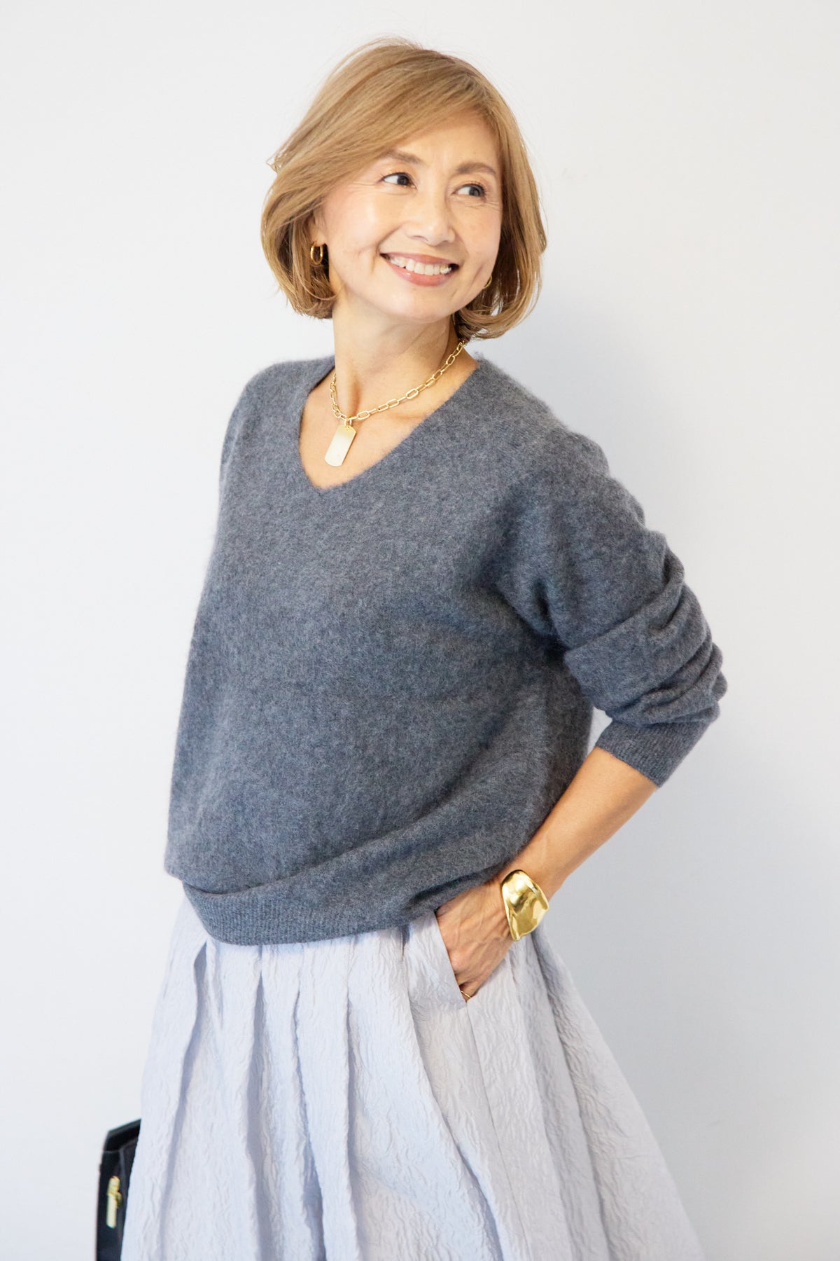 カシミヤウールVネックニット/ジャガードタックフレアスカート