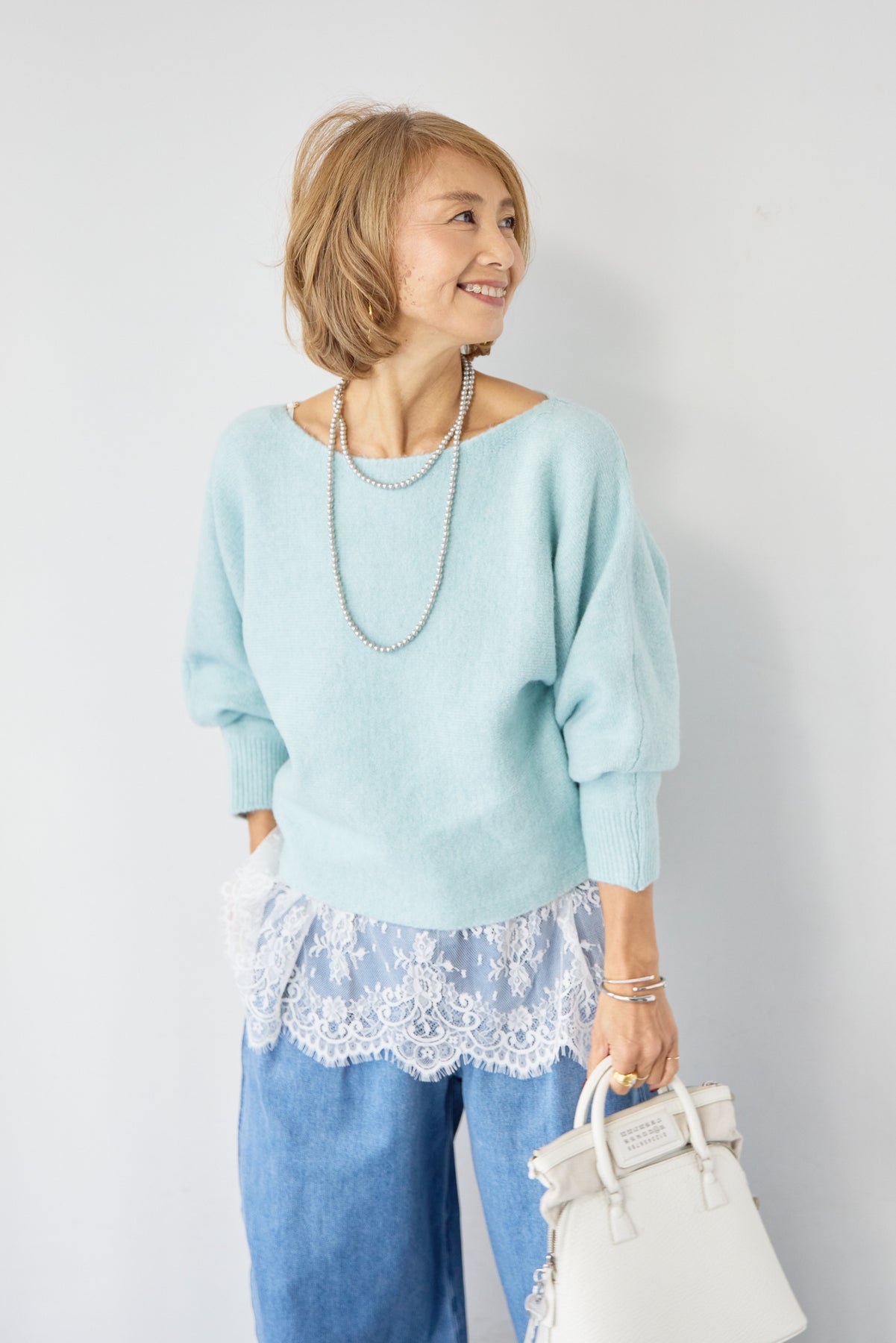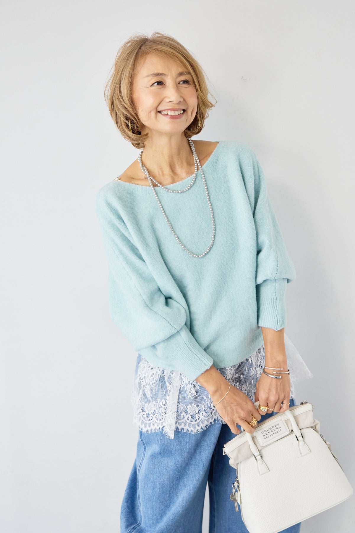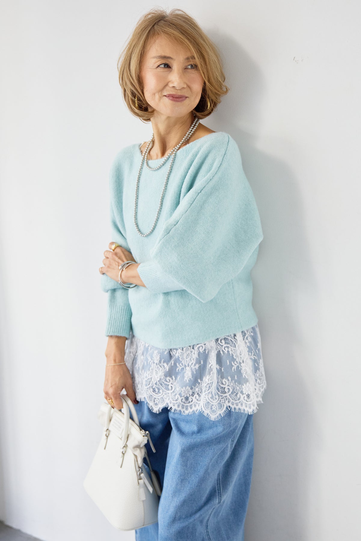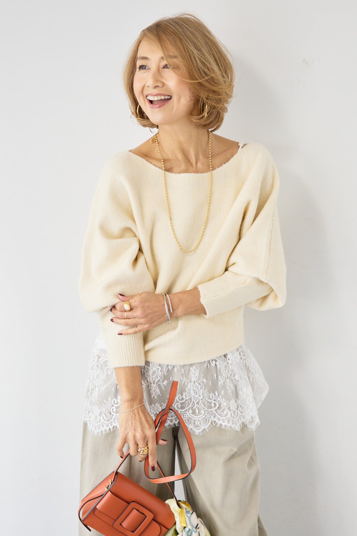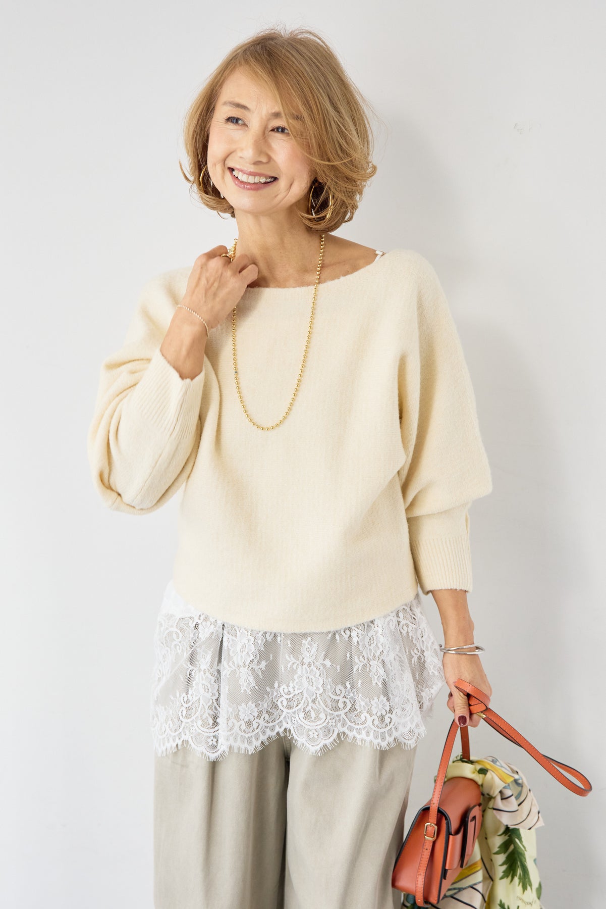 [SET]ふんわりシャギー ボートネックニットプルオーバー+裾レースキャミソール(2set)