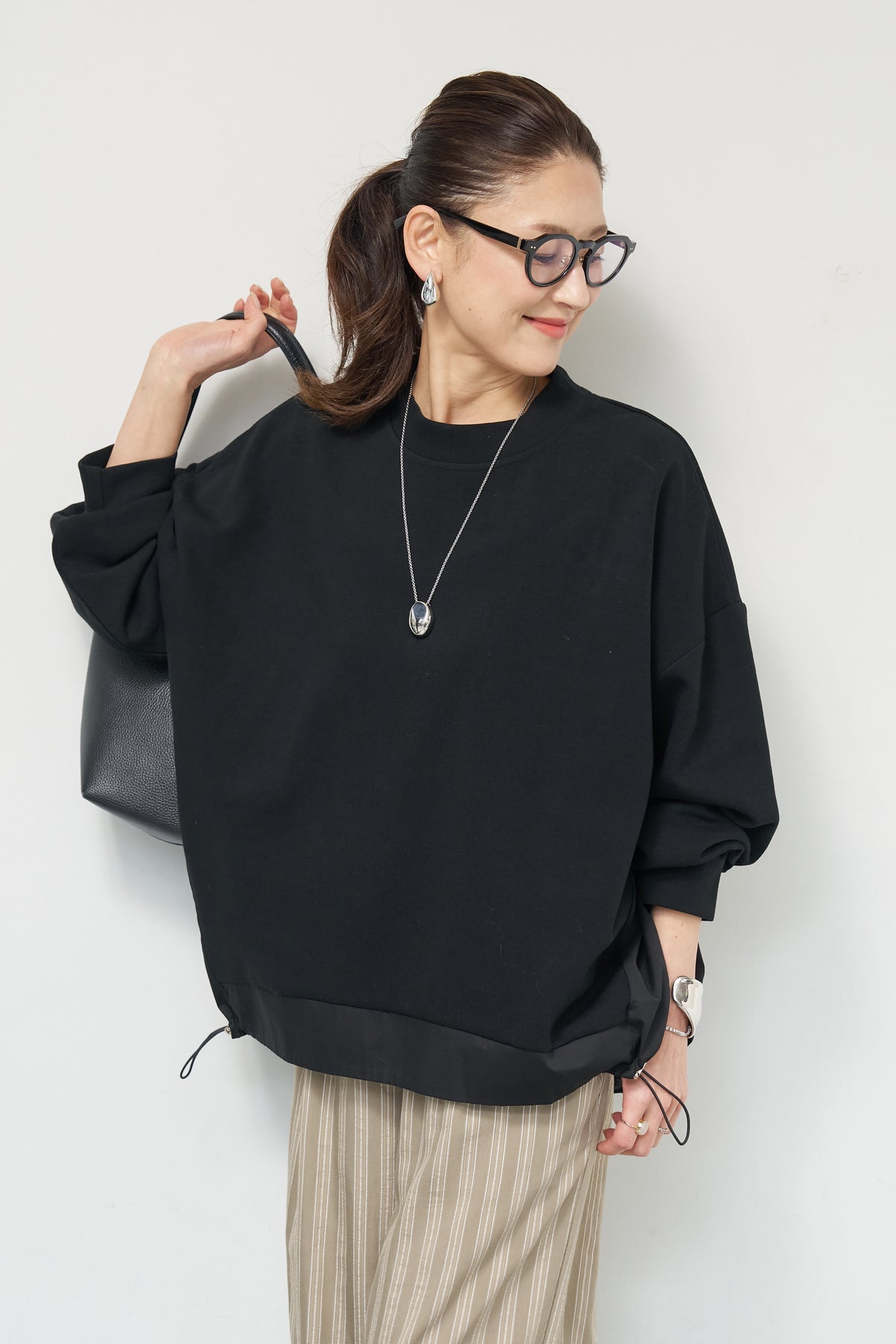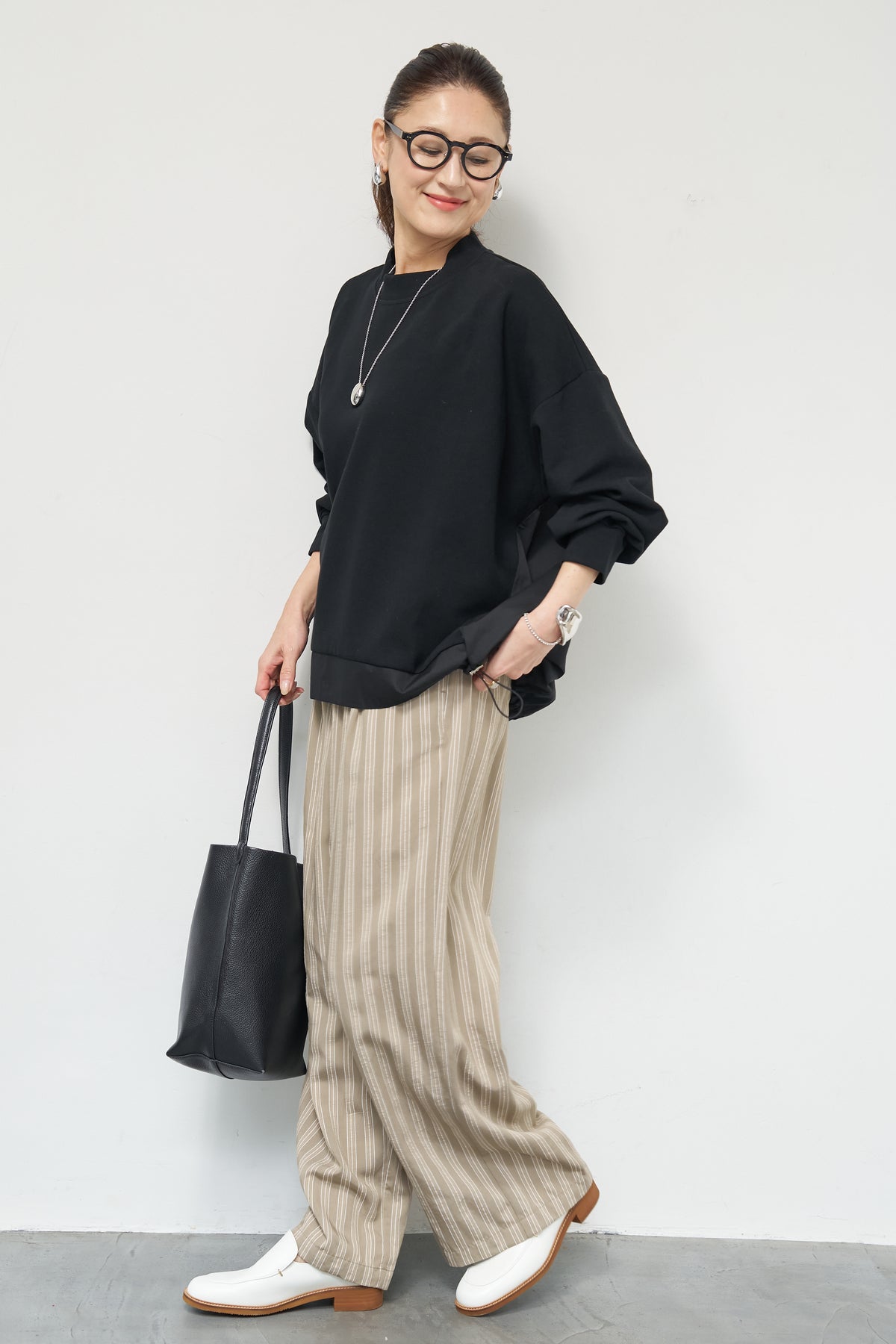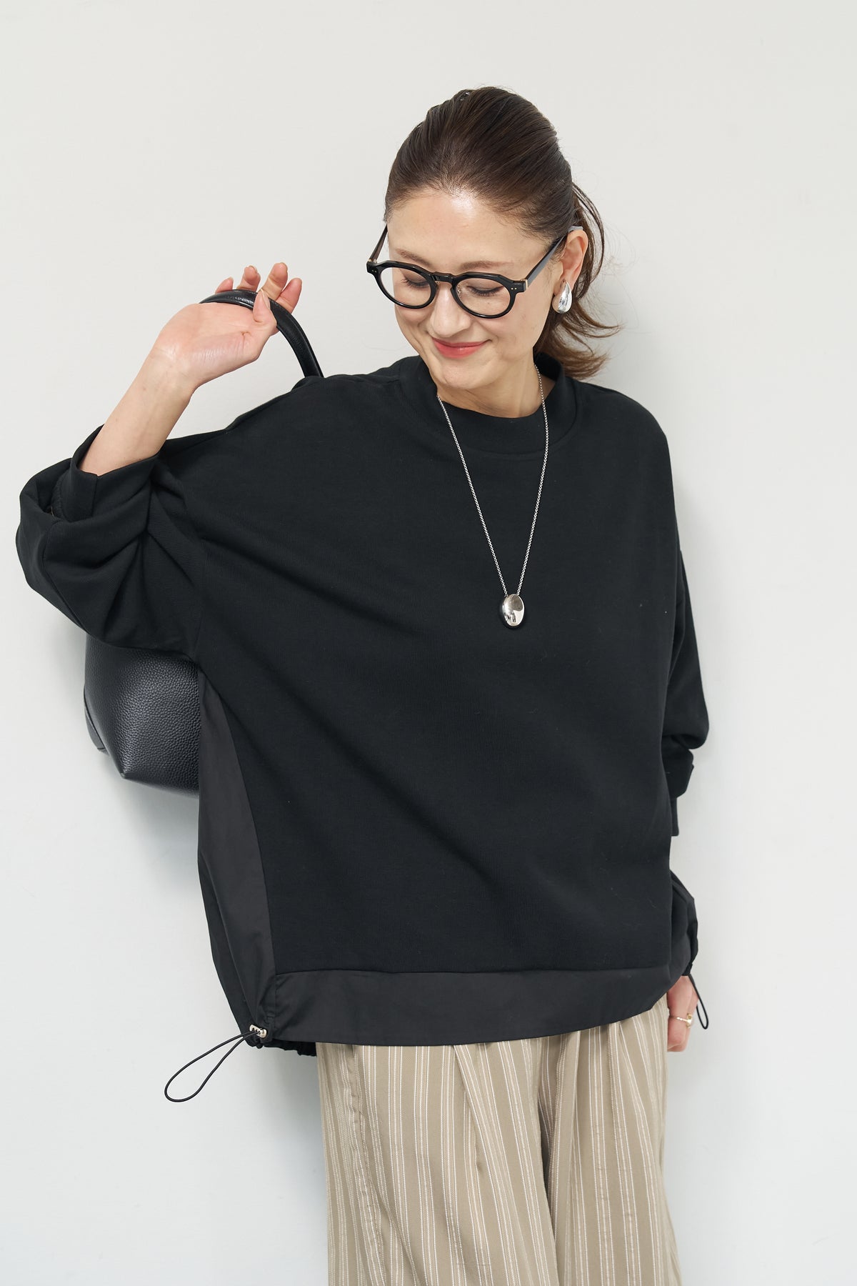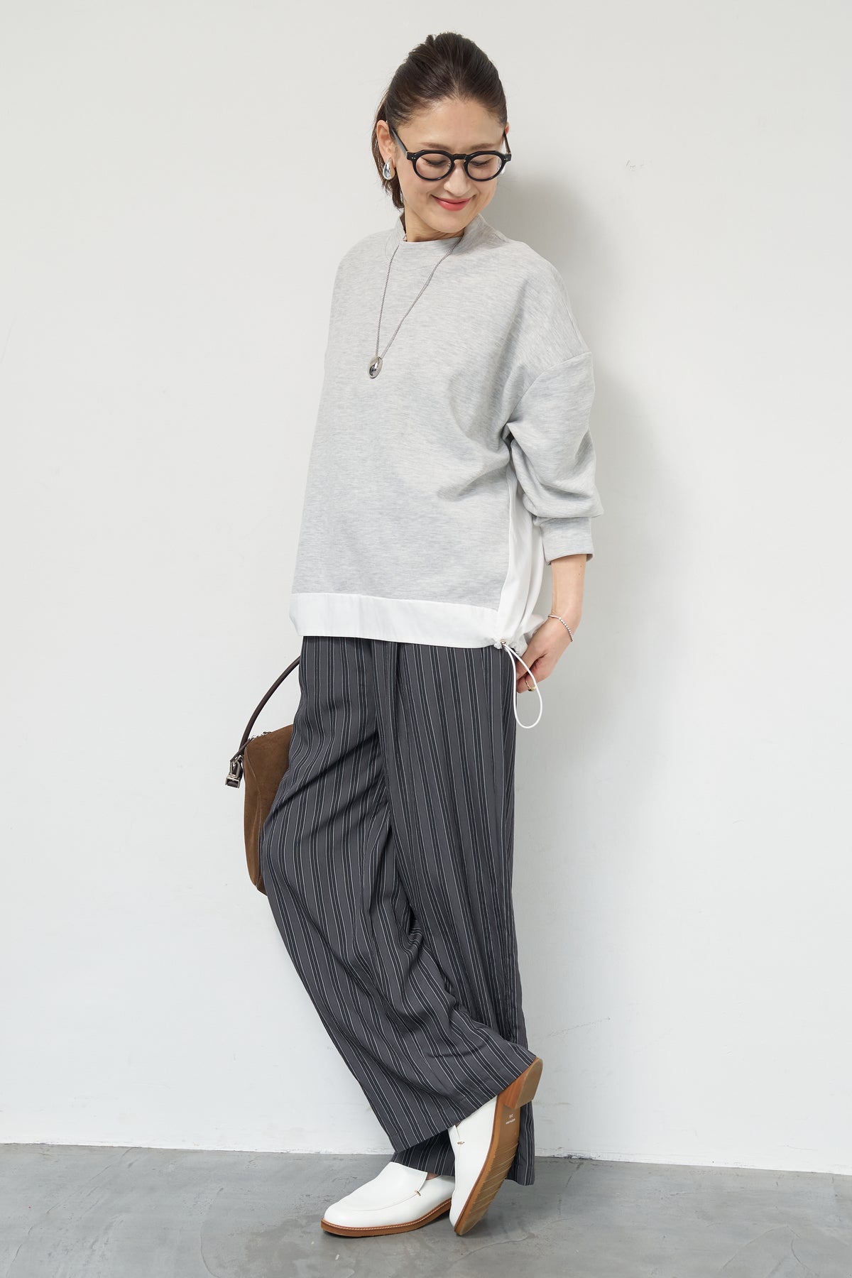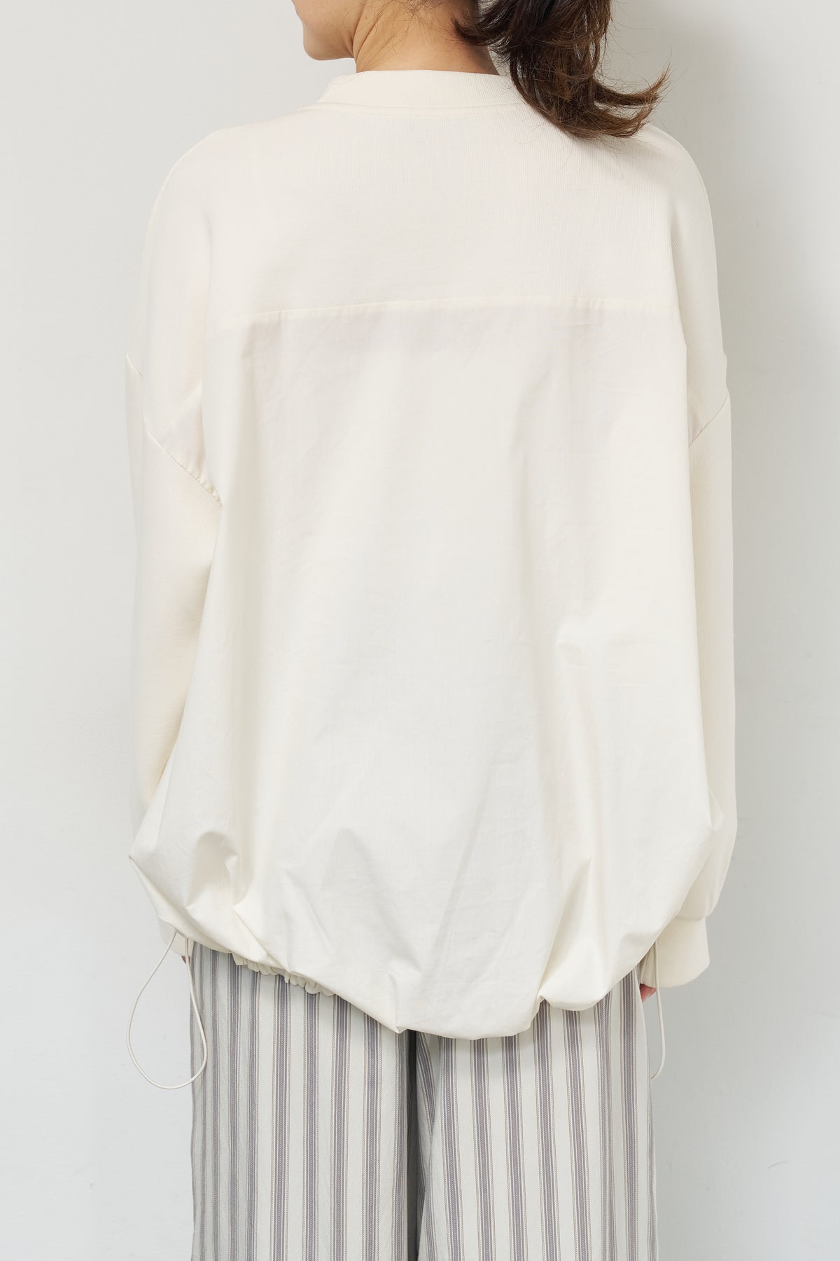 裾切替ハイネックプルオーバー/ストライプイージーパンツ