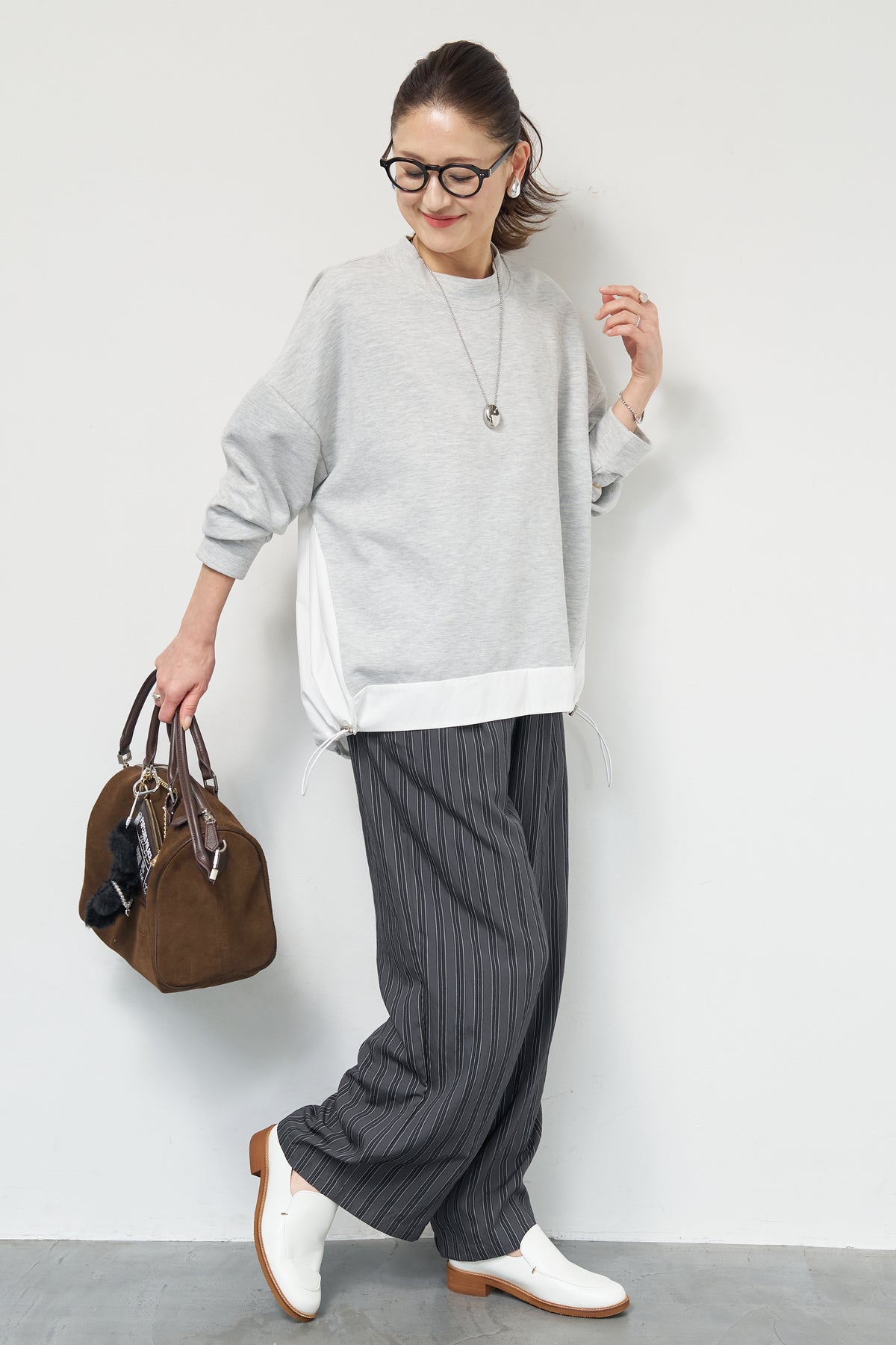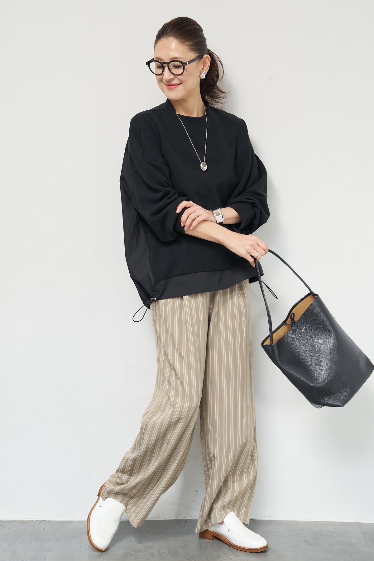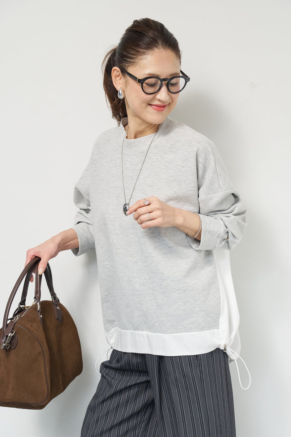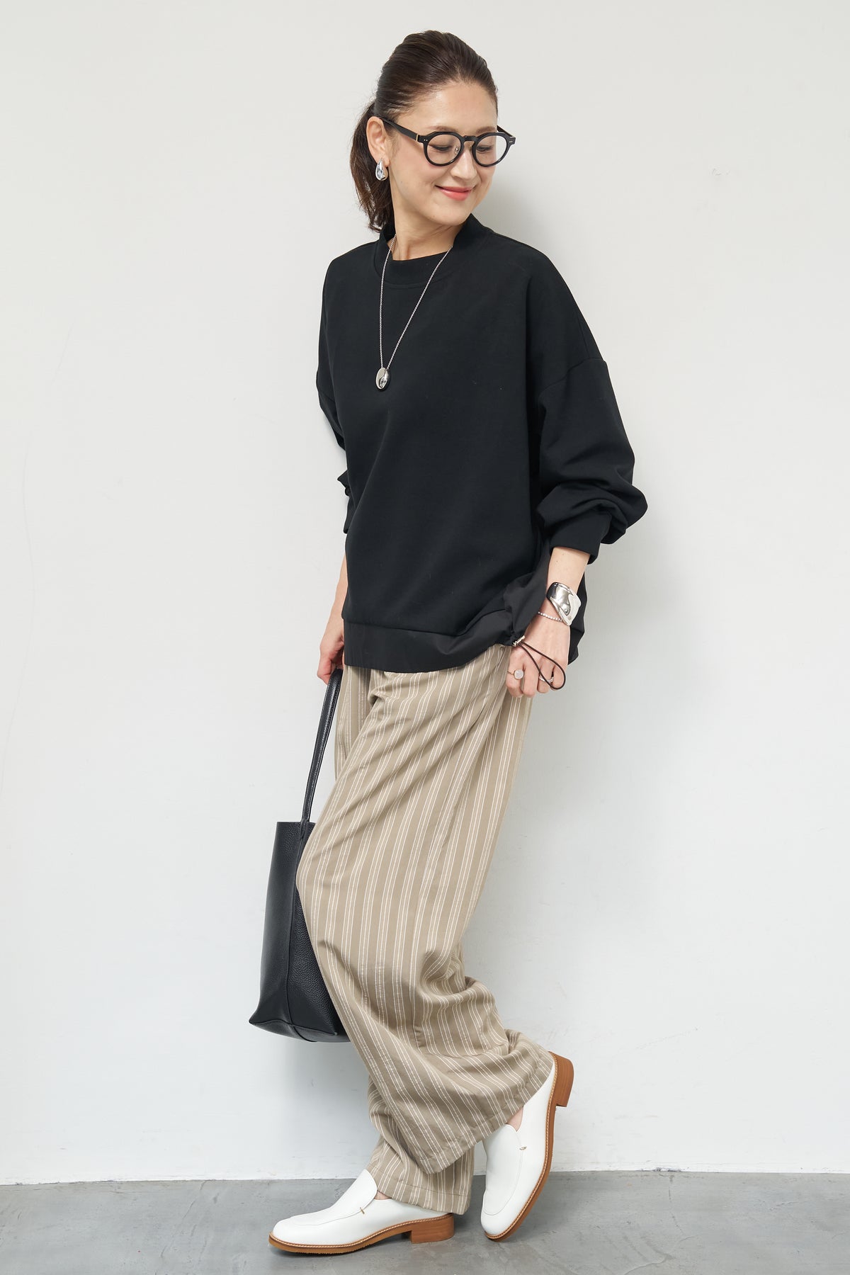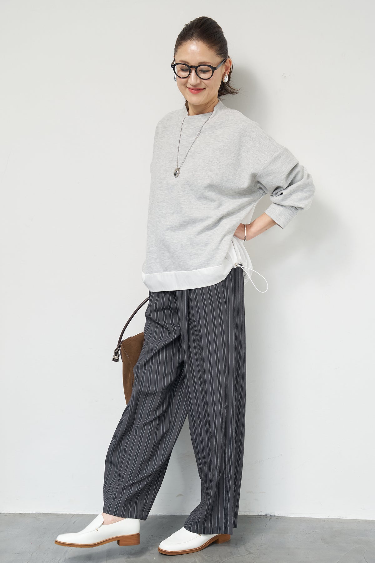 裾切替ハイネックプルオーバー/ストライプイージーパンツ