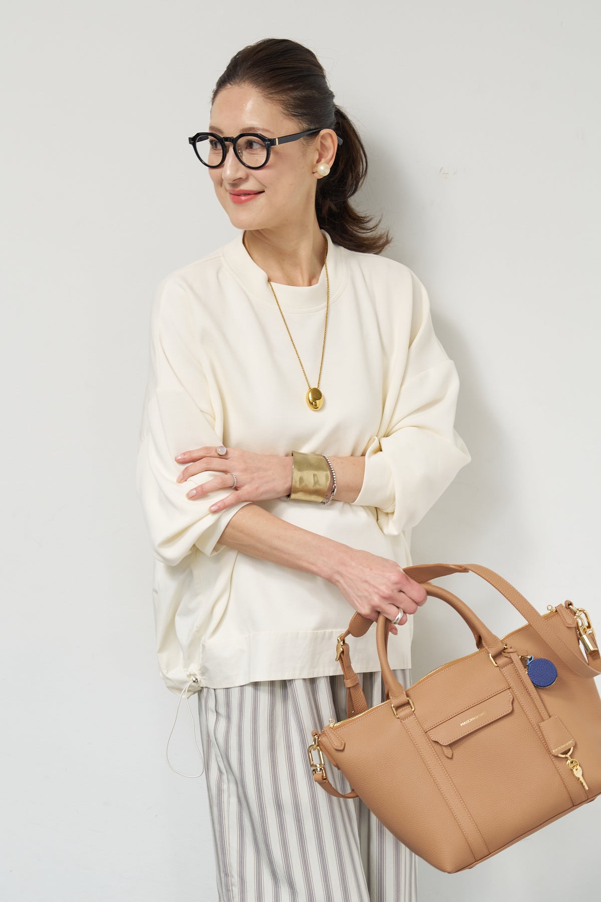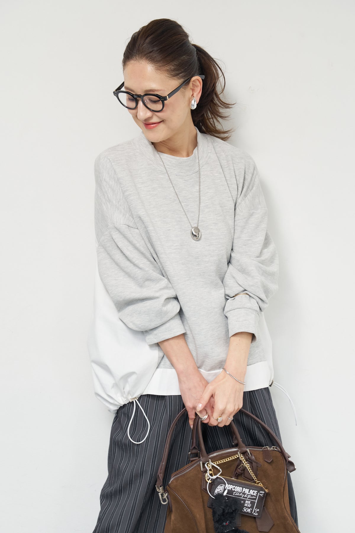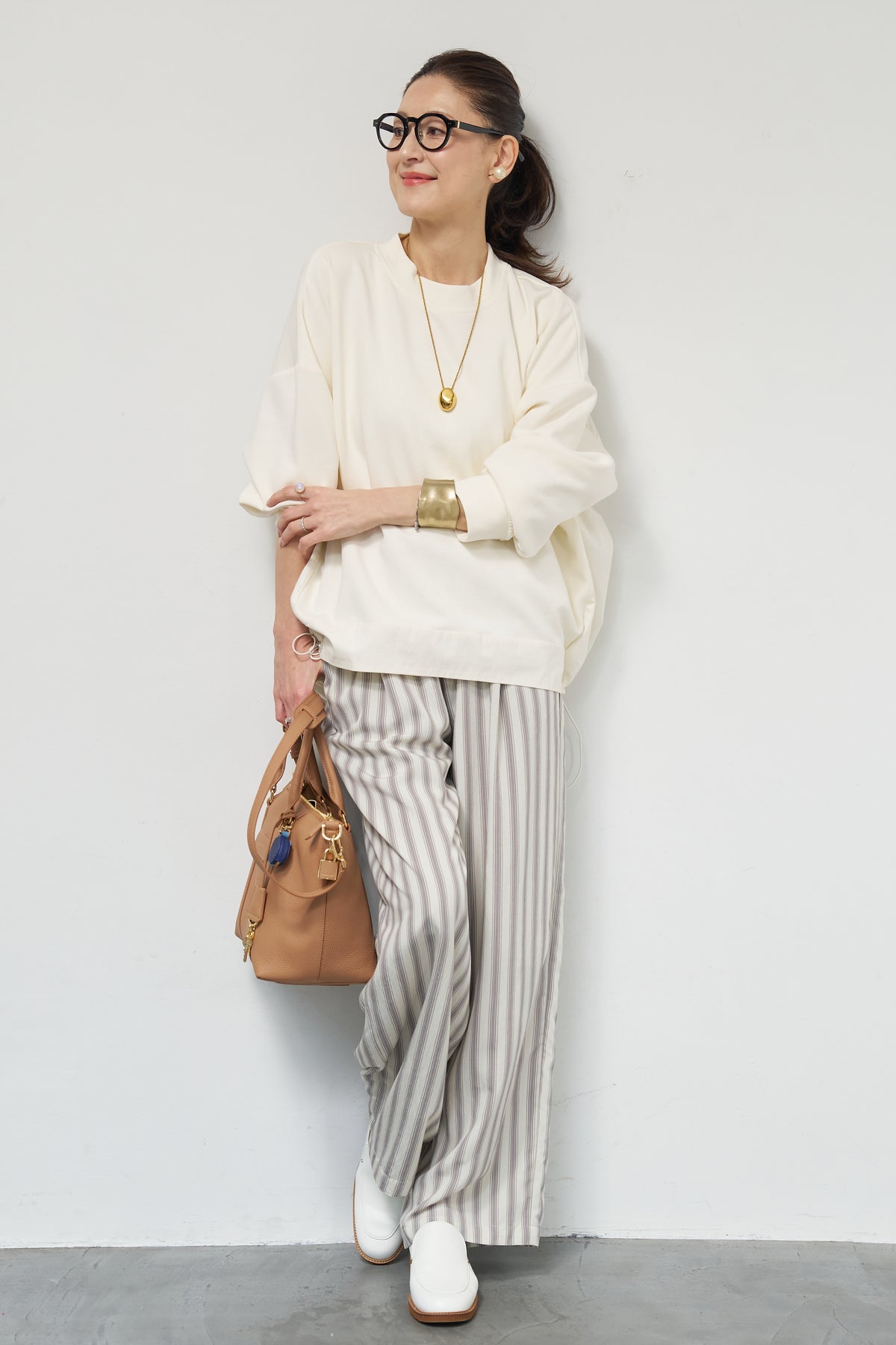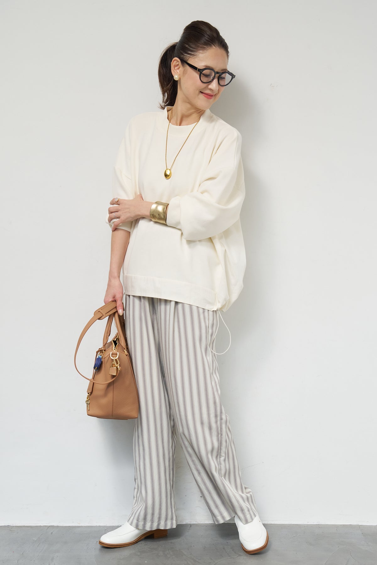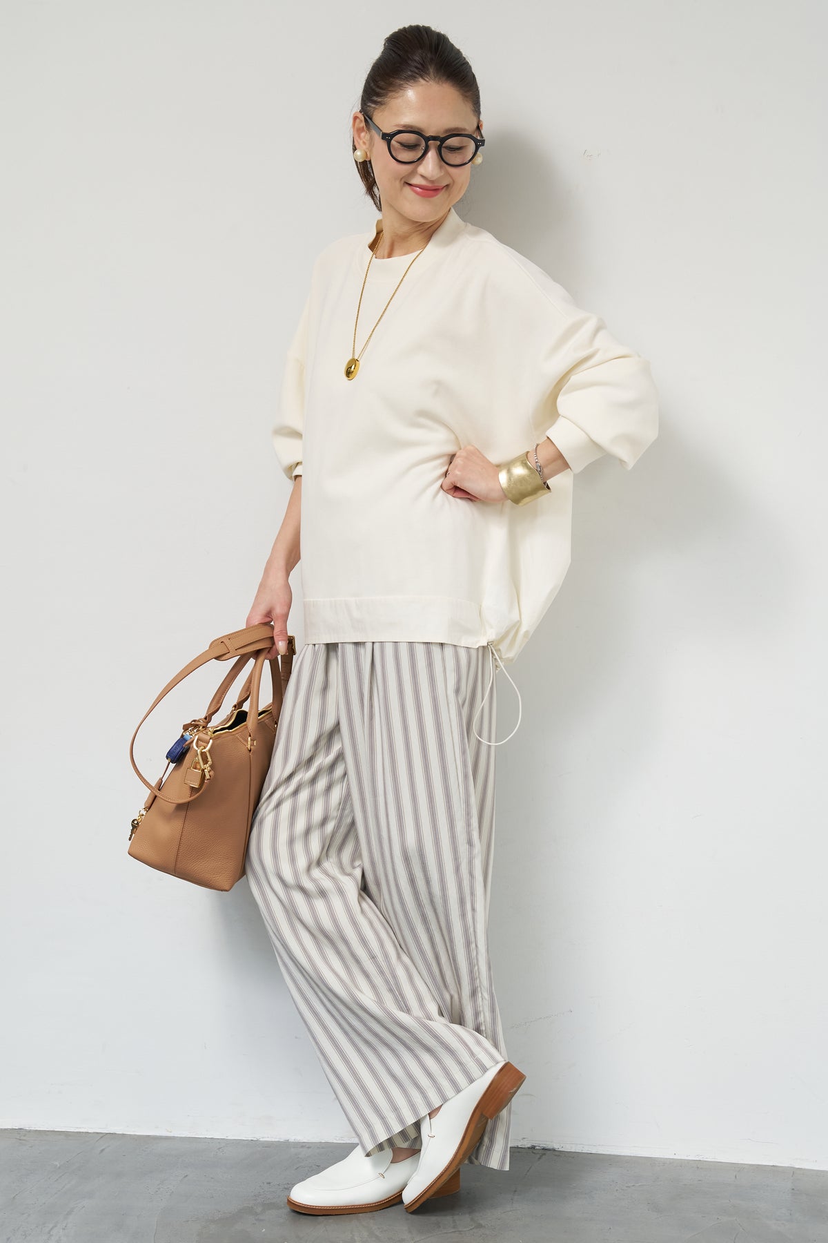裾切替ハイネックプルオーバー/ストライプイージーパンツ