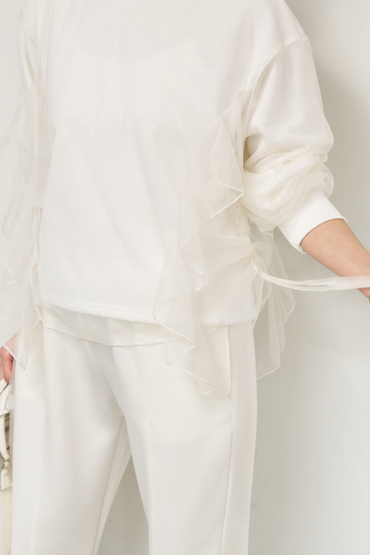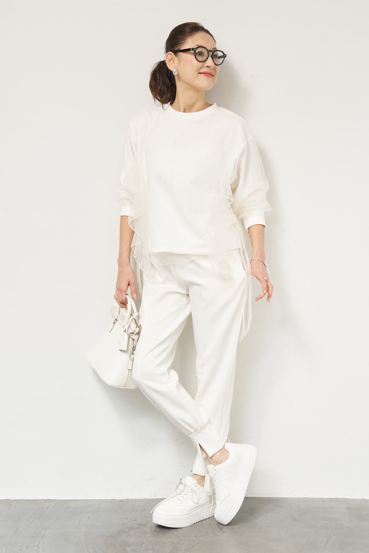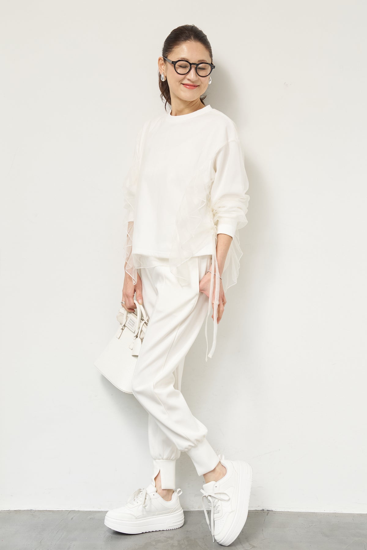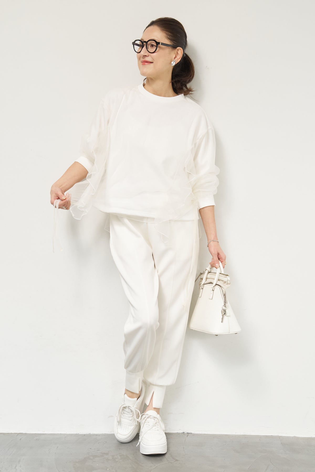 チュールレイヤード裏毛プルオーバー/ライトダンボールジョガーパンツ