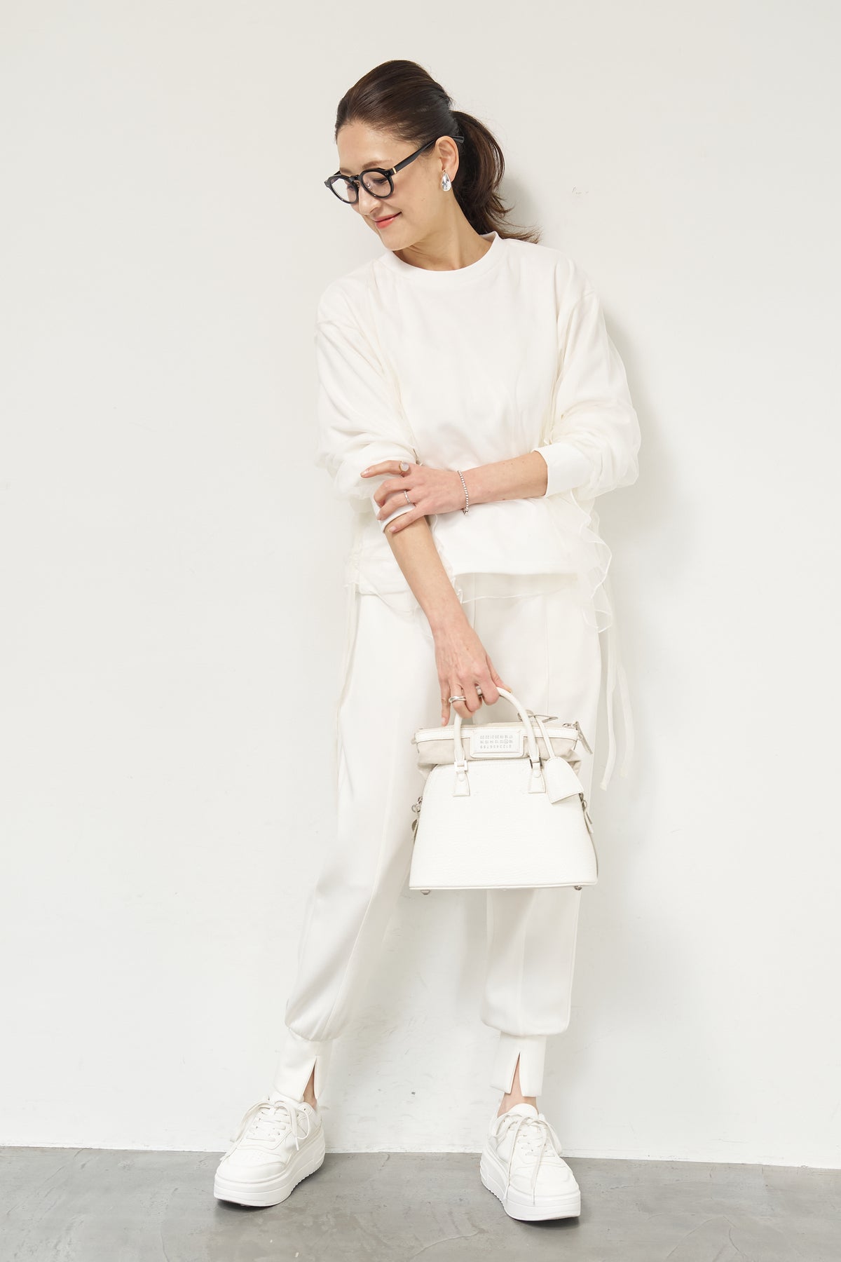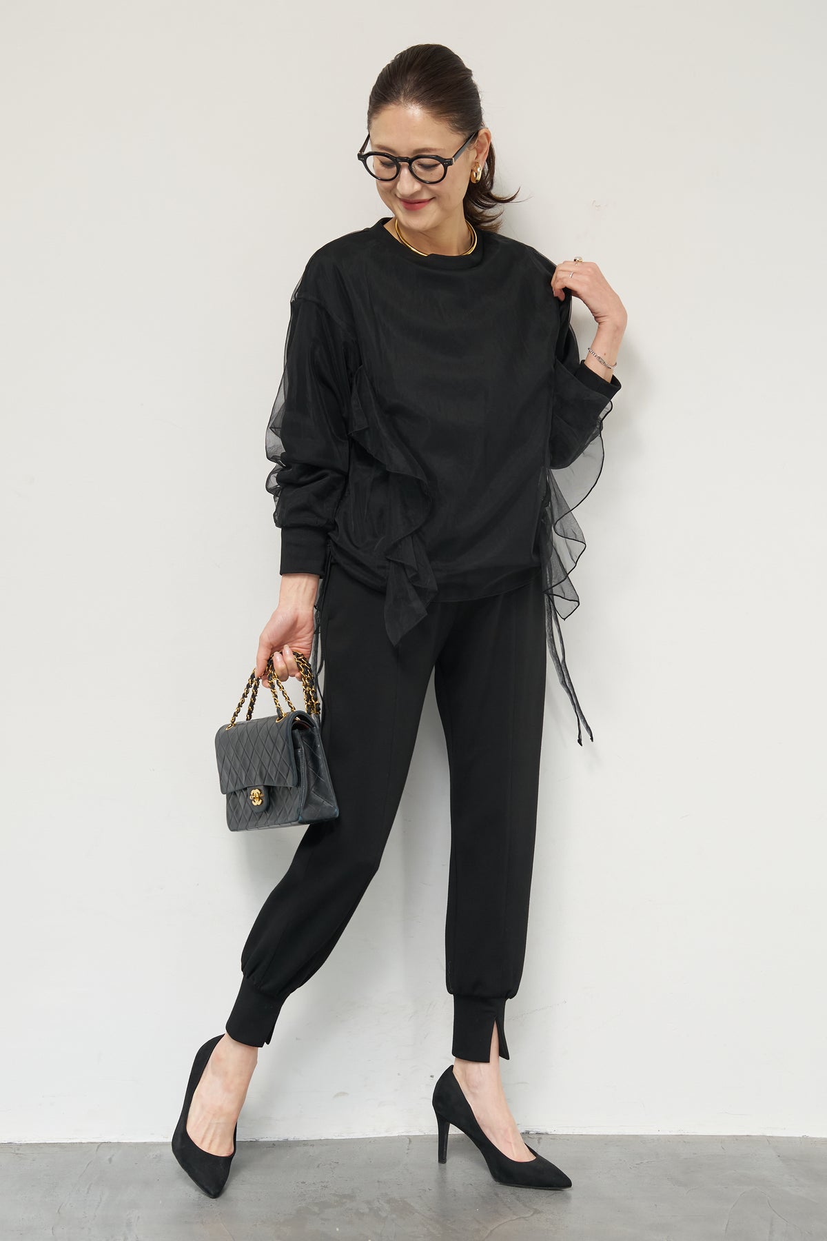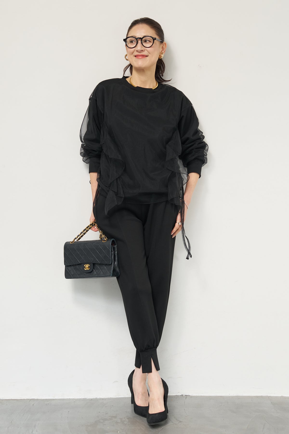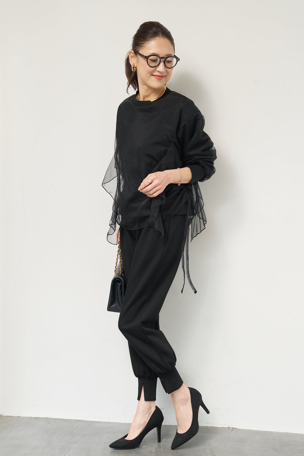 チュールレイヤード裏毛プルオーバー/ライトダンボールジョガーパンツ