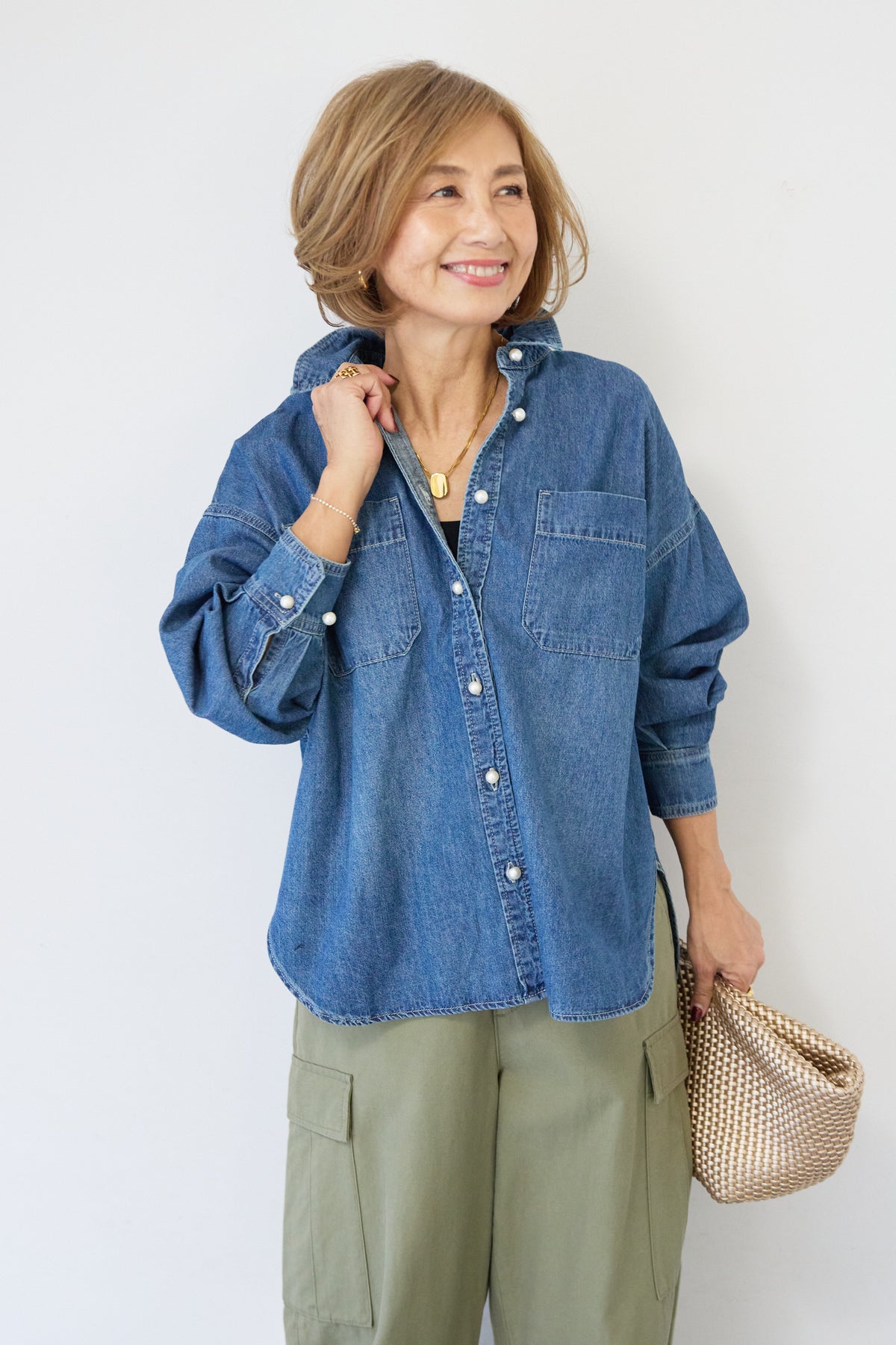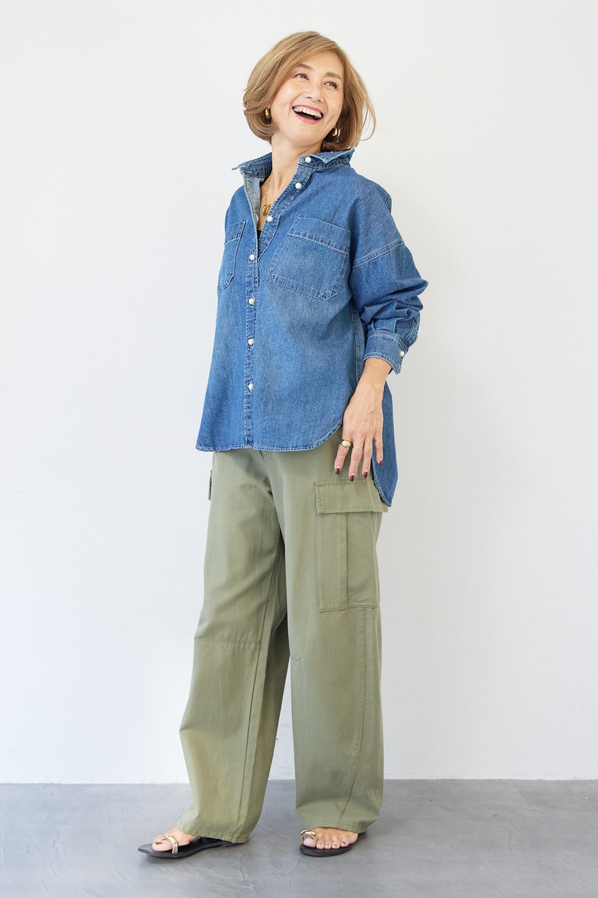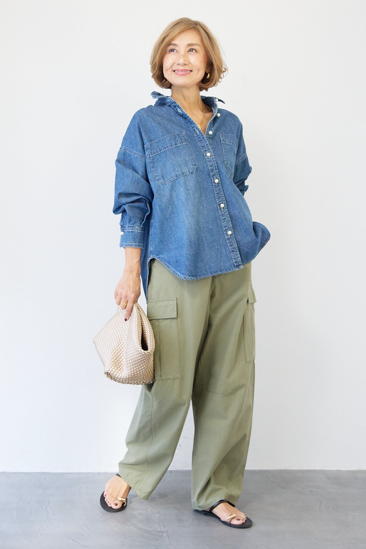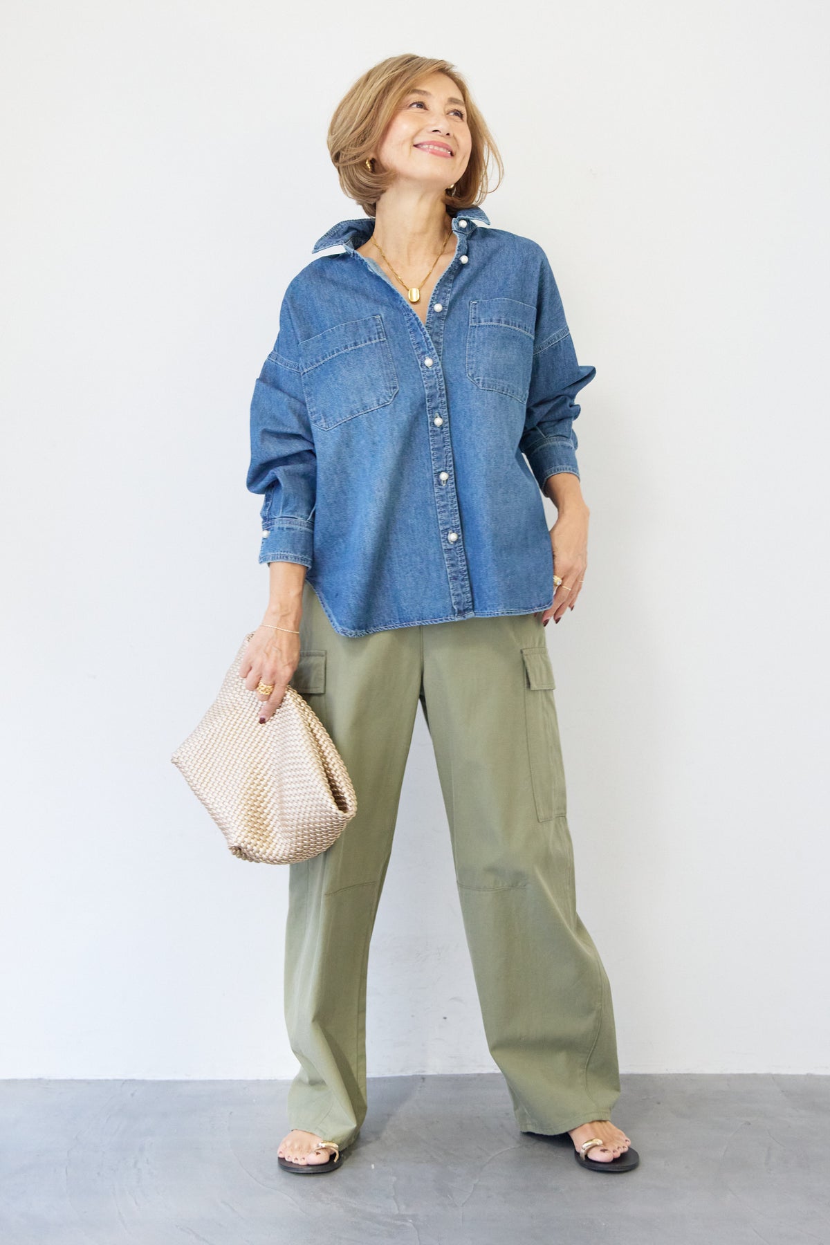 パールボタンデニムシャツ/テンセルカーゴパンツ