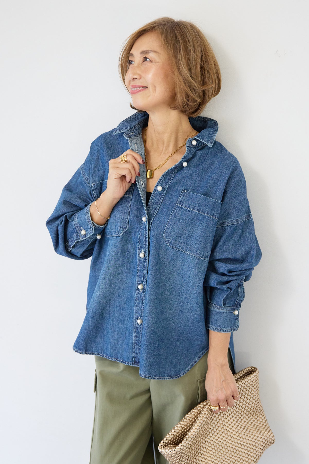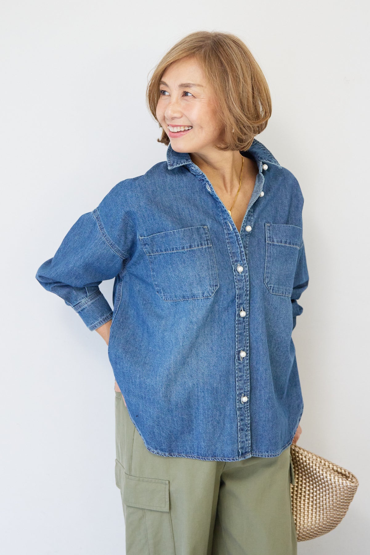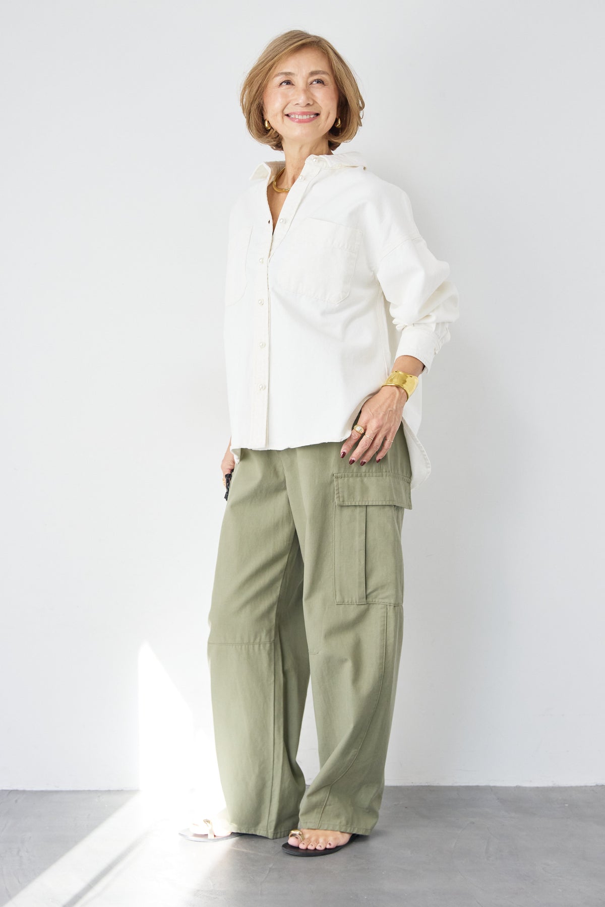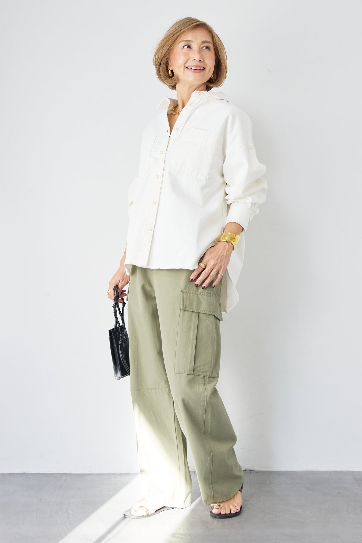 パールボタンデニムシャツ/テンセルカーゴパンツ
