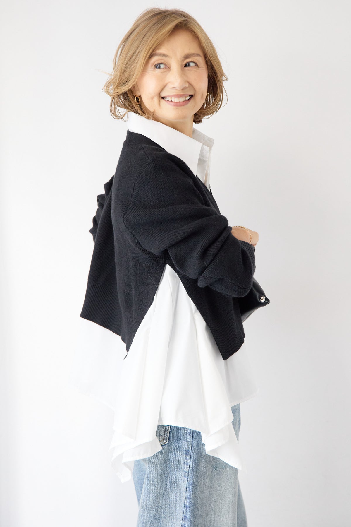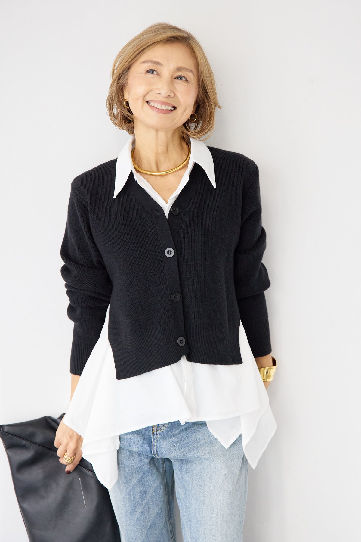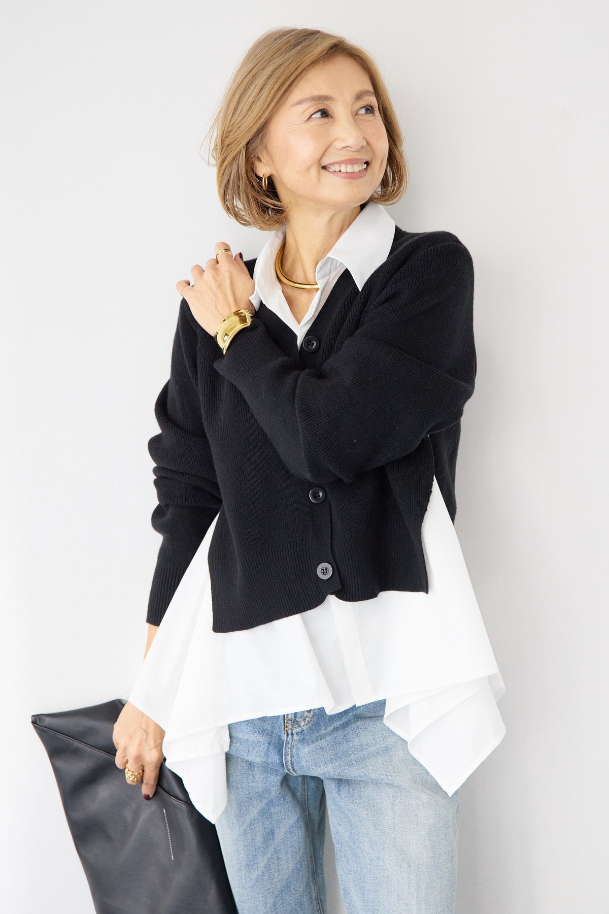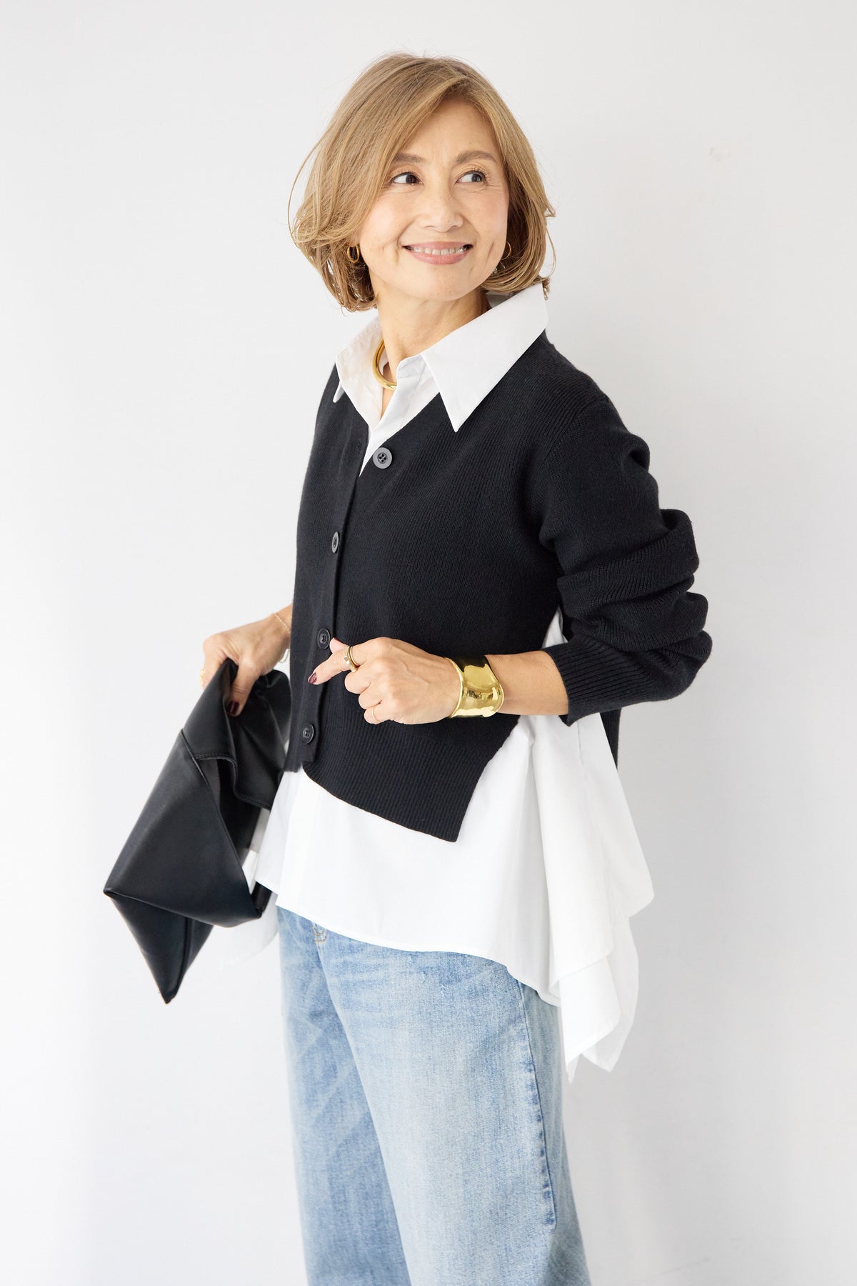 シンプルでありながら洗練されたデザインが魅力的なニットドッキングシャツ。フロントボタンが特徴のVネックニットカーディガンと、裾がドレープ状に広がるシャツのドッキングデザインがユニークなアイテムです。ボトムスに合わせやすいシンプルなカットで、トレンド感のあるレイヤードスタイルが楽しめます。リブ編みのニットは程よいフィット感を持ち、着心地がよく、日常使いにも最適です。シャツの裾が広がるデザインが、動きに合わせて華やかな印象を与え、どんなコーディネートにも華を添えます。
