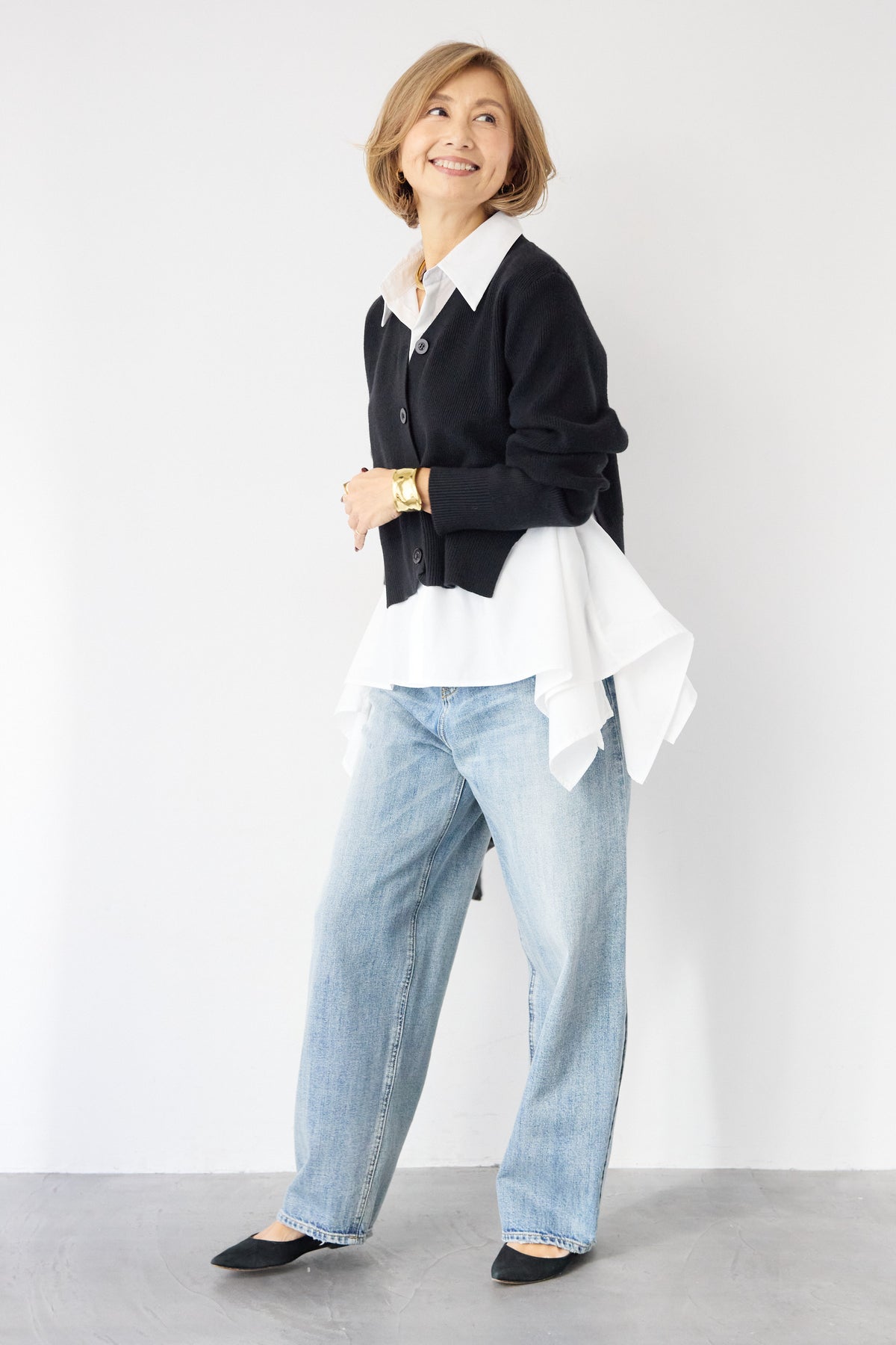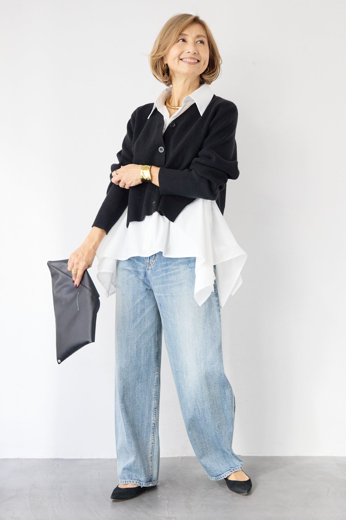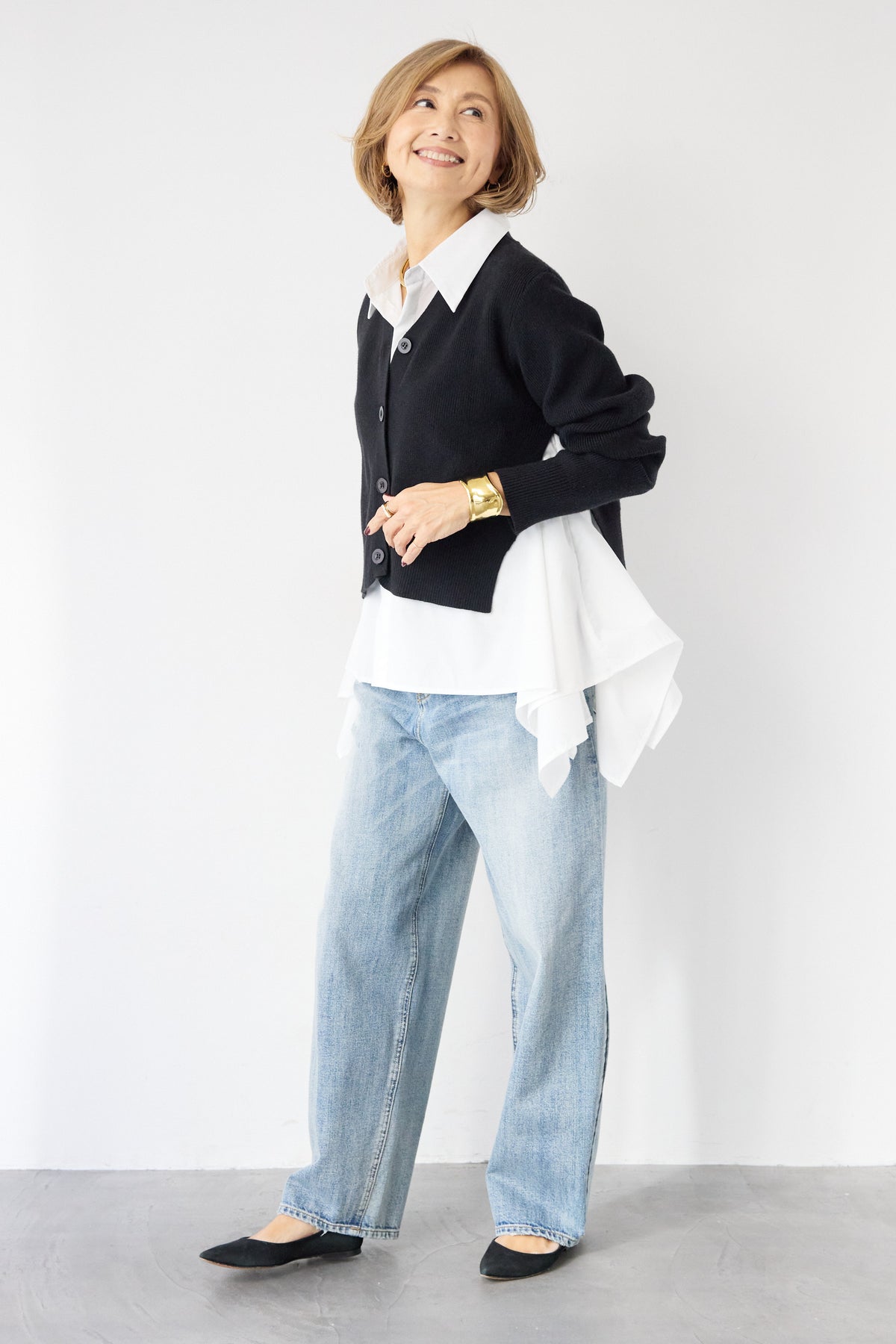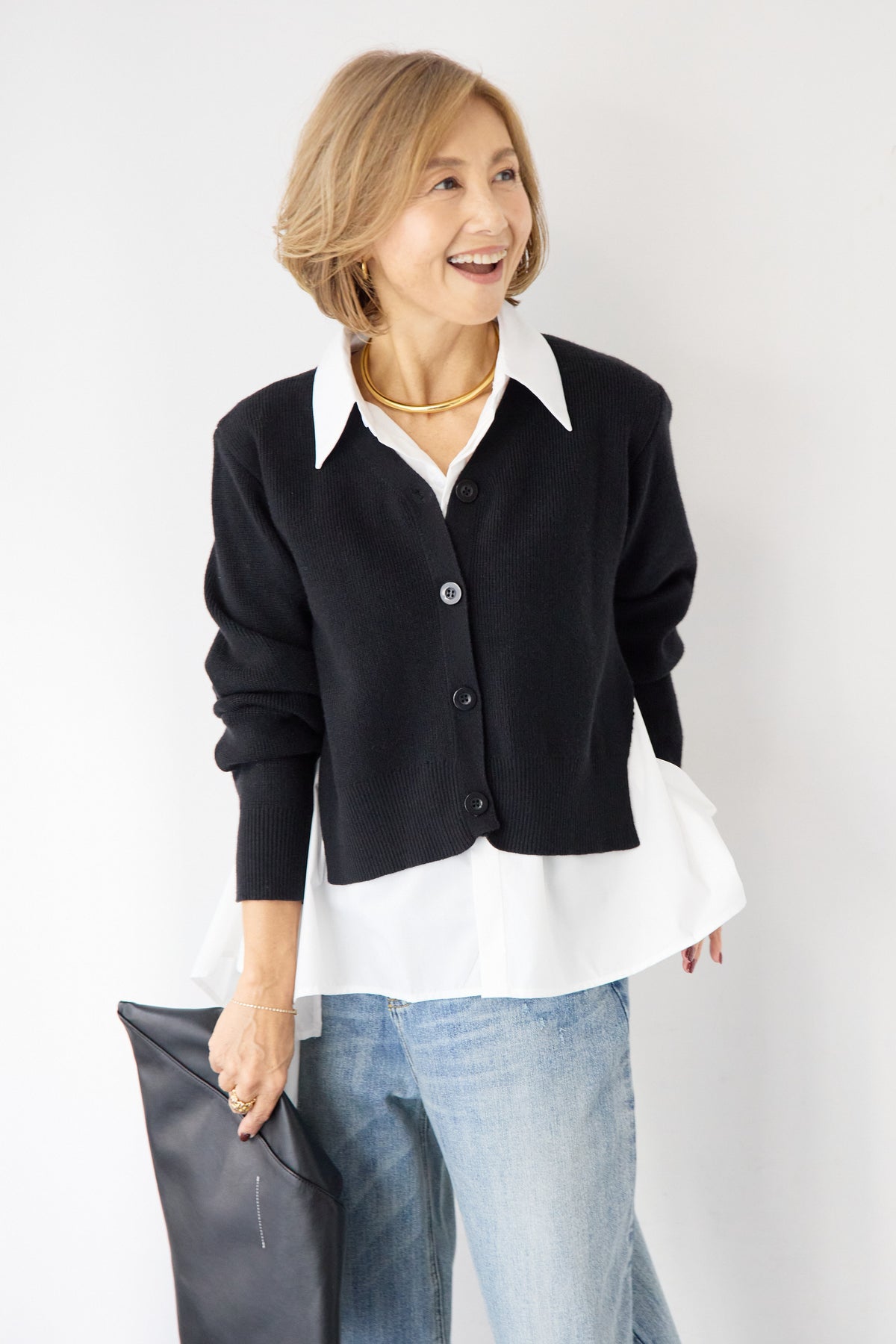 シンプルでありながら洗練されたデザインが魅力的なニットドッキングシャツ。フロントボタンが特徴のVネックニットカーディガンと、裾がドレープ状に広がるシャツのドッキングデザインがユニークなアイテムです。ボトムスに合わせやすいシンプルなカットで、トレンド感のあるレイヤードスタイルが楽しめます。リブ編みのニットは程よいフィット感を持ち、着心地がよく、日常使いにも最適です。シャツの裾が広がるデザインが、動きに合わせて華やかな印象を与え、どんなコーディネートにも華を添えます。