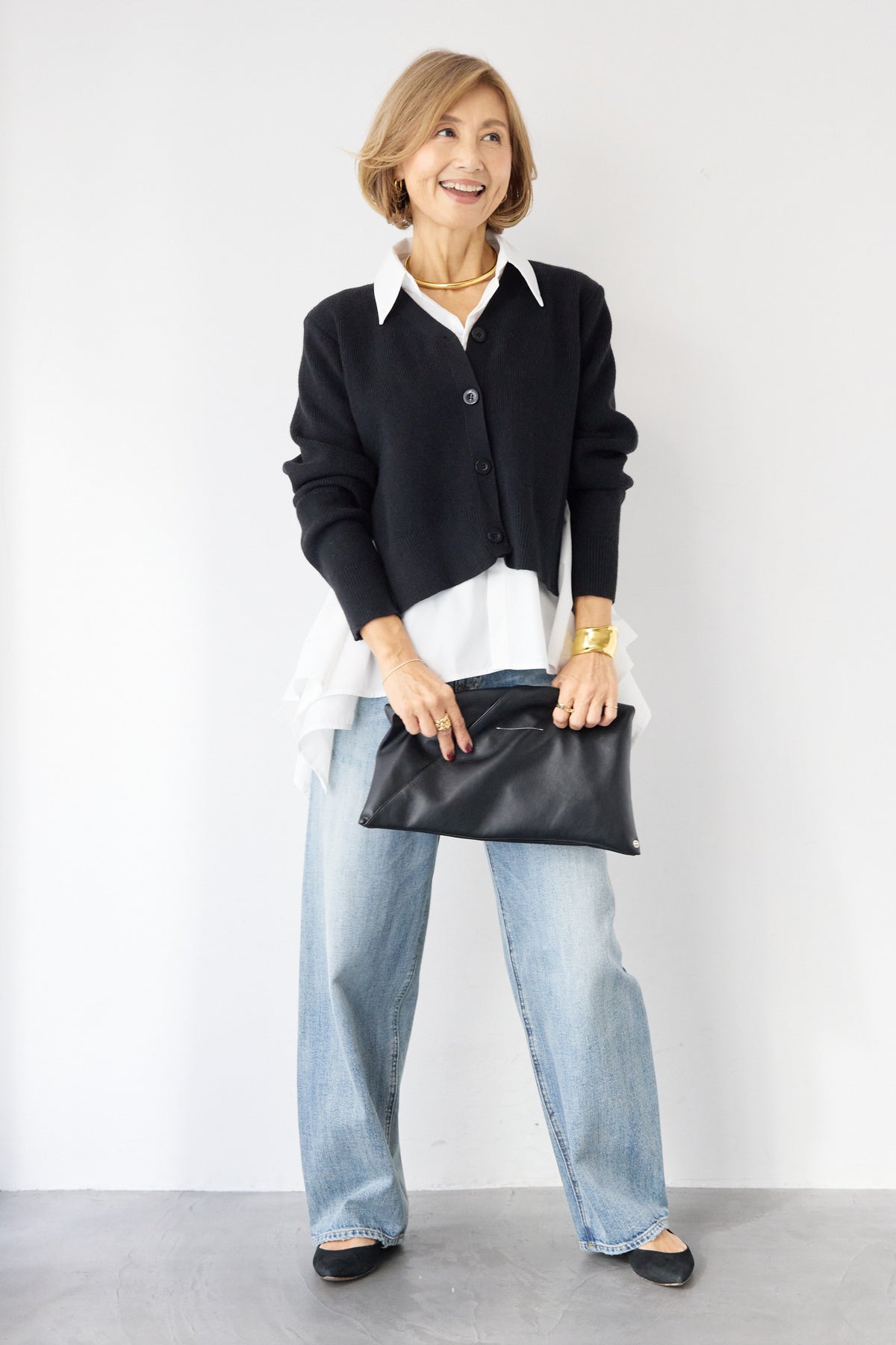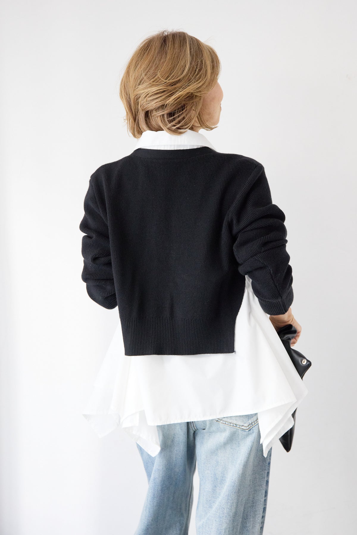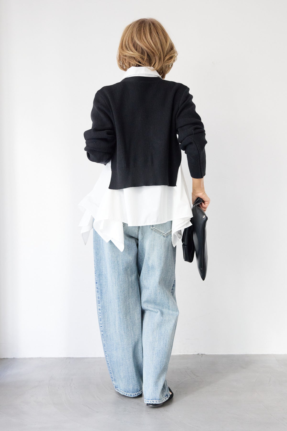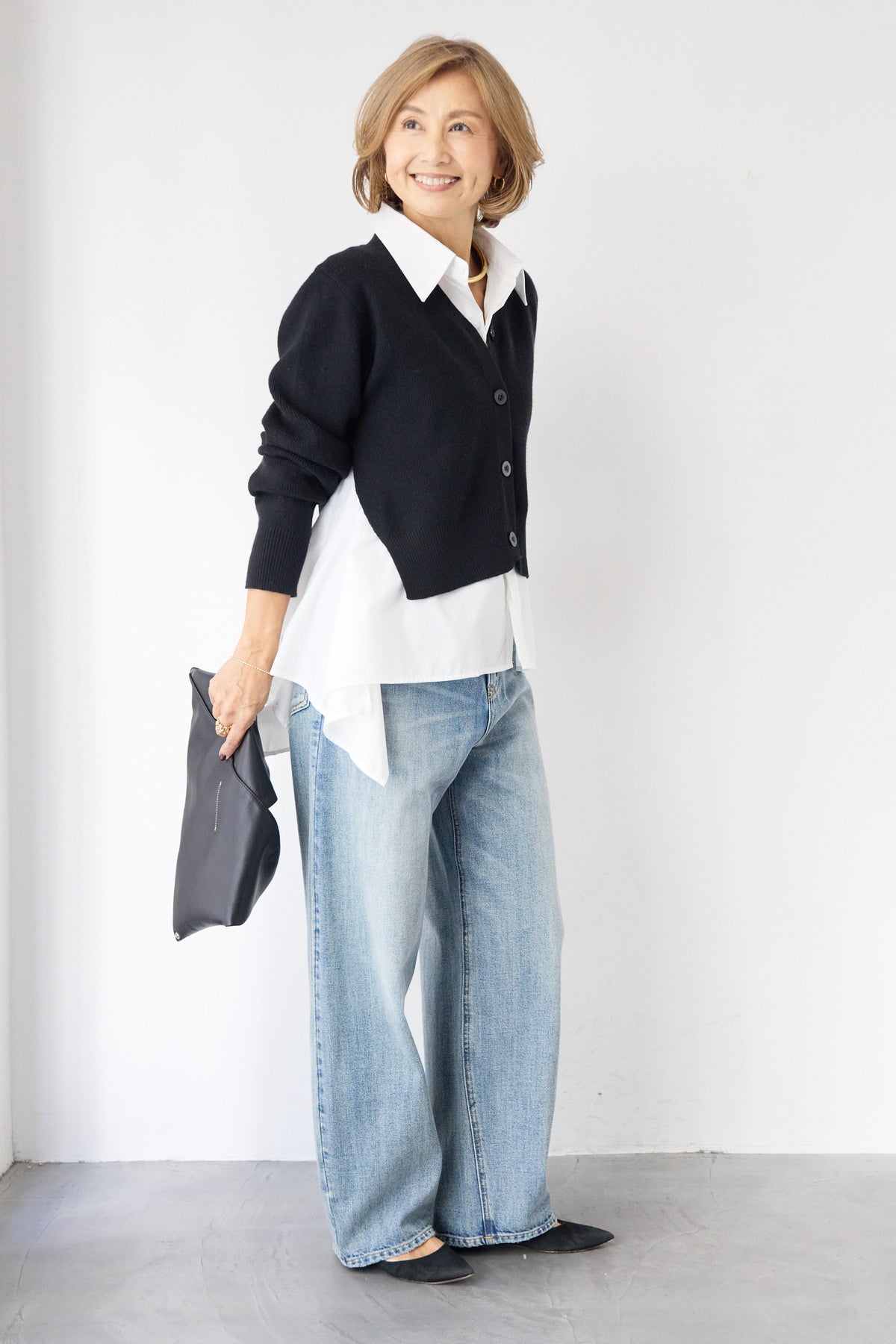 シンプルでありながら洗練されたデザインが魅力的なニットドッキングシャツ。フロントボタンが特徴のVネックニットカーディガンと、裾がドレープ状に広がるシャツのドッキングデザインがユニークなアイテムです。ボトムスに合わせやすいシンプルなカットで、トレンド感のあるレイヤードスタイルが楽しめます。リブ編みのニットは程よいフィット感を持ち、着心地がよく、日常使いにも最適です。シャツの裾が広がるデザインが、動きに合わせて華やかな印象を与え、どんなコーディネートにも華を添えます。