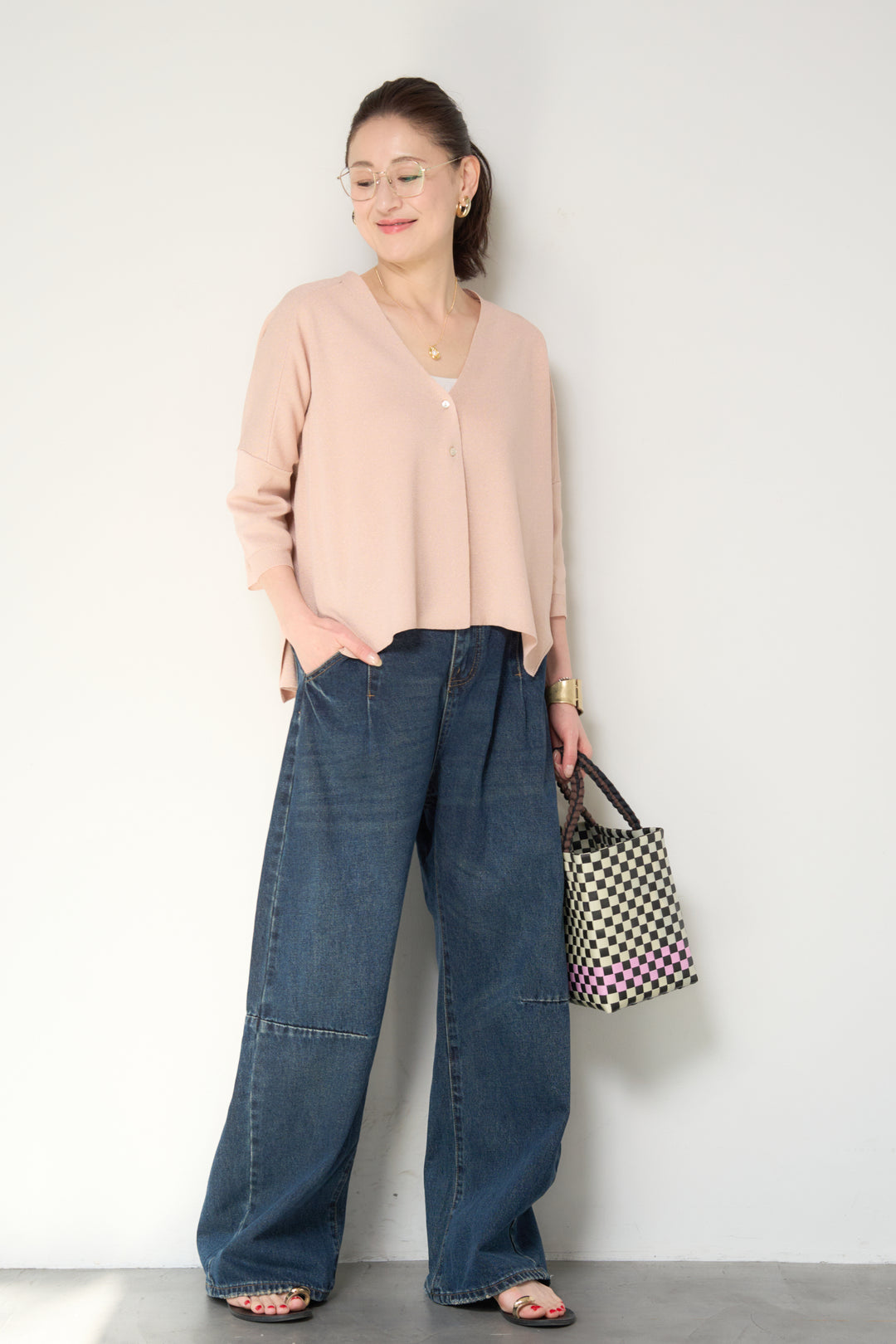 [SET]ウォッシャブルサラッとラメカーディガン+カーブデニムパンツ(2set)