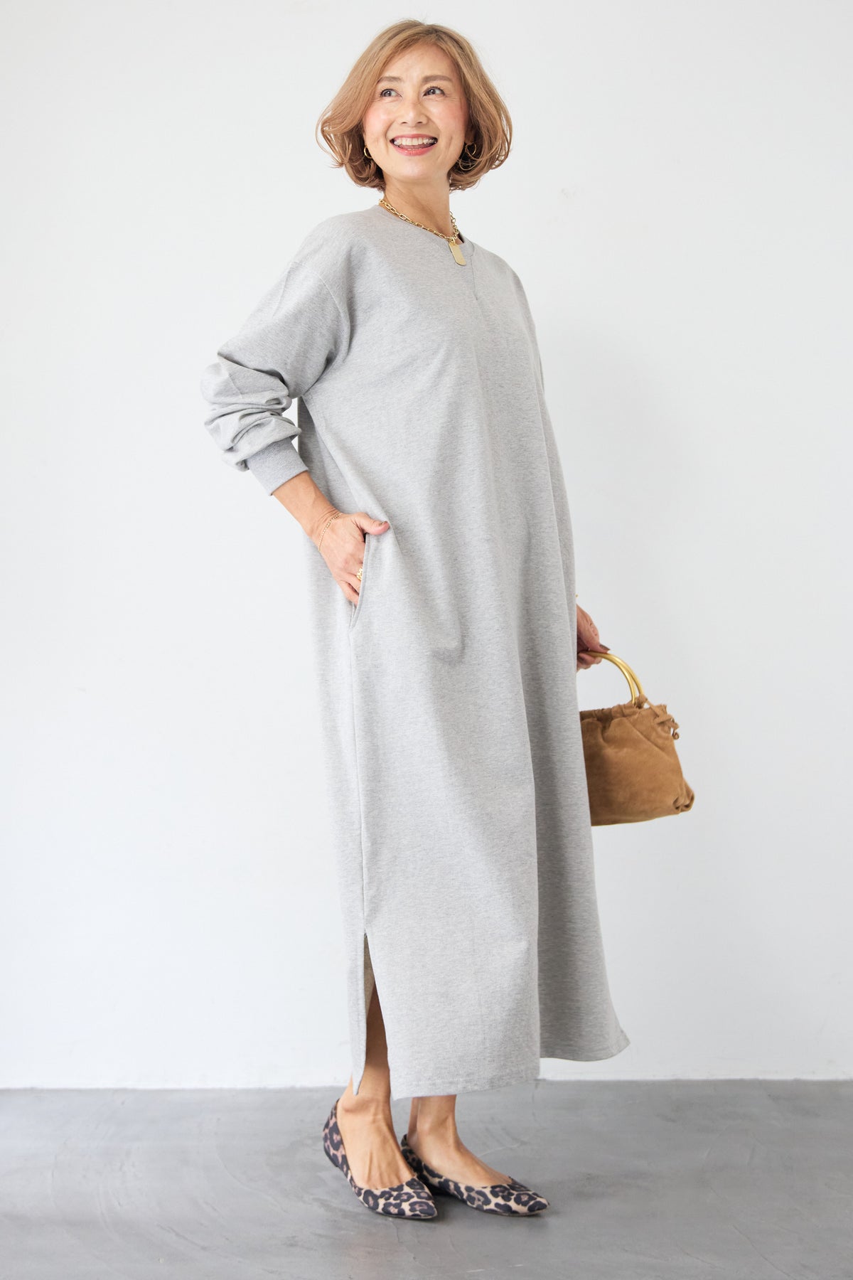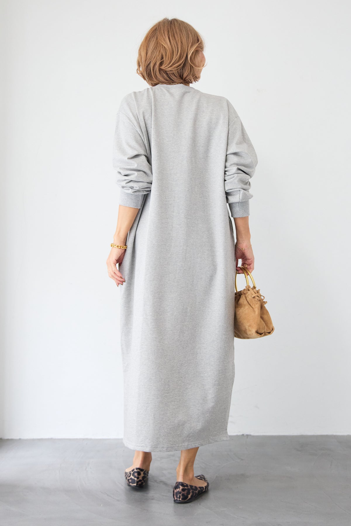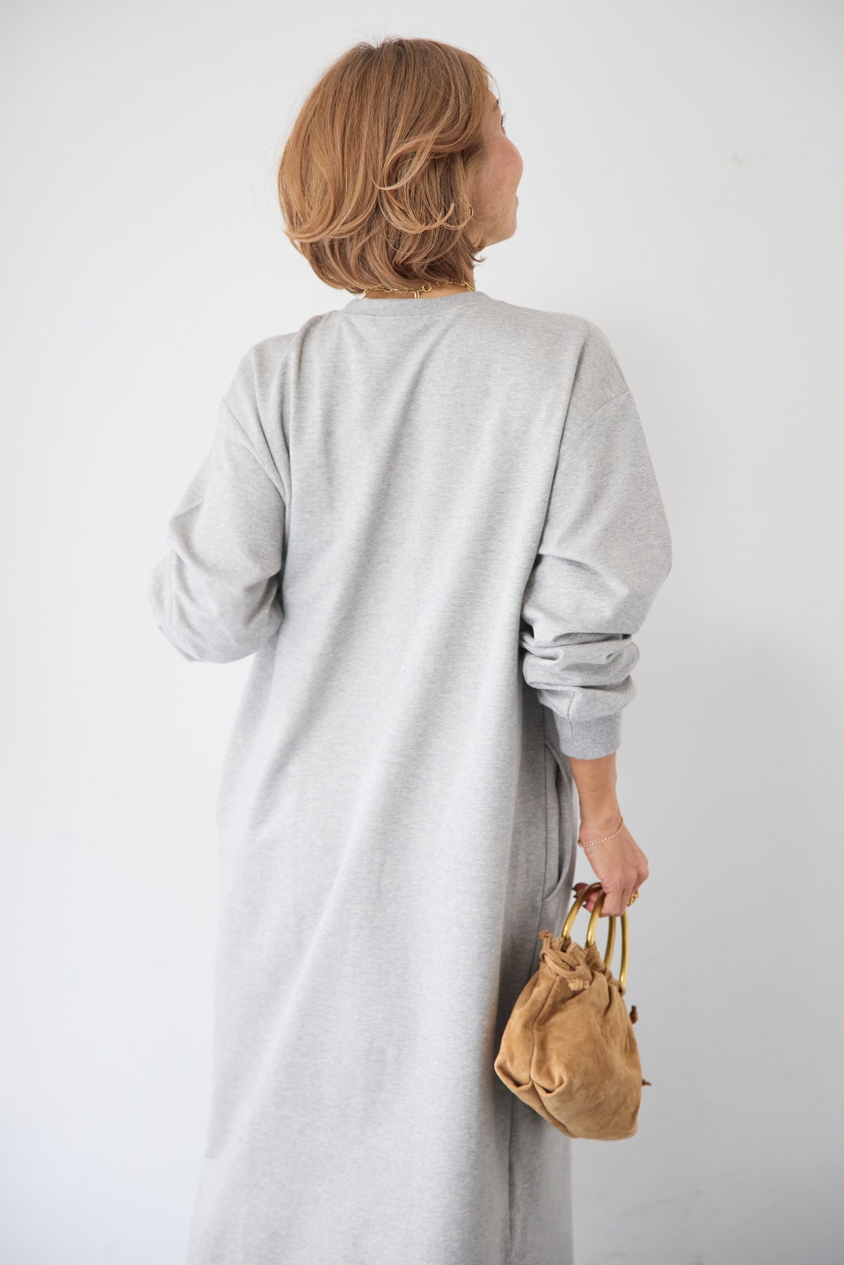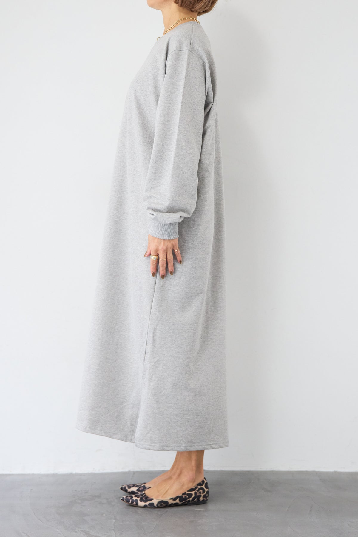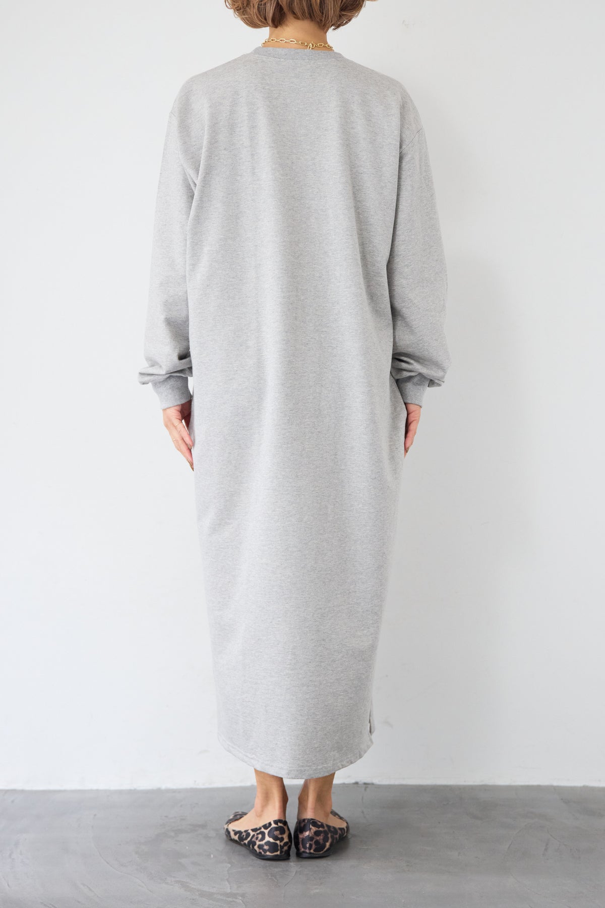 柔らかな肌触りのスウェット生地を使用した、1枚でスタイリングが完成するロングワンピースです。 カジュアルな素材感ながら、計算されたシルエットとディテールで、部屋着見えしない洗練された印象に仕上げました。