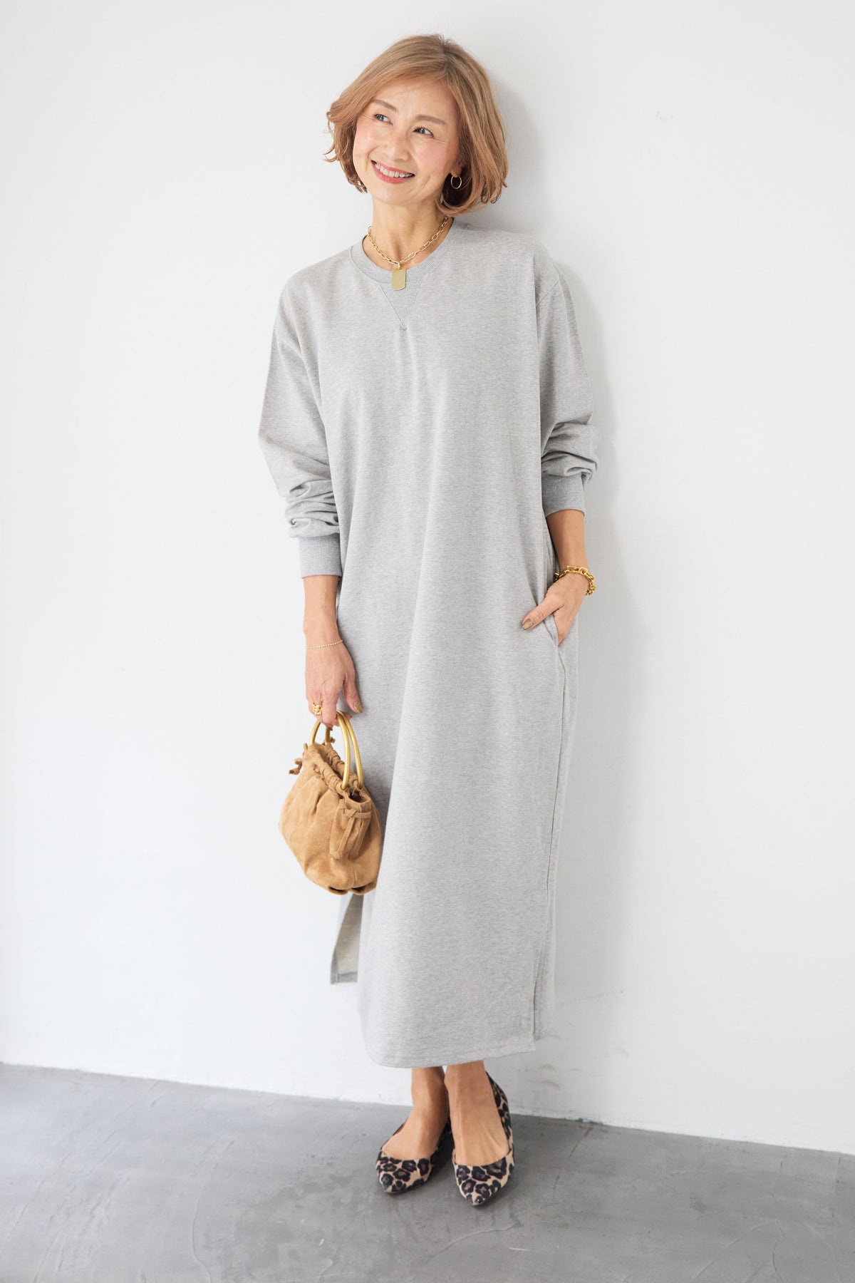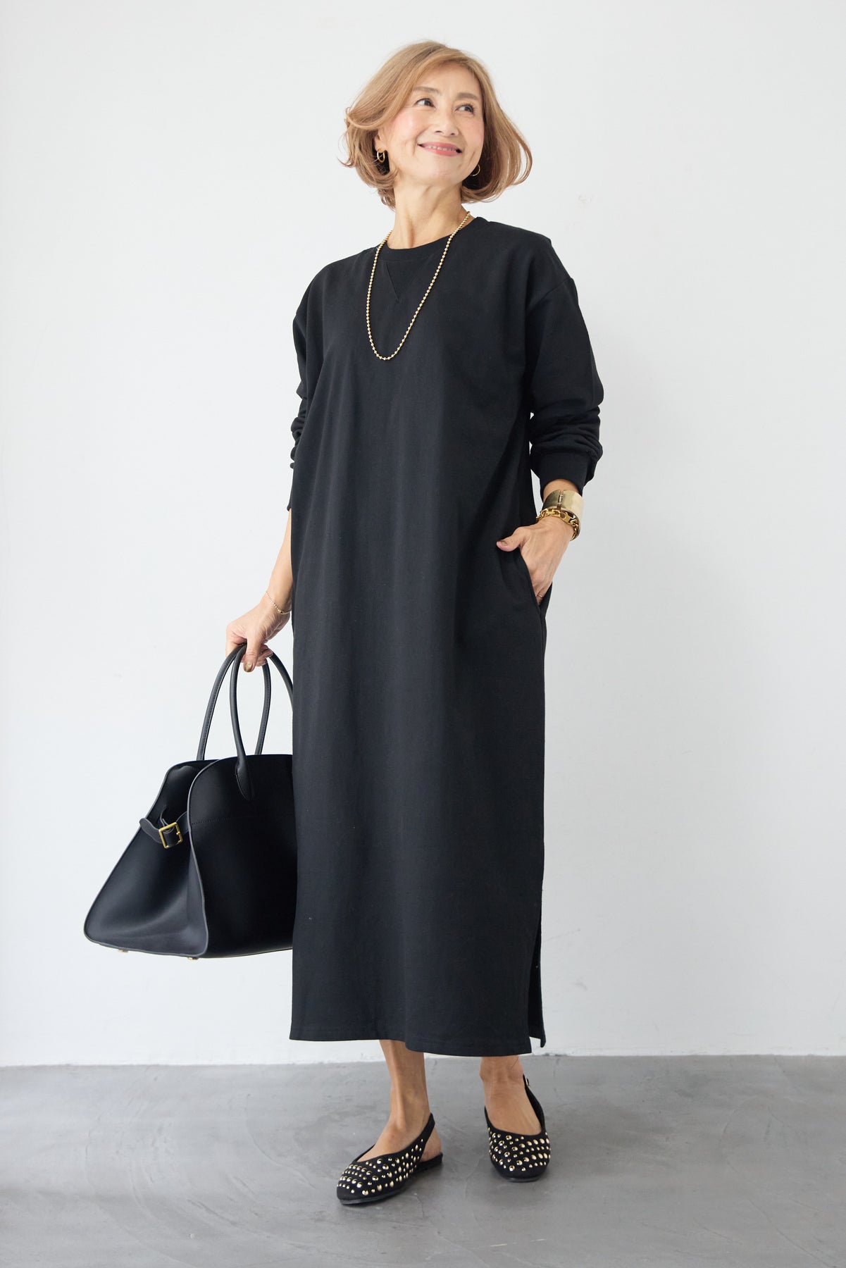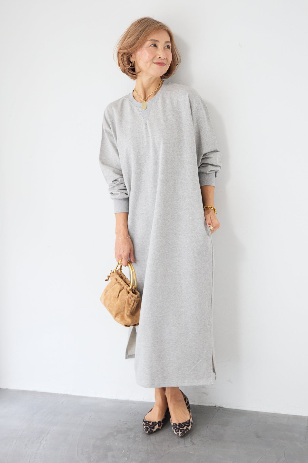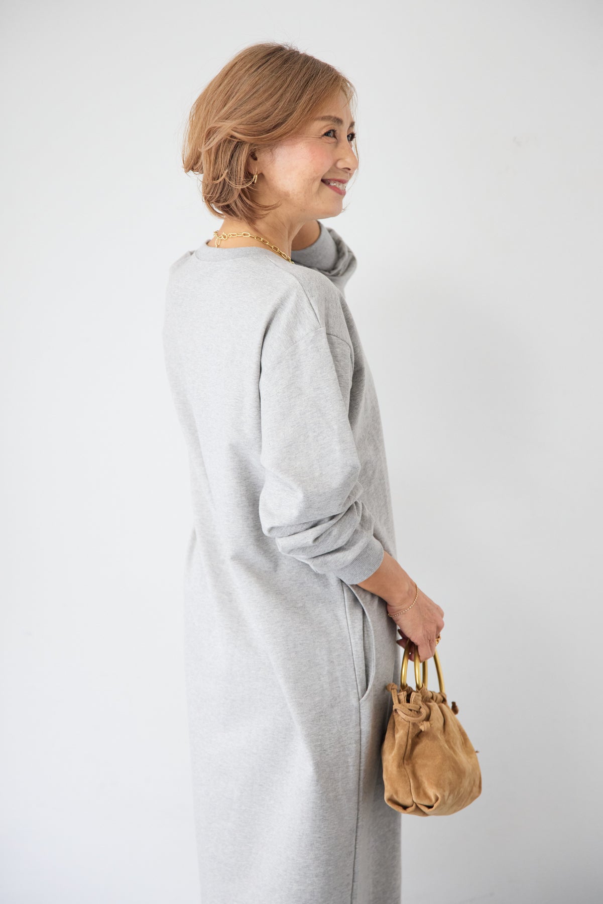 柔らかな肌触りのスウェット生地を使用した、1枚でスタイリングが完成するロングワンピースです。 カジュアルな素材感ながら、計算されたシルエットとディテールで、部屋着見えしない洗練された印象に仕上げました。