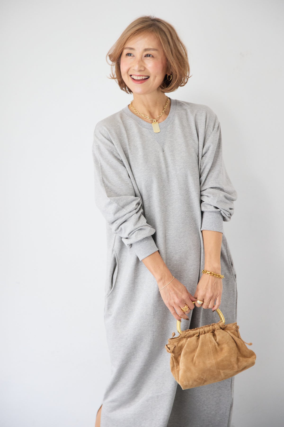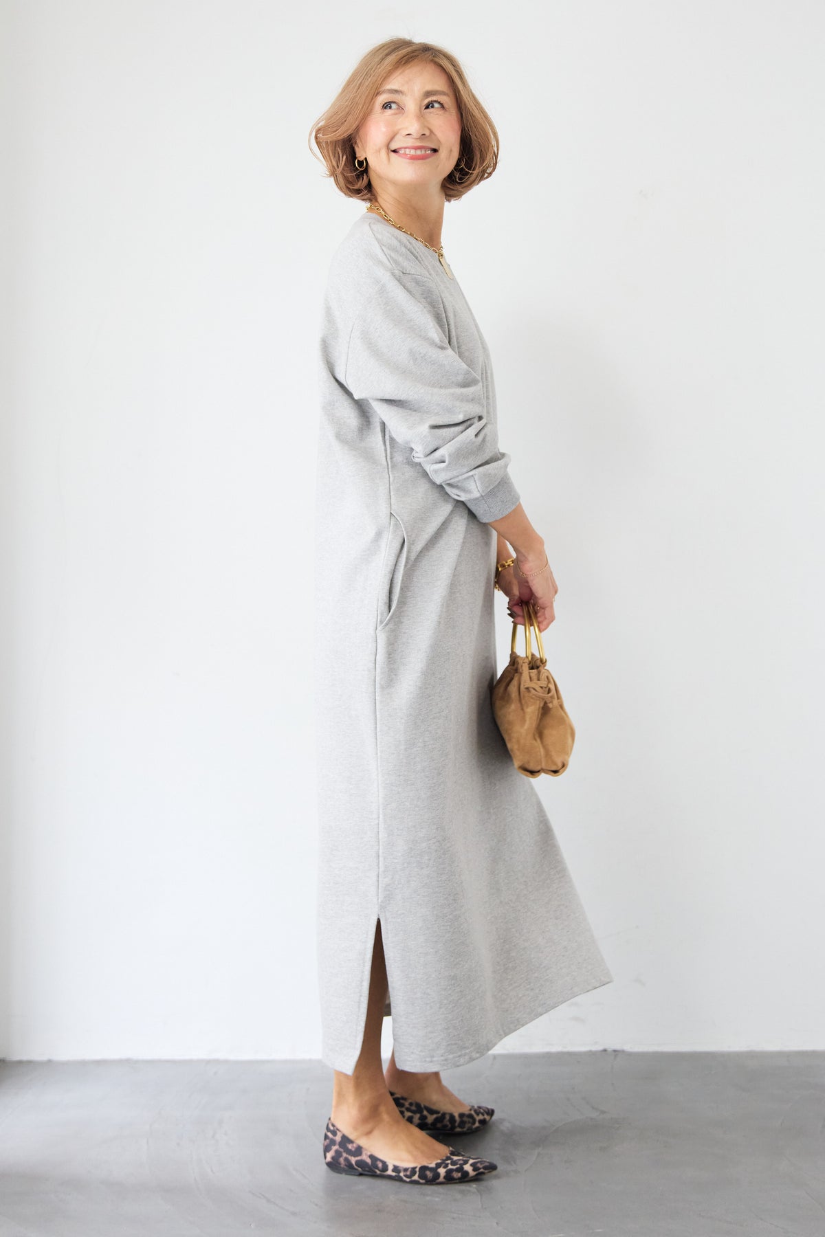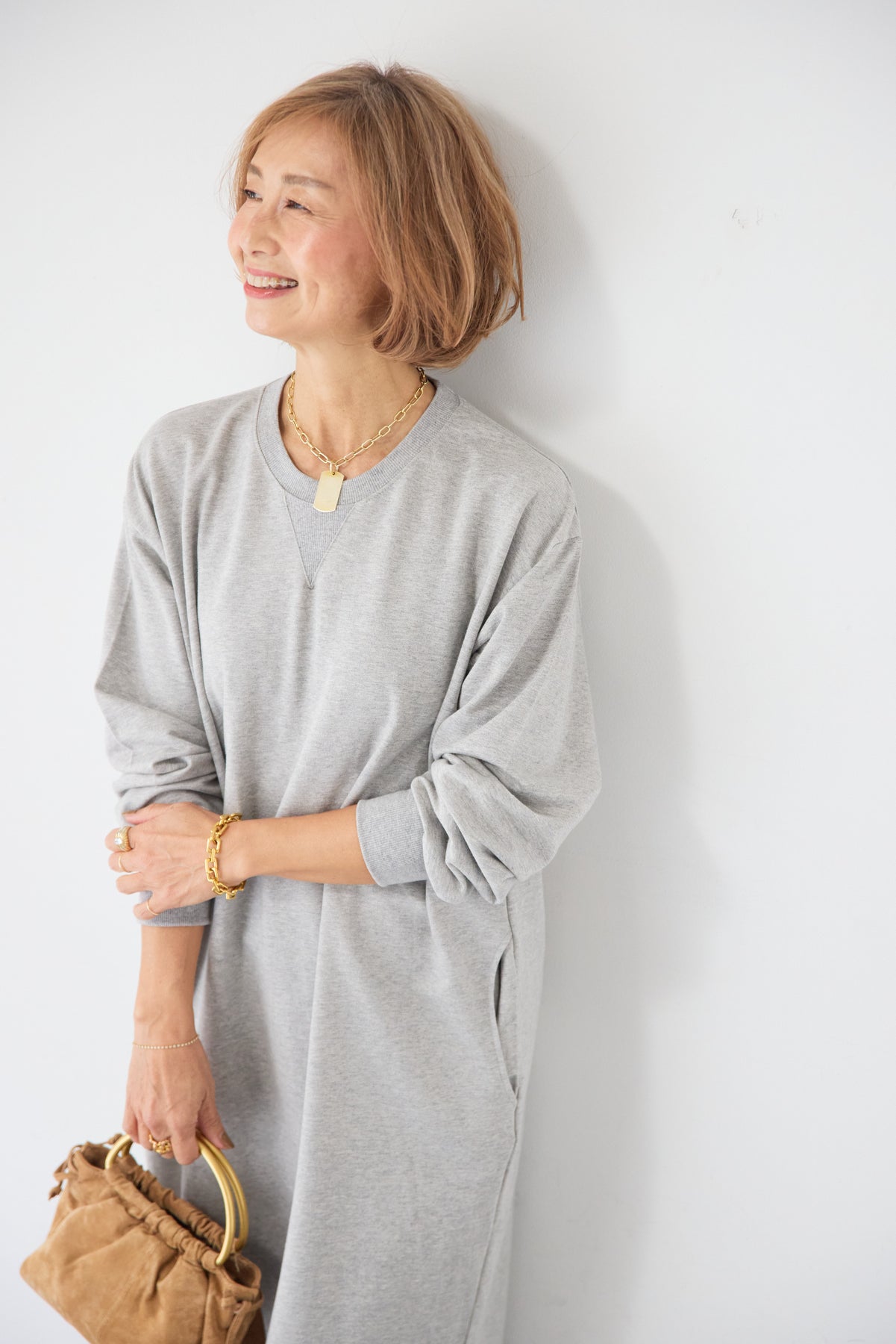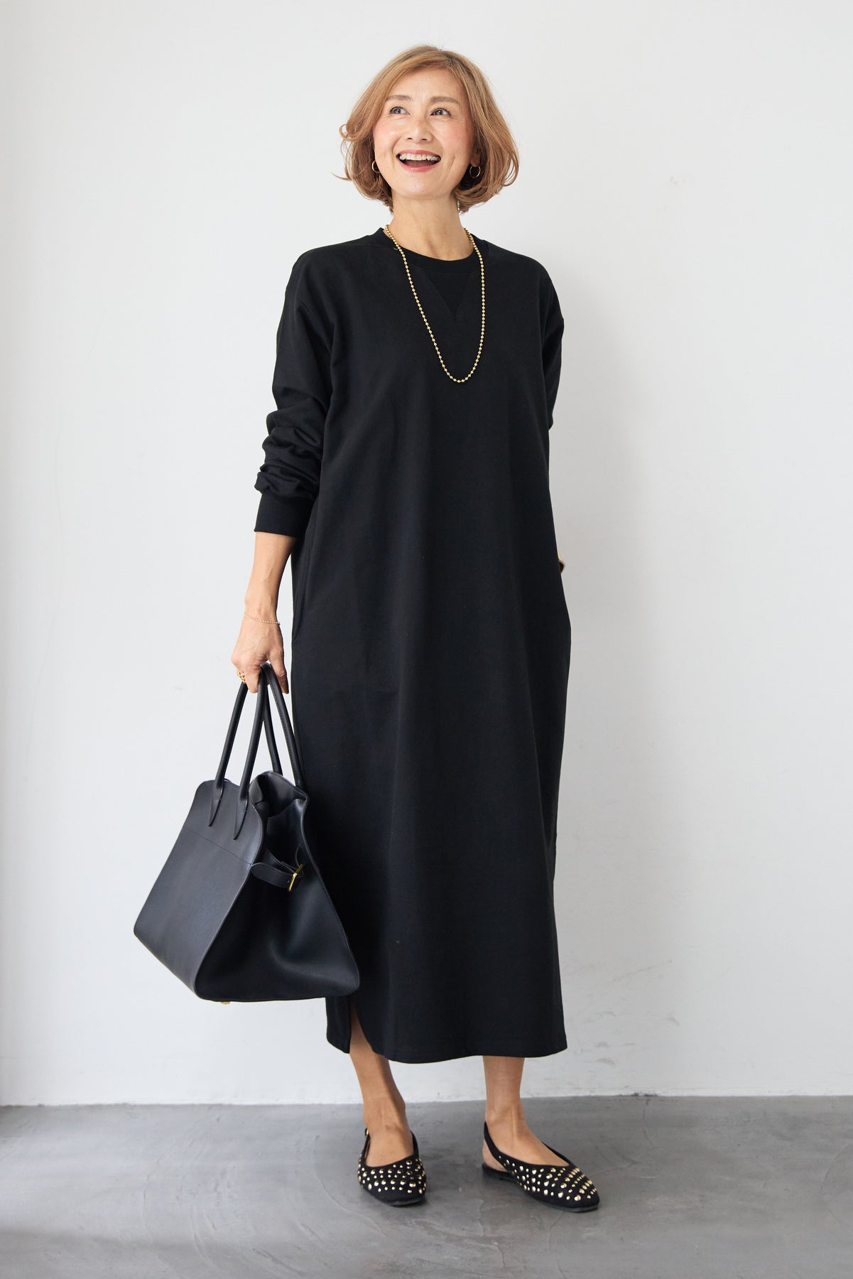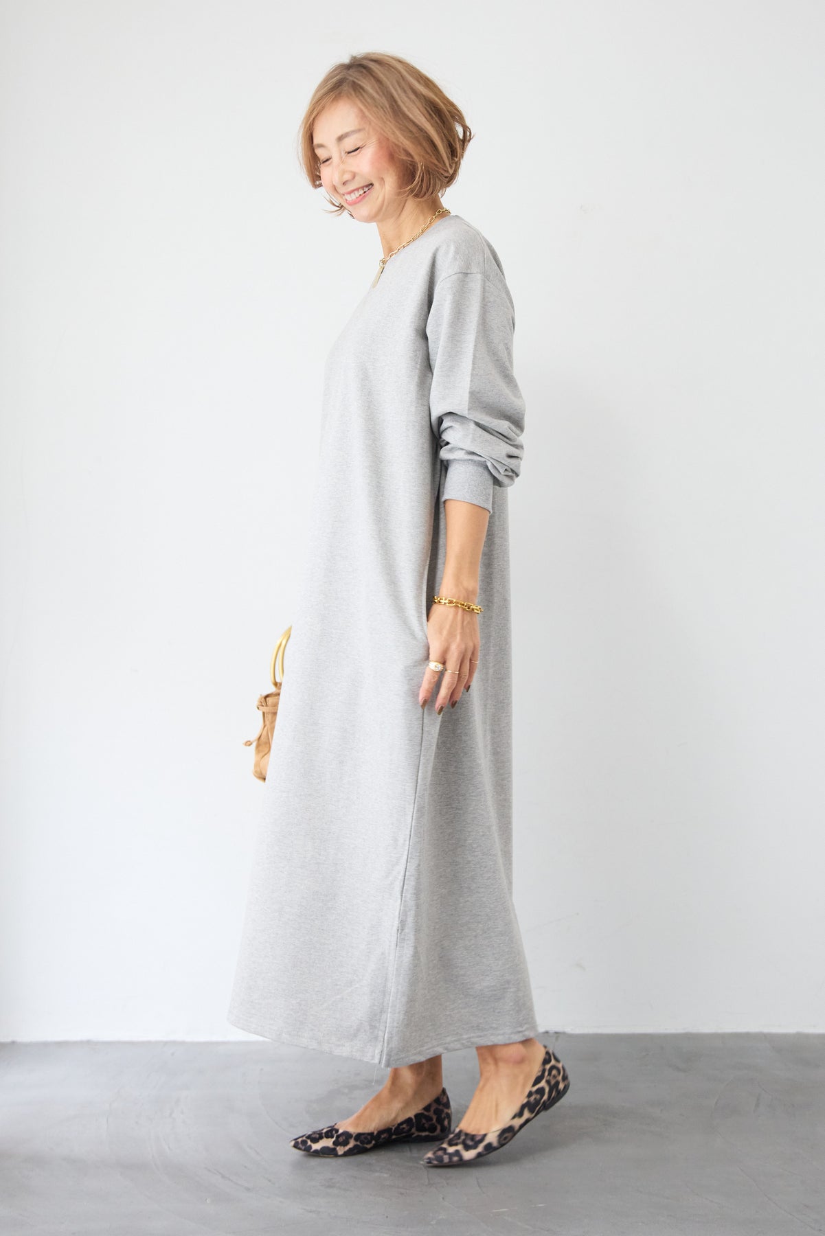 柔らかな肌触りのスウェット生地を使用した、1枚でスタイリングが完成するロングワンピースです。 カジュアルな素材感ながら、計算されたシルエットとディテールで、部屋着見えしない洗練された印象に仕上げました。
