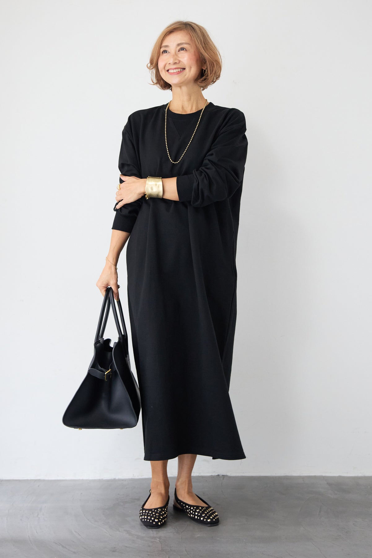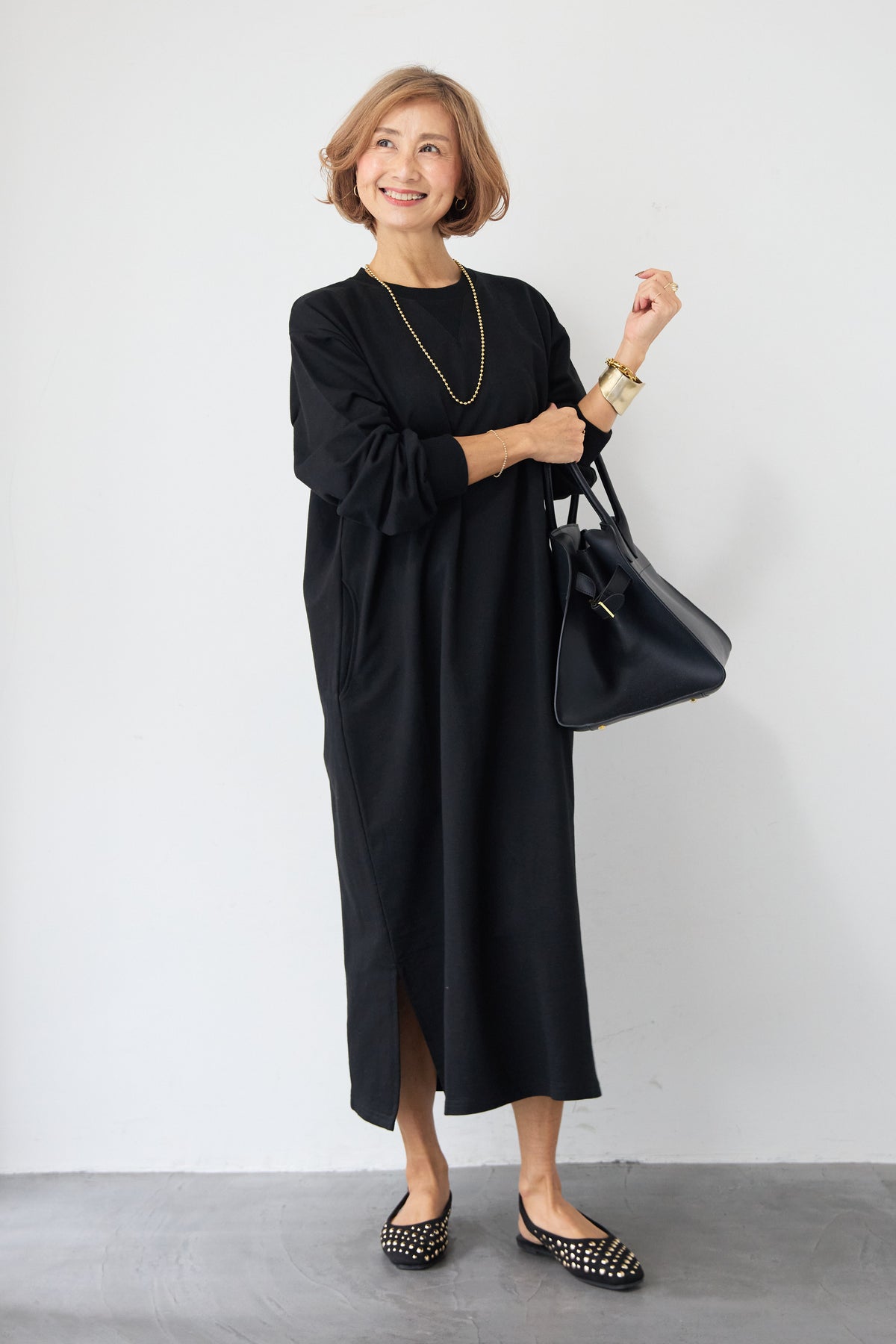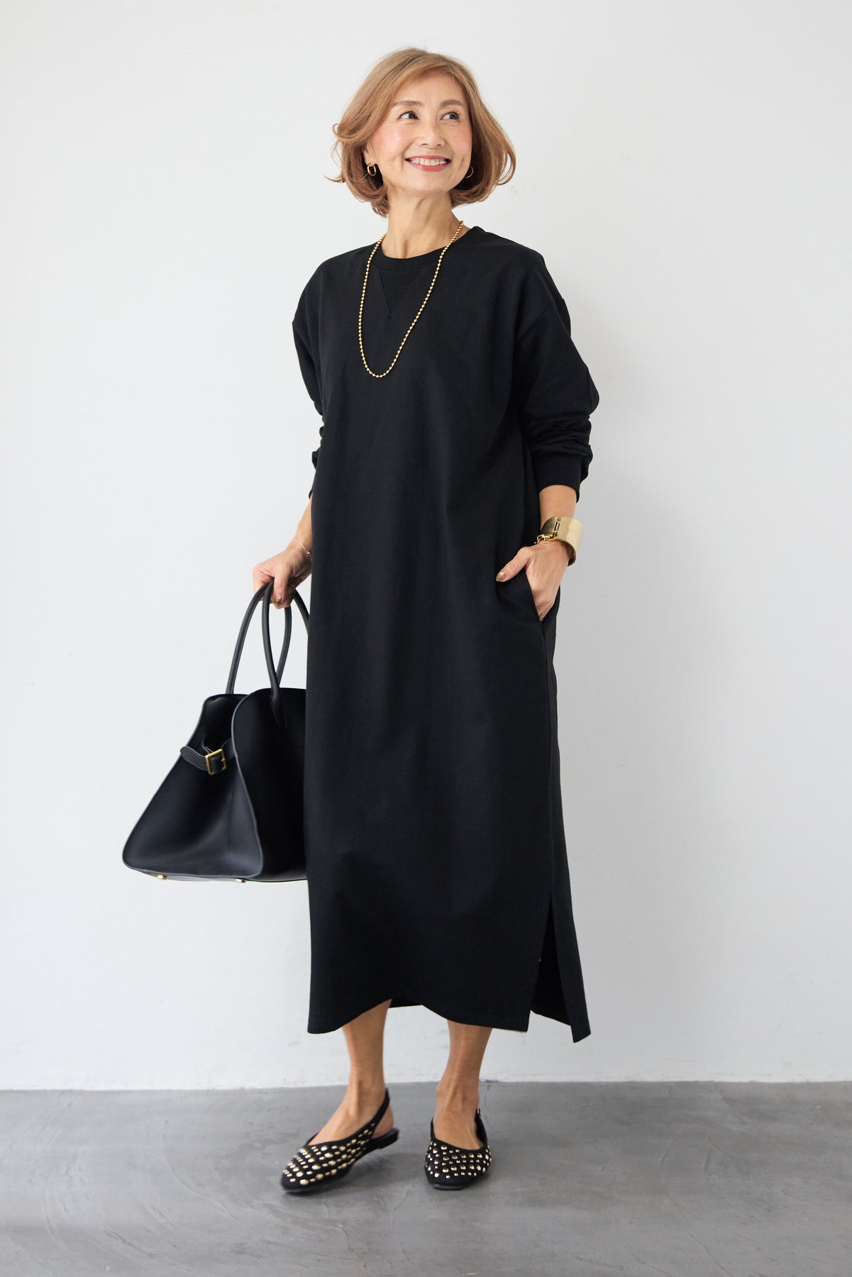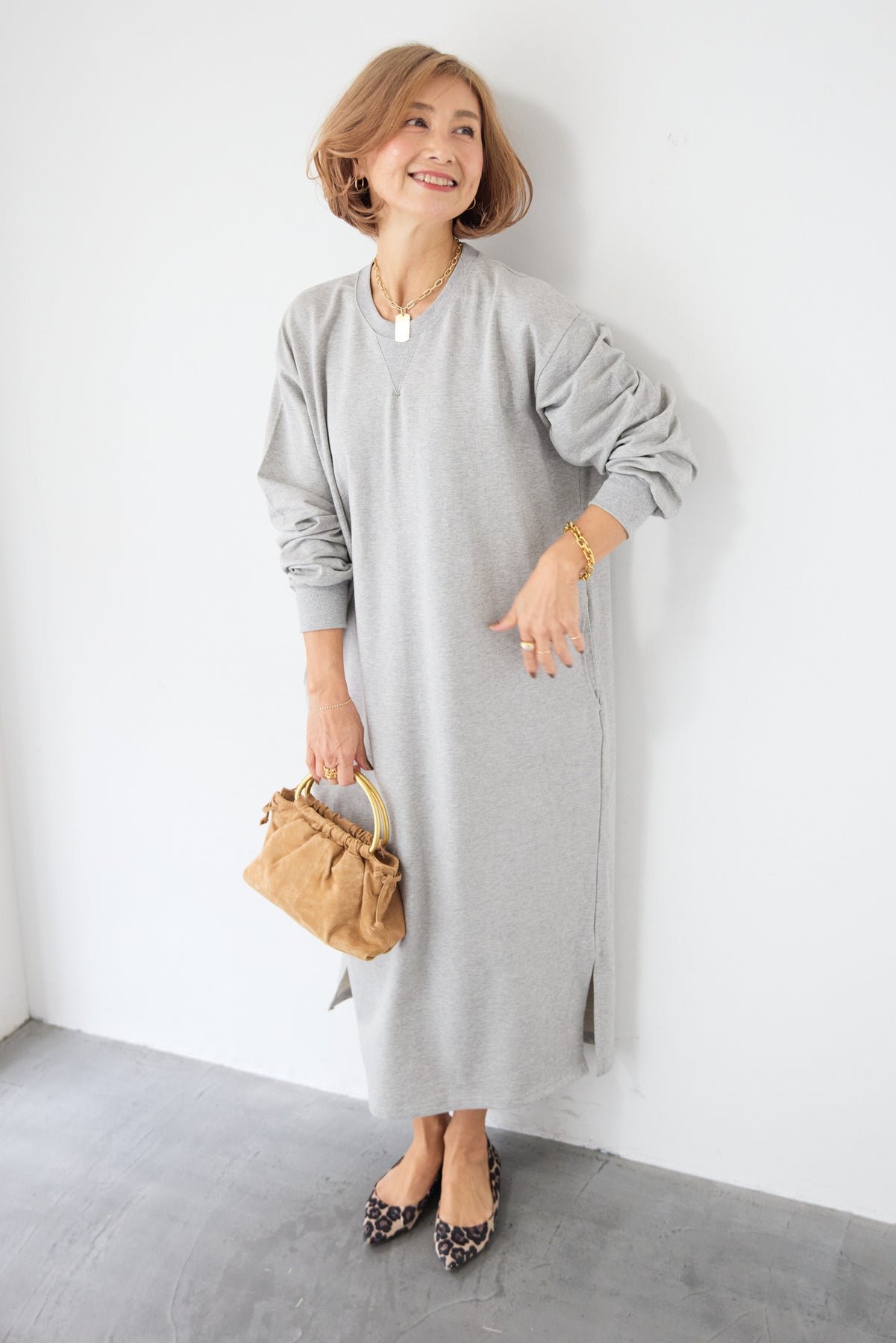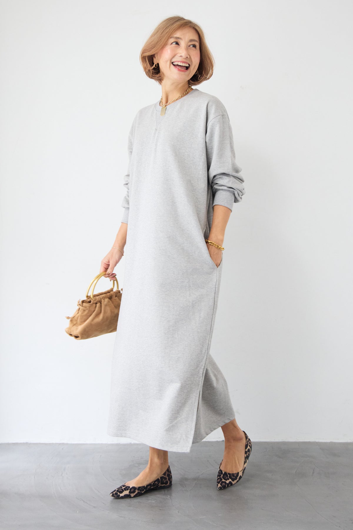 柔らかな肌触りのスウェット生地を使用した、1枚でスタイリングが完成するロングワンピースです。 カジュアルな素材感ながら、計算されたシルエットとディテールで、部屋着見えしない洗練された印象に仕上げました。