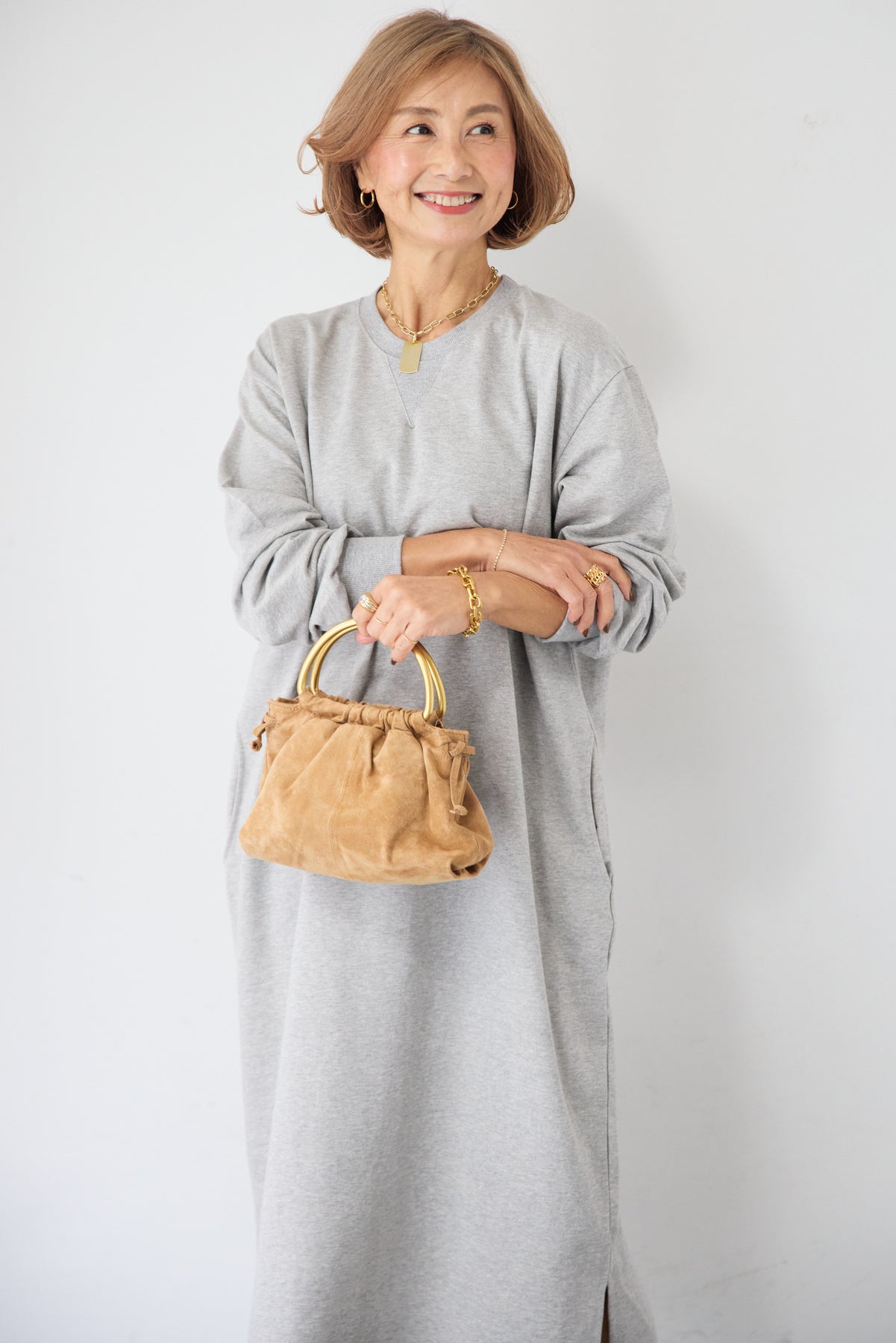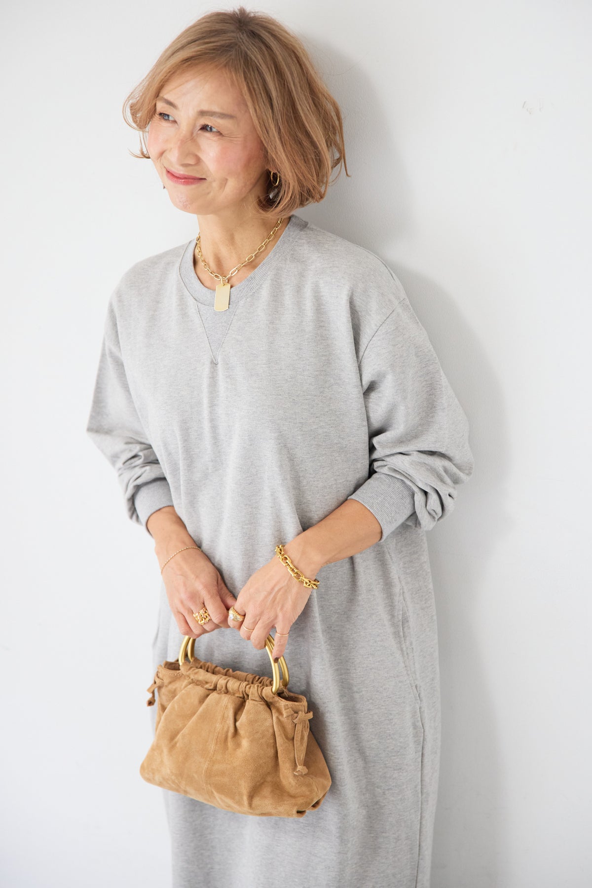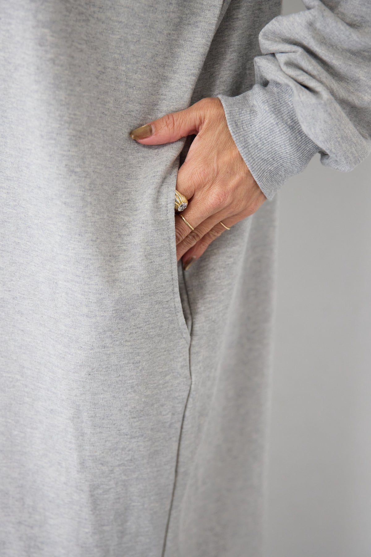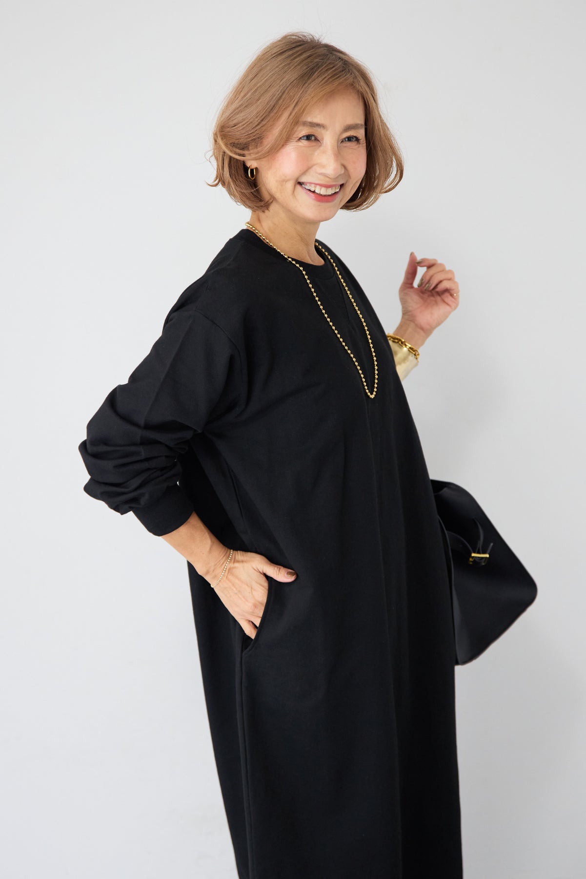 柔らかな肌触りのスウェット生地を使用した、1枚でスタイリングが完成するロングワンピースです。 カジュアルな素材感ながら、計算されたシルエットとディテールで、部屋着見えしない洗練された印象に仕上げました。