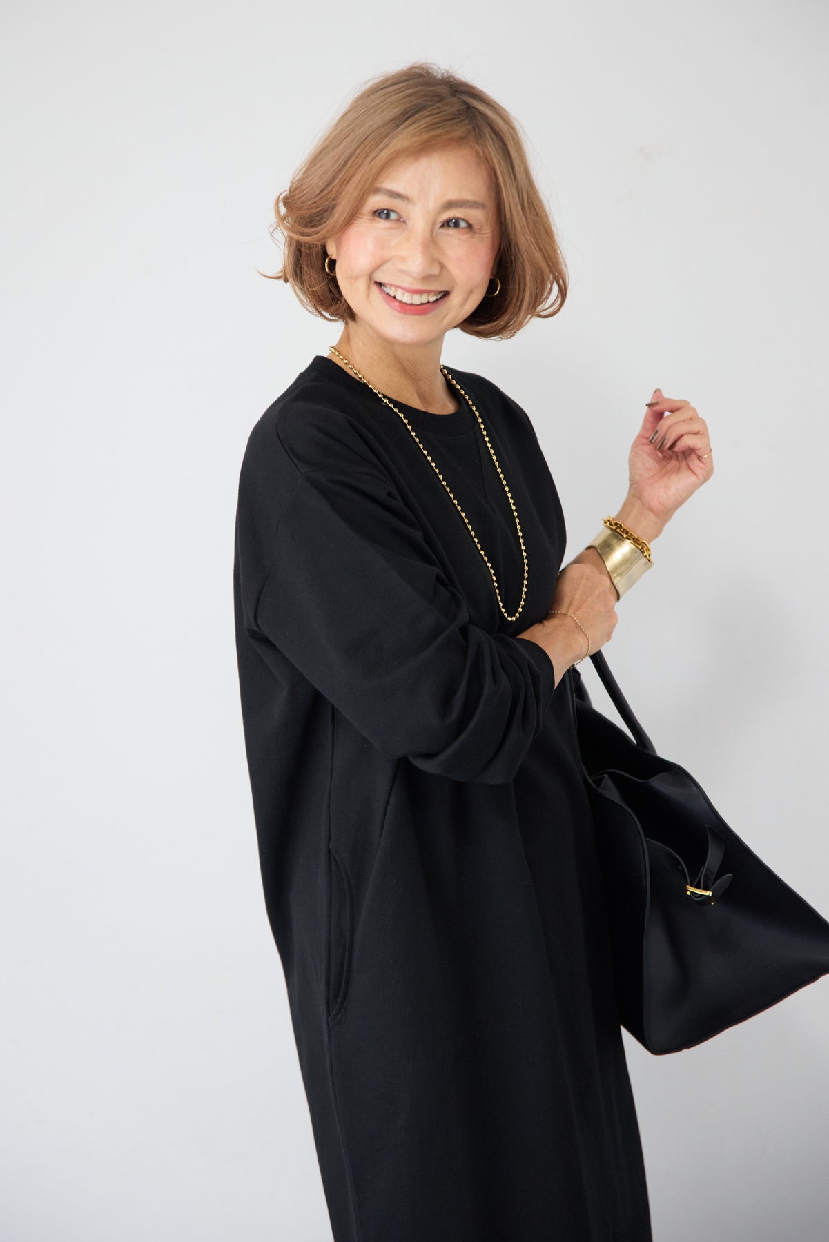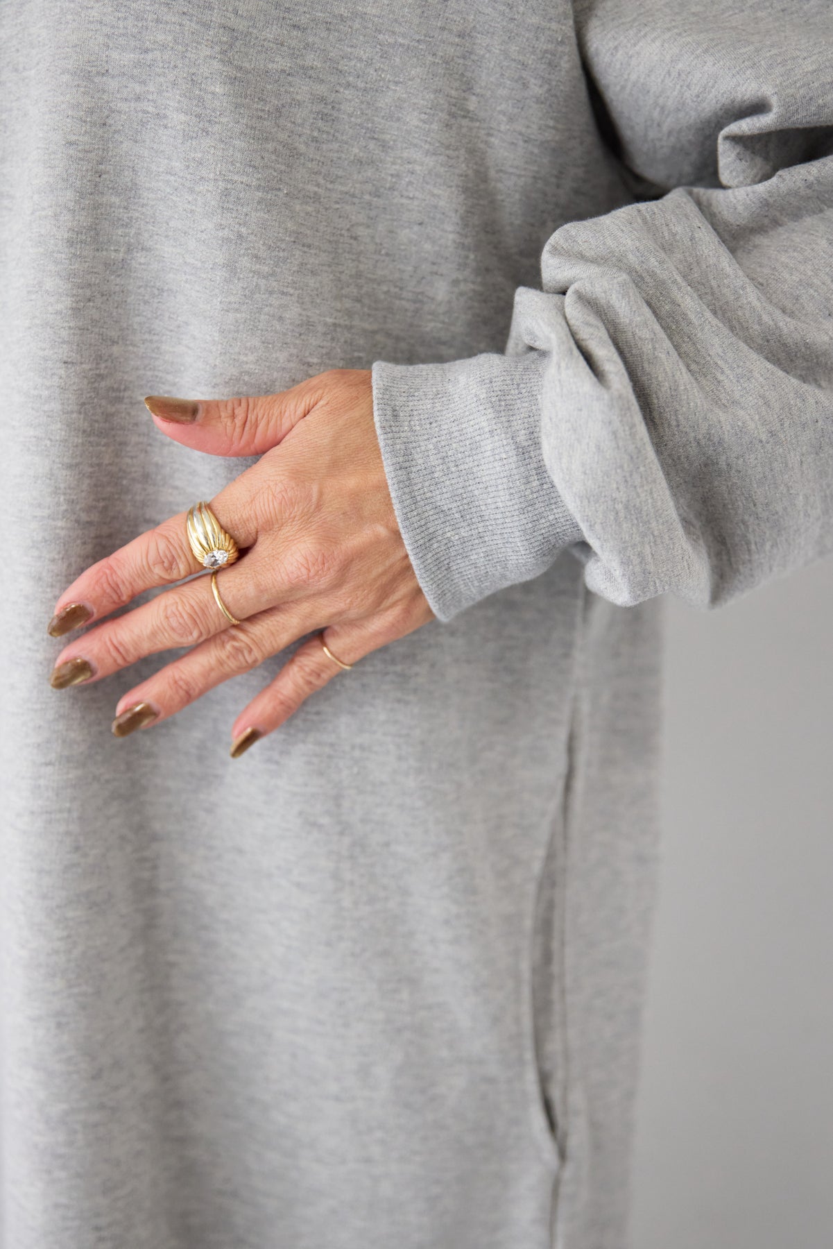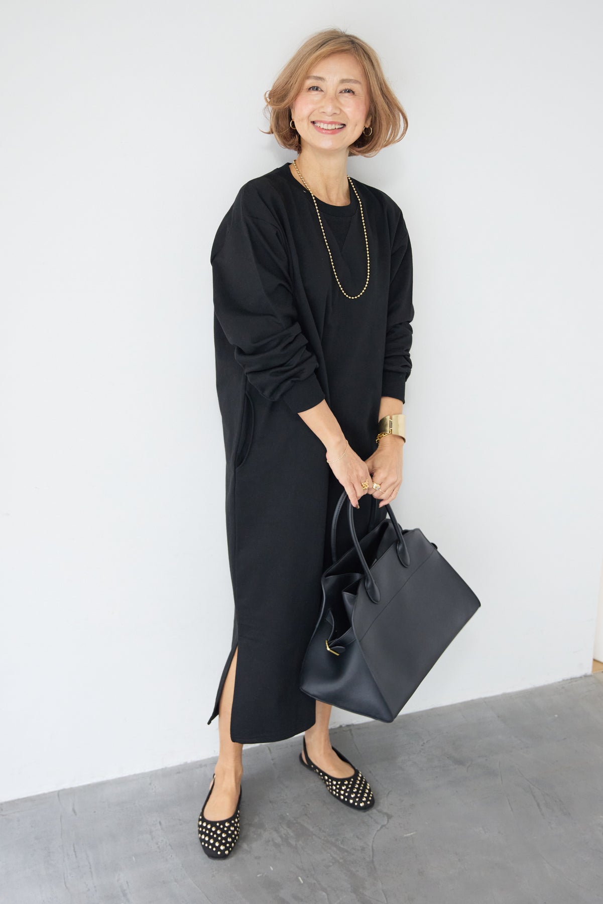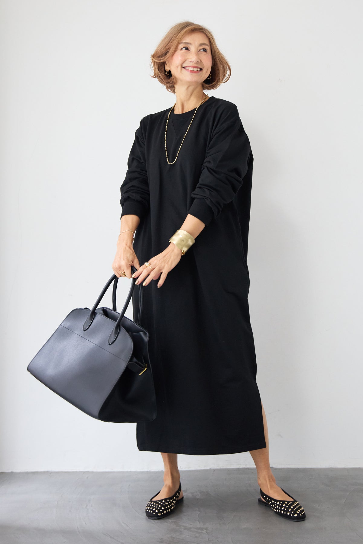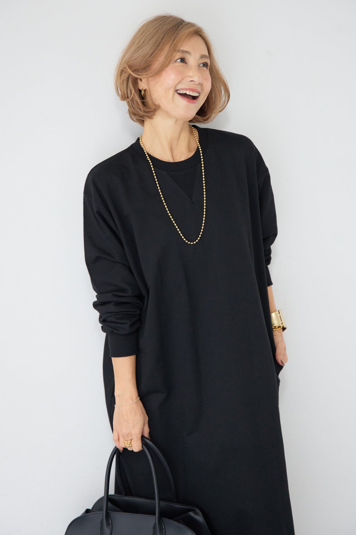 柔らかな肌触りのスウェット生地を使用した、1枚でスタイリングが完成するロングワンピースです。 カジュアルな素材感ながら、計算されたシルエットとディテールで、部屋着見えしない洗練された印象に仕上げました。