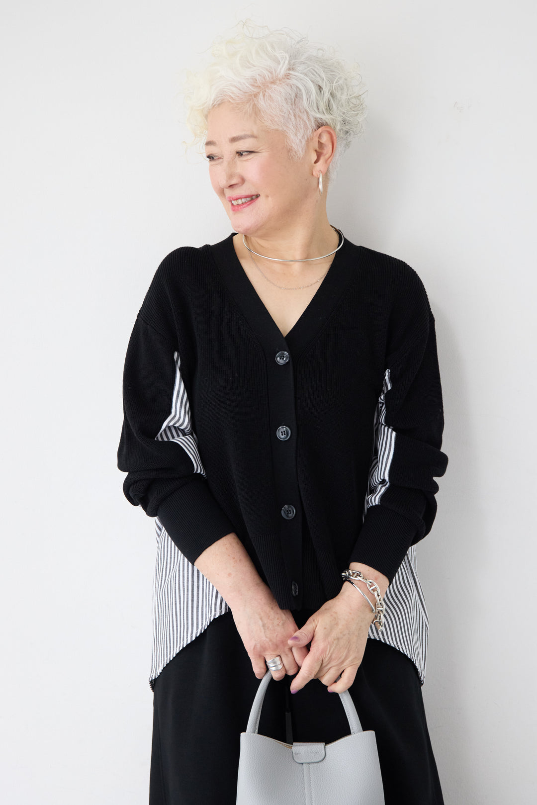 [SET]ストライプシャツコンビカーディガン+スウェットカーブスラックスパンツ(2set)
