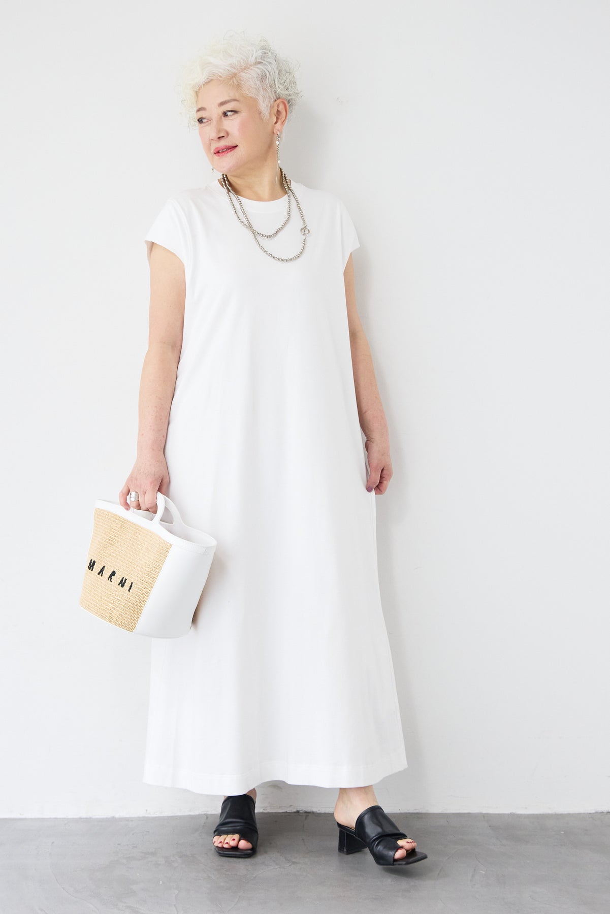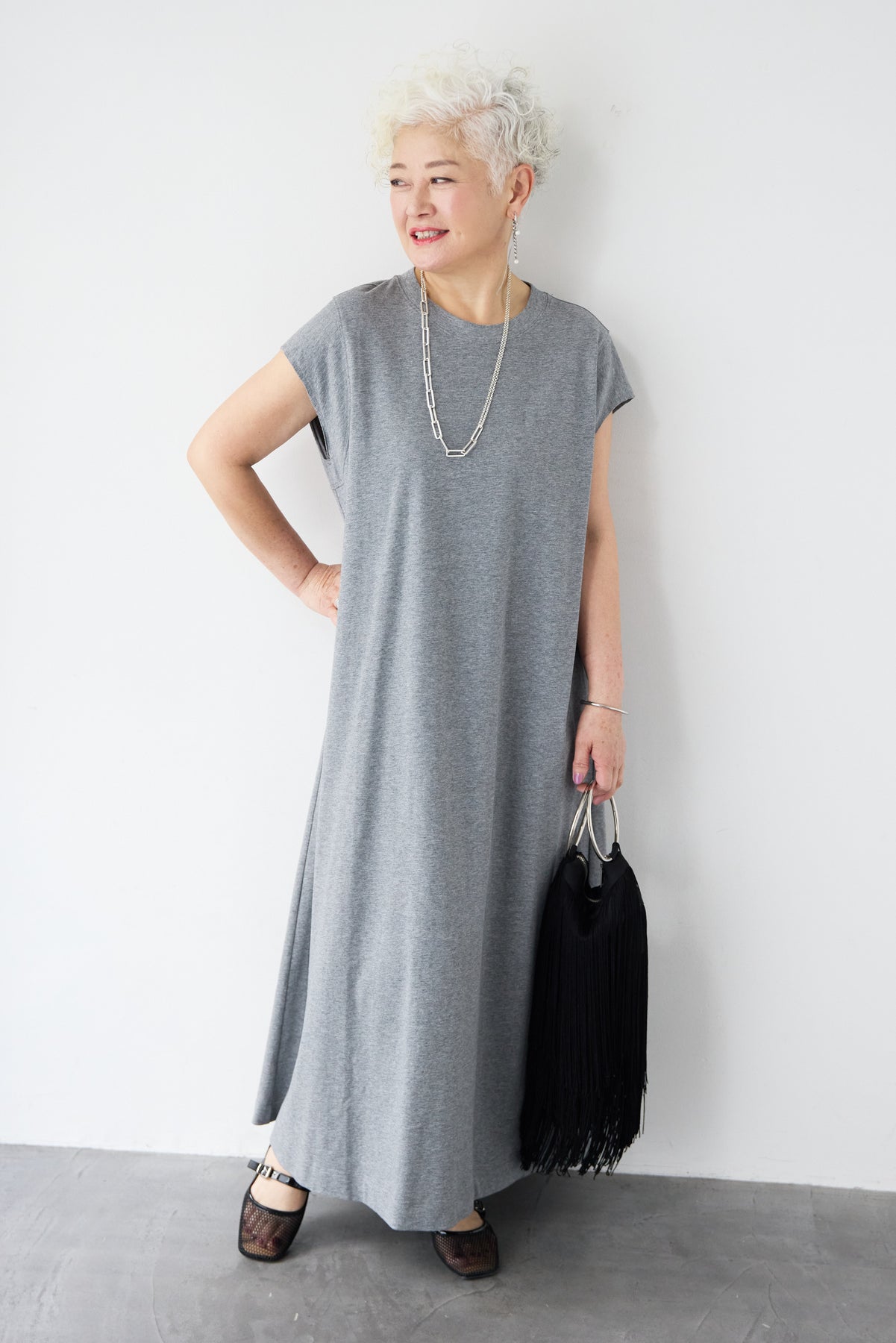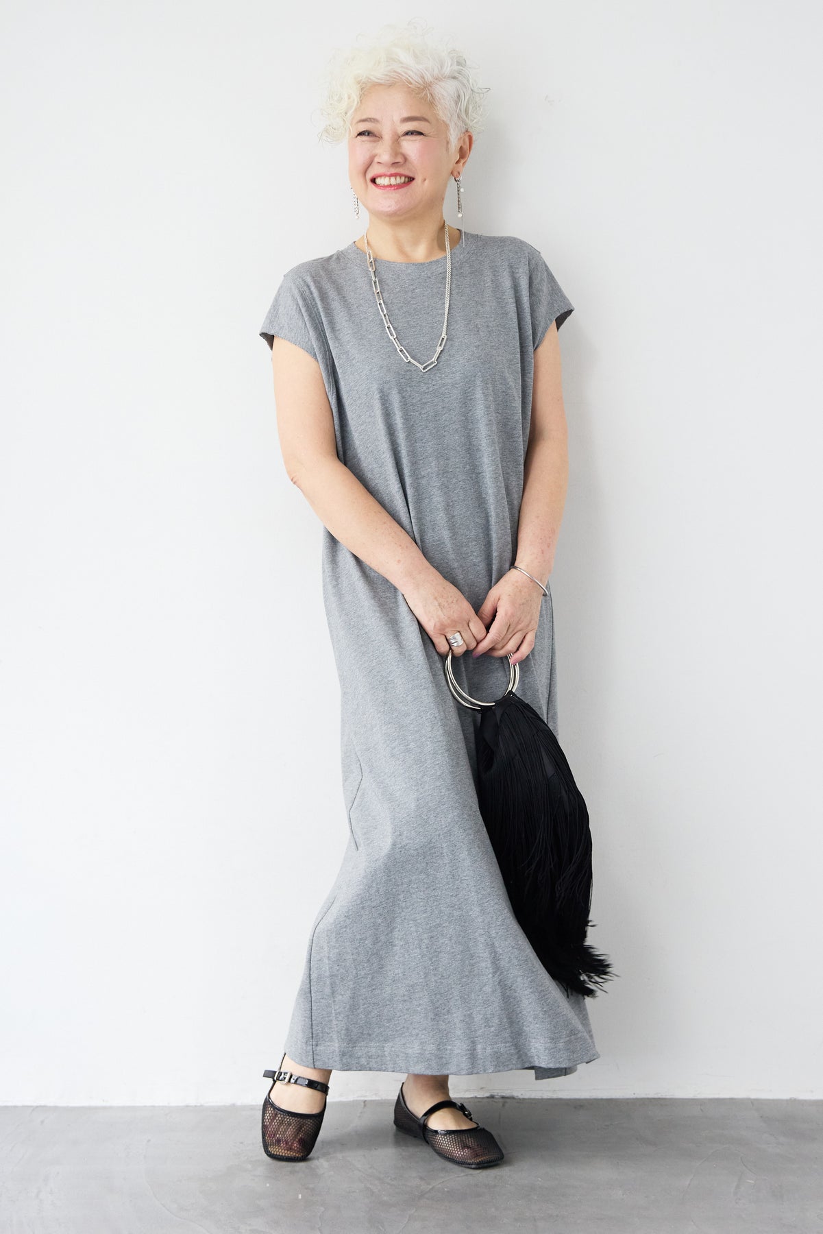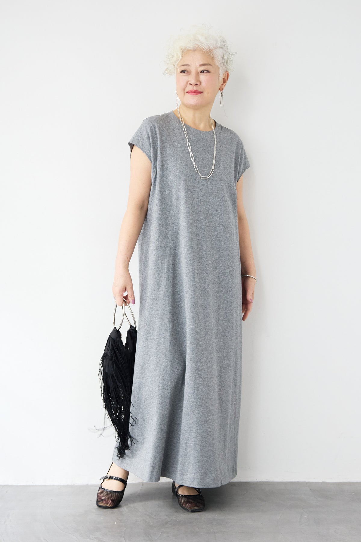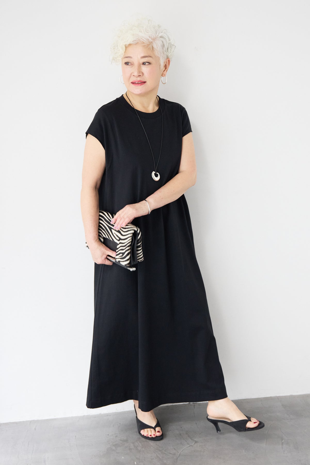 すっきりとしたIラインシルエットで体のラインを拾いにくく、1枚で上品に決まるTシャツワンピース。肩先をさりげなく覆うフレンチスリーブが腕まわりをすっきり見せ、リラックス感ときちんと感を両立します。程よいハリと落ち感のあるカットソー素材で、さらりとした肌触りと快適な着心地。シンプルなクルーネックと長め丈で、サンダルからスニーカーまで幅広いスタイリングに活躍します。デイリーにもお出かけにも頼れる、大人のためのミニマルワンピースです。