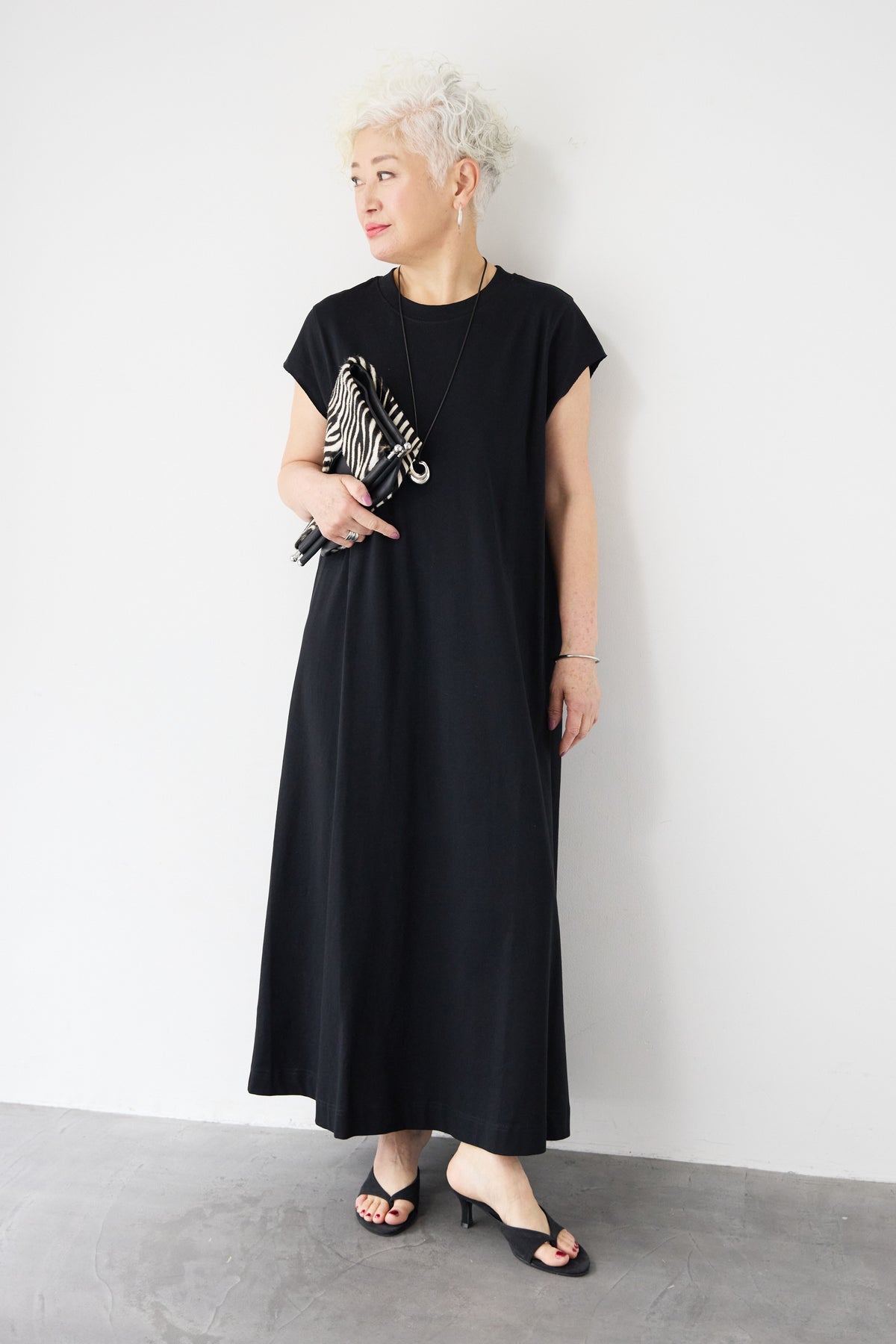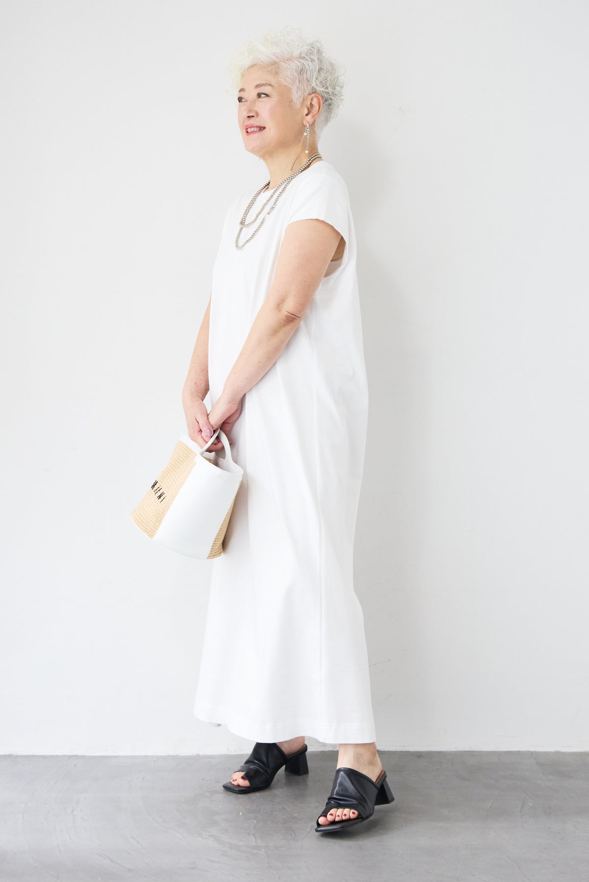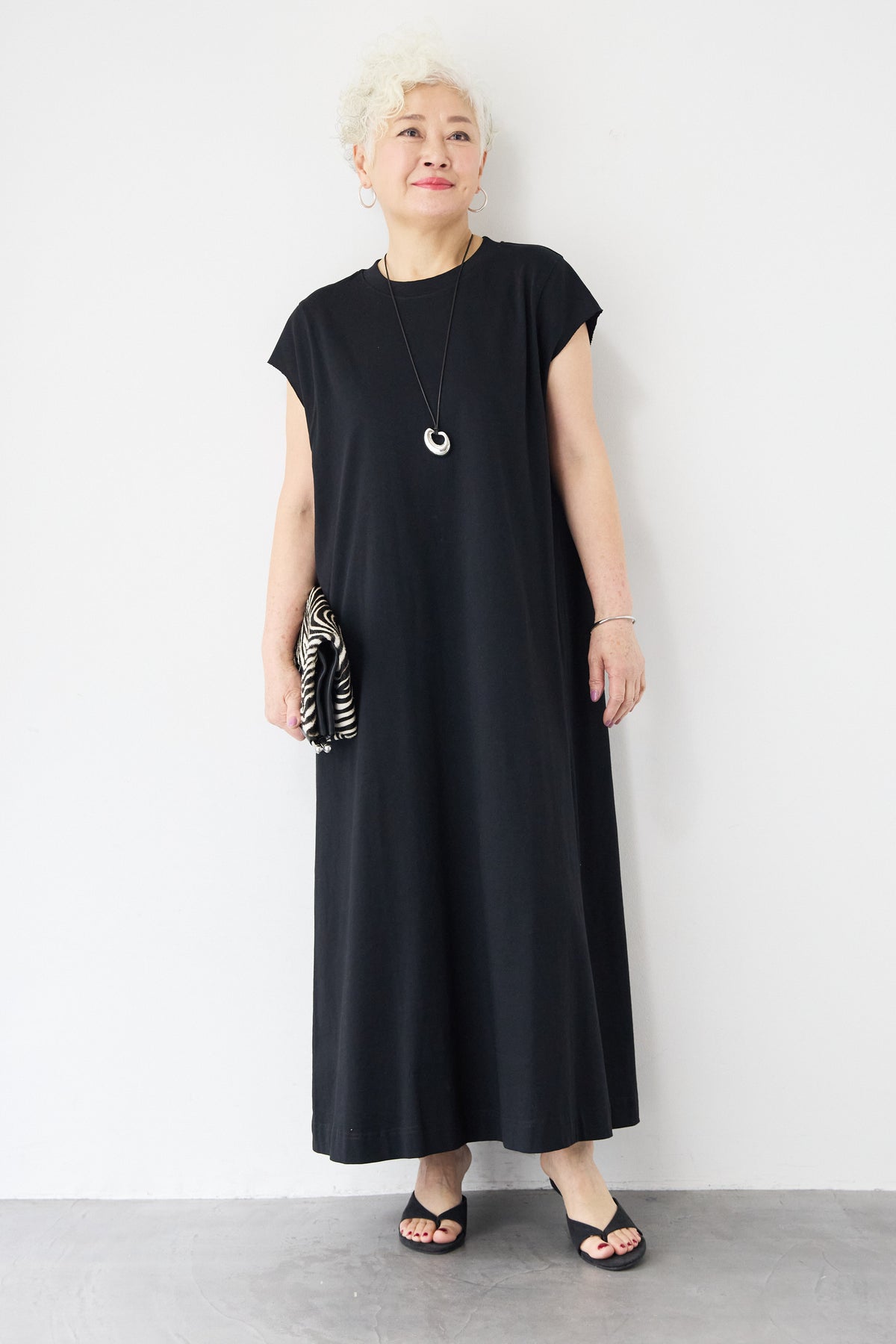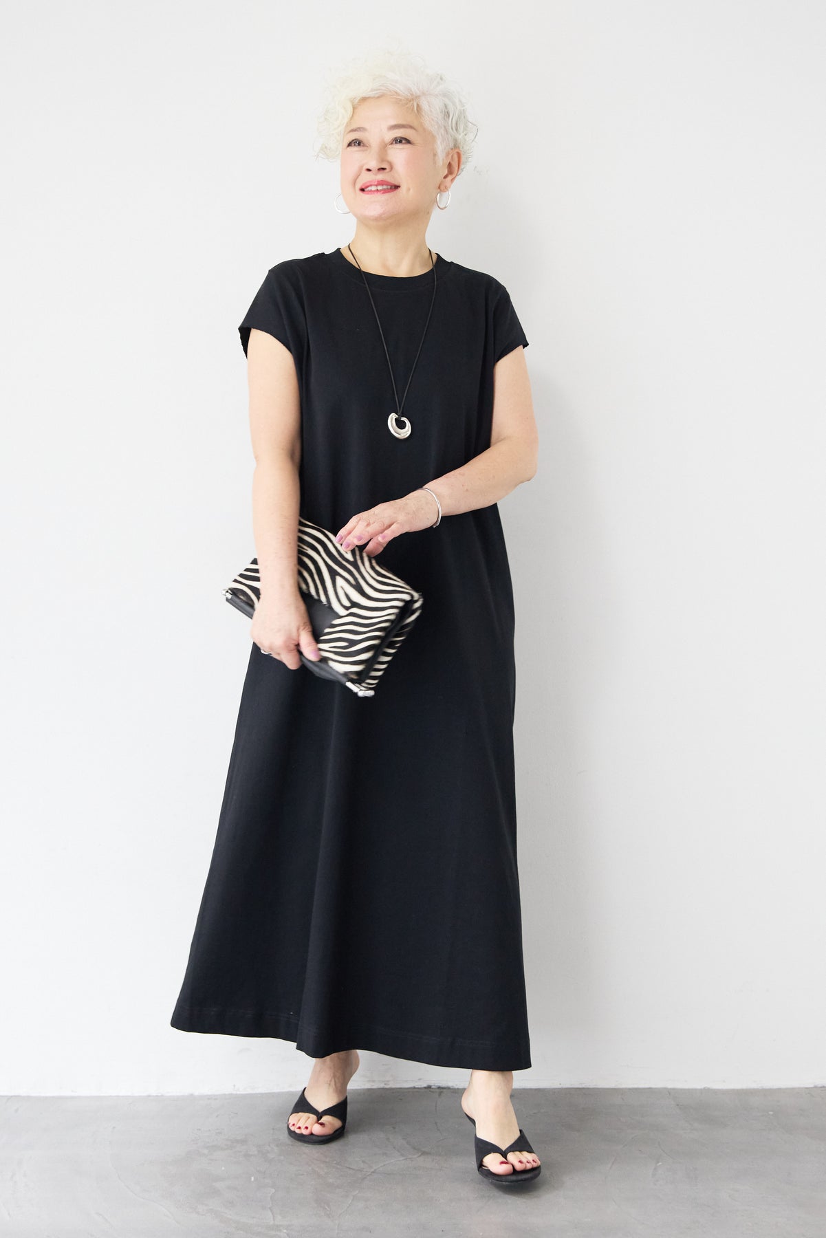 すっきりとしたIラインシルエットで体のラインを拾いにくく、1枚で上品に決まるTシャツワンピース。肩先をさりげなく覆うフレンチスリーブが腕まわりをすっきり見せ、リラックス感ときちんと感を両立します。程よいハリと落ち感のあるカットソー素材で、さらりとした肌触りと快適な着心地。シンプルなクルーネックと長め丈で、サンダルからスニーカーまで幅広いスタイリングに活躍します。デイリーにもお出かけにも頼れる、大人のためのミニマルワンピースです。
