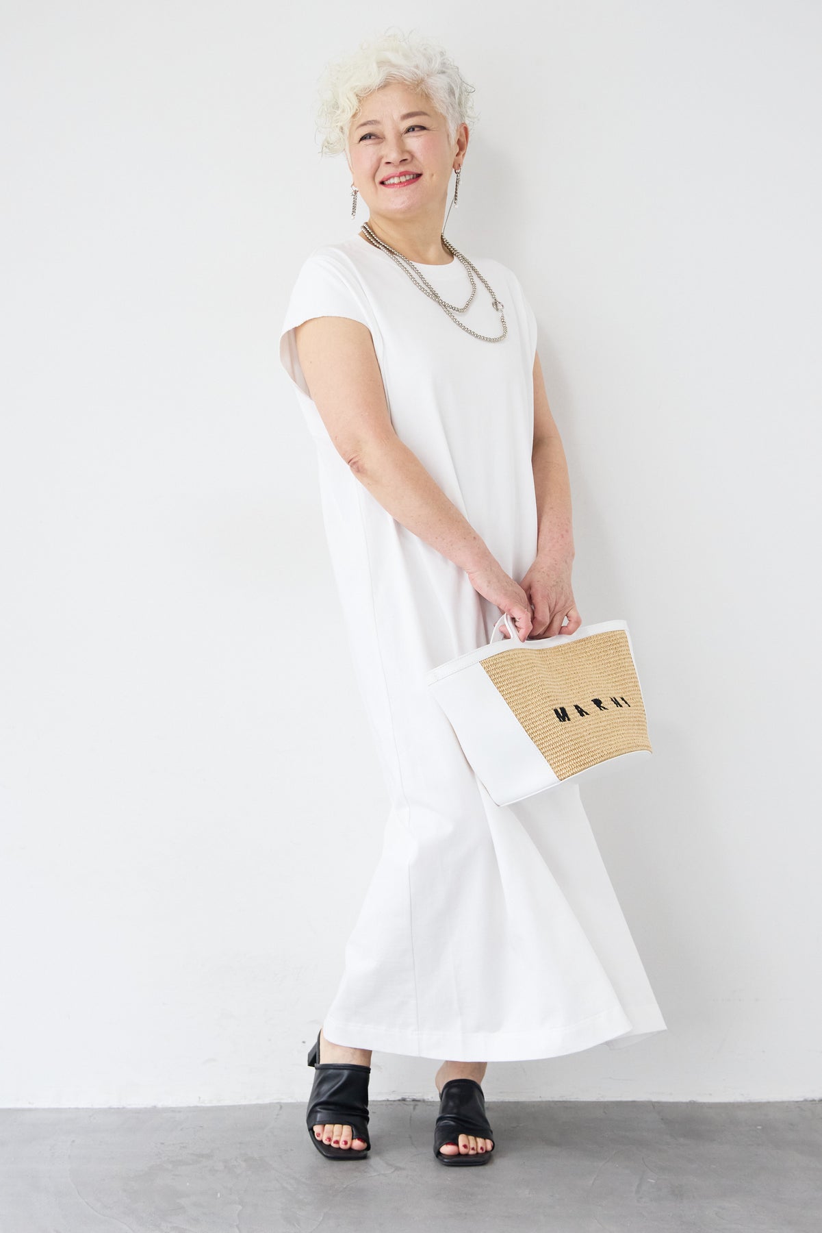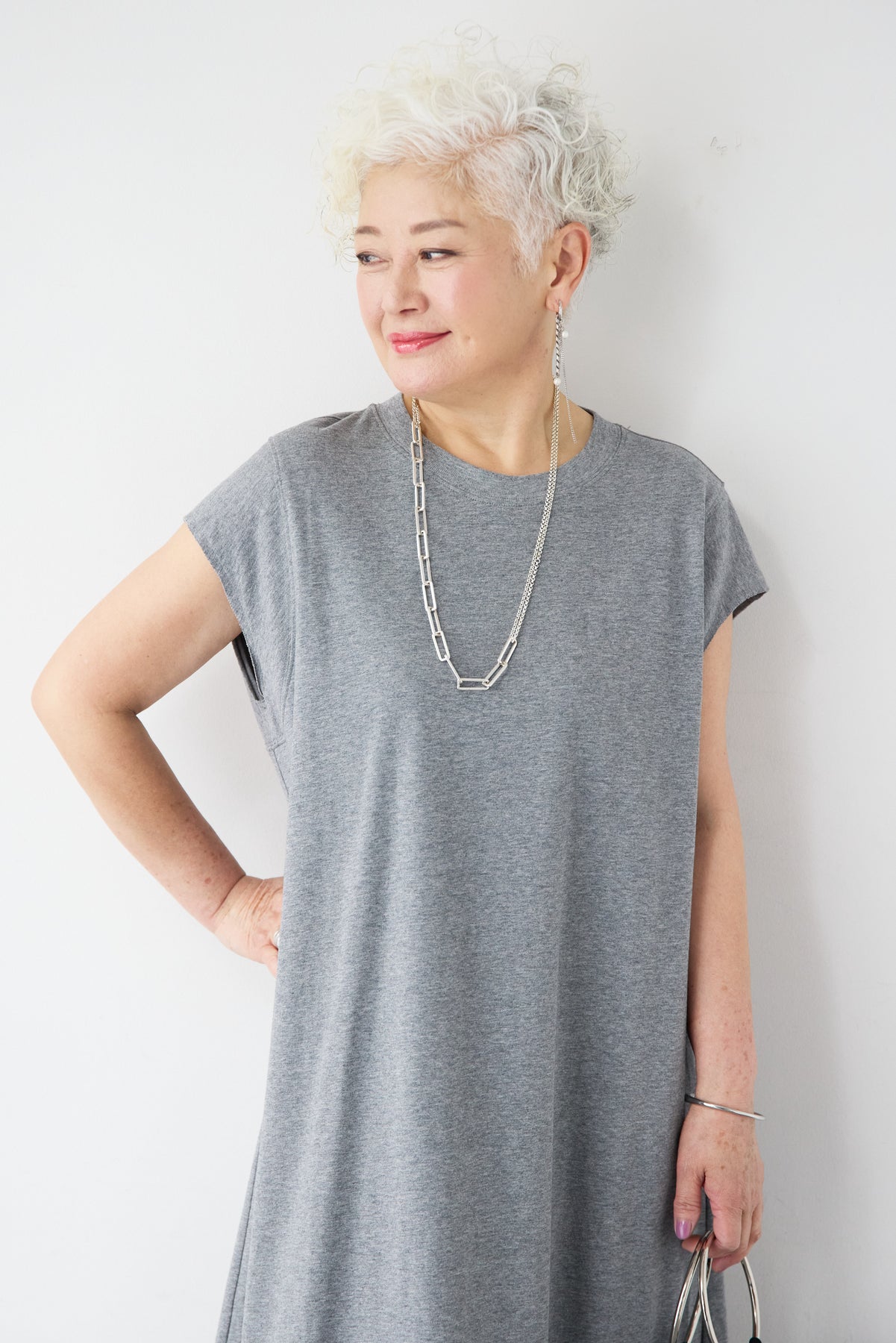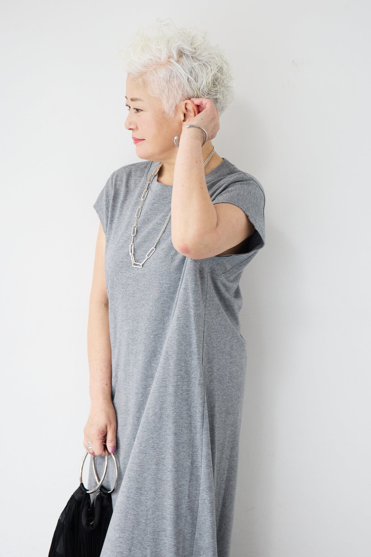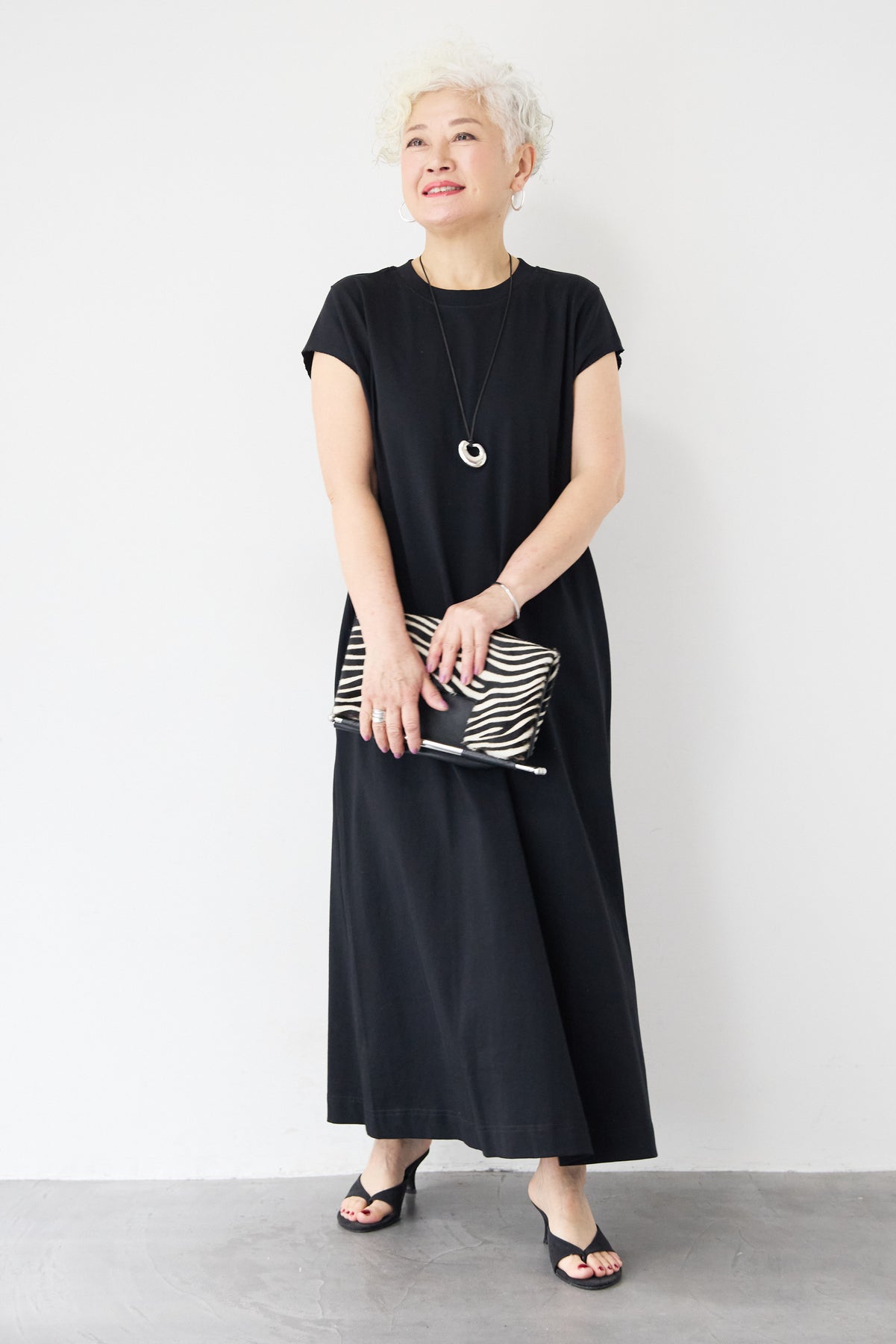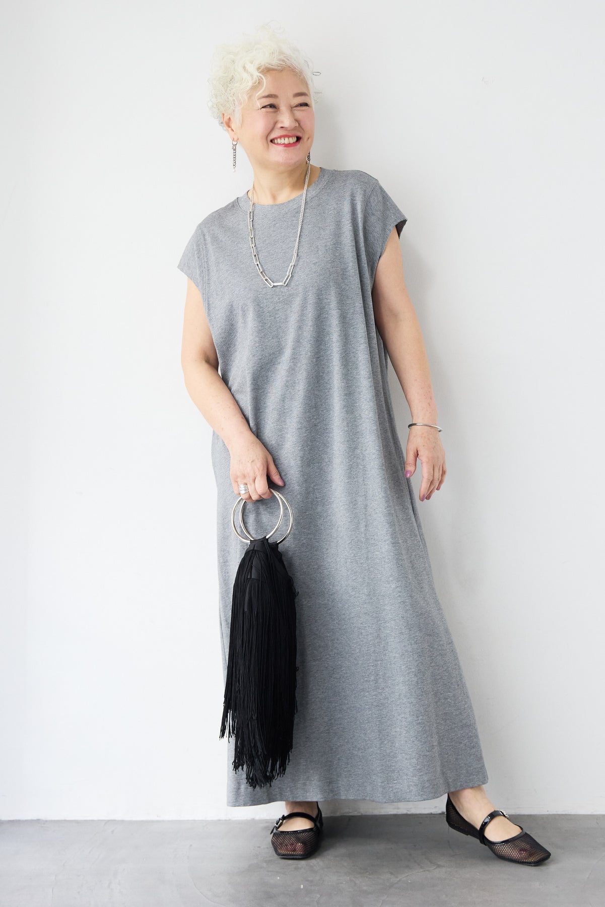 すっきりとしたIラインシルエットで体のラインを拾いにくく、1枚で上品に決まるTシャツワンピース。肩先をさりげなく覆うフレンチスリーブが腕まわりをすっきり見せ、リラックス感ときちんと感を両立します。程よいハリと落ち感のあるカットソー素材で、さらりとした肌触りと快適な着心地。シンプルなクルーネックと長め丈で、サンダルからスニーカーまで幅広いスタイリングに活躍します。デイリーにもお出かけにも頼れる、大人のためのミニマルワンピースです。