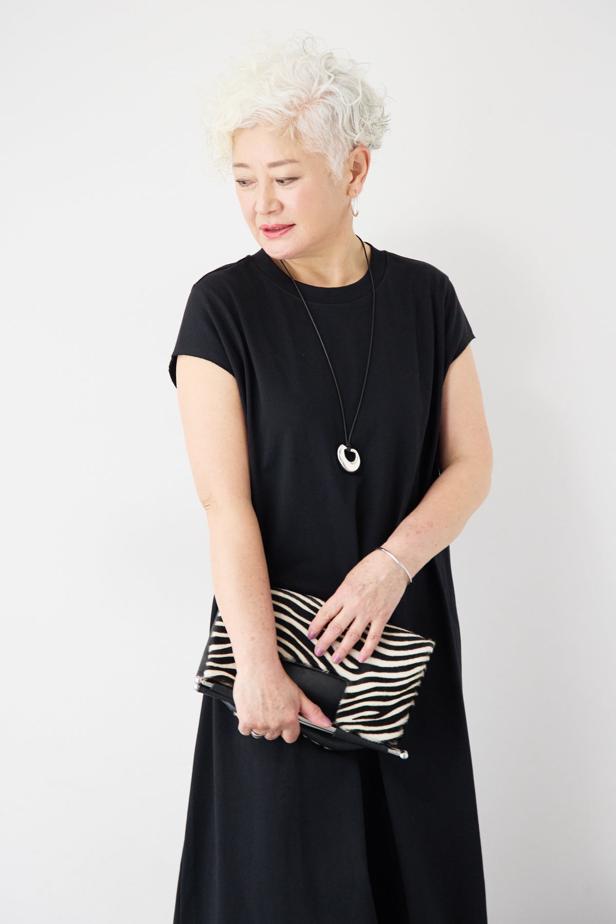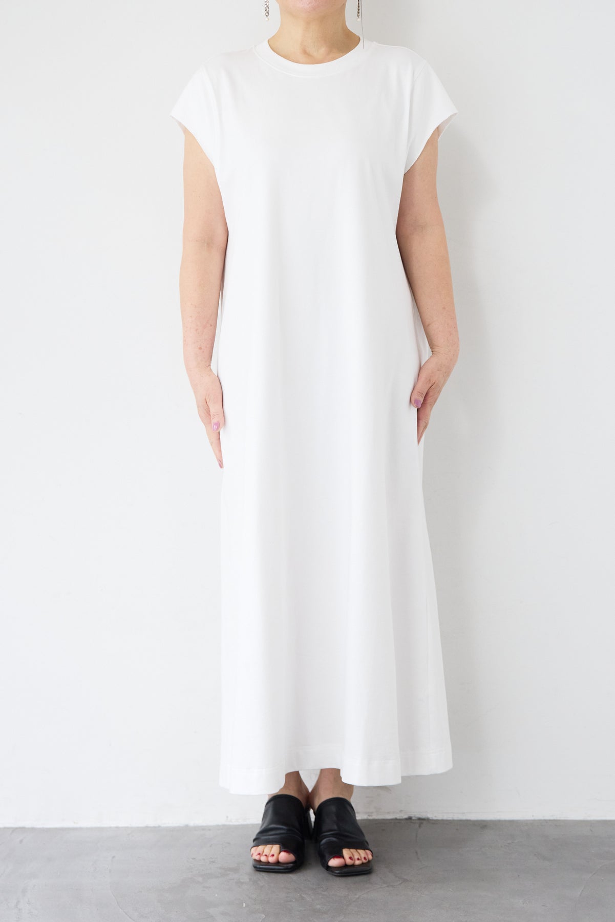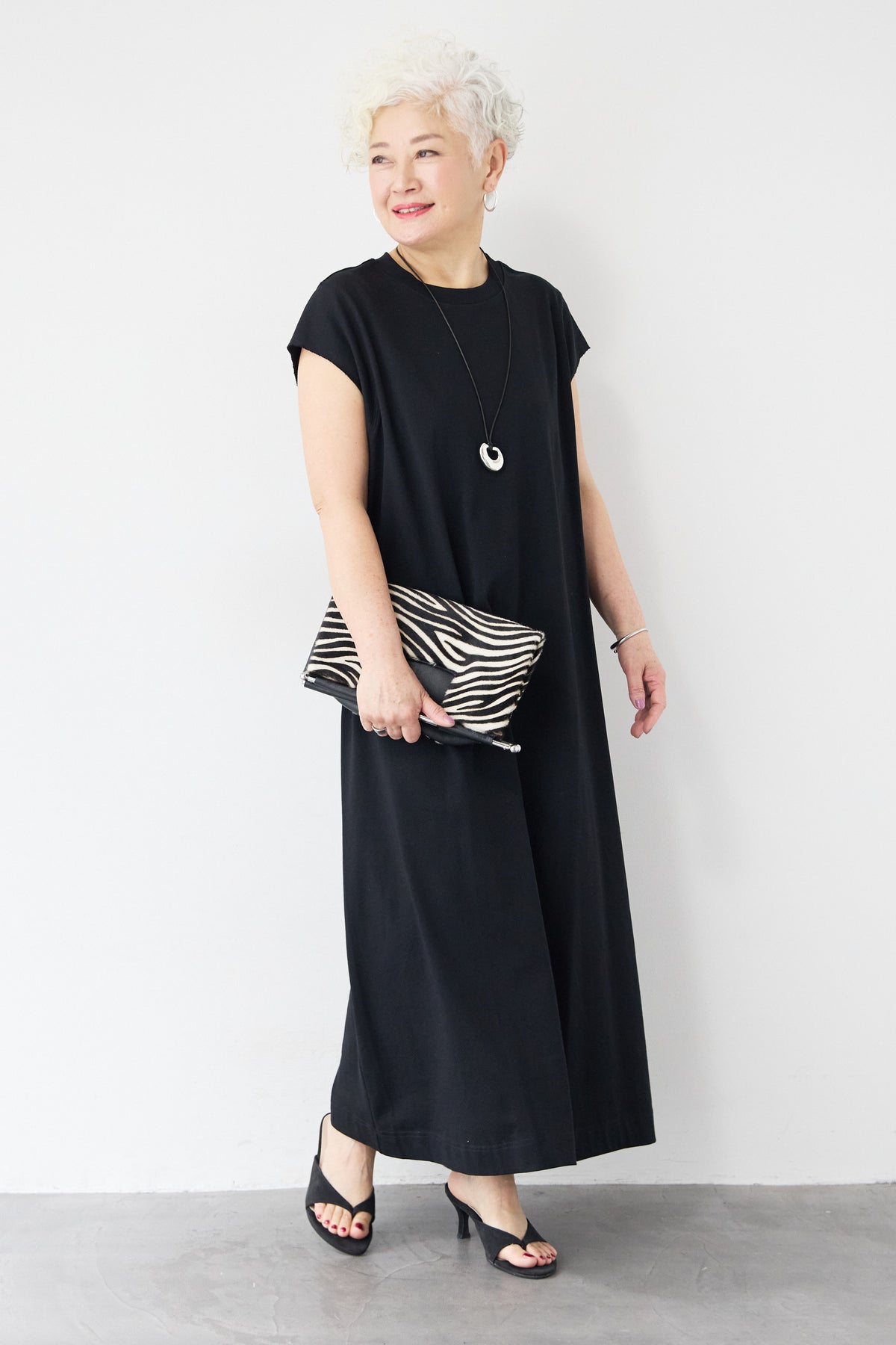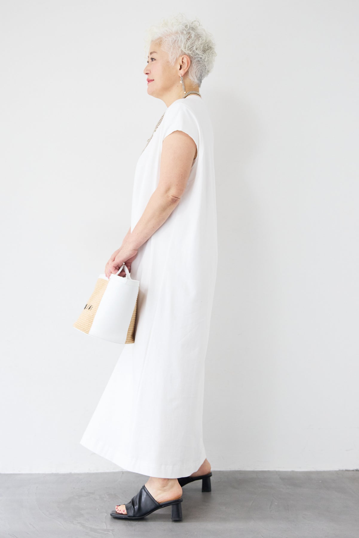 すっきりとしたIラインシルエットで体のラインを拾いにくく、1枚で上品に決まるTシャツワンピース。肩先をさりげなく覆うフレンチスリーブが腕まわりをすっきり見せ、リラックス感ときちんと感を両立します。程よいハリと落ち感のあるカットソー素材で、さらりとした肌触りと快適な着心地。シンプルなクルーネックと長め丈で、サンダルからスニーカーまで幅広いスタイリングに活躍します。デイリーにもお出かけにも頼れる、大人のためのミニマルワンピースです。