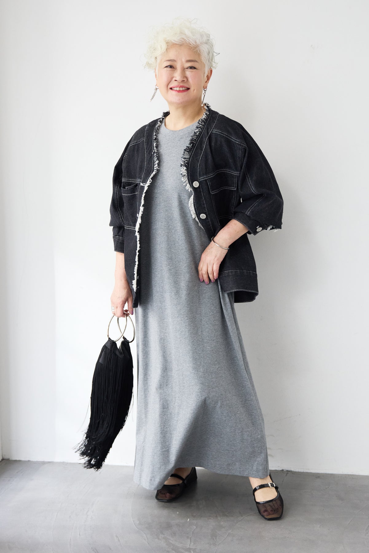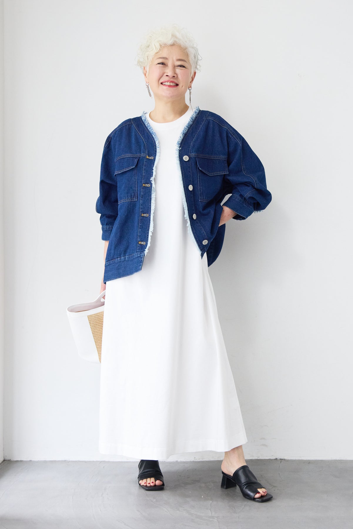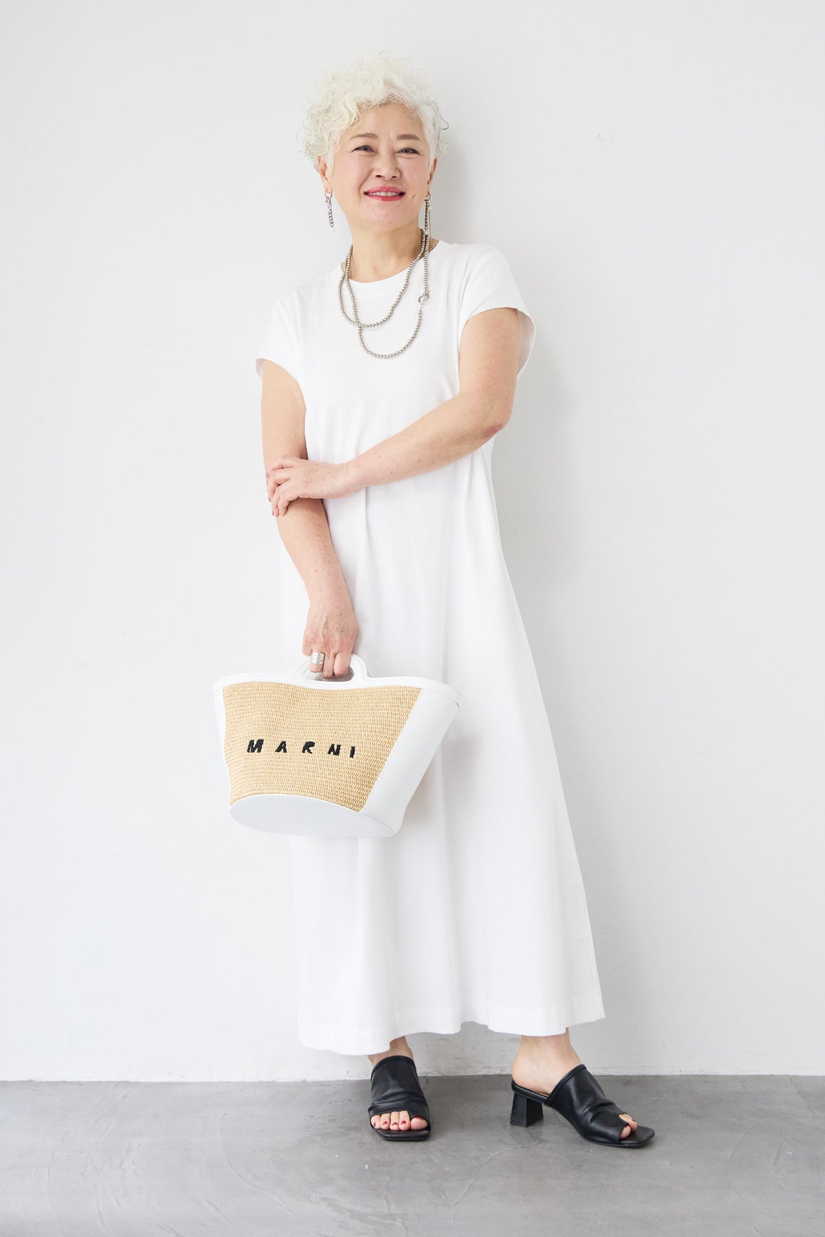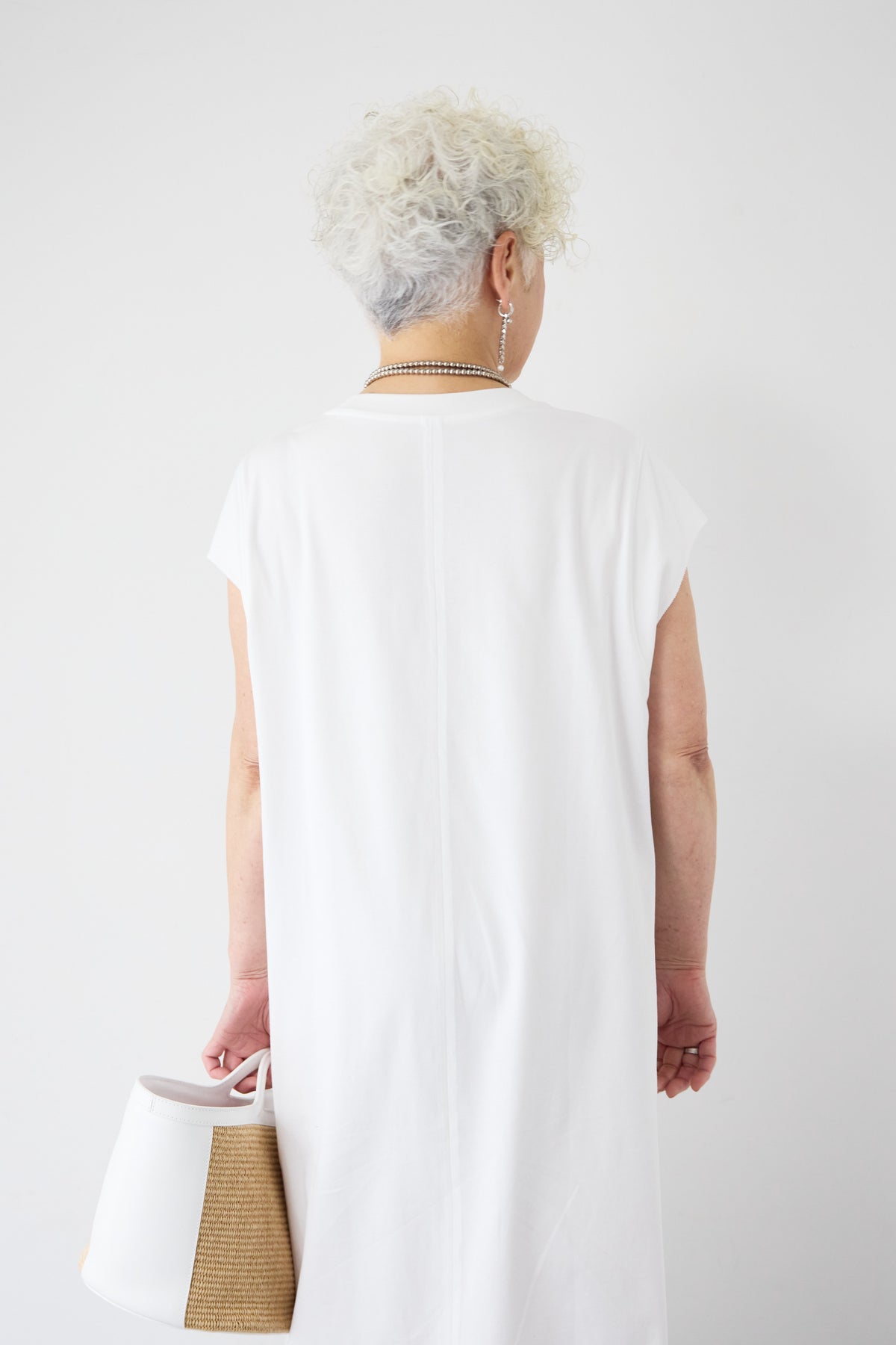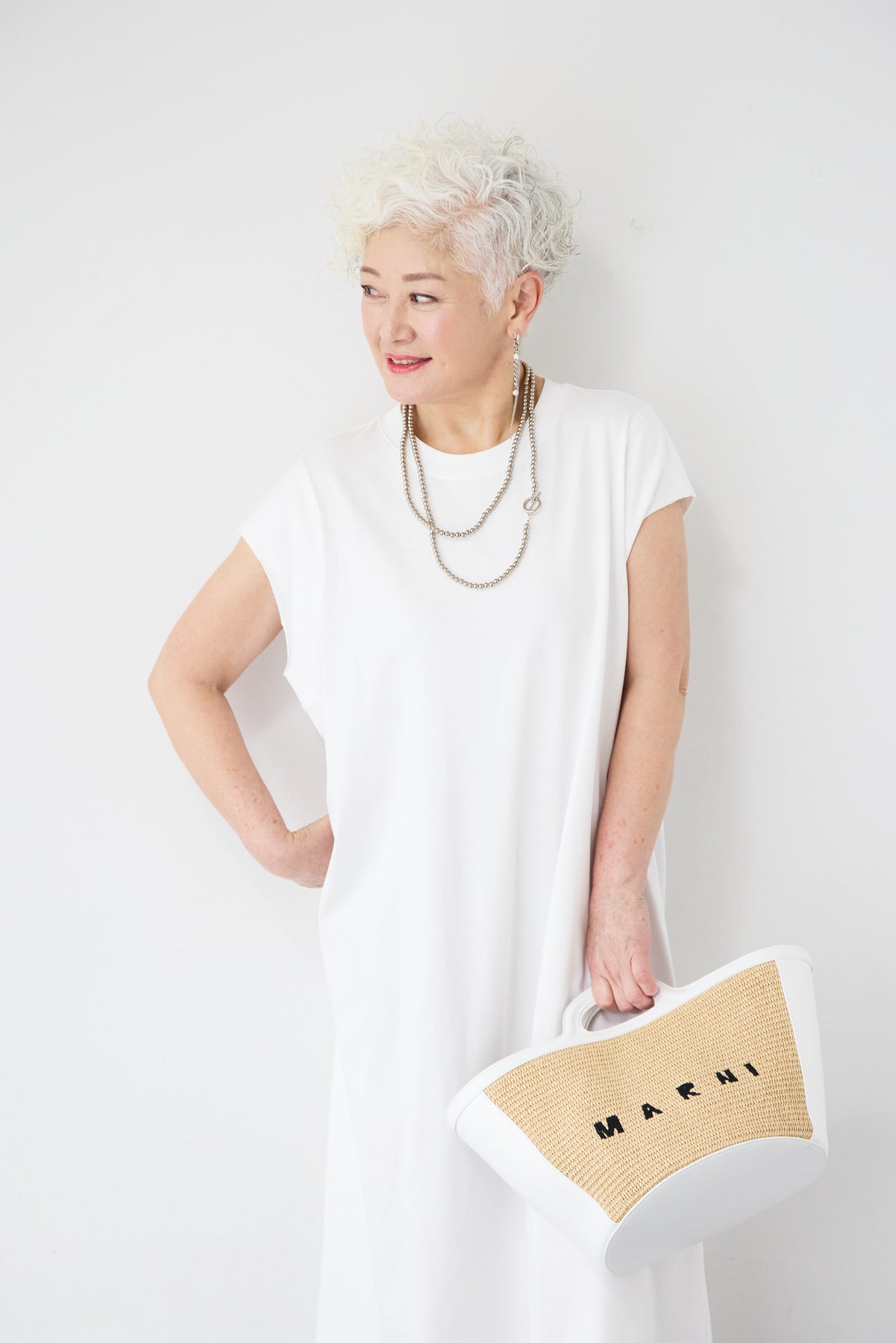 すっきりとしたIラインシルエットで体のラインを拾いにくく、1枚で上品に決まるTシャツワンピース。肩先をさりげなく覆うフレンチスリーブが腕まわりをすっきり見せ、リラックス感ときちんと感を両立します。程よいハリと落ち感のあるカットソー素材で、さらりとした肌触りと快適な着心地。シンプルなクルーネックと長め丈で、サンダルからスニーカーまで幅広いスタイリングに活躍します。デイリーにもお出かけにも頼れる、大人のためのミニマルワンピースです。