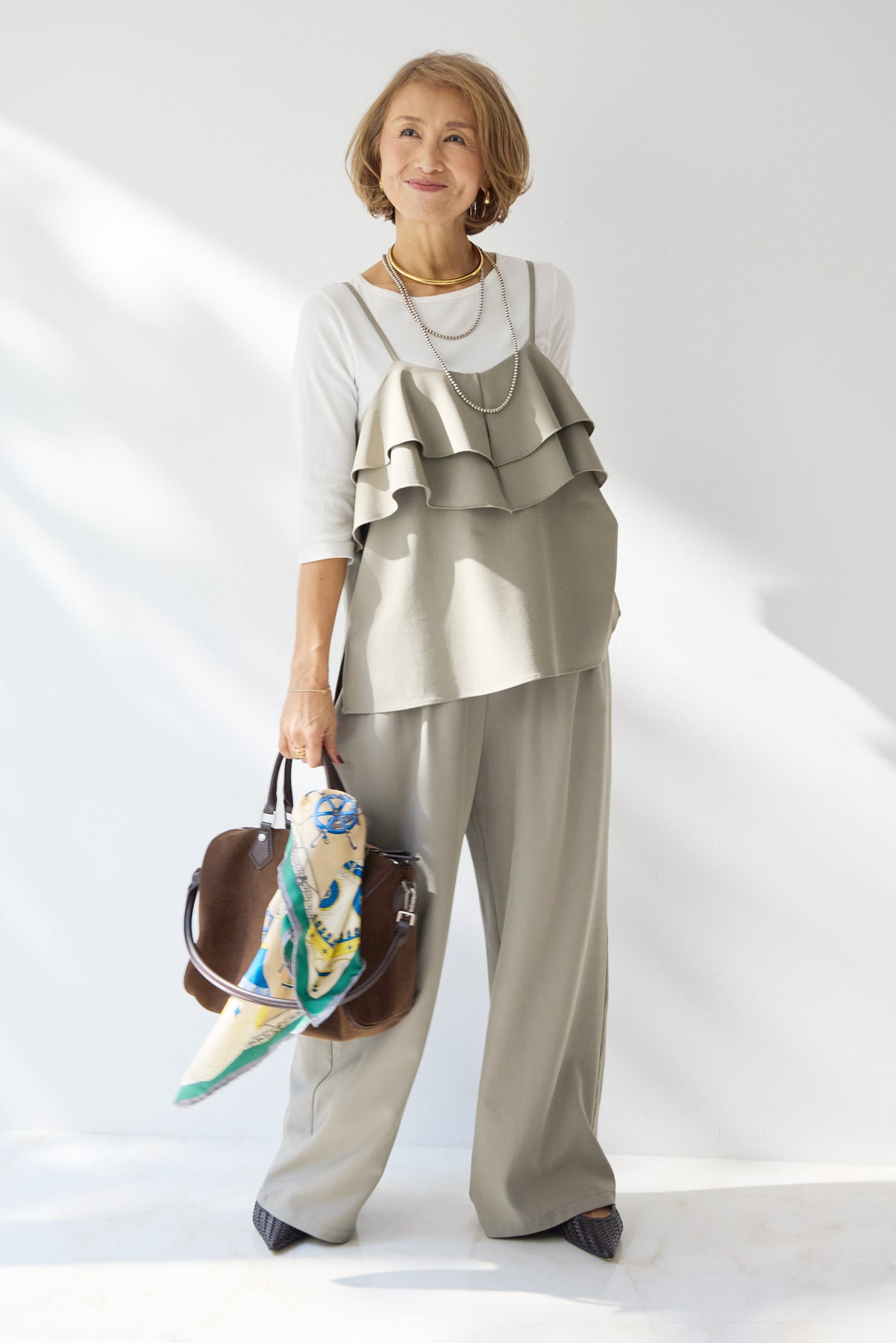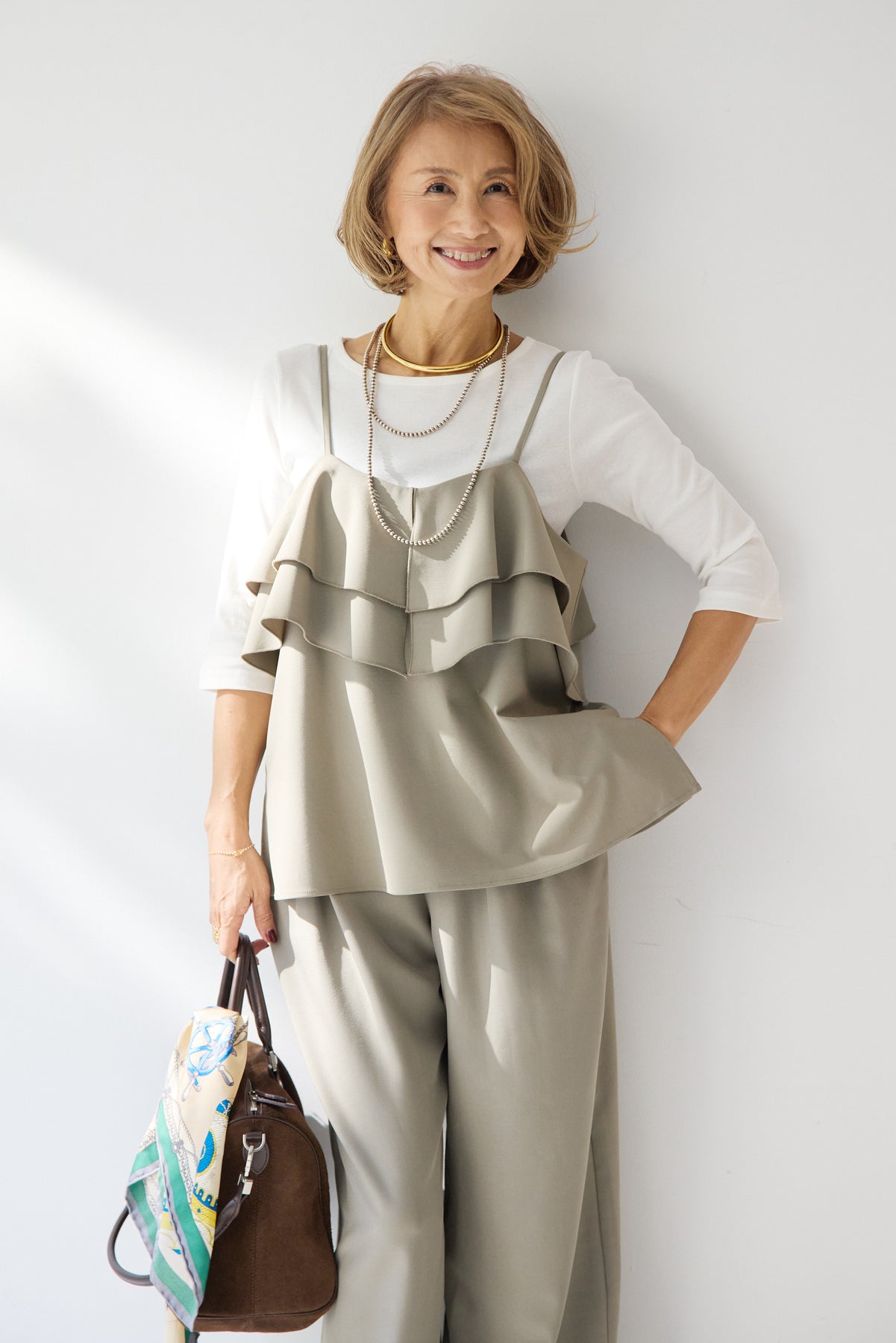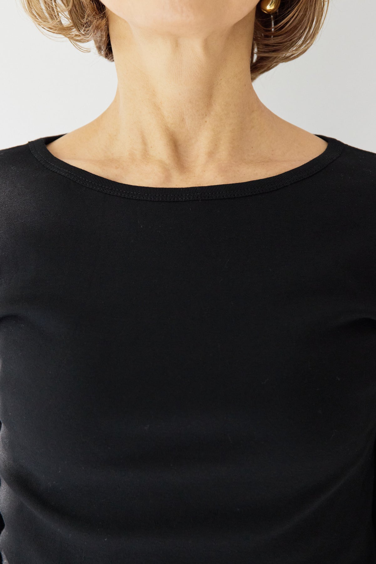 シンプルだからこそ、シルエットと着心地にこだわったベーシックカットソー。程よく身体に沿うフィット感で、インナーとしても一枚着としても活躍する万能アイテムです。滑らかで伸縮性のあるカットソー素材を使用し、窮屈感のない快適な着用感を実現。七分袖デザインが腕まわりをすっきりと見せ、ロングシーズン着回し可能です。首元は開きすぎないクルーネックで、上品かつミニマルな印象に。ジャケットやカーディガンのインナーとしてももたつかず、きれいに収まります。パンツにもスカートにも合わせやすく、オン・オフ問わずデイリーに活躍。ワードローブに一枚は持っておきたい、頼れるベーシックトップスです