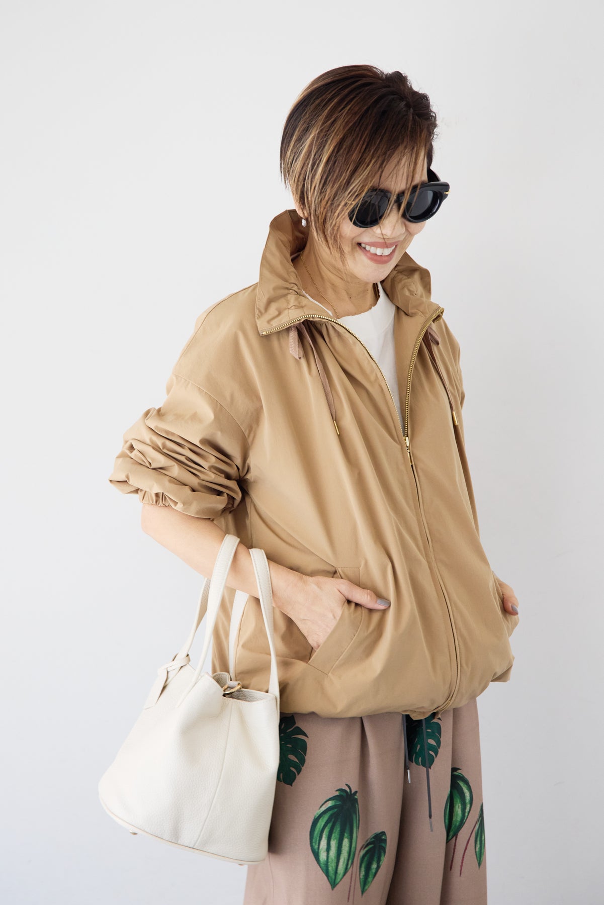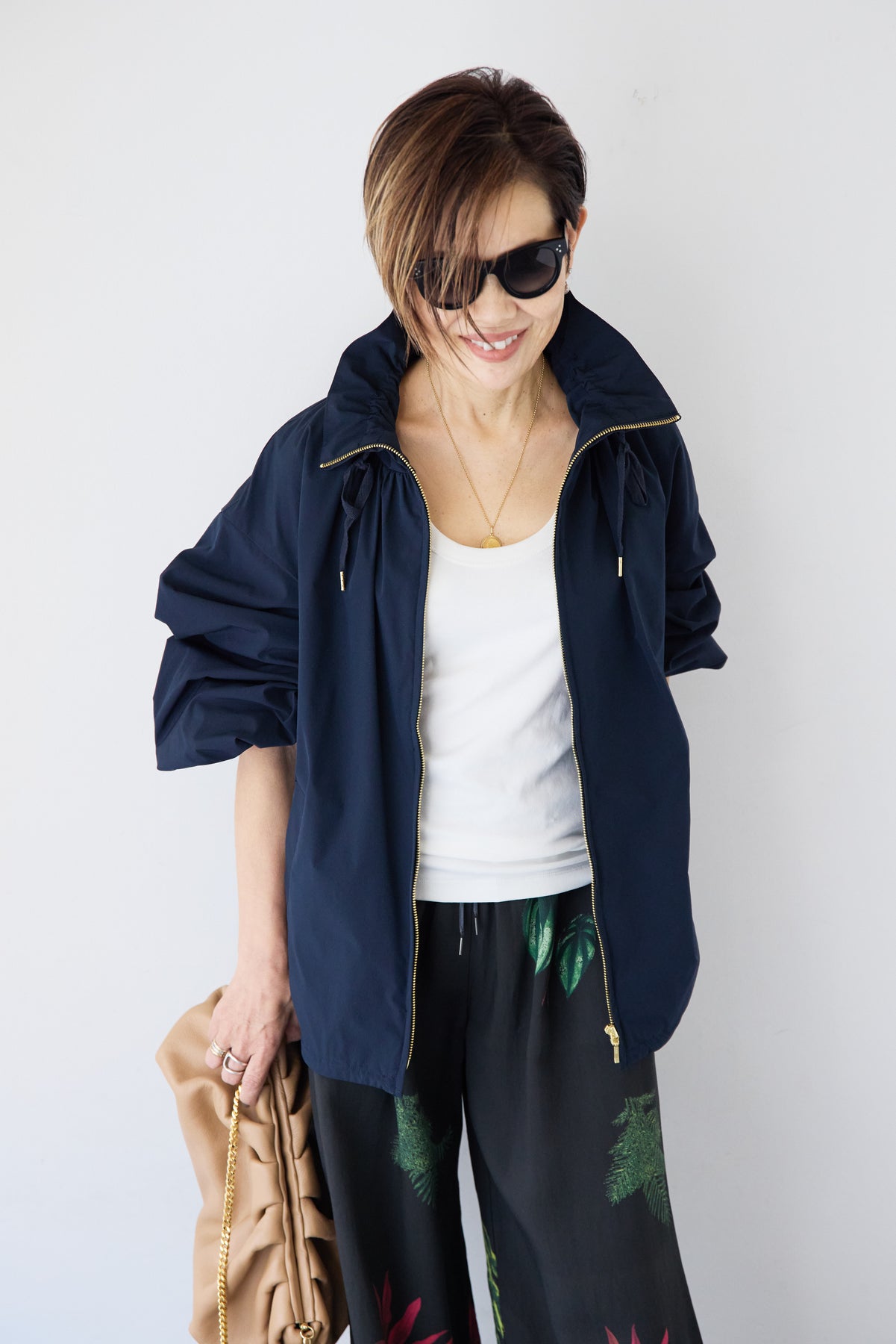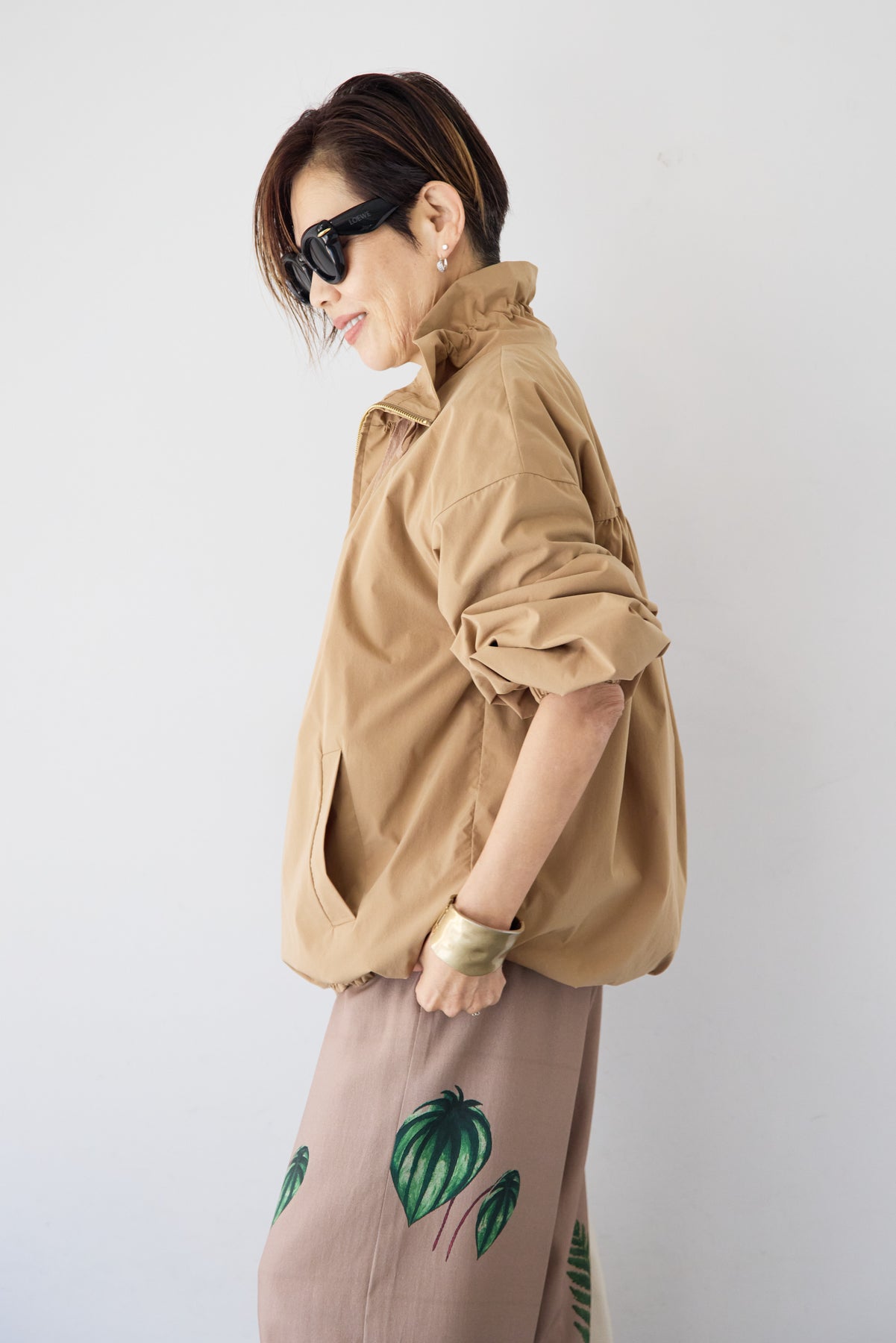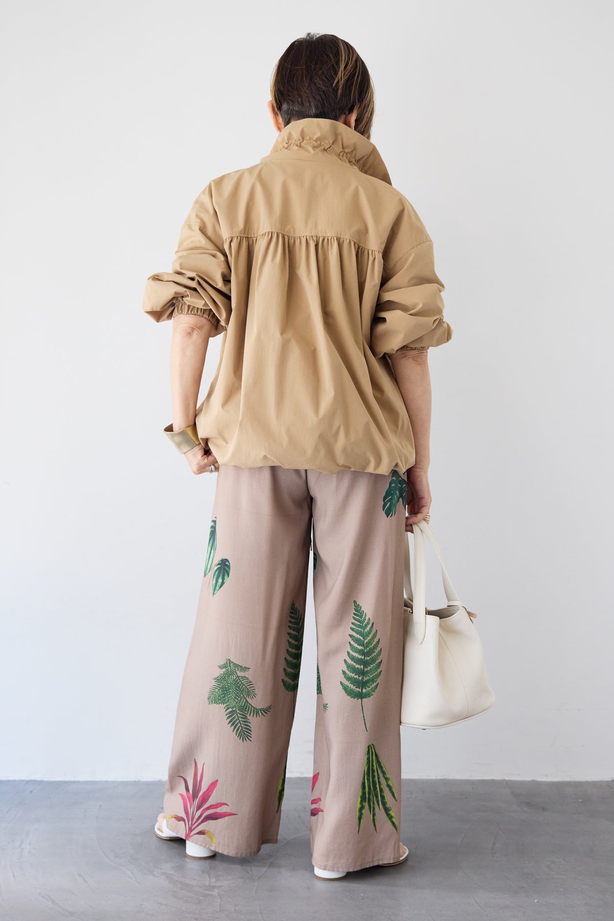 ギャザーネックライトブルゾン/ボタニカルリーフ イージーワイドパンツ