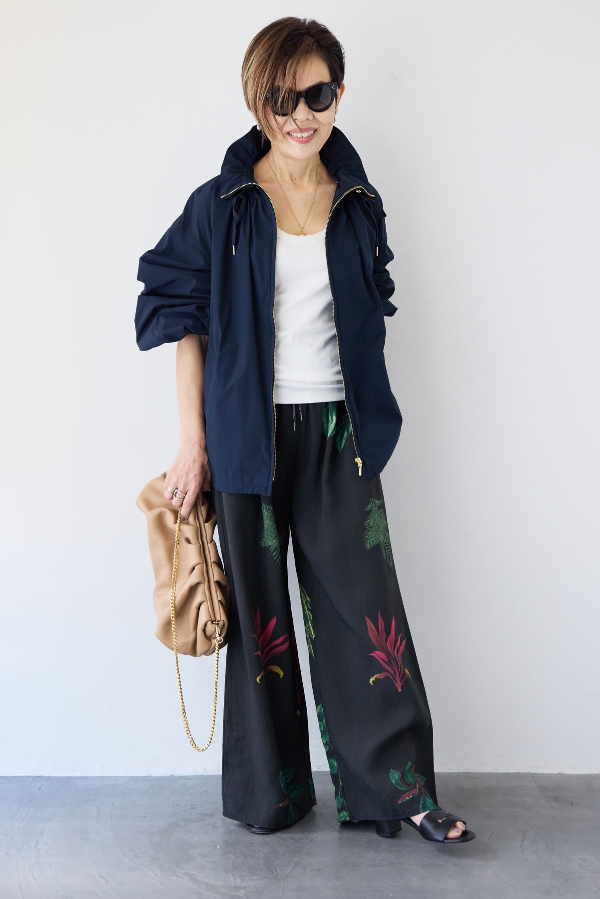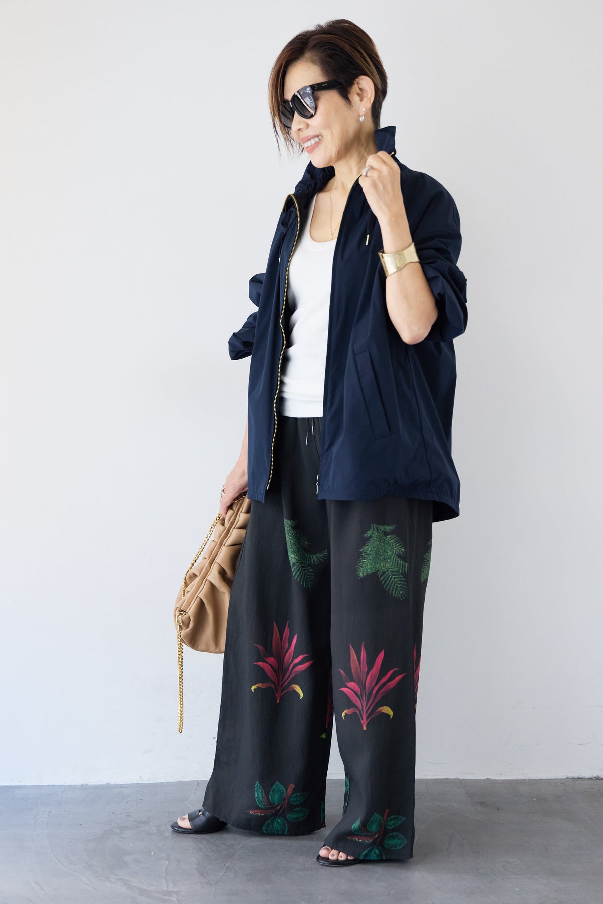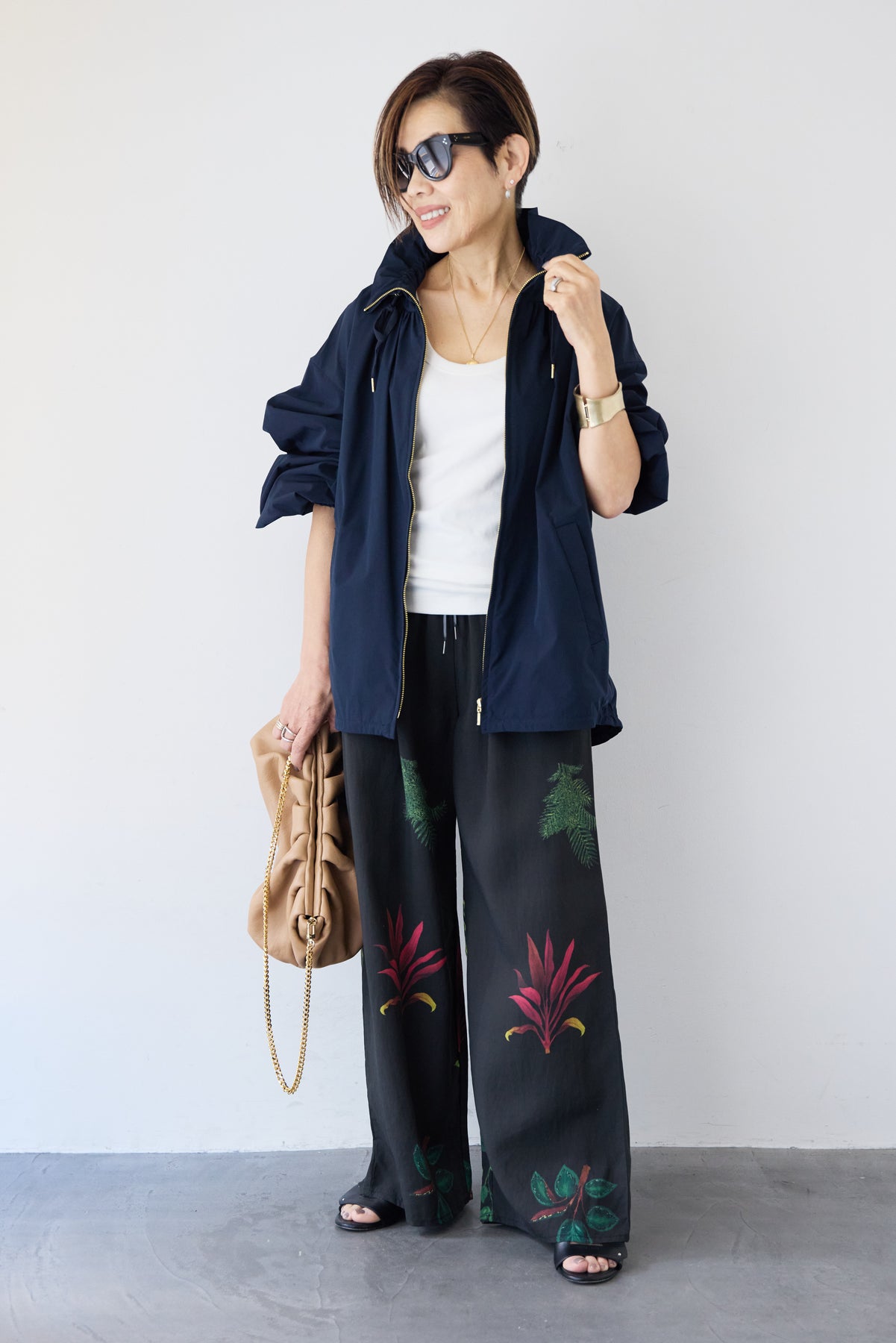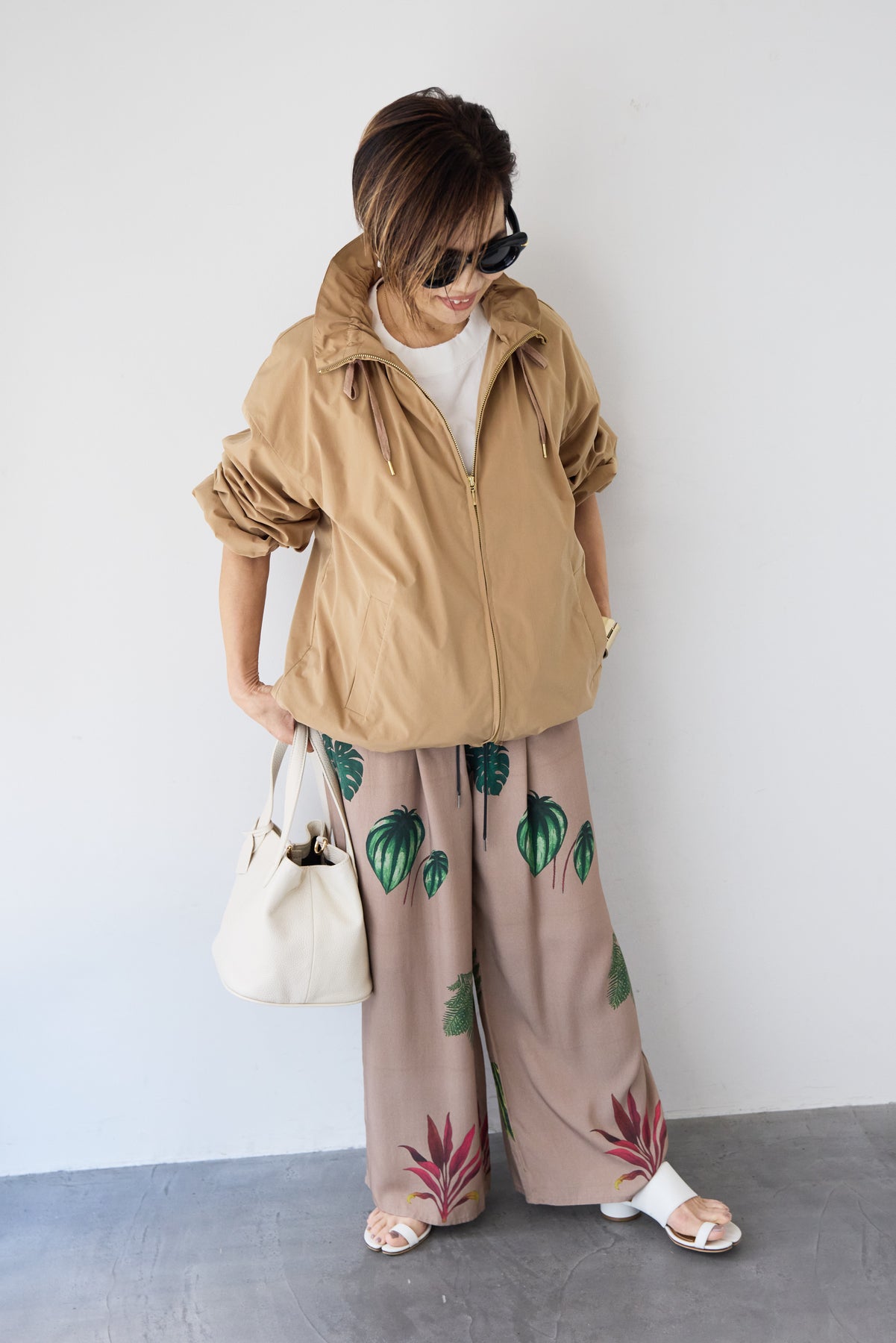 [SET]ギャザーネックライトブルゾン+ボタニカルリーフ イージーワイドパンツ(2set)