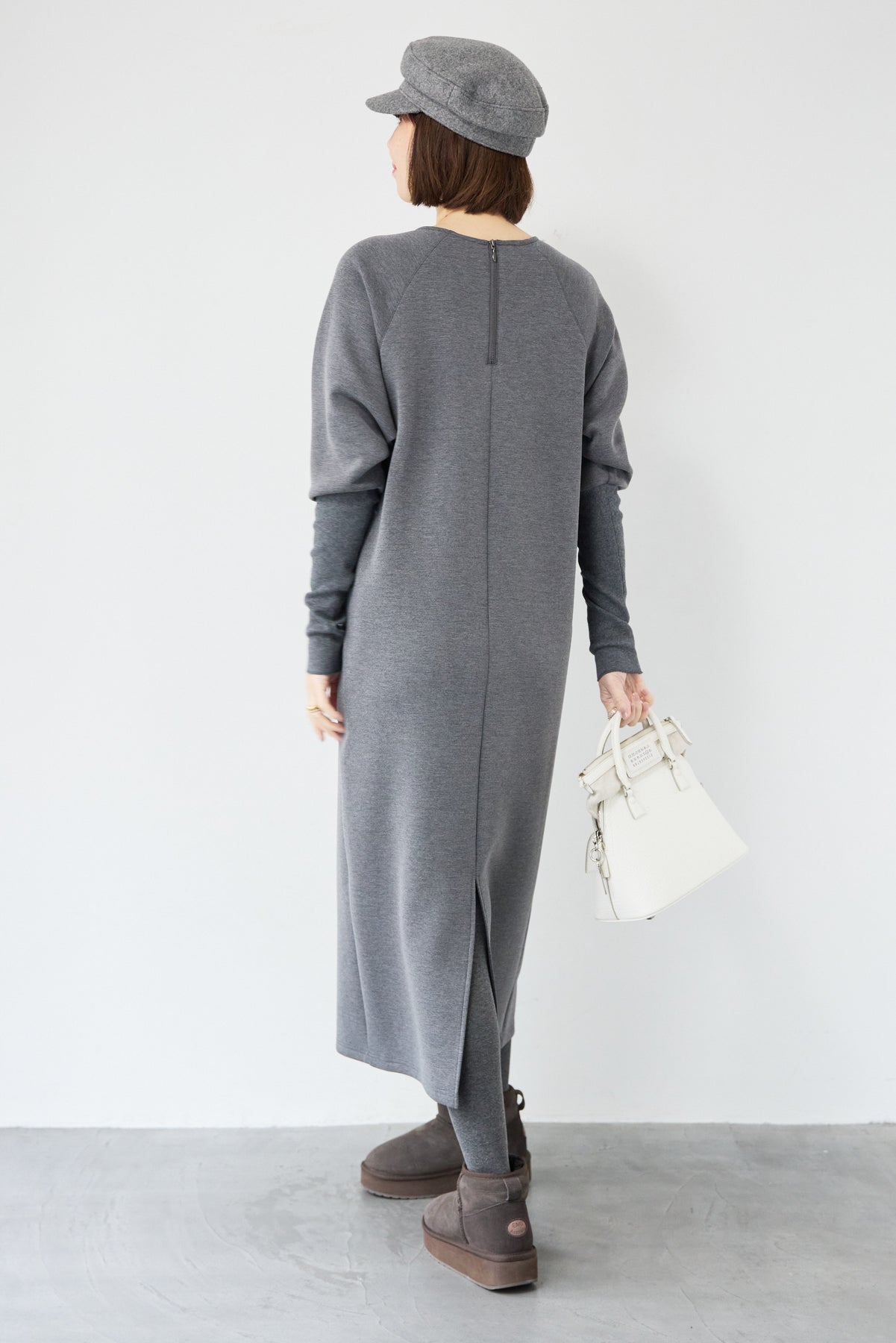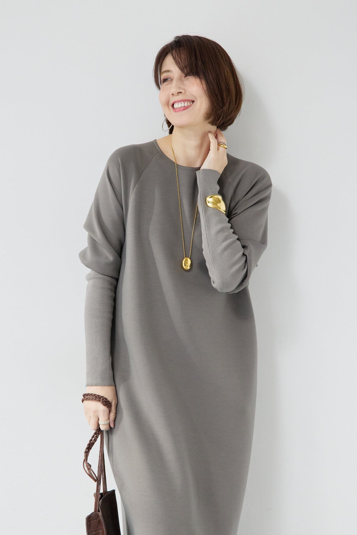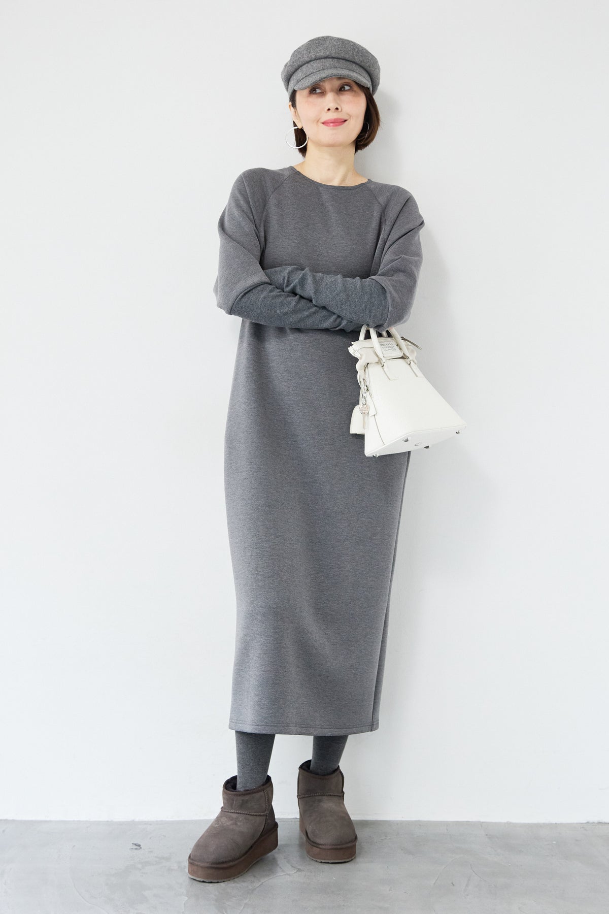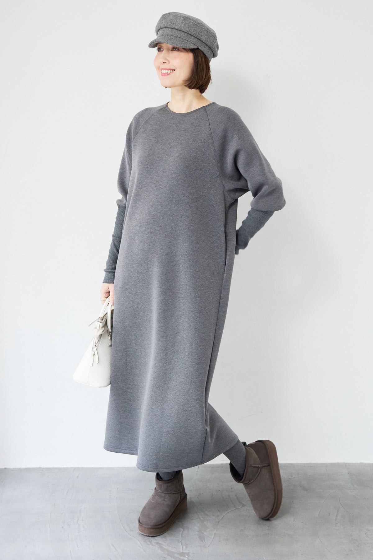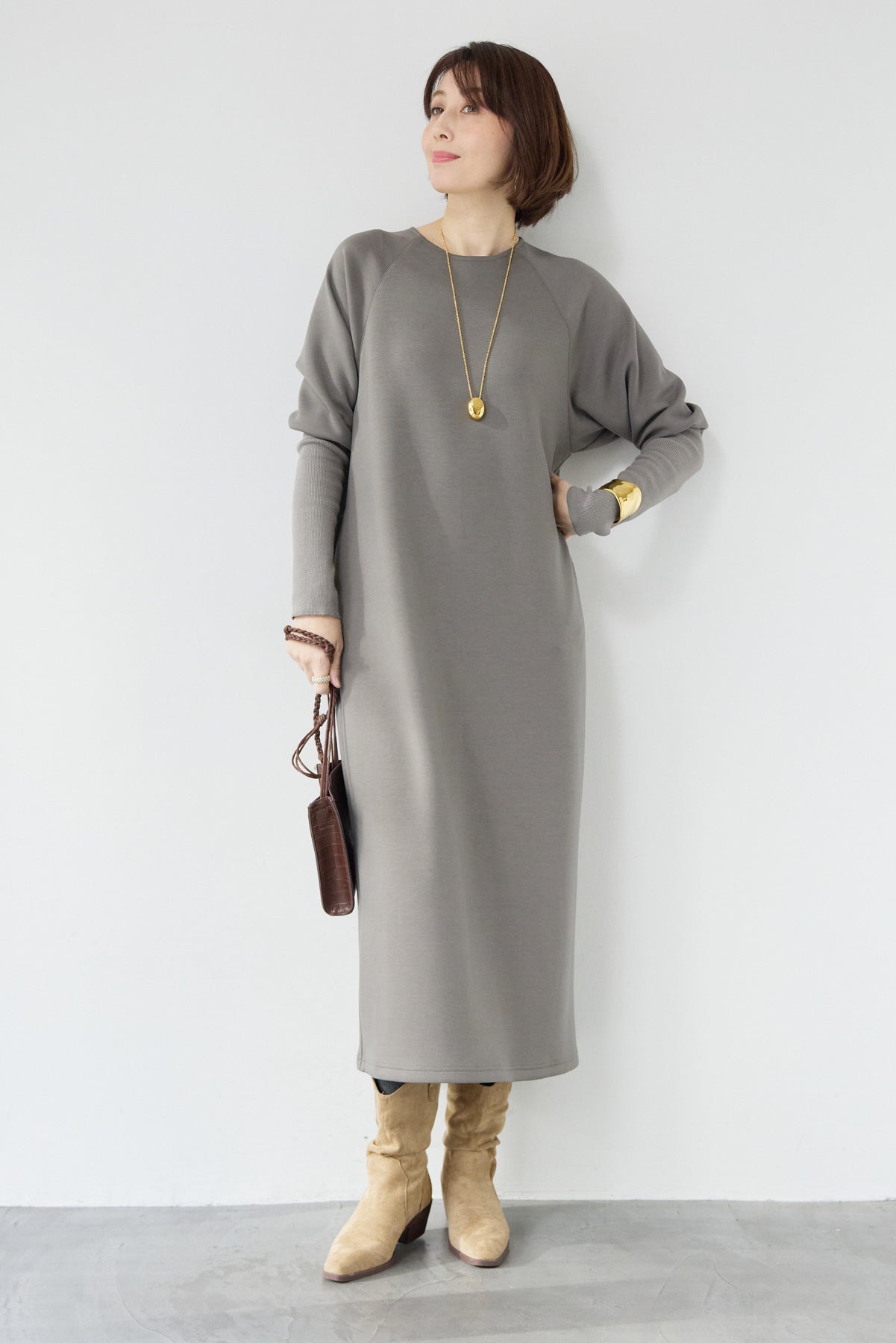 ミニマルなデザインと快適な着心地を兼ね備えた、バックジップダンボールワンピース。やや肉厚でハリのあるダンボールニット素材を使用し、シルエットを美しくキープしながらも軽やかな着用感を実現しました。シンプルなラウンドネックとラグランスリーブが、抜け感のあるリラックスした印象を演出。長めの袖丈とリブ切り替えが程よいアクセントとなり、モード感をプラスします。背面のミドル丈ファスナーは着脱をスムーズにしつつ、デザインポイントにも。バックにはスリットを配し、足さばきも快適です。両サイドにはポケット付きで実用性も◎。