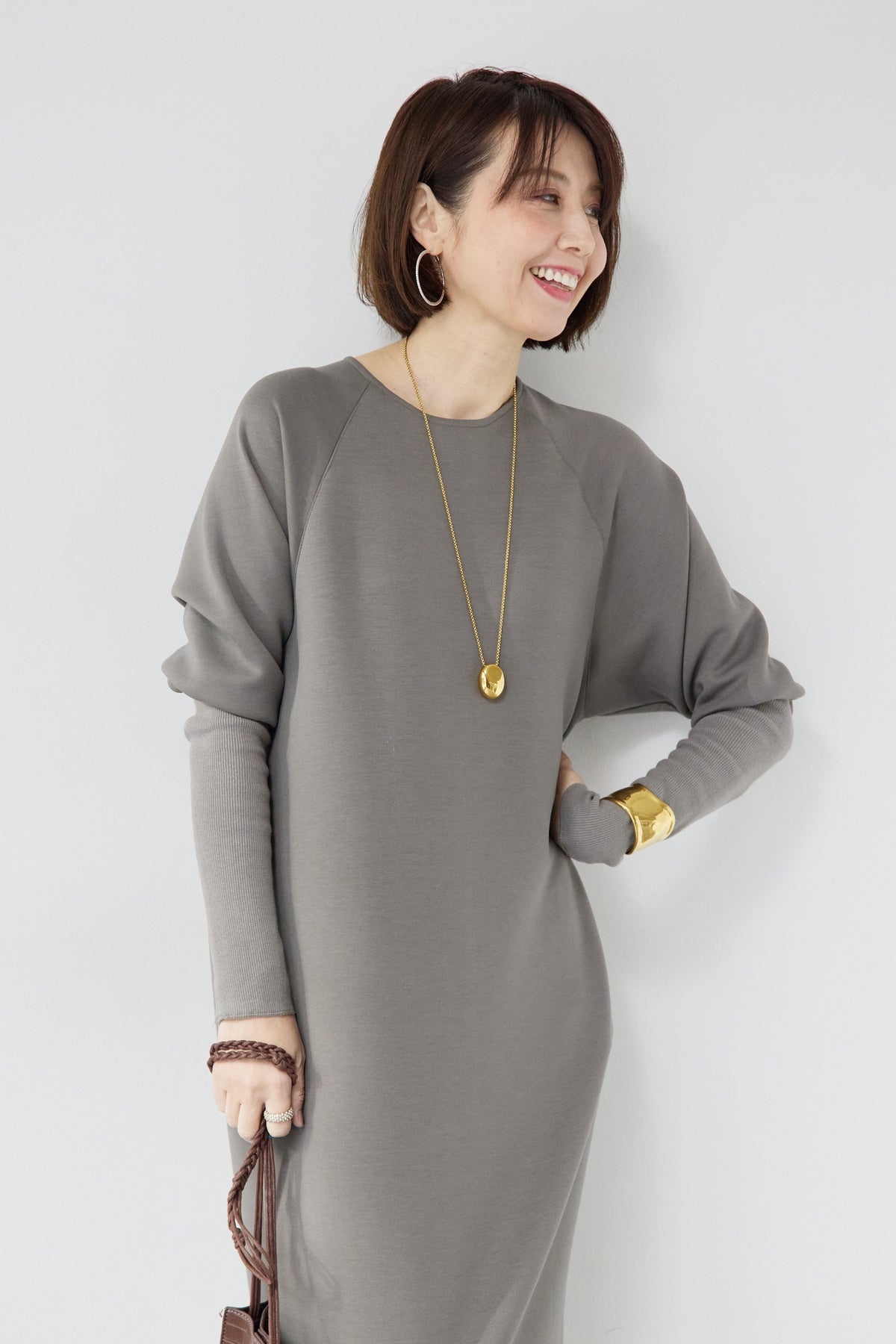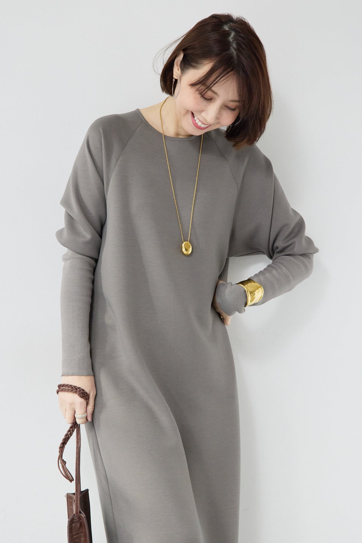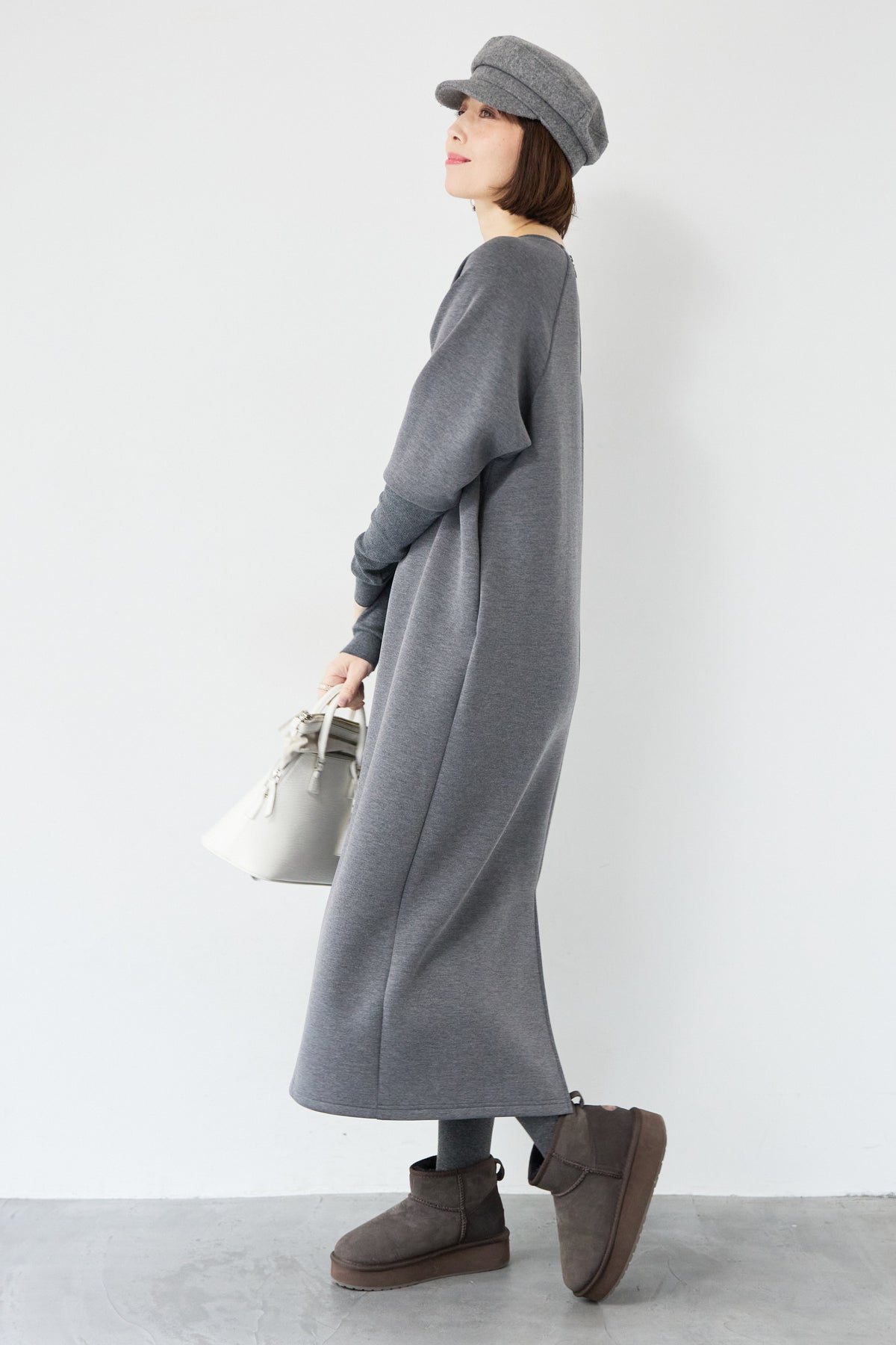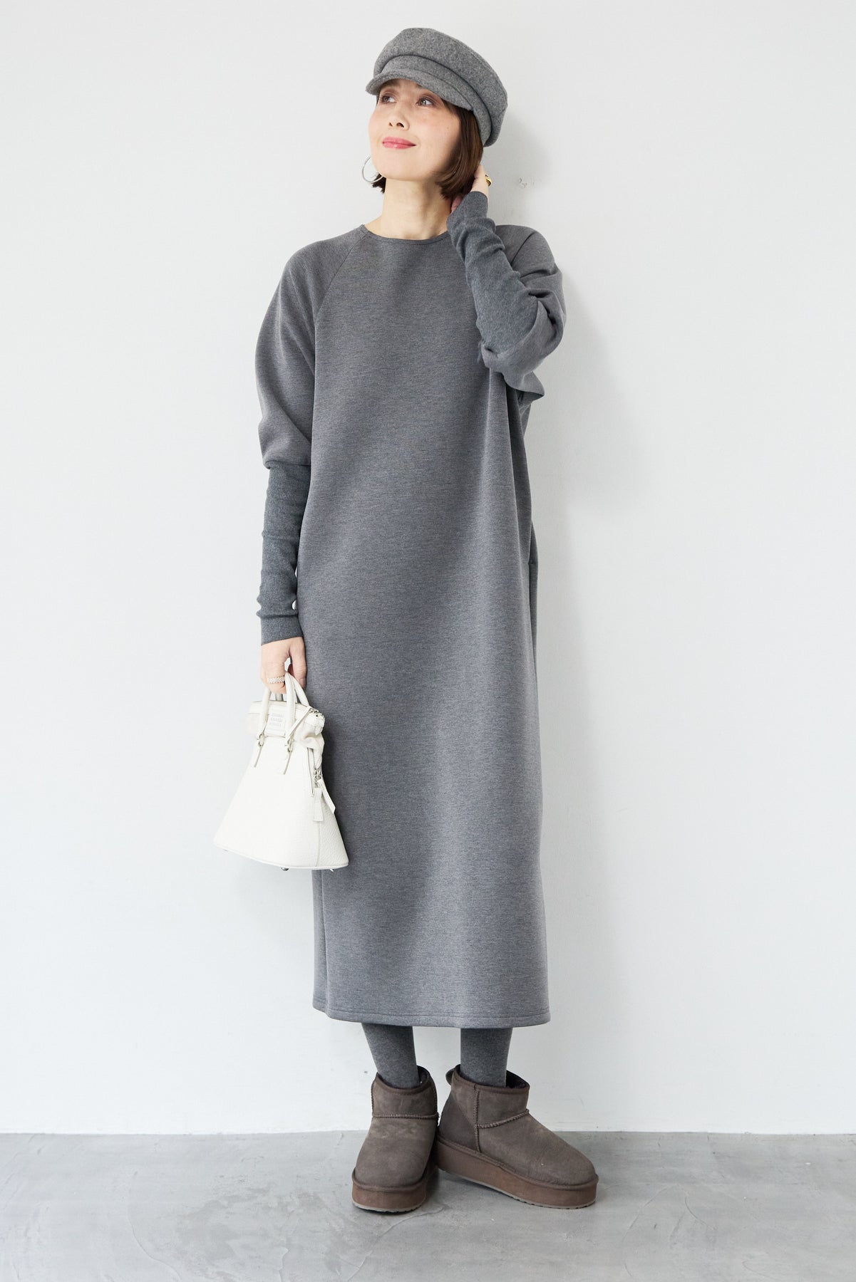 ミニマルなデザインと快適な着心地を兼ね備えた、バックジップダンボールワンピース。やや肉厚でハリのあるダンボールニット素材を使用し、シルエットを美しくキープしながらも軽やかな着用感を実現しました。シンプルなラウンドネックとラグランスリーブが、抜け感のあるリラックスした印象を演出。長めの袖丈とリブ切り替えが程よいアクセントとなり、モード感をプラスします。背面のミドル丈ファスナーは着脱をスムーズにしつつ、デザインポイントにも。バックにはスリットを配し、足さばきも快適です。両サイドにはポケット付きで実用性も◎。