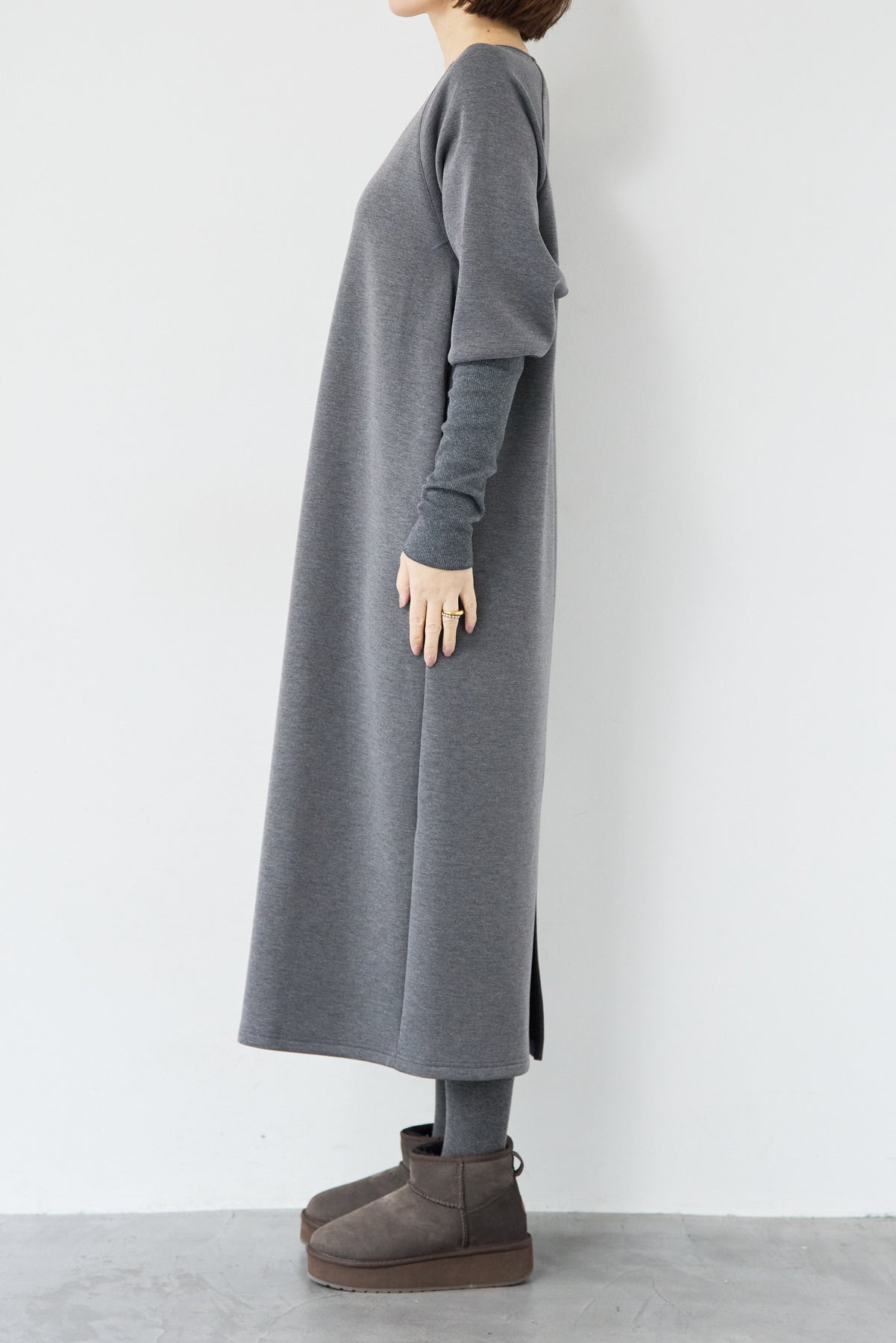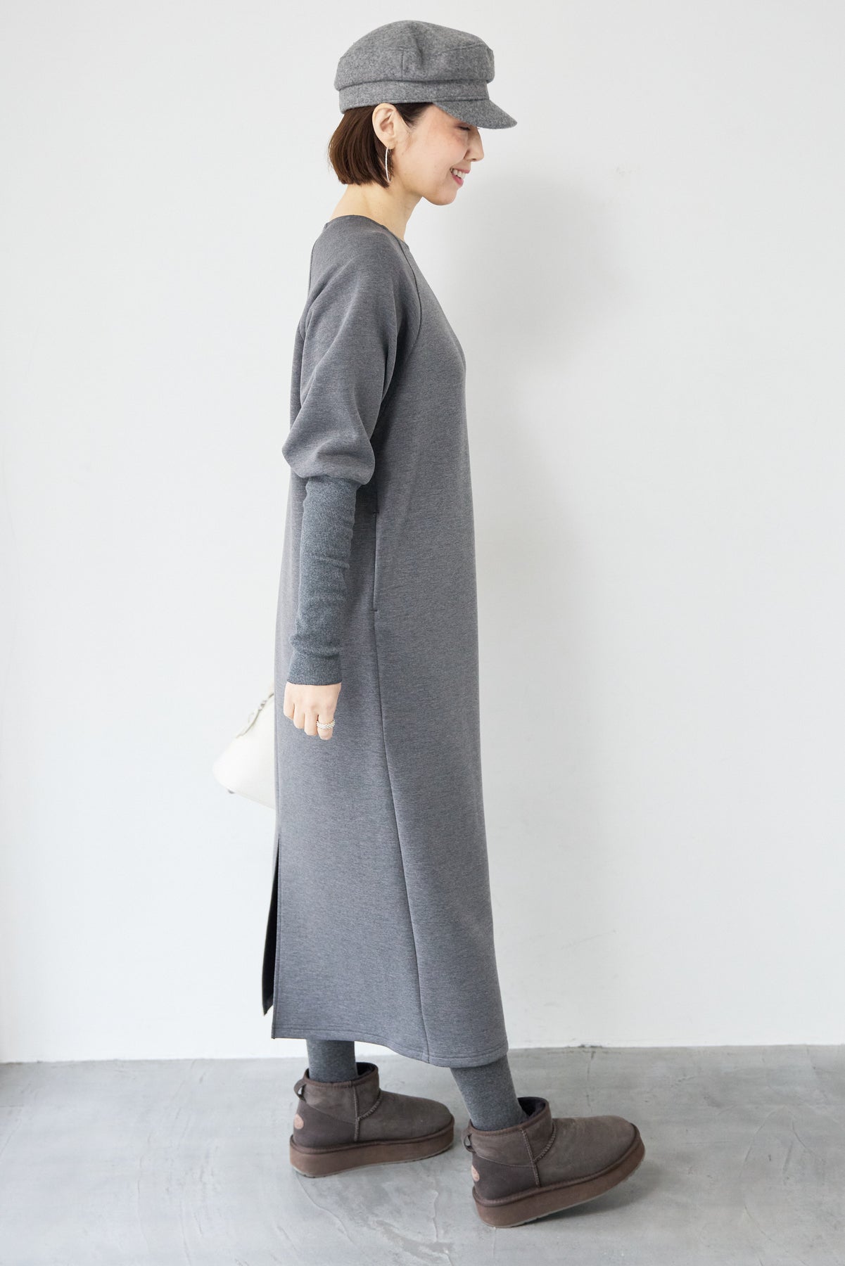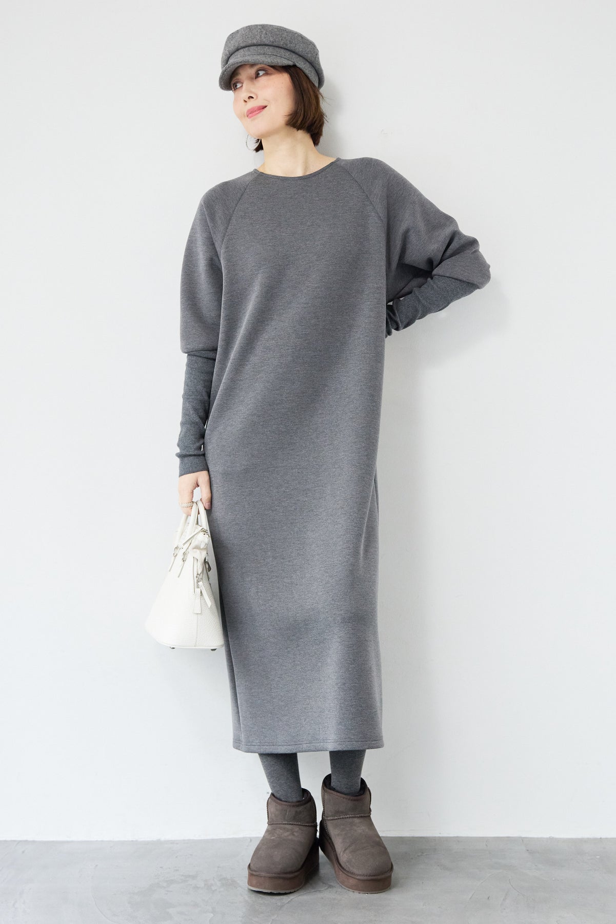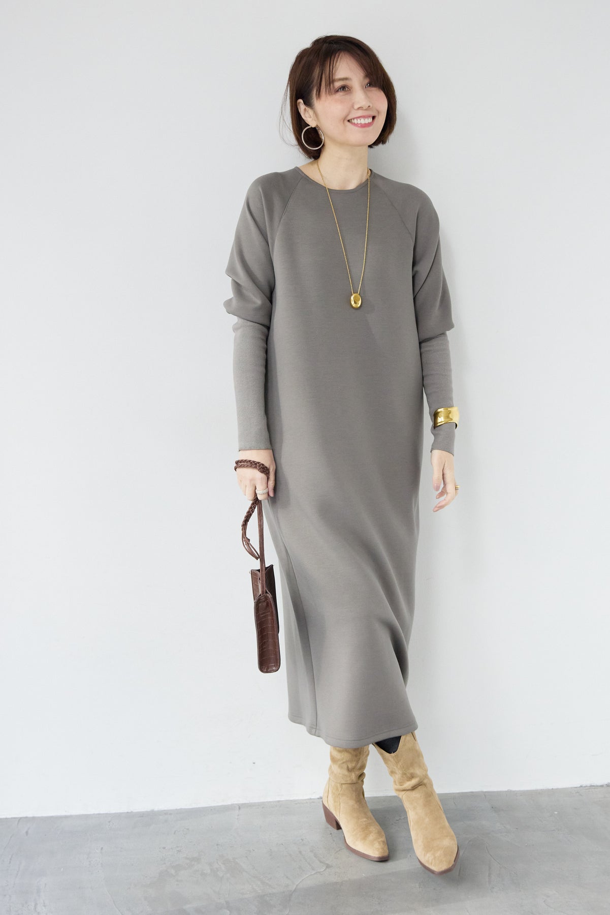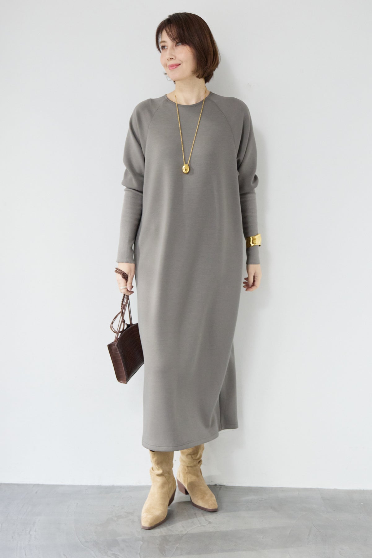 ミニマルなデザインと快適な着心地を兼ね備えた、バックジップダンボールワンピース。やや肉厚でハリのあるダンボールニット素材を使用し、シルエットを美しくキープしながらも軽やかな着用感を実現しました。シンプルなラウンドネックとラグランスリーブが、抜け感のあるリラックスした印象を演出。長めの袖丈とリブ切り替えが程よいアクセントとなり、モード感をプラスします。背面のミドル丈ファスナーは着脱をスムーズにしつつ、デザインポイントにも。バックにはスリットを配し、足さばきも快適です。両サイドにはポケット付きで実用性も◎。
