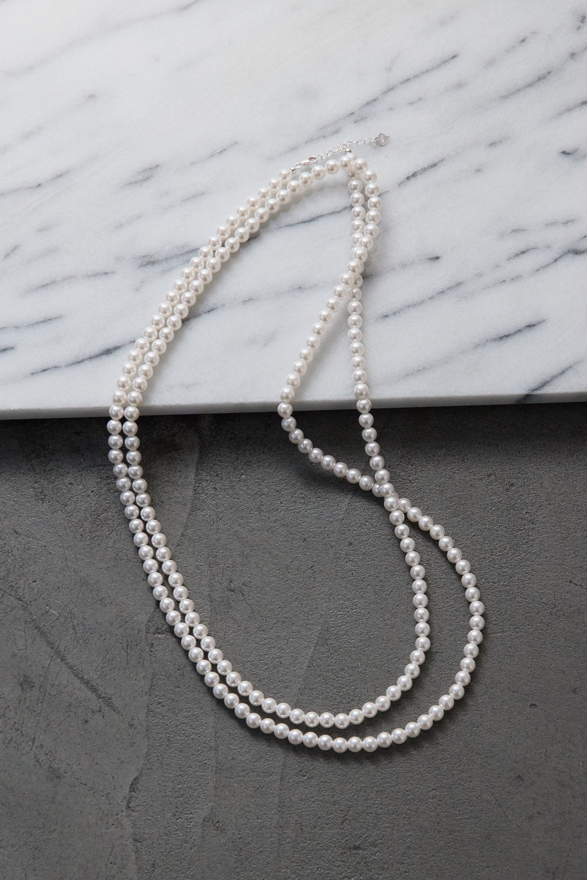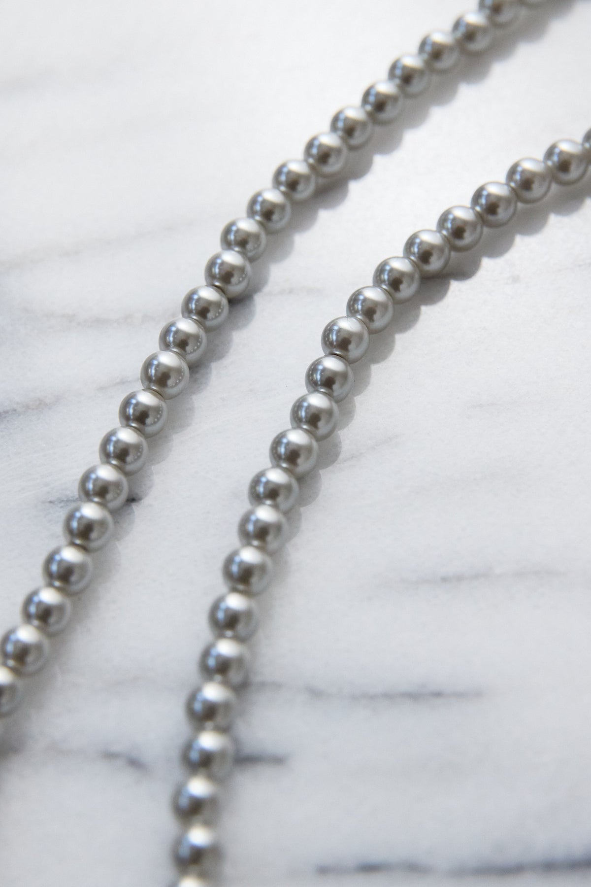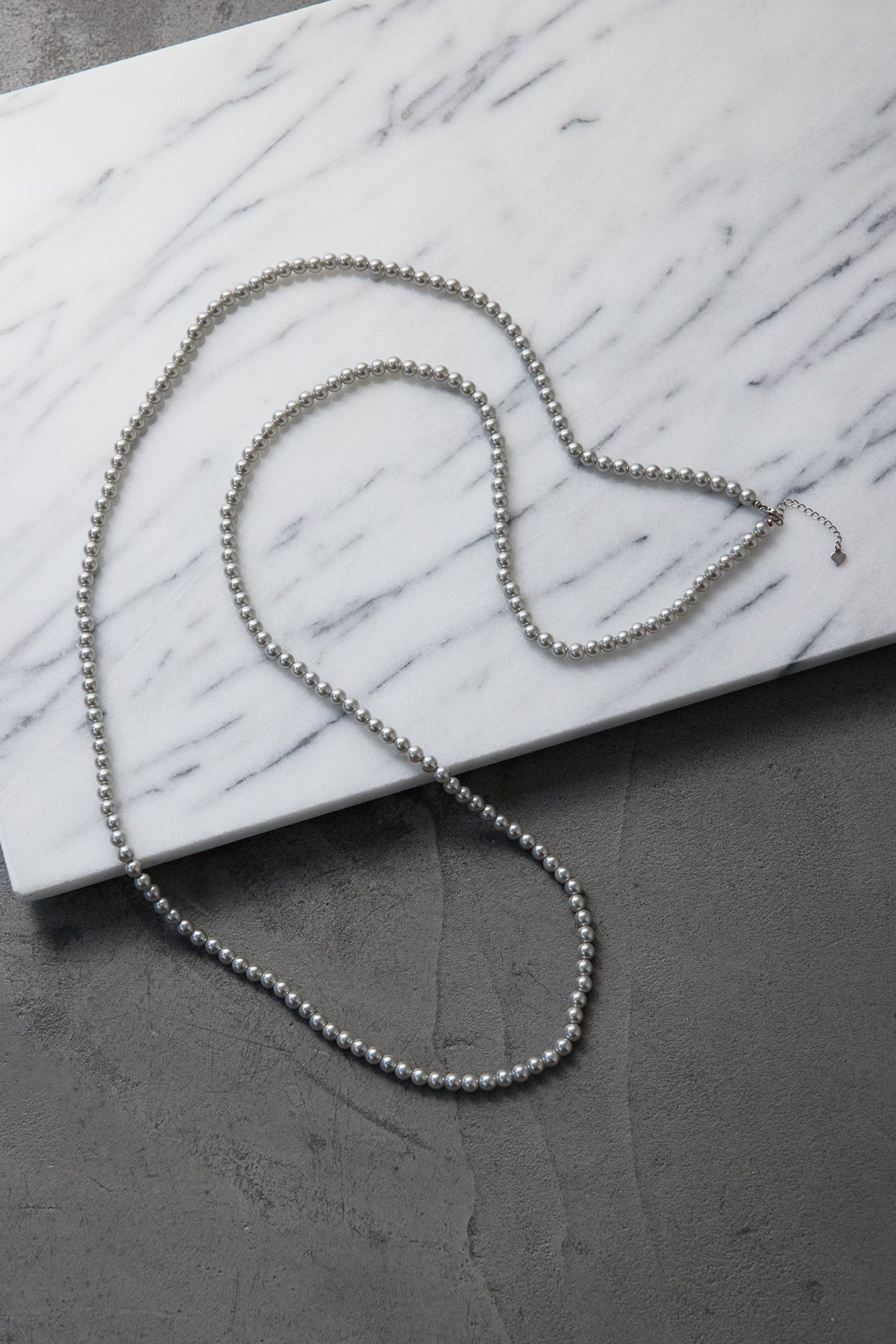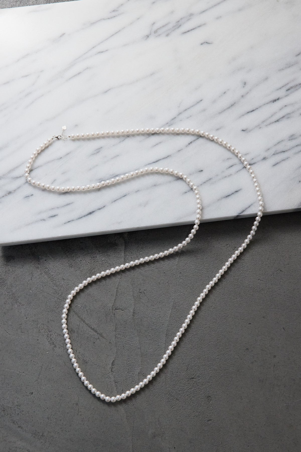 シンプルながらも上品な存在感を放つ、ロングパールネックレス。小粒で均一に連なるパールが、動くたびに柔らかな光をまとい、首元を上品に彩ります。長めのレングスは、1連でもすっきりと、2連にすると華やかさが増し、アレンジ次第で表情が変わるのも魅力。シンプルなトップスに合わせるだけでスタイルに奥行きが生まれ、フォーマルからデイリーまで幅広く活躍します。軽やかで扱いやすい素材を使用しており、長時間の着用でもストレスのない快適な付け心地。エンドには小さなハートのチャームを添え、さりげない女性らしさをプラスしました。 1本持っているだけでコーディネートの幅がぐっと広がる、万能パールアクセサリーです。