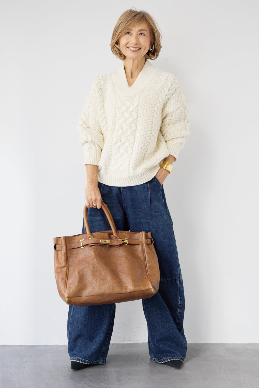 Vネックケーブルニット