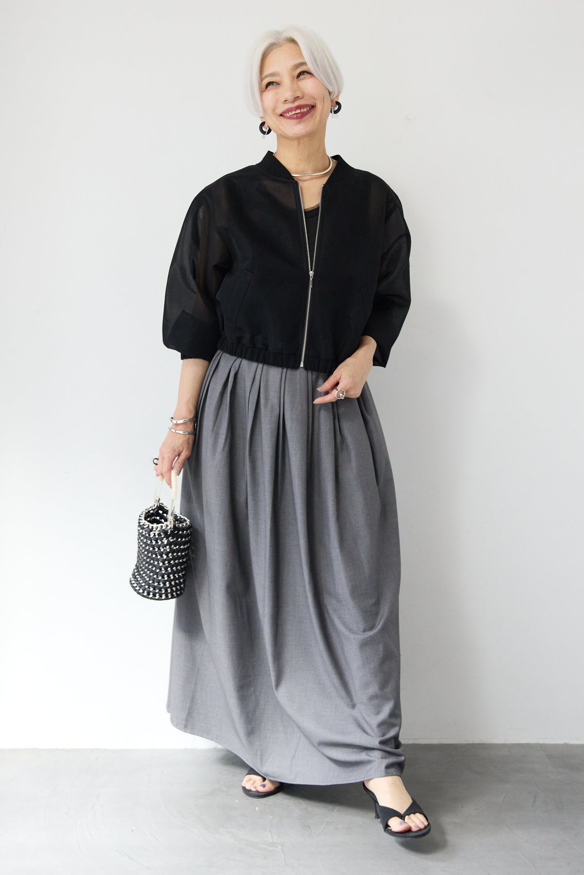 ウエストにたっぷりとタックを施し、ふんわりと広がるシルエットが魅力のフレアスカート。動くたびに美しく揺れるボリューム感が、上品で女性らしい印象を演出します。フロントはすっきりと見せつつ、バックウエストはゴム仕様で快適な穿き心地を実現。きちんと感がありながらもリラックスして着用できるデザインです。両サイドには便利なポケット付きで、実用性も兼ね備えています。落ち着いた表情の素材感は、きれいめにもカジュアルにもマッチ。コンパクトなトップスをインしたスタイリングはもちろん、ゆったりとしたニットやカットソーとも好相性です。デイリーからお出かけシーンまで幅広く活躍する、着回し力の高い一着です。