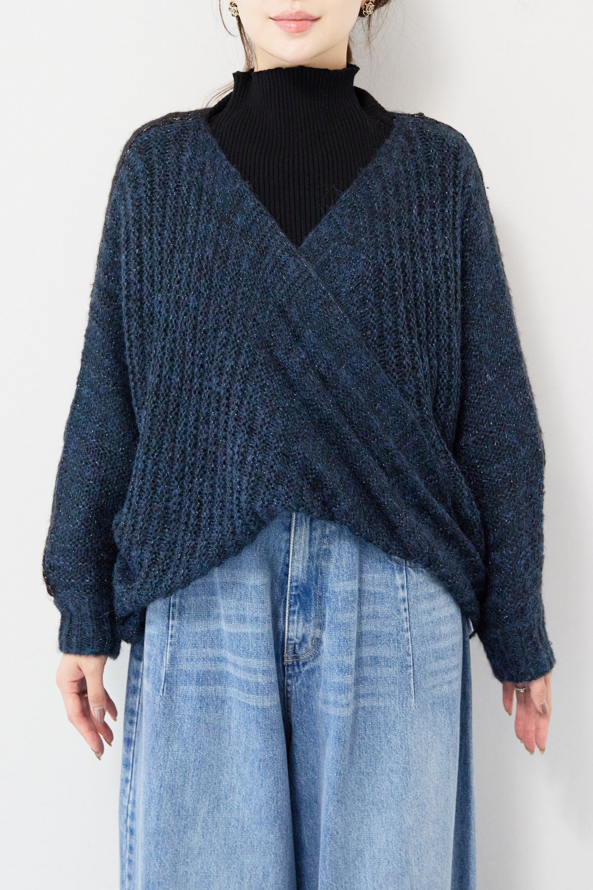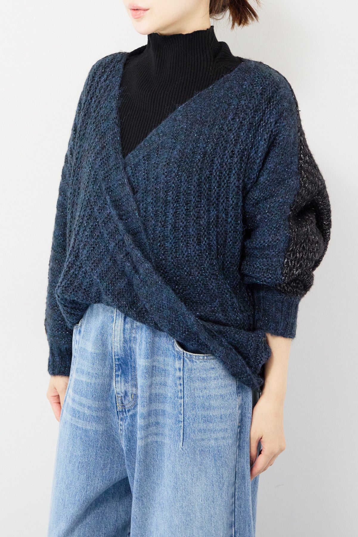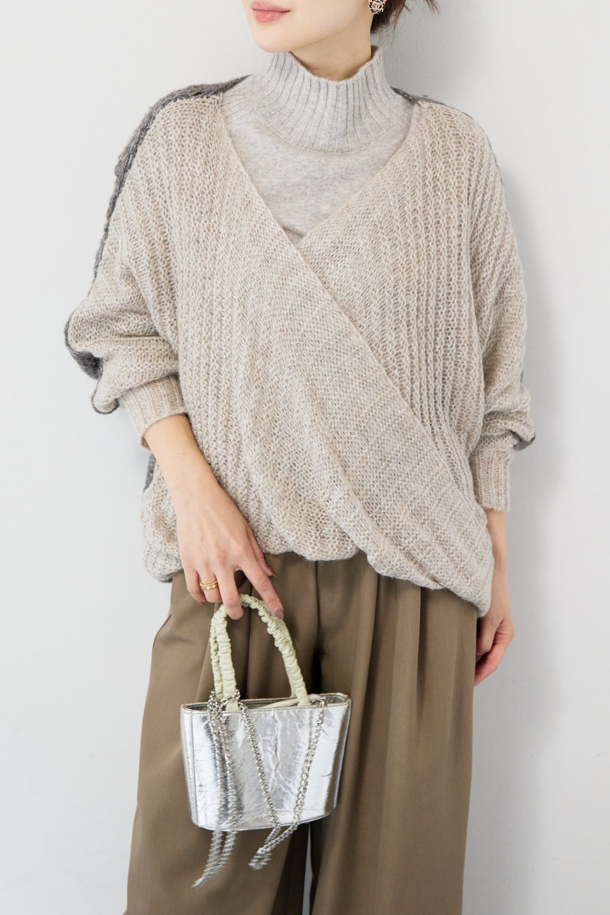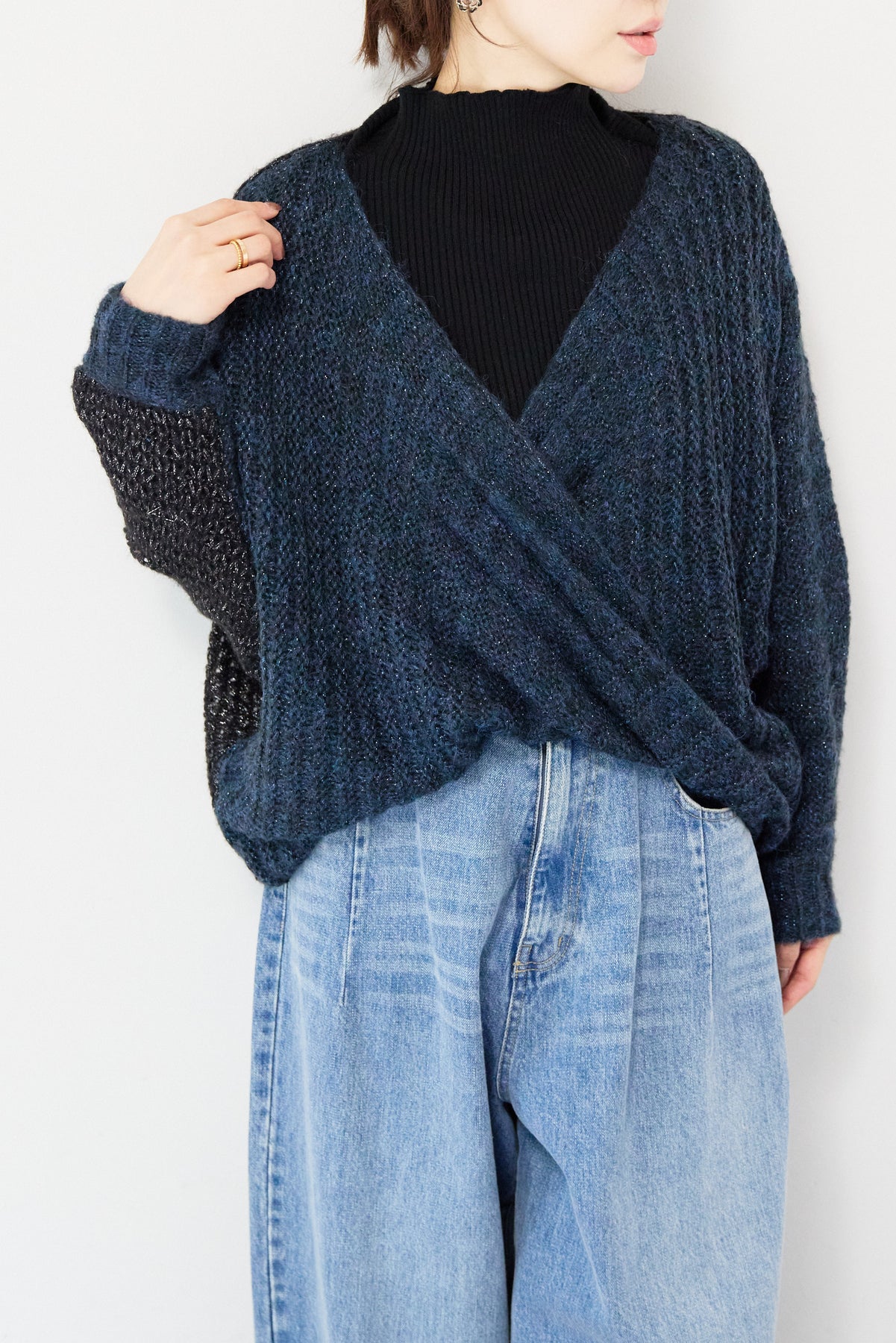 柔らかなモヘヤ混素材に繊細なラメ糸を編み込み、ふんわりとした表情とほのかなきらめきをまとったカシュクールニット。前後で編地とカラーを切り替えたバイカラーデザインが、シンプルな着こなしにも奥行きと抜け感をプラスします。ゆるやかなカシュクールラインが体を立体的に包み込み、IN にタートルやカットソーを合わせるだけで洗練されたレイヤードが完成。軽さと暖かさを兼ね備え、秋冬の主役ニットとして活躍する一枚です。