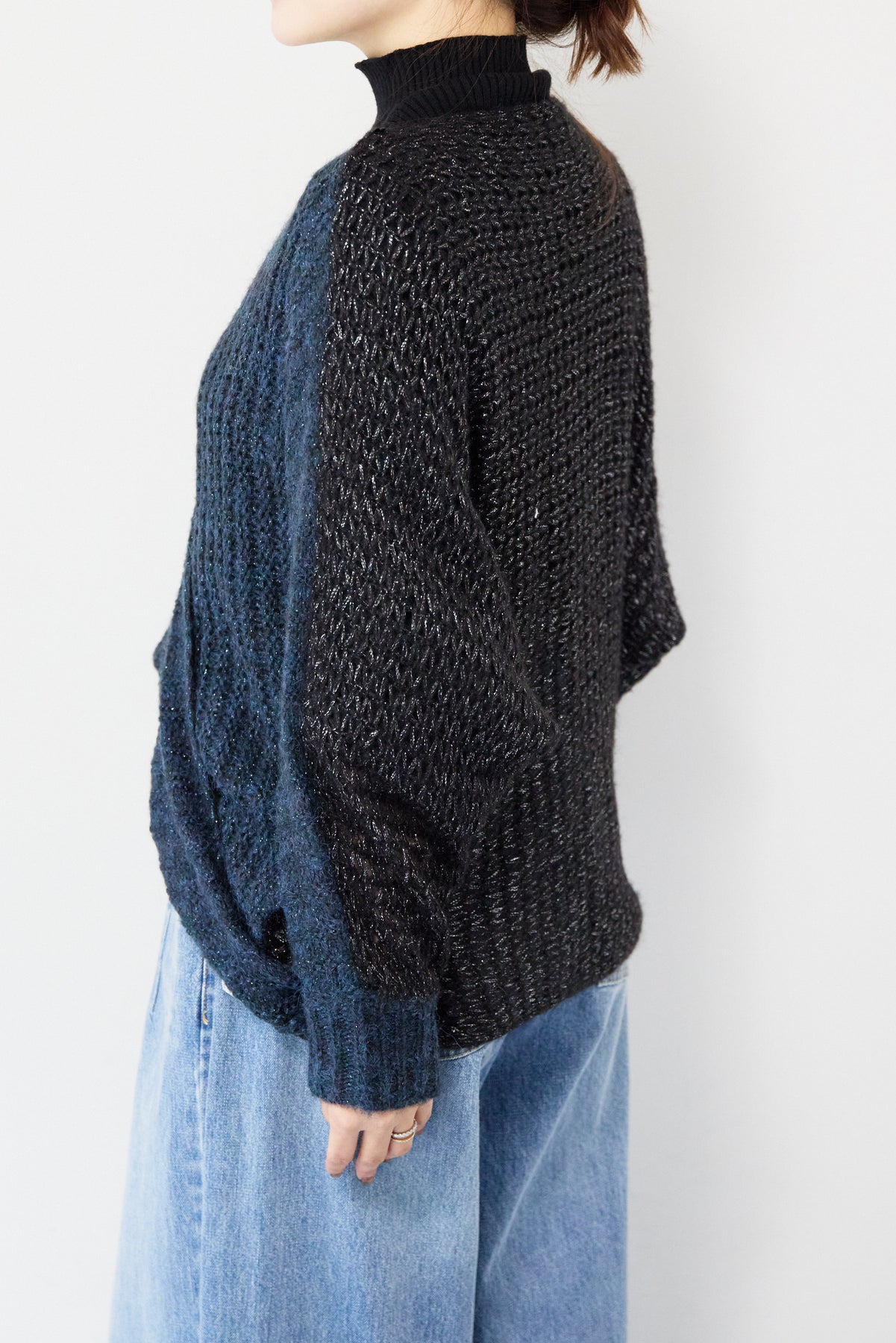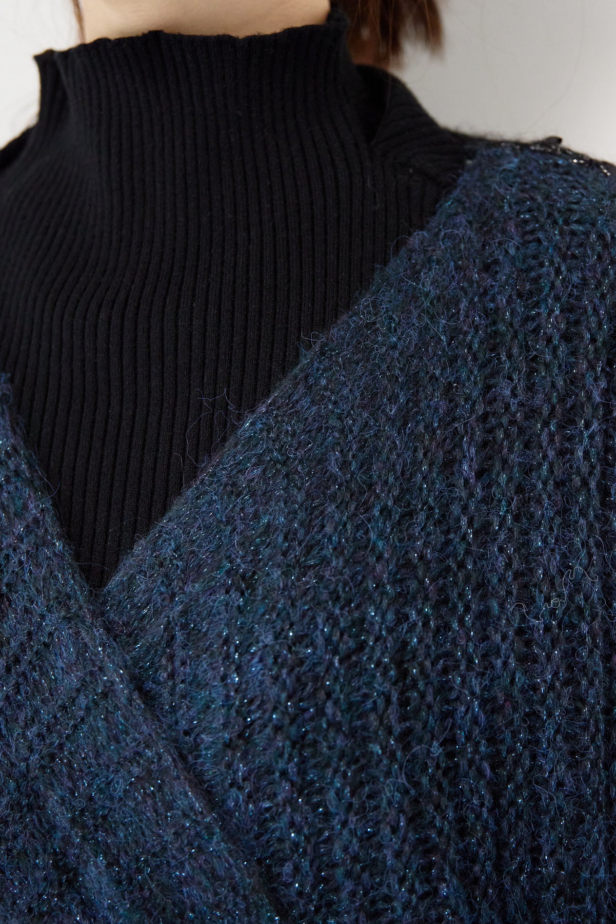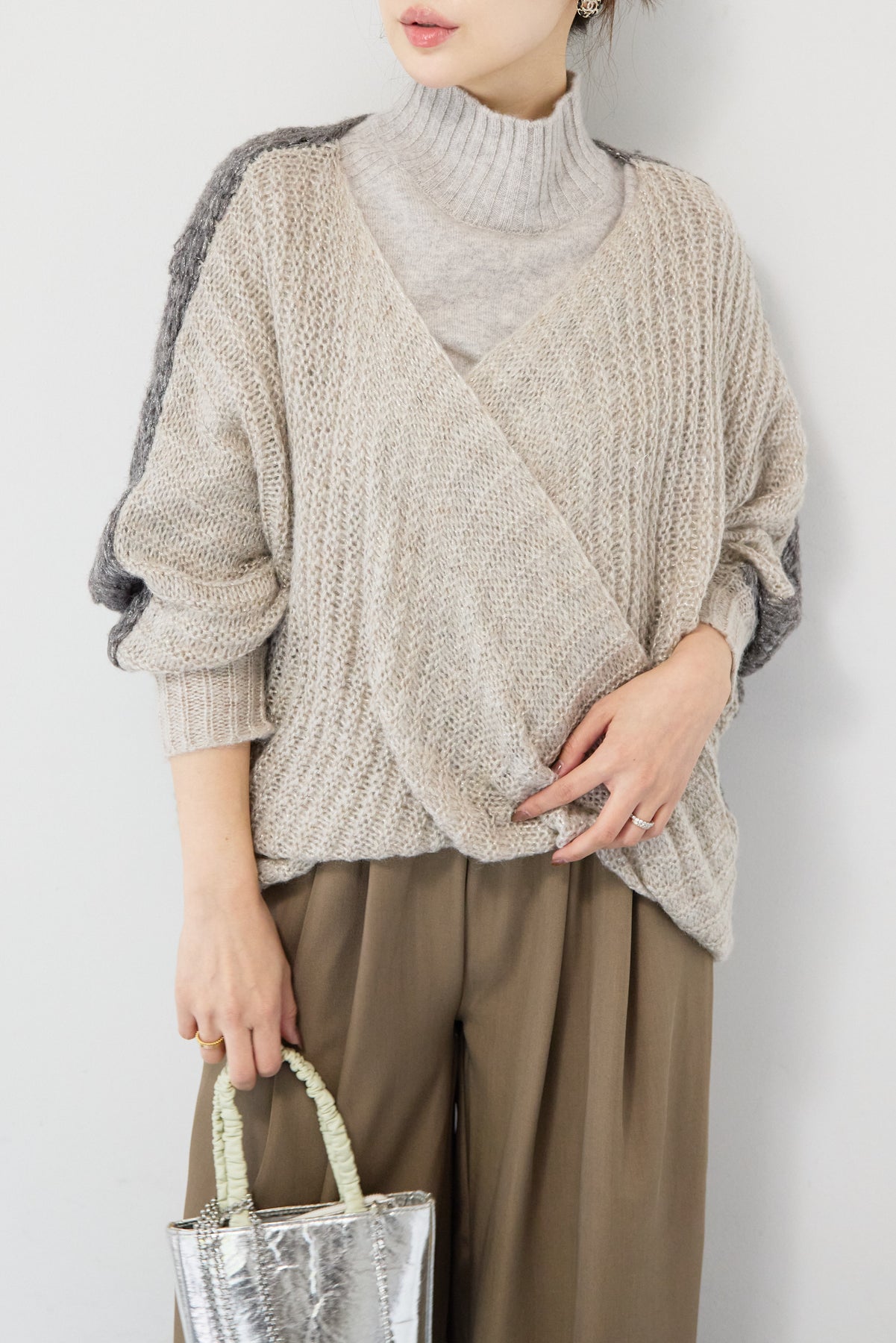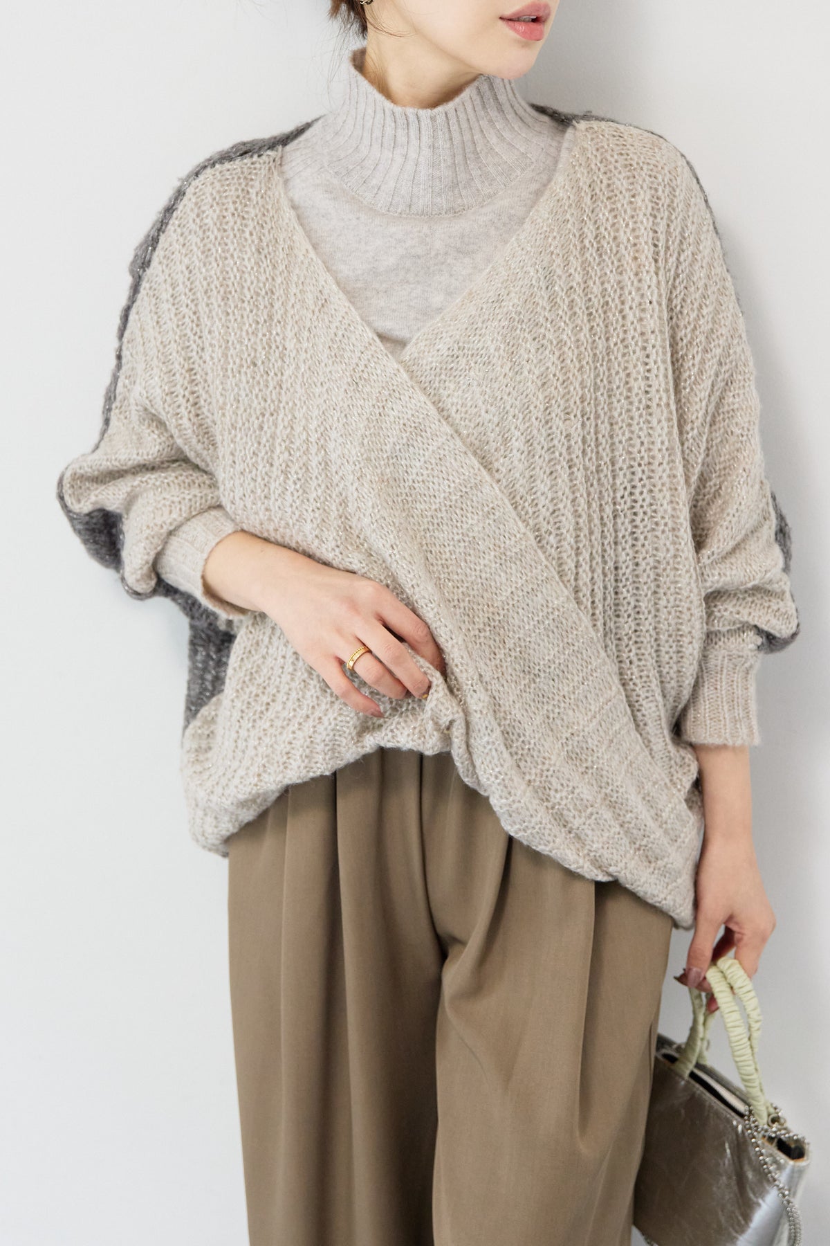 柔らかなモヘヤ混素材に繊細なラメ糸を編み込み、ふんわりとした表情とほのかなきらめきをまとったカシュクールニット。前後で編地とカラーを切り替えたバイカラーデザインが、シンプルな着こなしにも奥行きと抜け感をプラスします。ゆるやかなカシュクールラインが体を立体的に包み込み、IN にタートルやカットソーを合わせるだけで洗練されたレイヤードが完成。軽さと暖かさを兼ね備え、秋冬の主役ニットとして活躍する一枚です。
