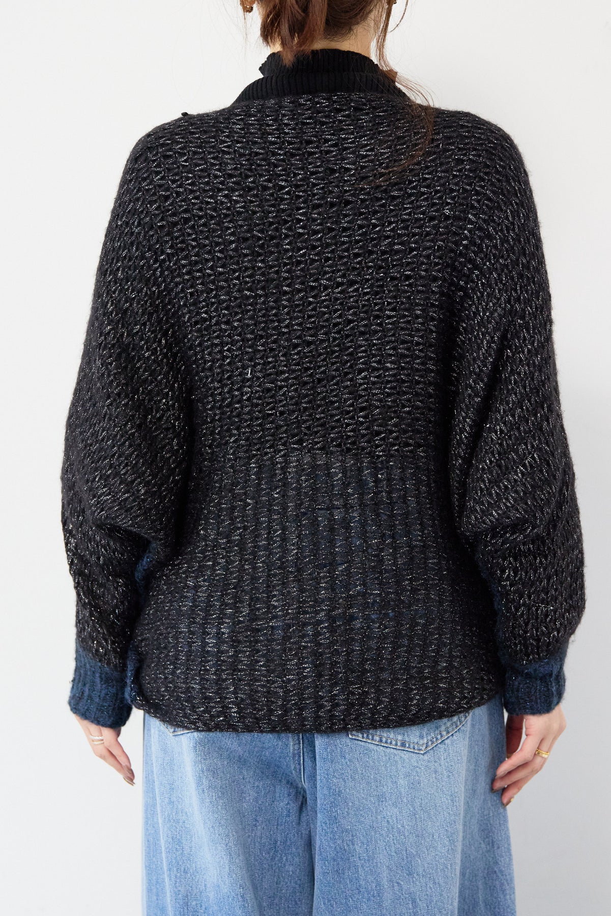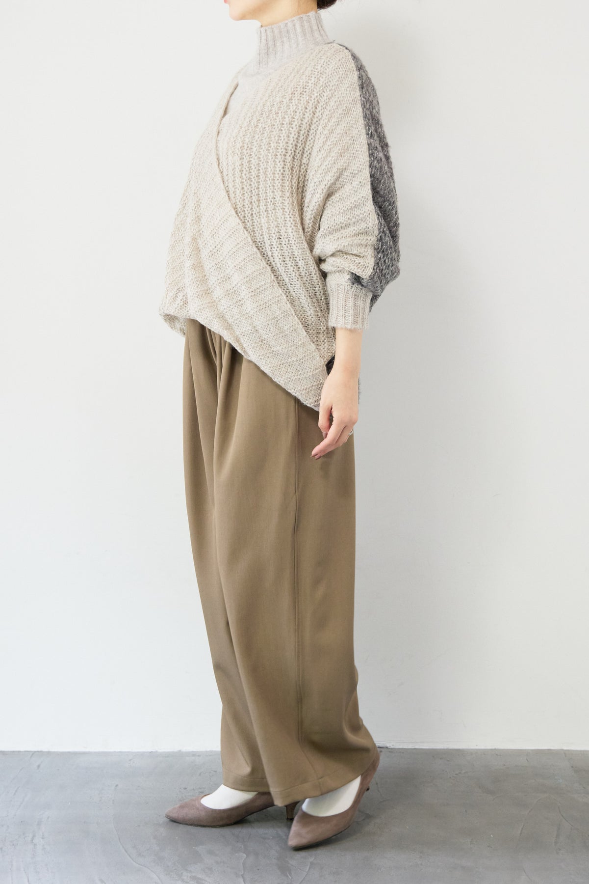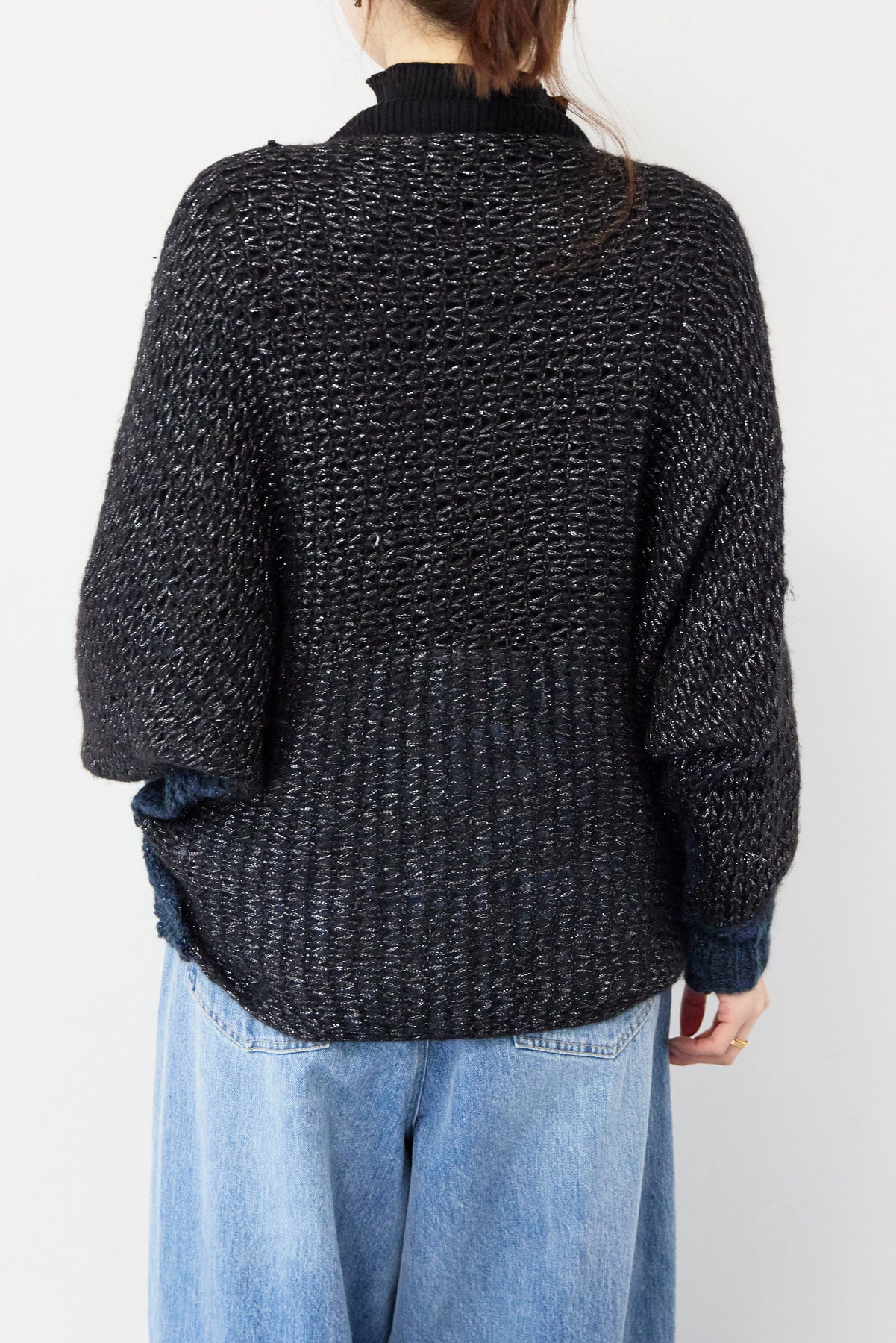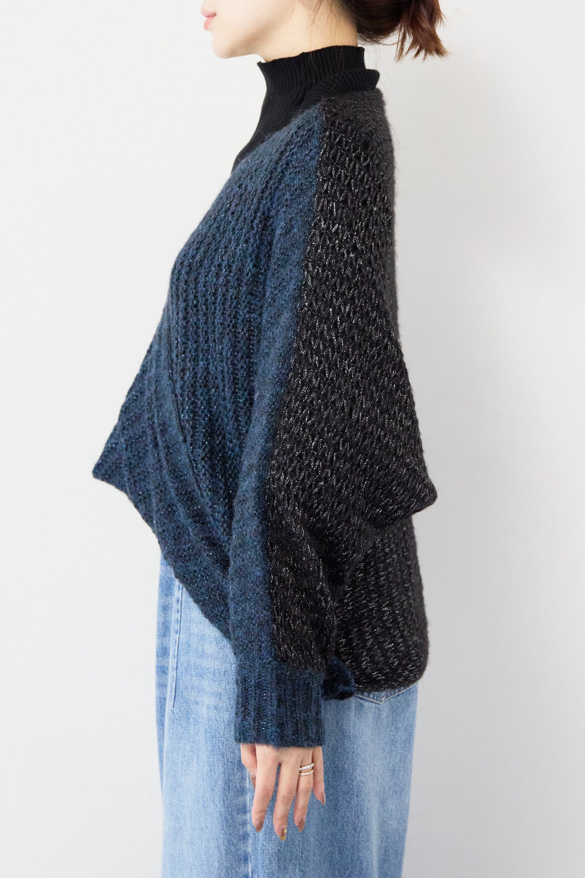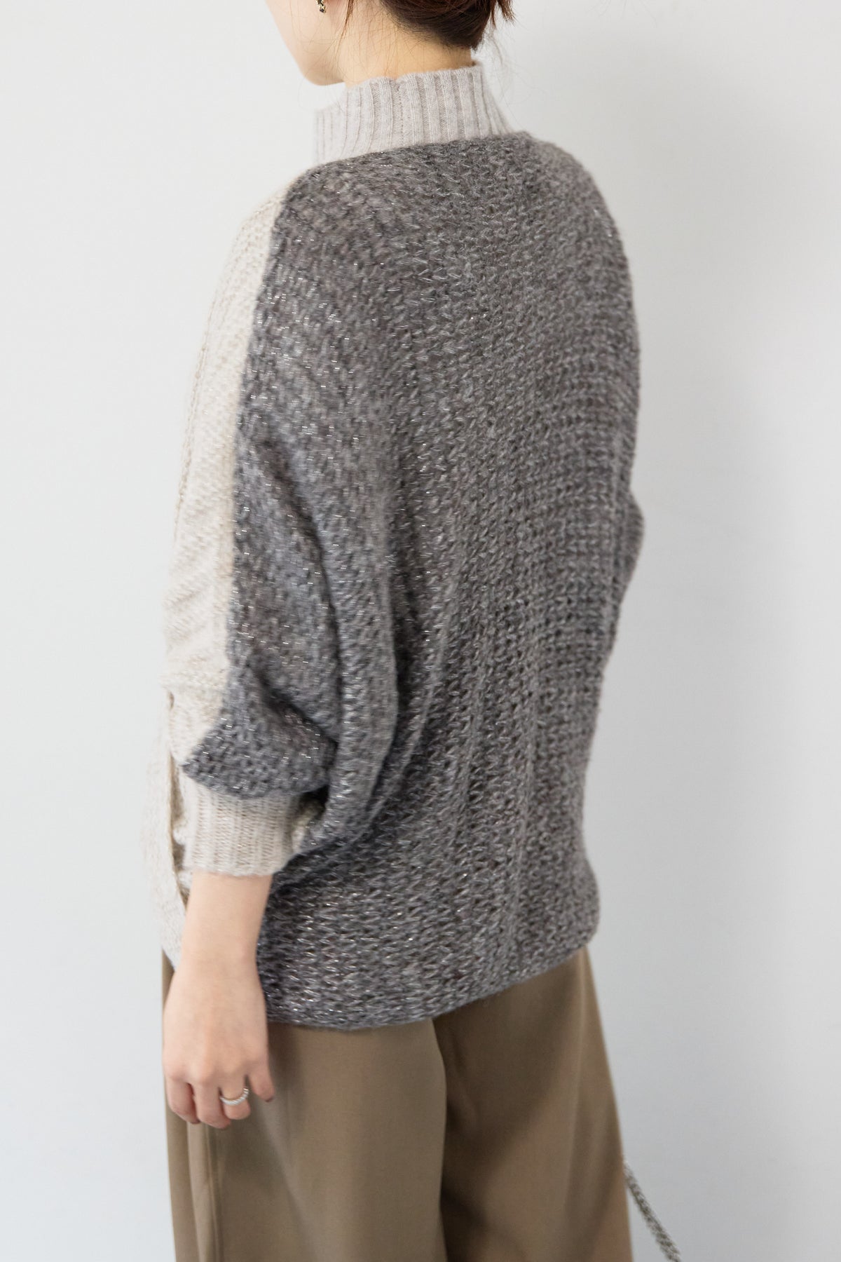 柔らかなモヘヤ混素材に繊細なラメ糸を編み込み、ふんわりとした表情とほのかなきらめきをまとったカシュクールニット。前後で編地とカラーを切り替えたバイカラーデザインが、シンプルな着こなしにも奥行きと抜け感をプラスします。ゆるやかなカシュクールラインが体を立体的に包み込み、IN にタートルやカットソーを合わせるだけで洗練されたレイヤードが完成。軽さと暖かさを兼ね備え、秋冬の主役ニットとして活躍する一枚です。