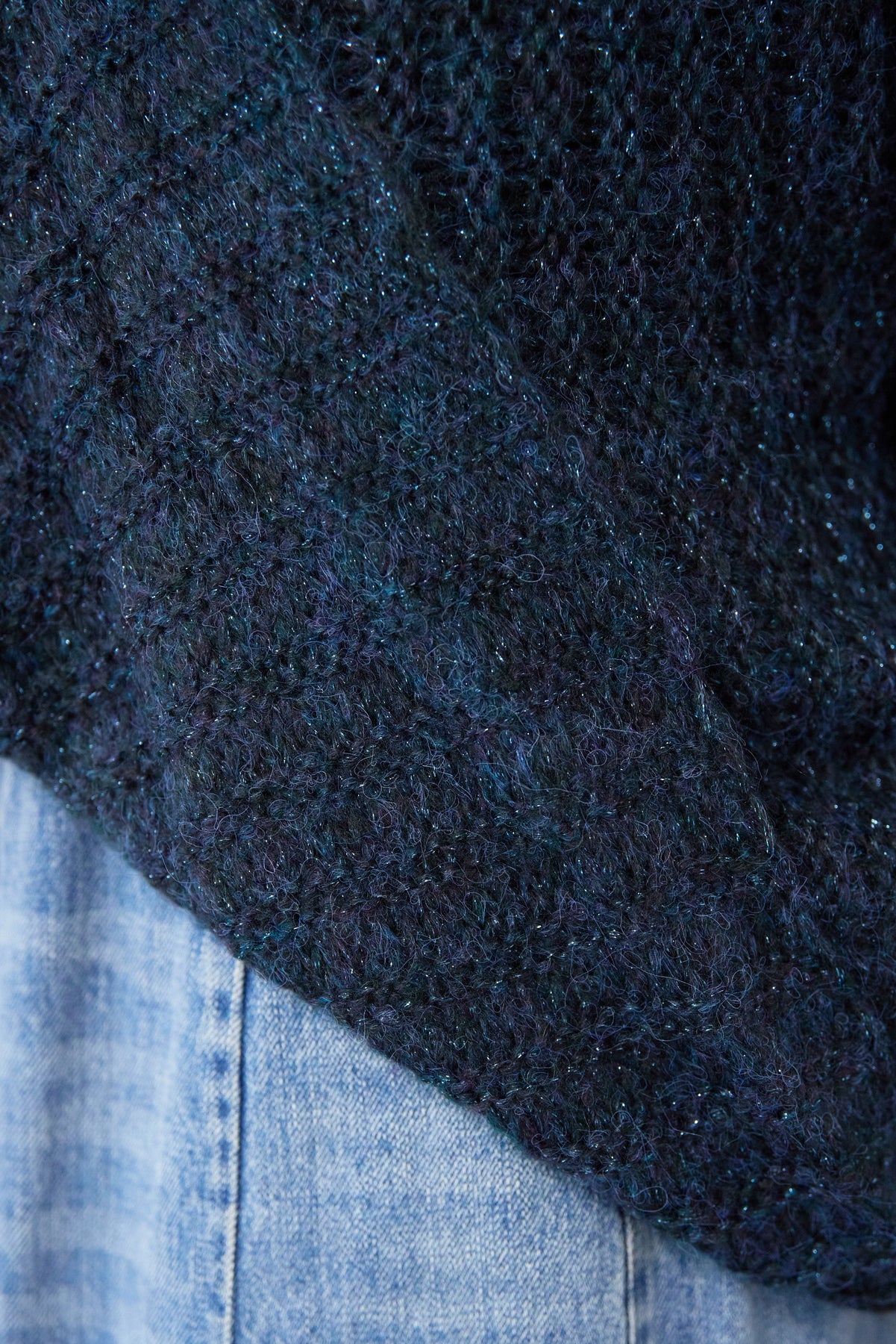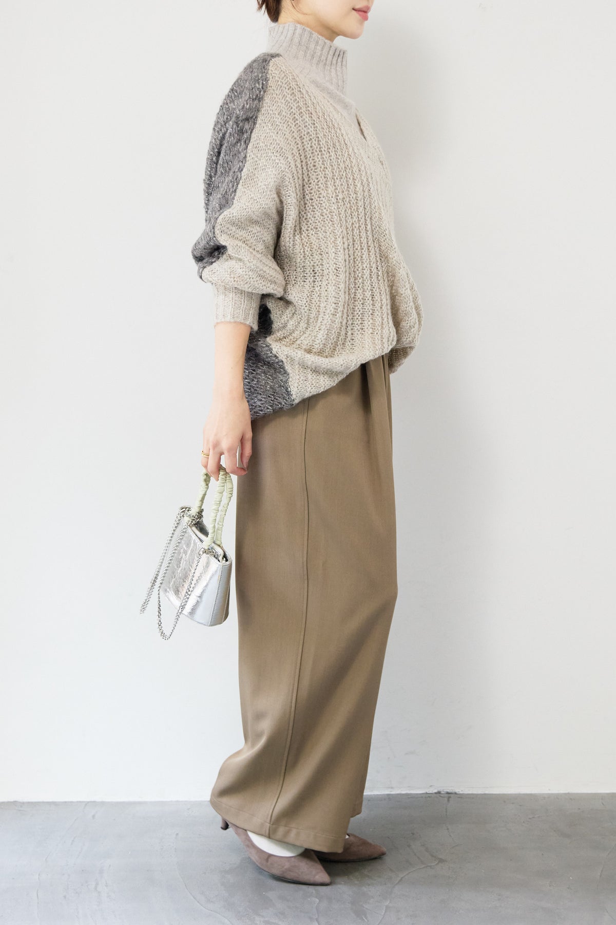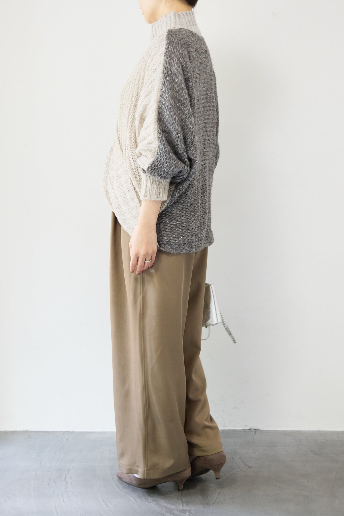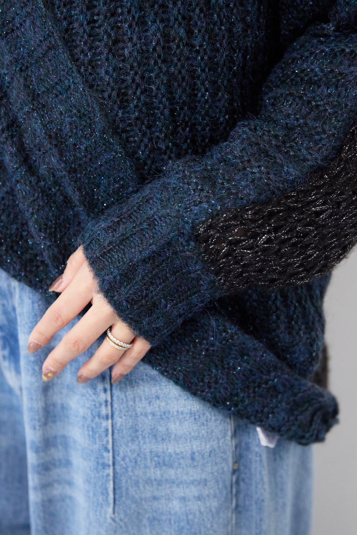 柔らかなモヘヤ混素材に繊細なラメ糸を編み込み、ふんわりとした表情とほのかなきらめきをまとったカシュクールニット。前後で編地とカラーを切り替えたバイカラーデザインが、シンプルな着こなしにも奥行きと抜け感をプラスします。ゆるやかなカシュクールラインが体を立体的に包み込み、IN にタートルやカットソーを合わせるだけで洗練されたレイヤードが完成。軽さと暖かさを兼ね備え、秋冬の主役ニットとして活躍する一枚です。