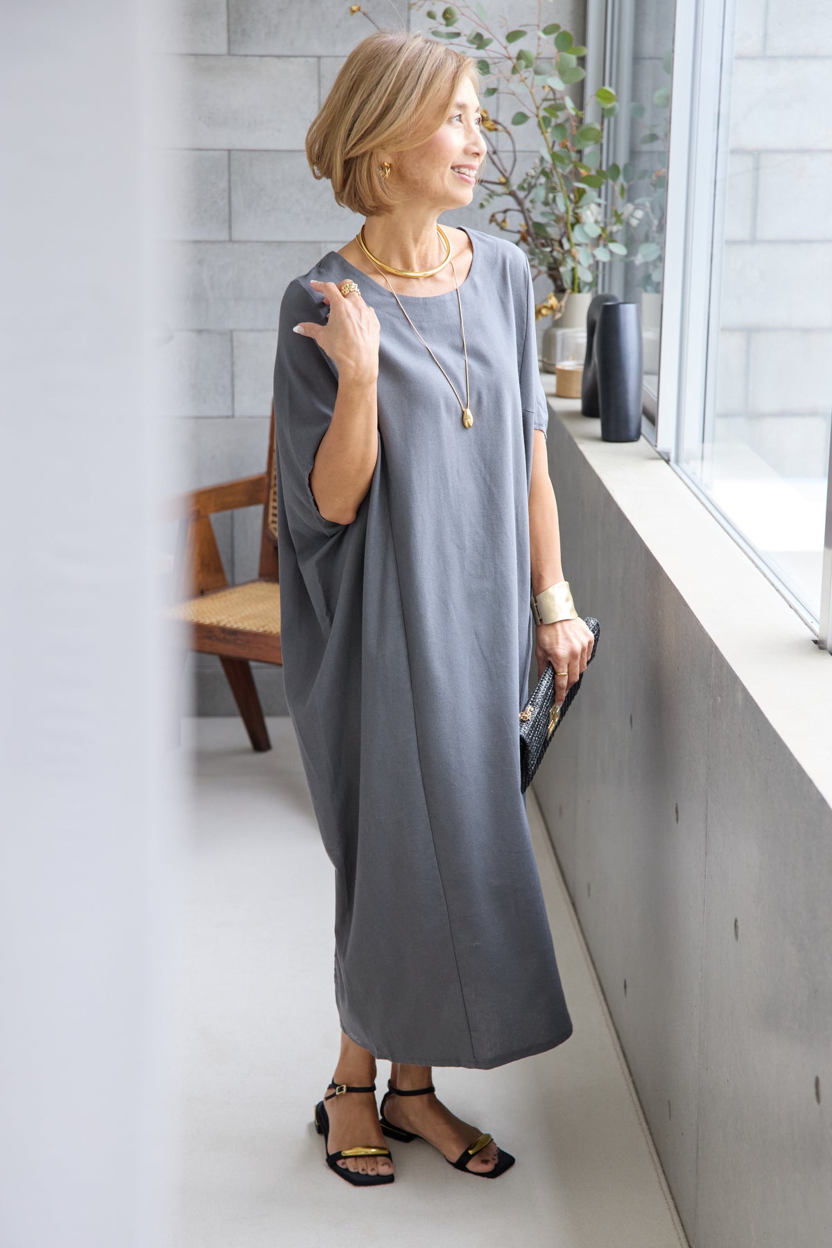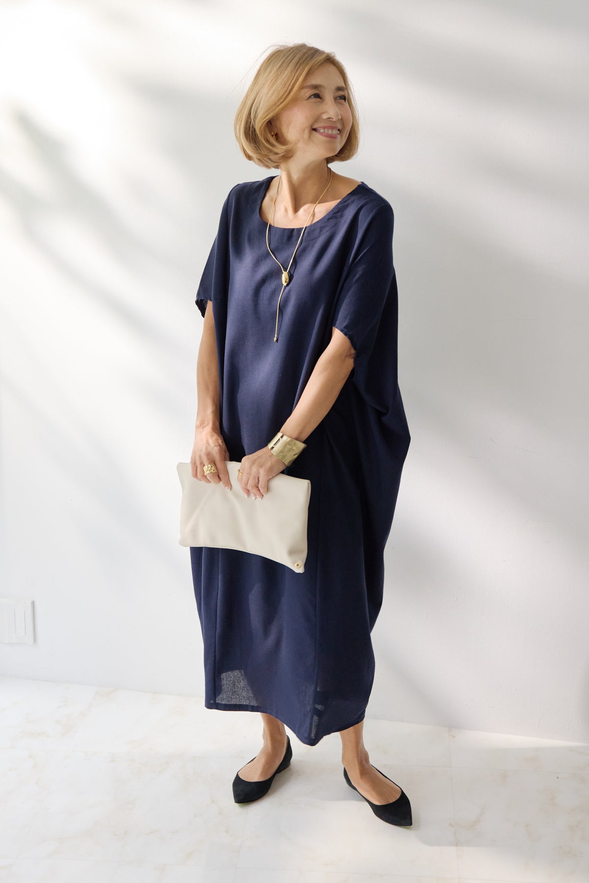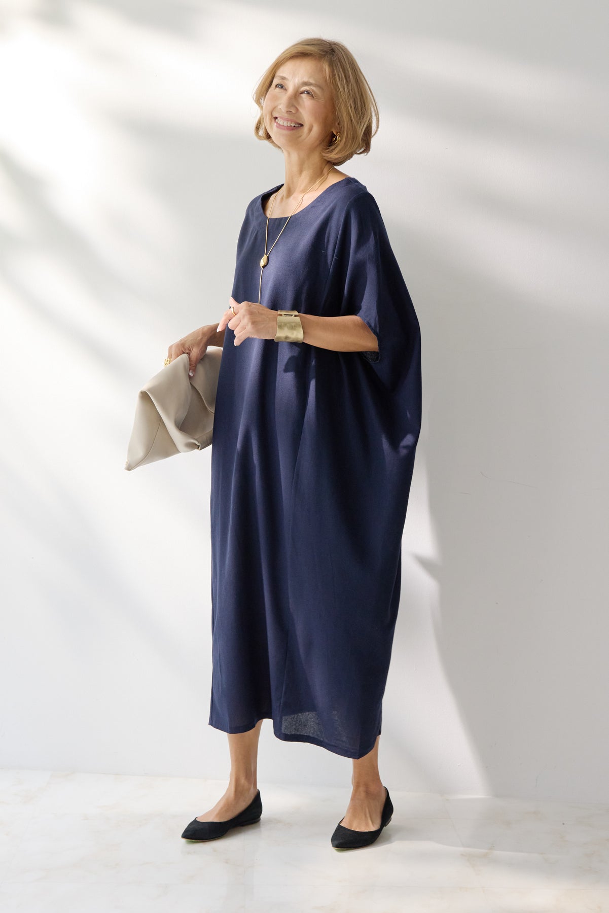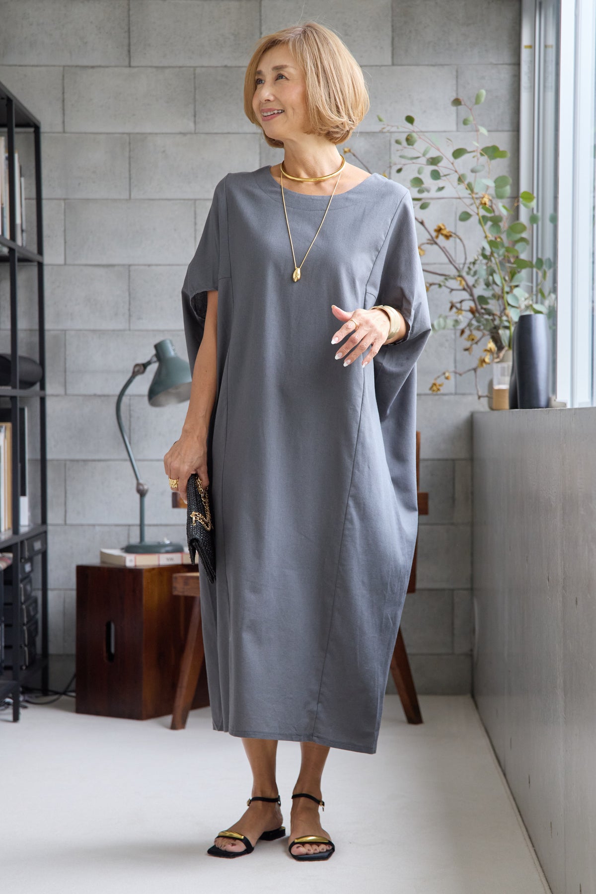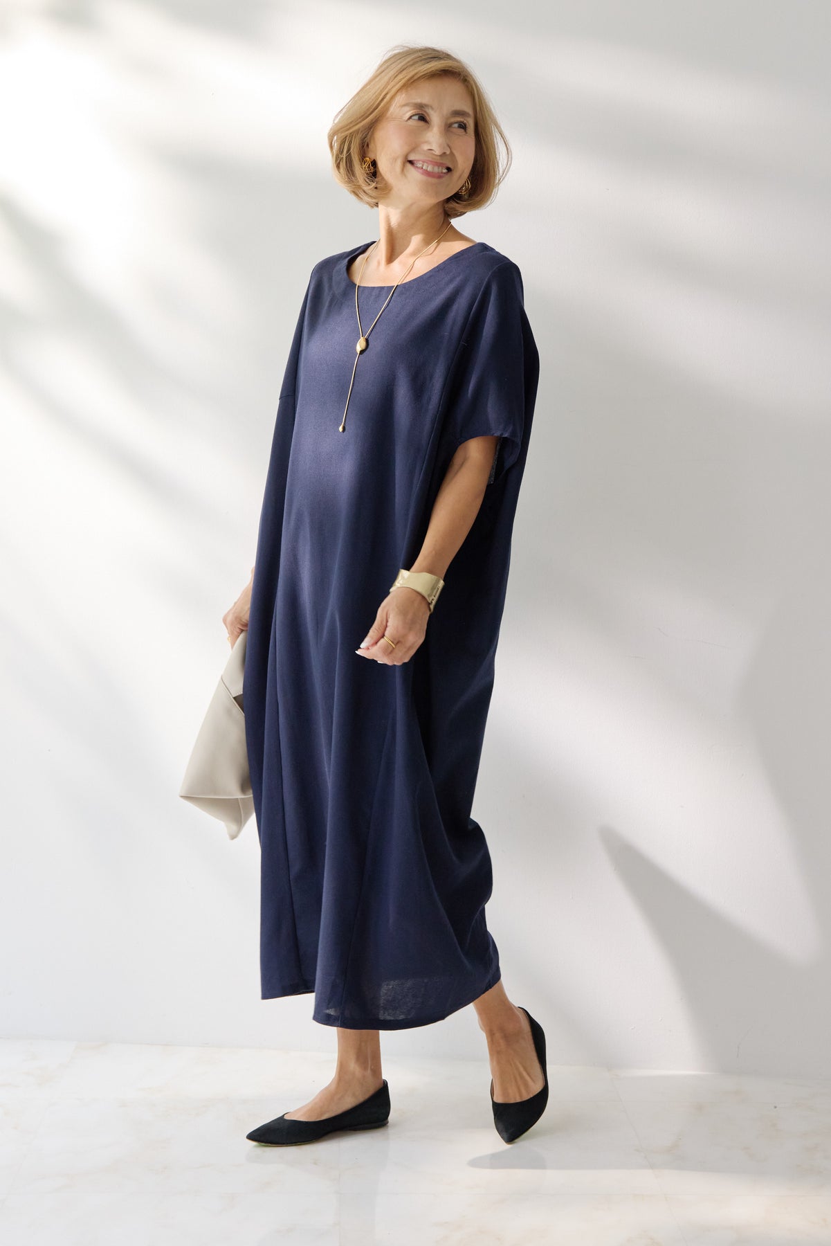 やわらかな丸みを描くコクーンシルエットが印象的な、リネン素材のロングワンピース。身体のラインを拾いにくいゆったりとしたフォルムながら、落ち感のある生地がすっきりとした縦ラインを演出し、リラックス感と上品さを両立します。首元は開きすぎないボートネックでデコルテをきれいに見せ、肩まわりをやさしく覆う袖デザインが腕まわりをさりげなくカバー。脇線を前に振った立体的な切替とコクーンラインが、シンプルながらニュアンスのあるシルエットを生み出しています。通気性に優れたリネン素材はさらりとした肌触りで、暑い季節も快適な着心地です。