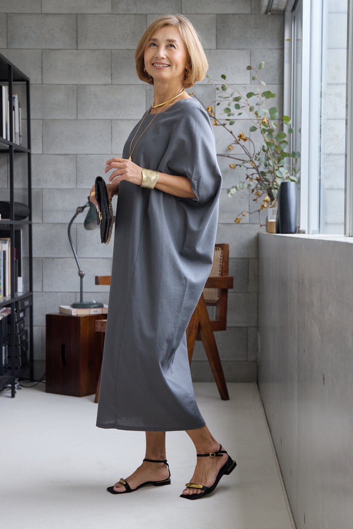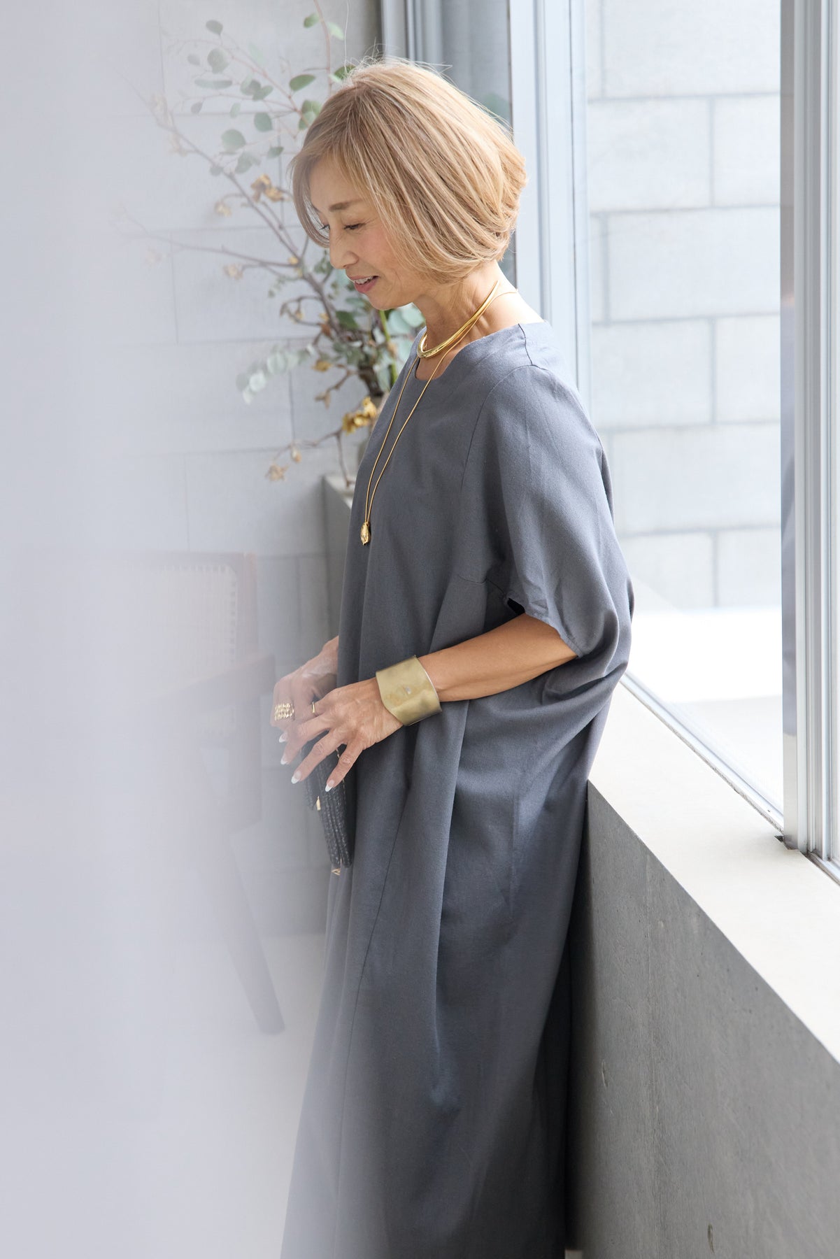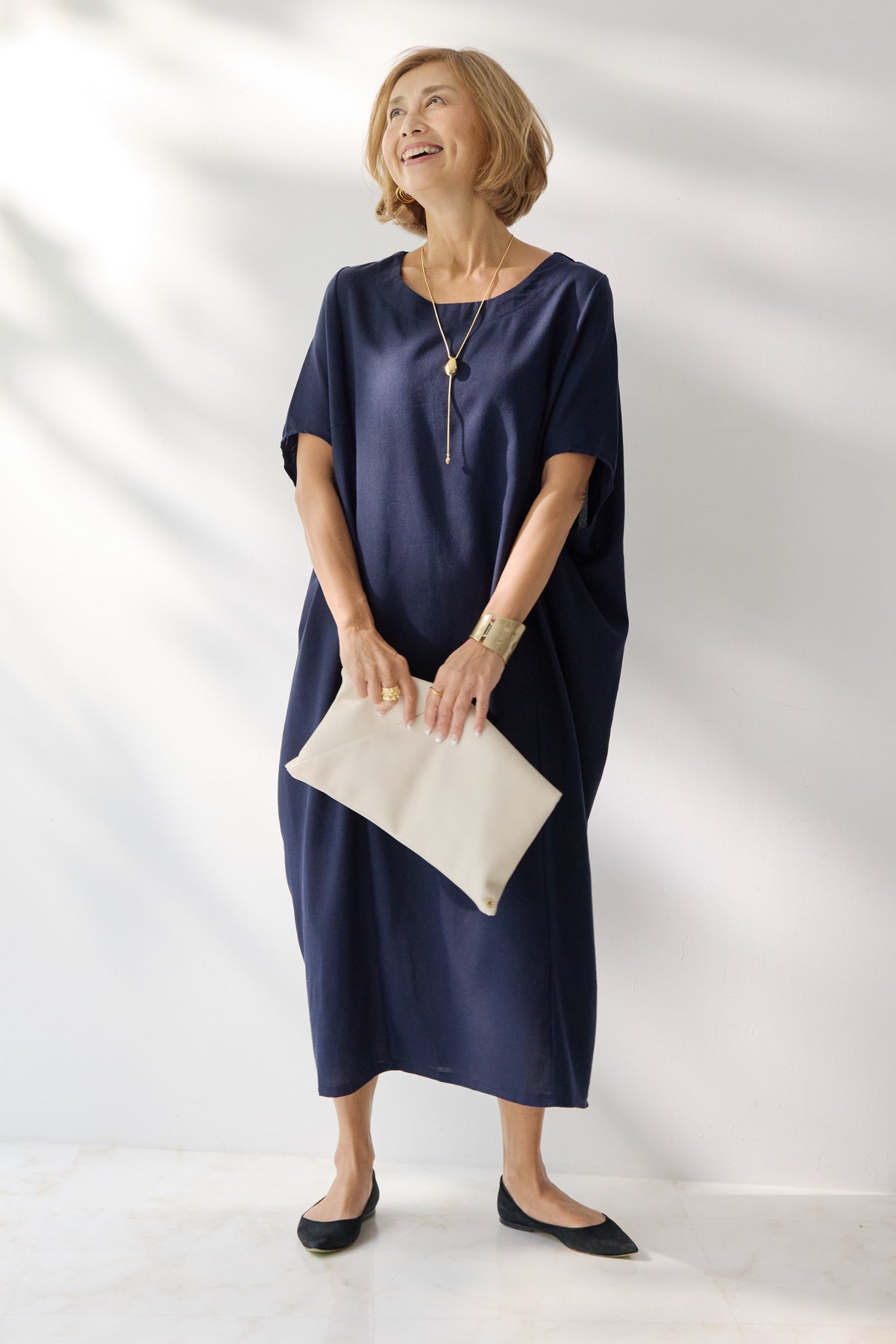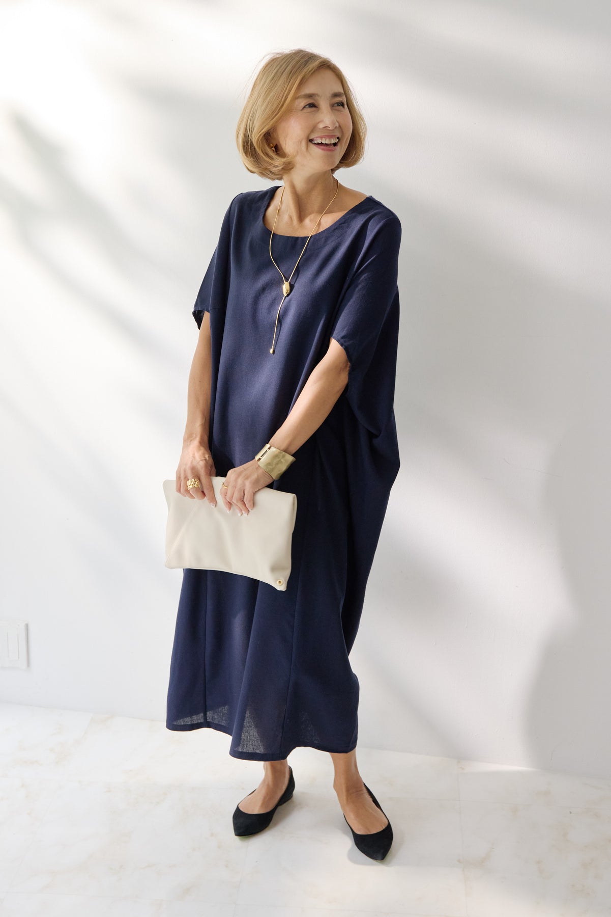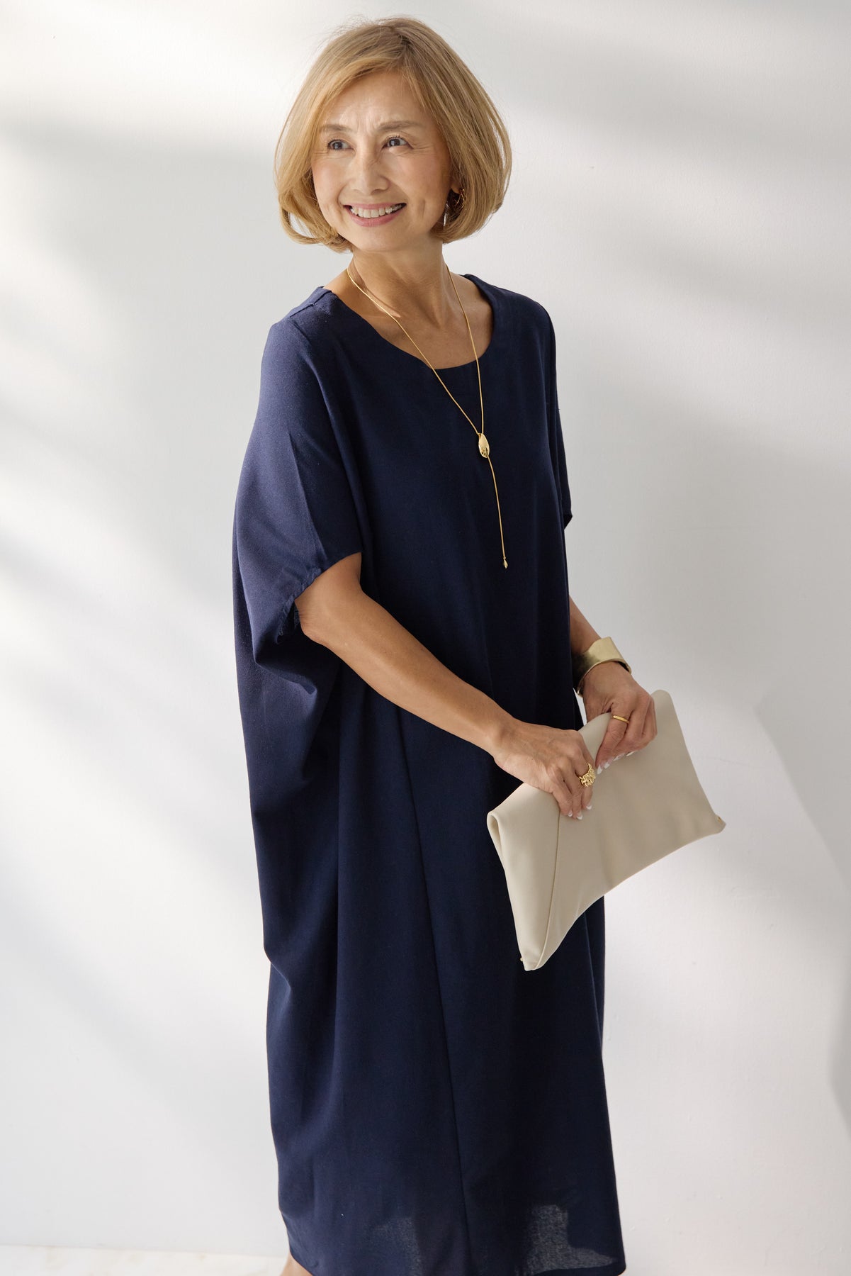 やわらかな丸みを描くコクーンシルエットが印象的な、リネン素材のロングワンピース。身体のラインを拾いにくいゆったりとしたフォルムながら、落ち感のある生地がすっきりとした縦ラインを演出し、リラックス感と上品さを両立します。首元は開きすぎないボートネックでデコルテをきれいに見せ、肩まわりをやさしく覆う袖デザインが腕まわりをさりげなくカバー。脇線を前に振った立体的な切替とコクーンラインが、シンプルながらニュアンスのあるシルエットを生み出しています。通気性に優れたリネン素材はさらりとした肌触りで、暑い季節も快適な着心地です。