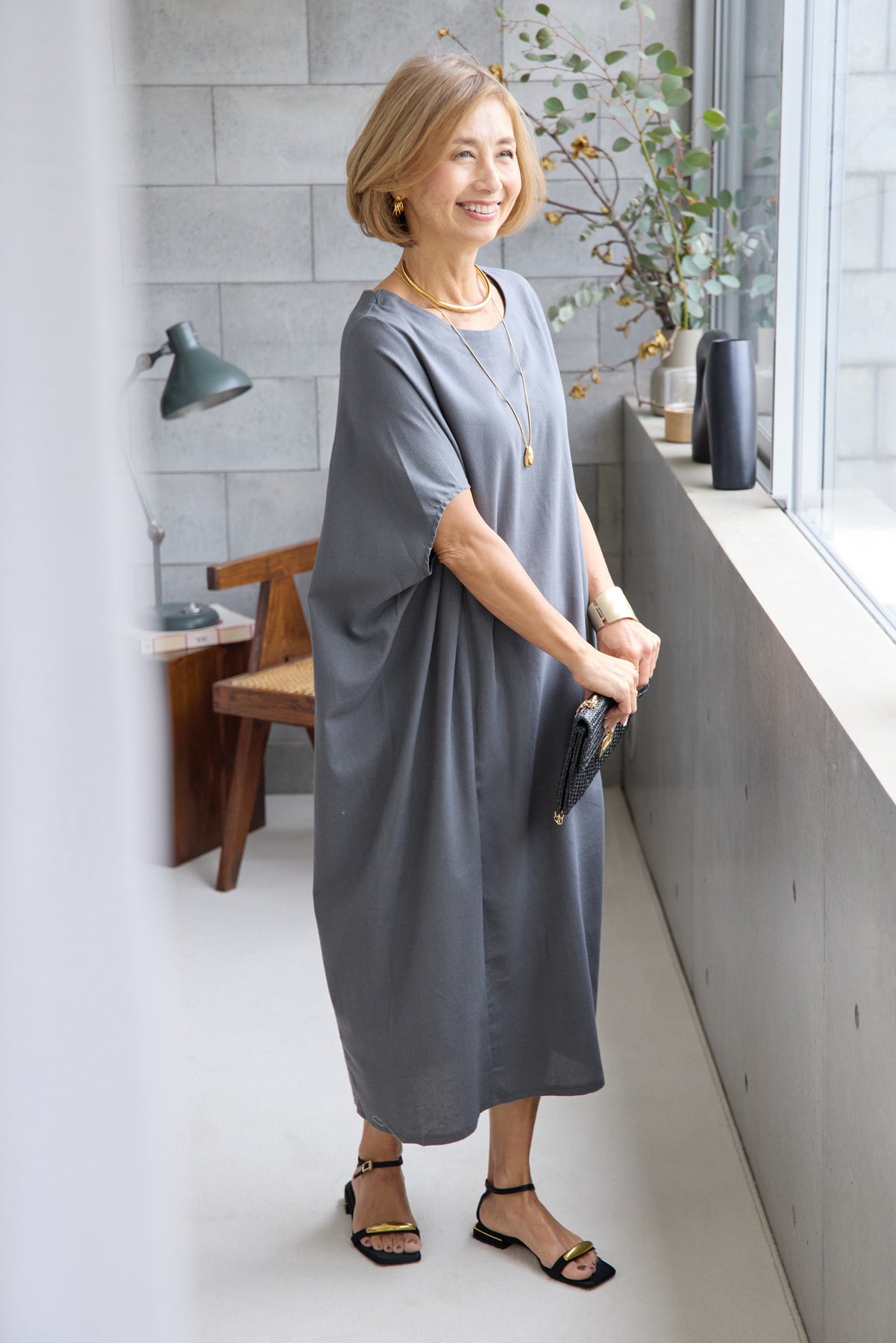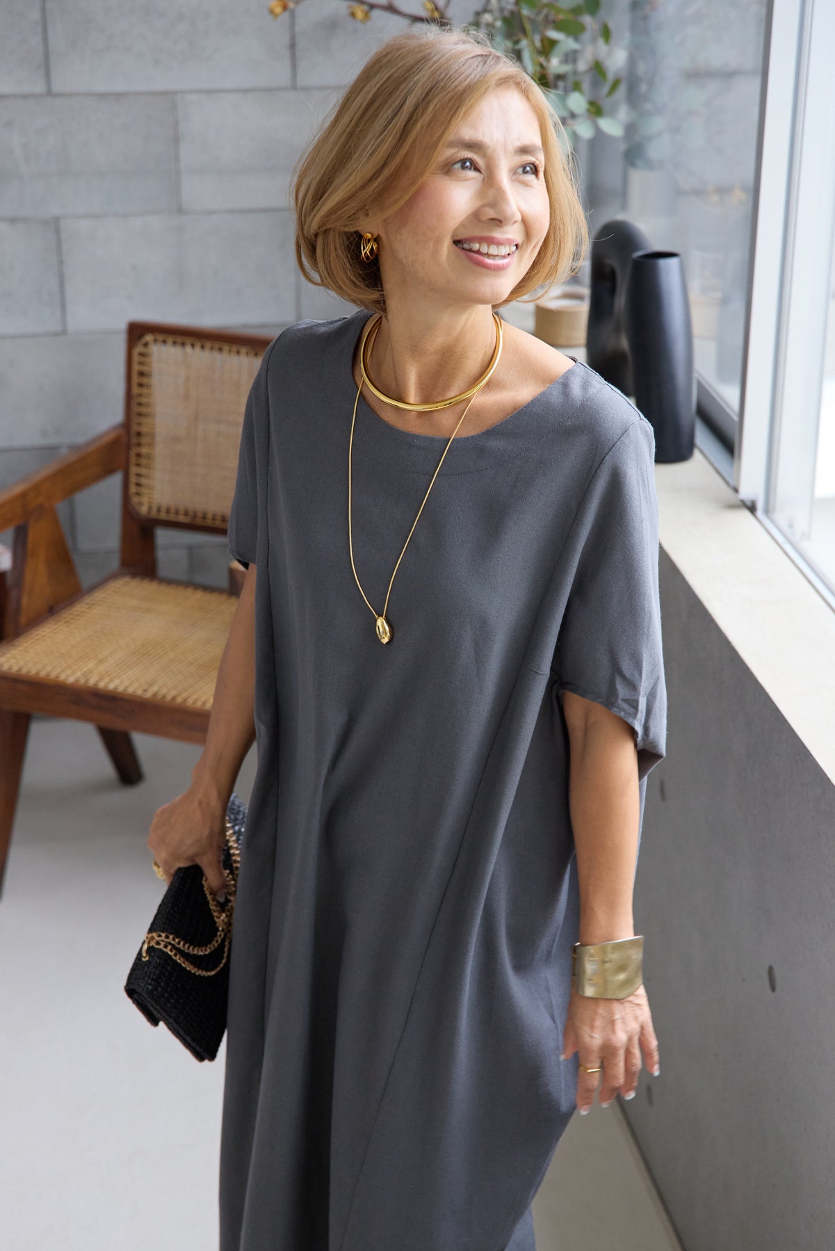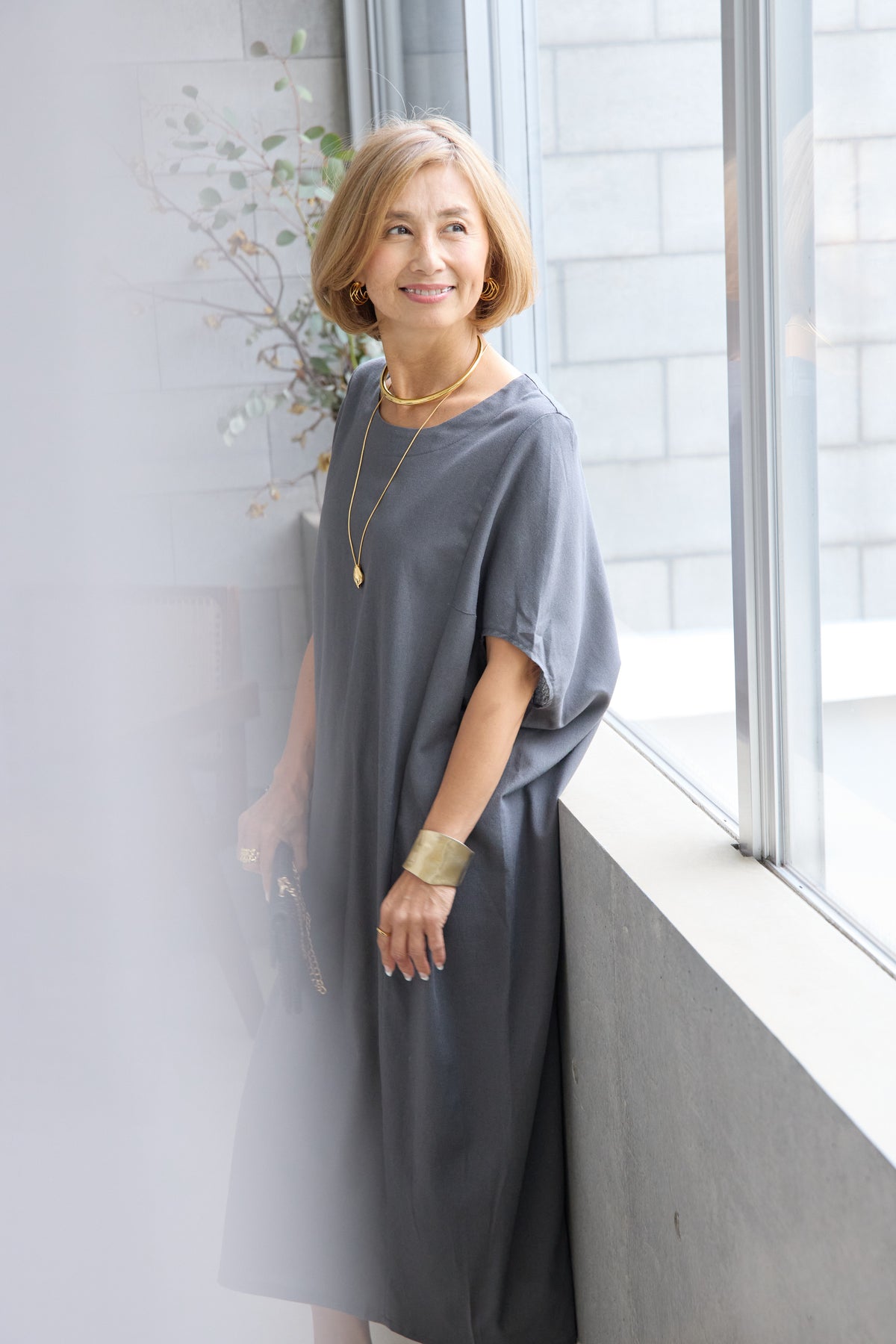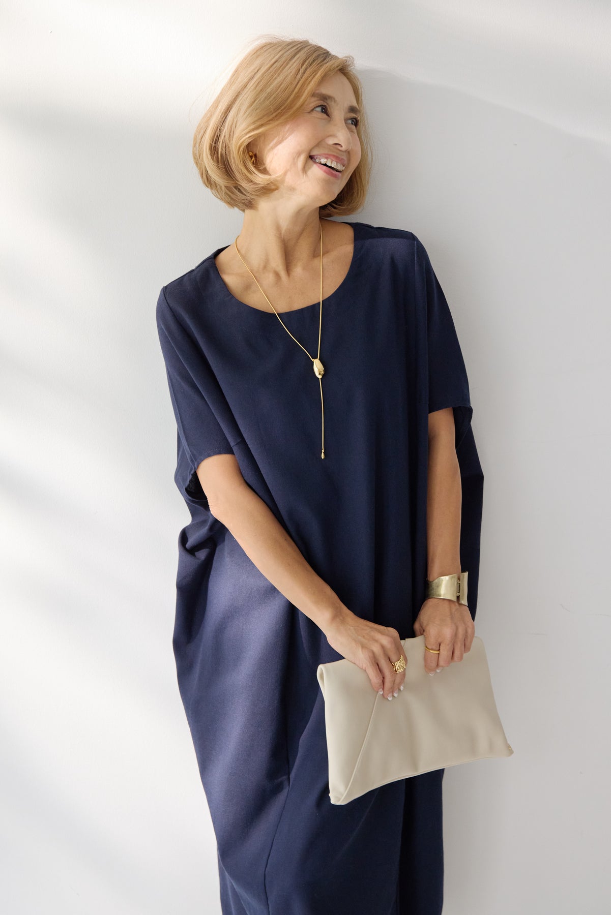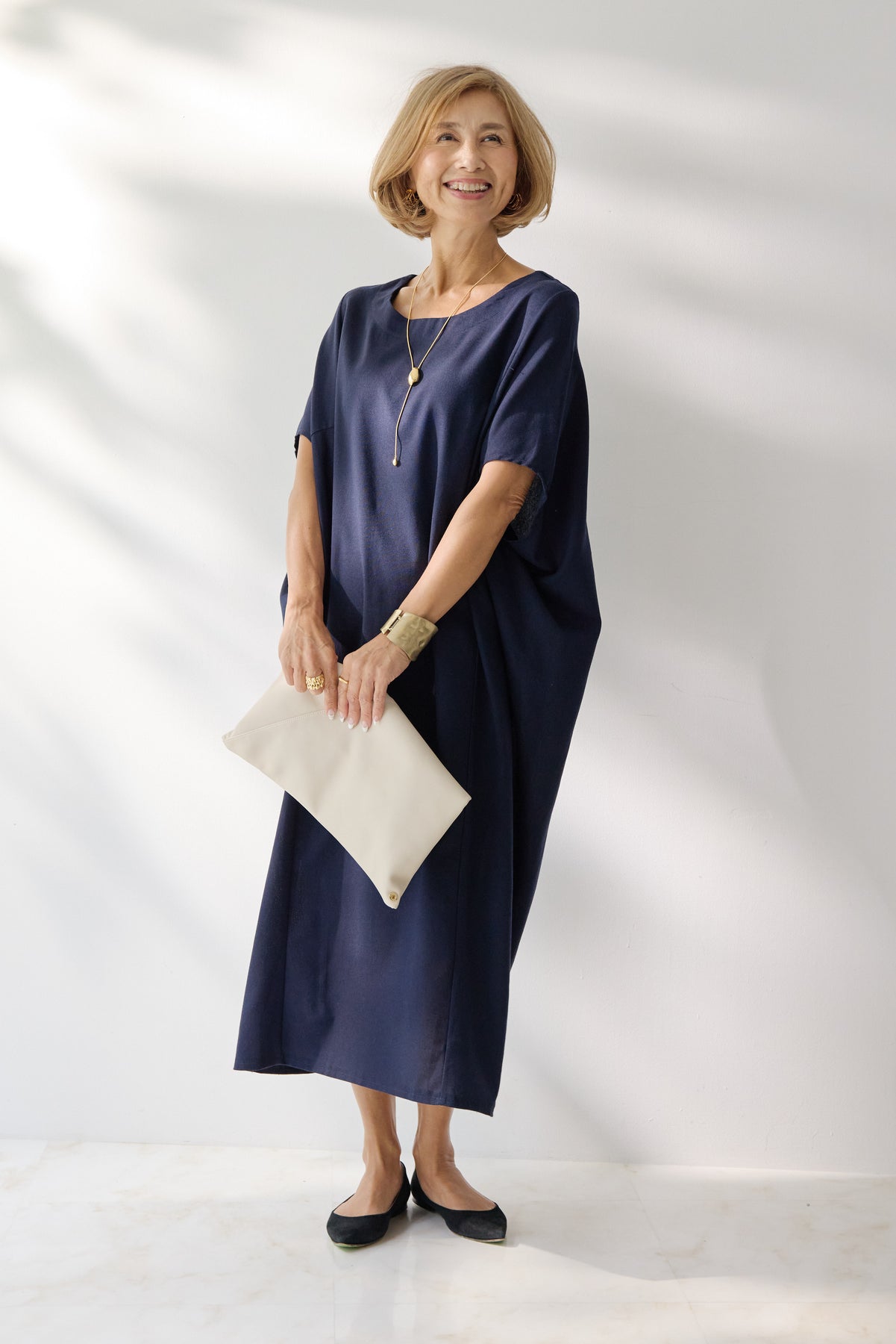 やわらかな丸みを描くコクーンシルエットが印象的な、リネン素材のロングワンピース。身体のラインを拾いにくいゆったりとしたフォルムながら、落ち感のある生地がすっきりとした縦ラインを演出し、リラックス感と上品さを両立します。首元は開きすぎないボートネックでデコルテをきれいに見せ、肩まわりをやさしく覆う袖デザインが腕まわりをさりげなくカバー。脇線を前に振った立体的な切替とコクーンラインが、シンプルながらニュアンスのあるシルエットを生み出しています。通気性に優れたリネン素材はさらりとした肌触りで、暑い季節も快適な着心地です。